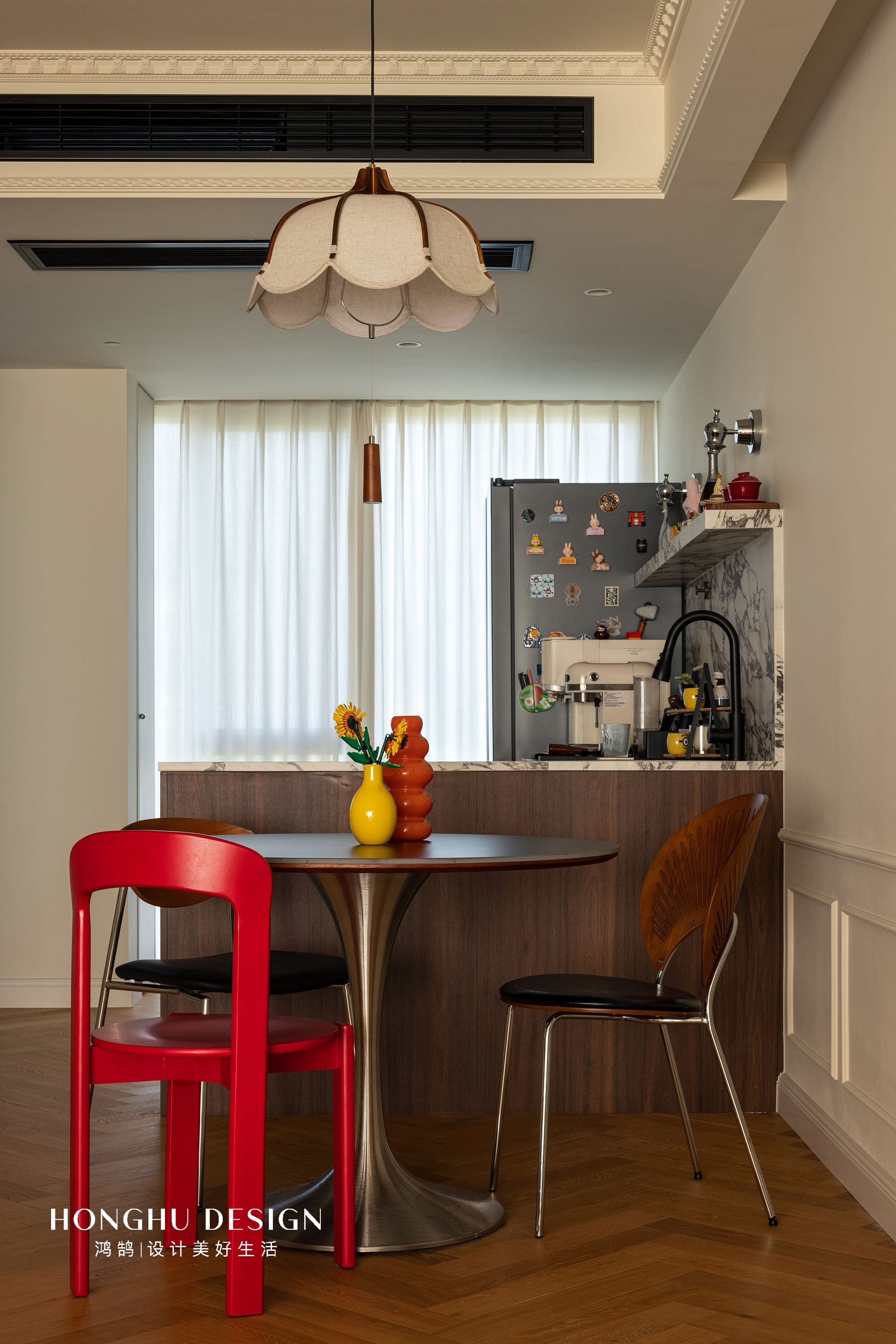 客餐厨的设计,石膏腰线贯穿墙面,弱化空间边界。 深色沙发与红色餐椅形成色彩碰撞。餐区选圆桌+金属底座,搭配木色餐椅,兼顾轻盈感与温馨感。用细节串联起功能区,让动线与视觉都自然流动。