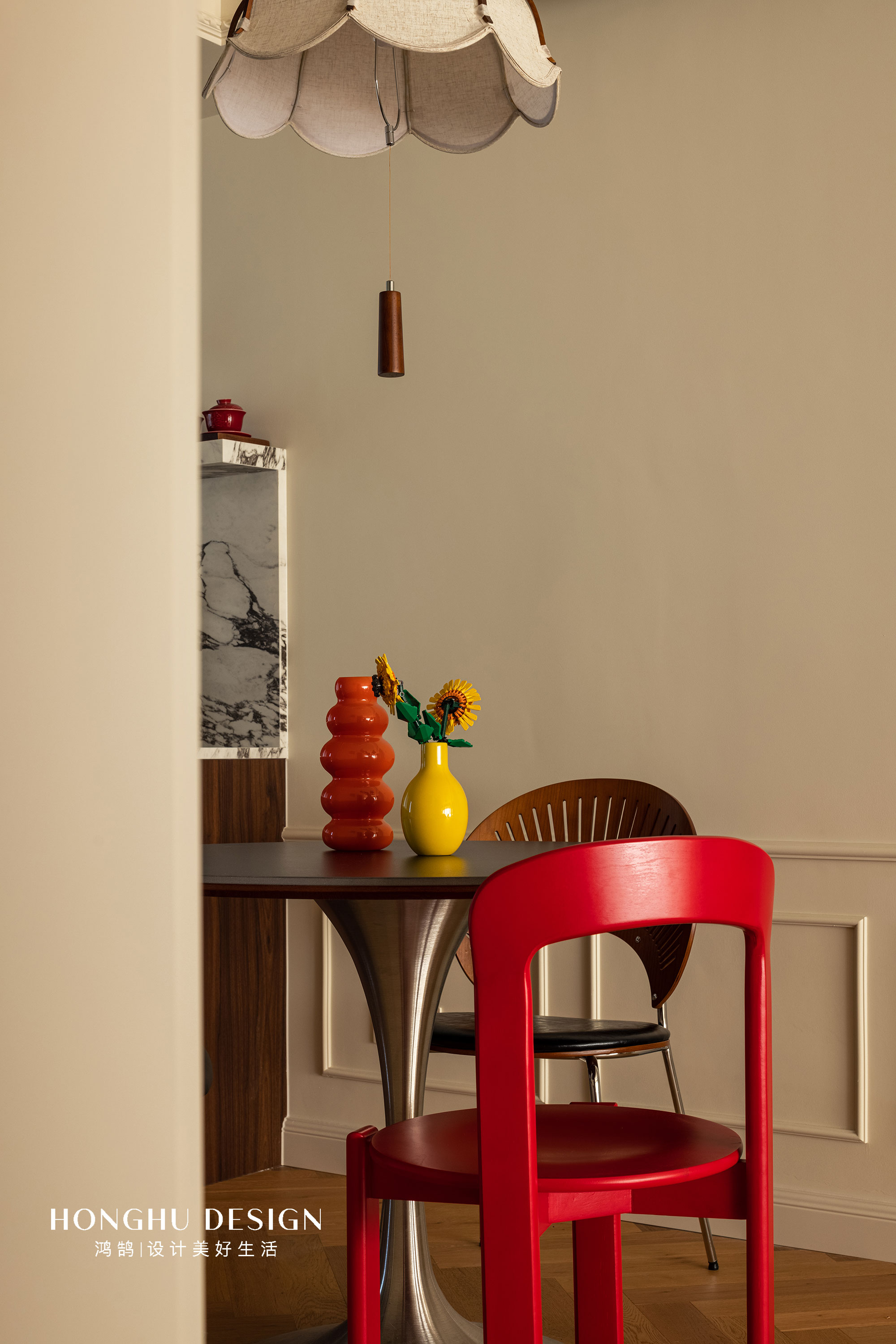 软装以折衷手法破界——高饱和色彩单品成为空间“情绪锚点”,木色的温润、黑色的沉稳与不锈钢的冷冽质感互衬,大理石茶几、木质边几、黑岩板桌体等材质碰撞,让法式的浪漫与当代生活的松弛感共生,既承载着两人一猫的日常温度,也成为多元审美趣味的容器。 -
