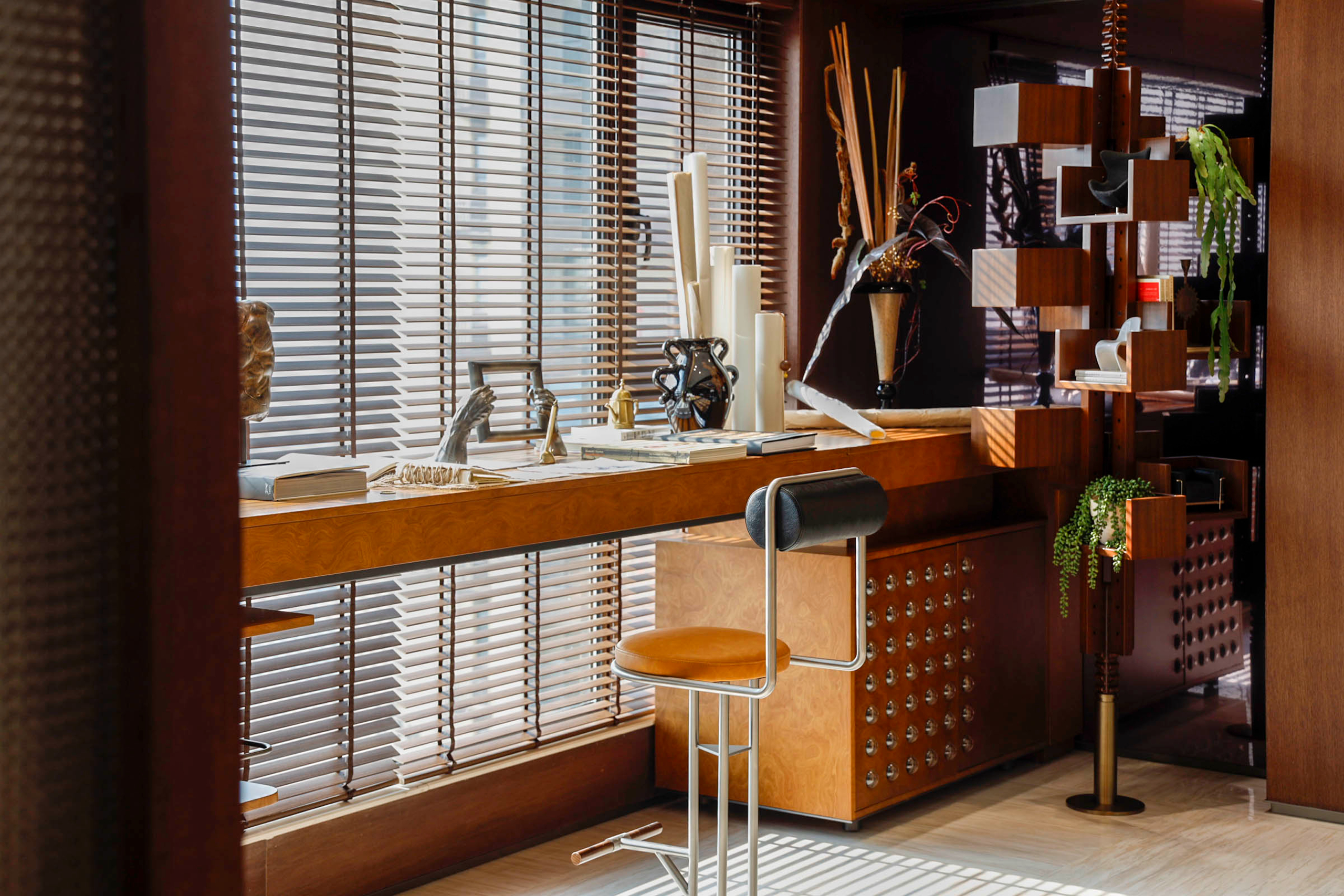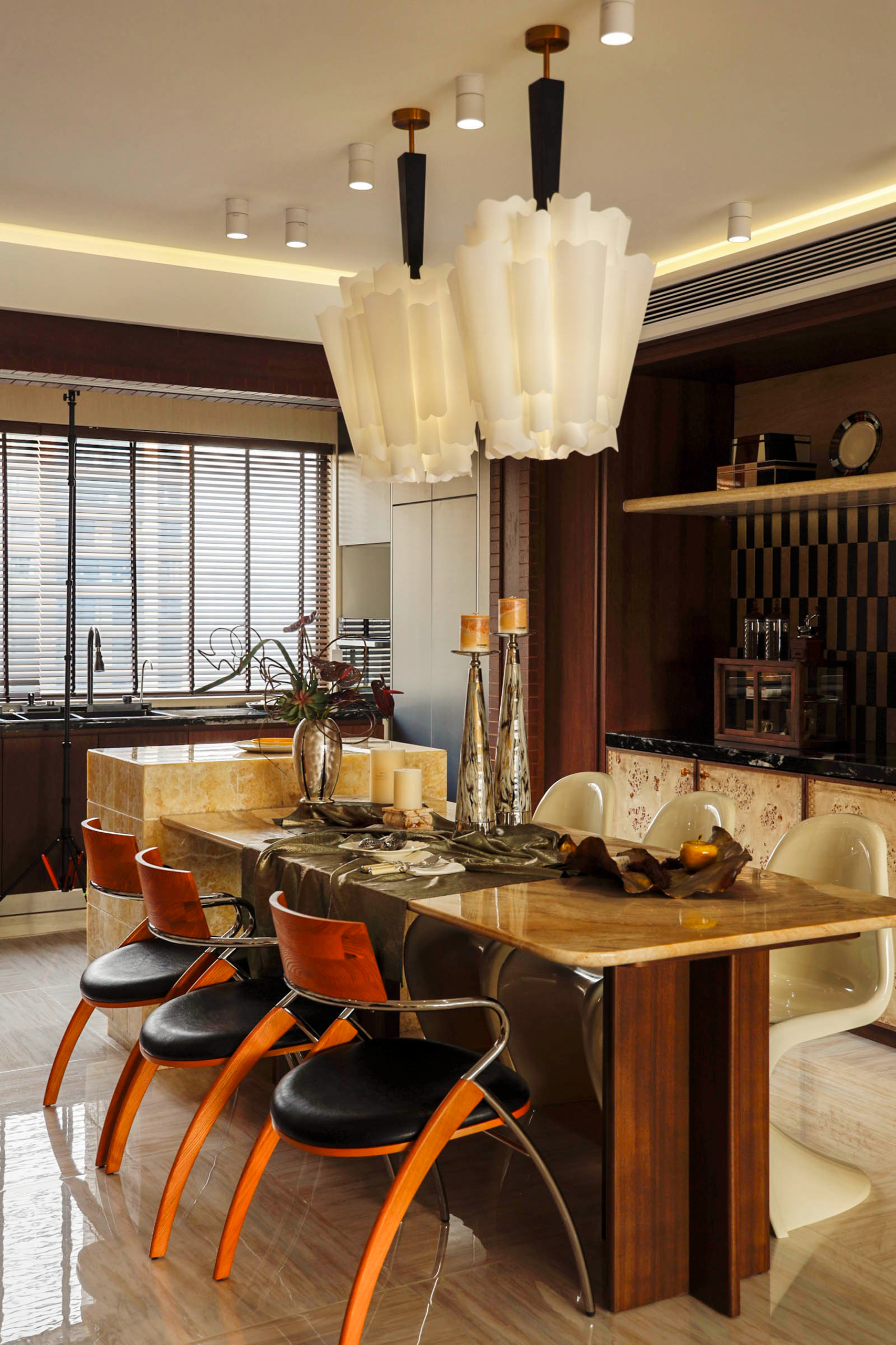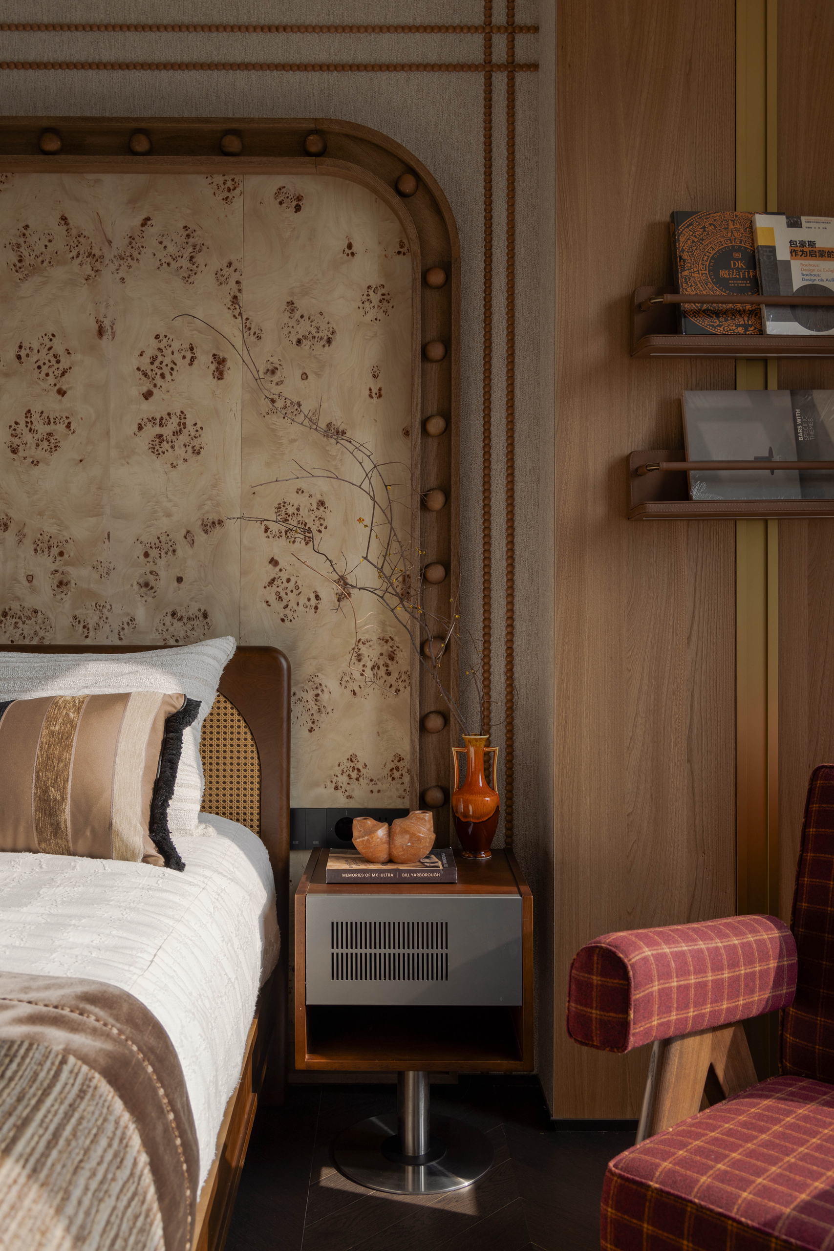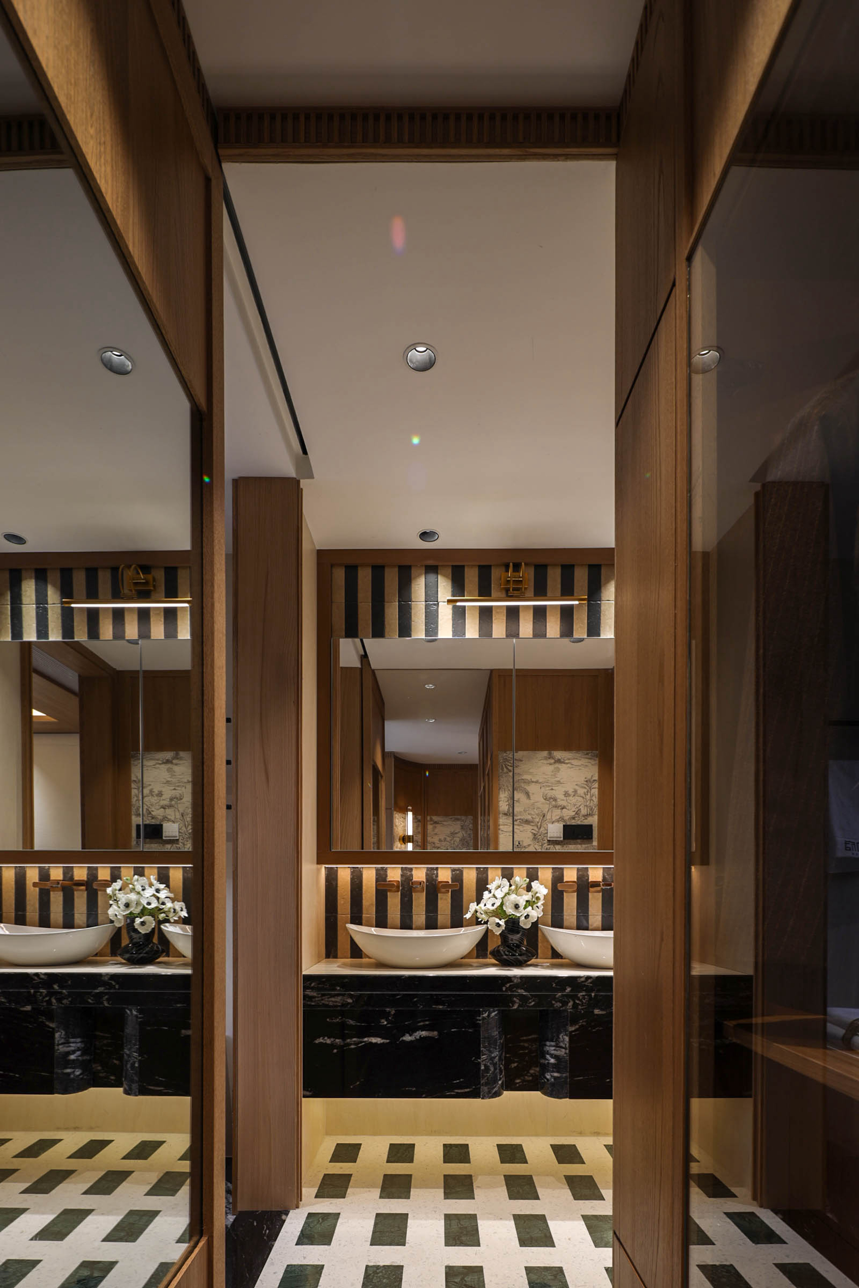 设计选材:选材上注重材质的叙事性、感官体验与可持续价值:自然肌理与艺术质感并重:如温润的白杨树瘤木、云灰树瘤木与华丽的绿野仙踪大理石、波斯白玉石形成对话;艺术藤编、金箔软木墙布、珐琅釉玻璃等增添手工感与独特光泽。材质选择服务于“中古意境”,但通过现代工艺(如锻纹金属)和搭配手法,避免了陈旧感,营造出“静奢美学”。低碳与经济性考量:选用罗马洞石、实木等经典耐久材料,减少因过时而更换的资源消耗。
