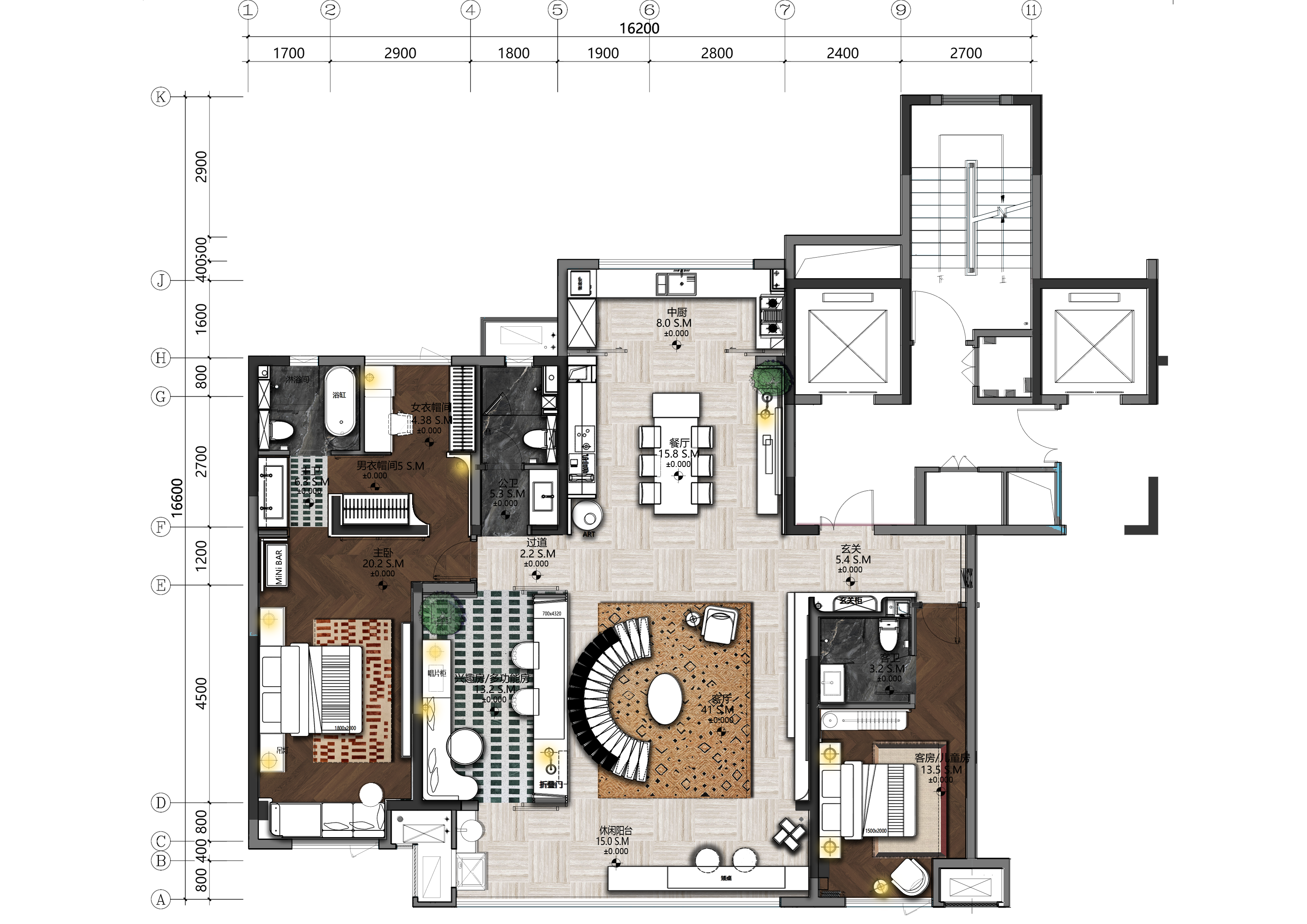 空间布局:在布局上,作品体现了强烈的现代居住逻辑与人文关怀:开放式洄游动线:打破传统房间界限,形成客厅、餐厅、水吧、健身、宠物区一体化的多维洄游系统,极大增强了空间的互动性与自由度。复合叠加功能:如阳台叠加“宠物陪伴+水吧+健身”三重功能;多功能房兼容“收藏展示、阅读、冥想、创作”;主卧套房集成“睡眠、亲子互动、精神岛屿、卫浴疗愈、衣帽收纳”,实现了空间效率与体验深度的最大化。前瞻性预留:在主卧明确预设未来育儿空间,预留婴儿床及活动区域,体现了设计对家庭生命周期的长远考量。