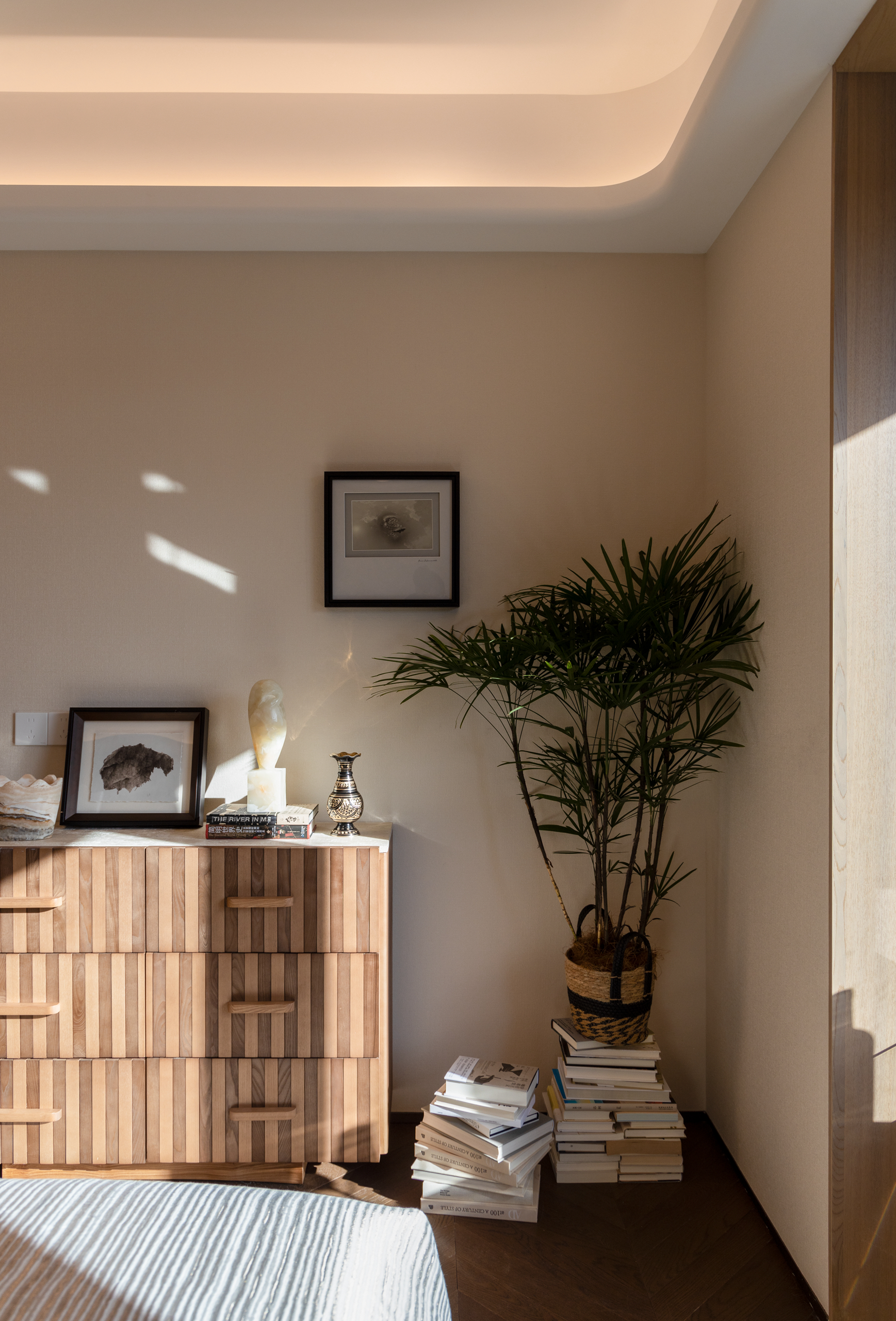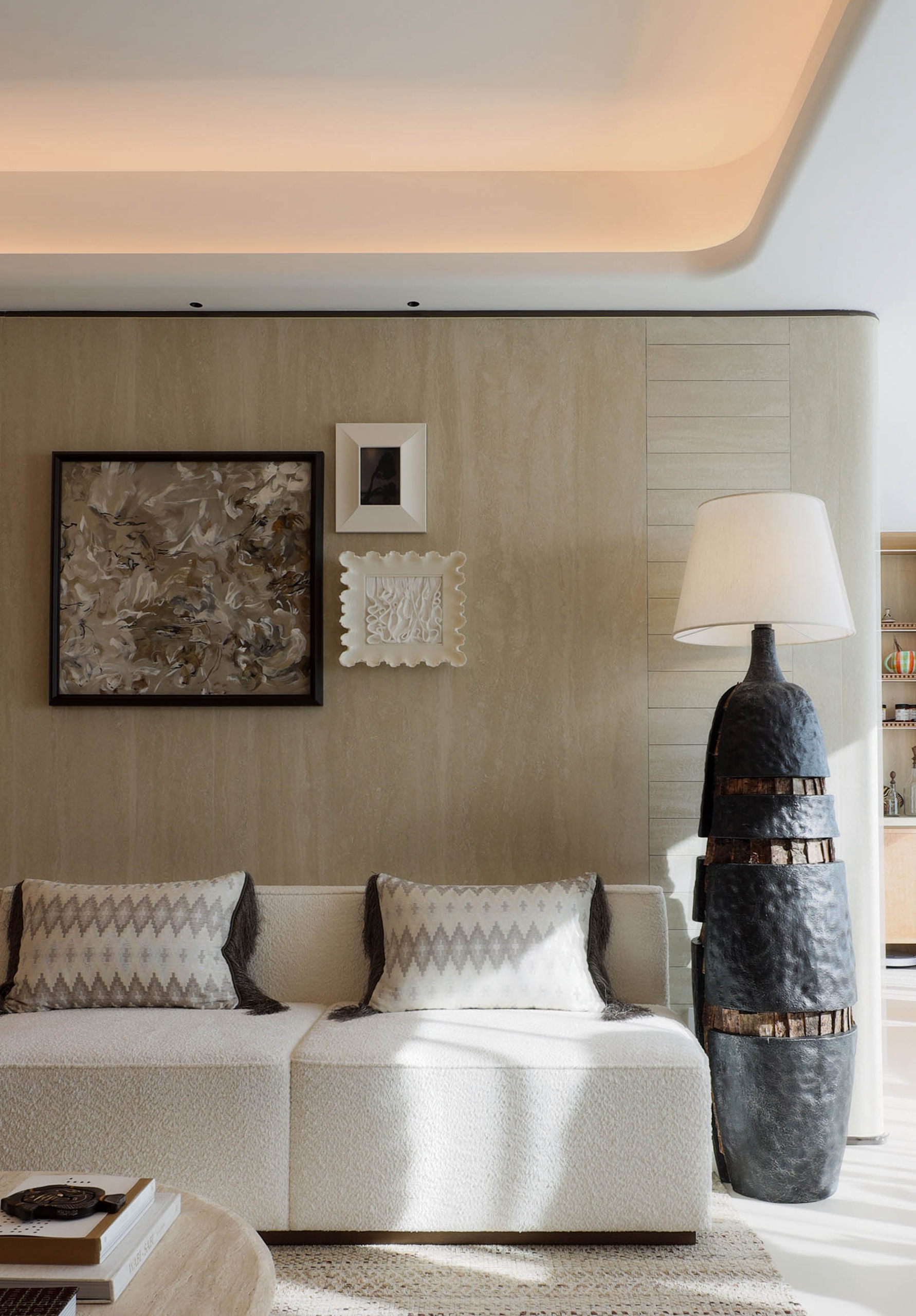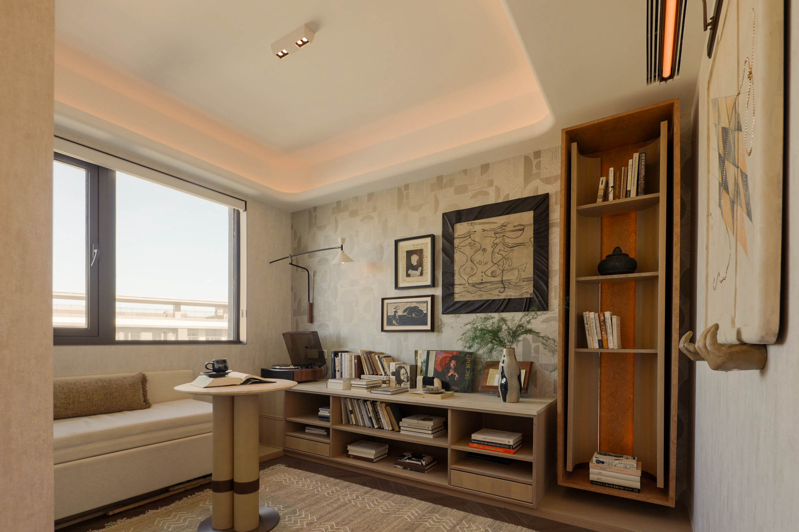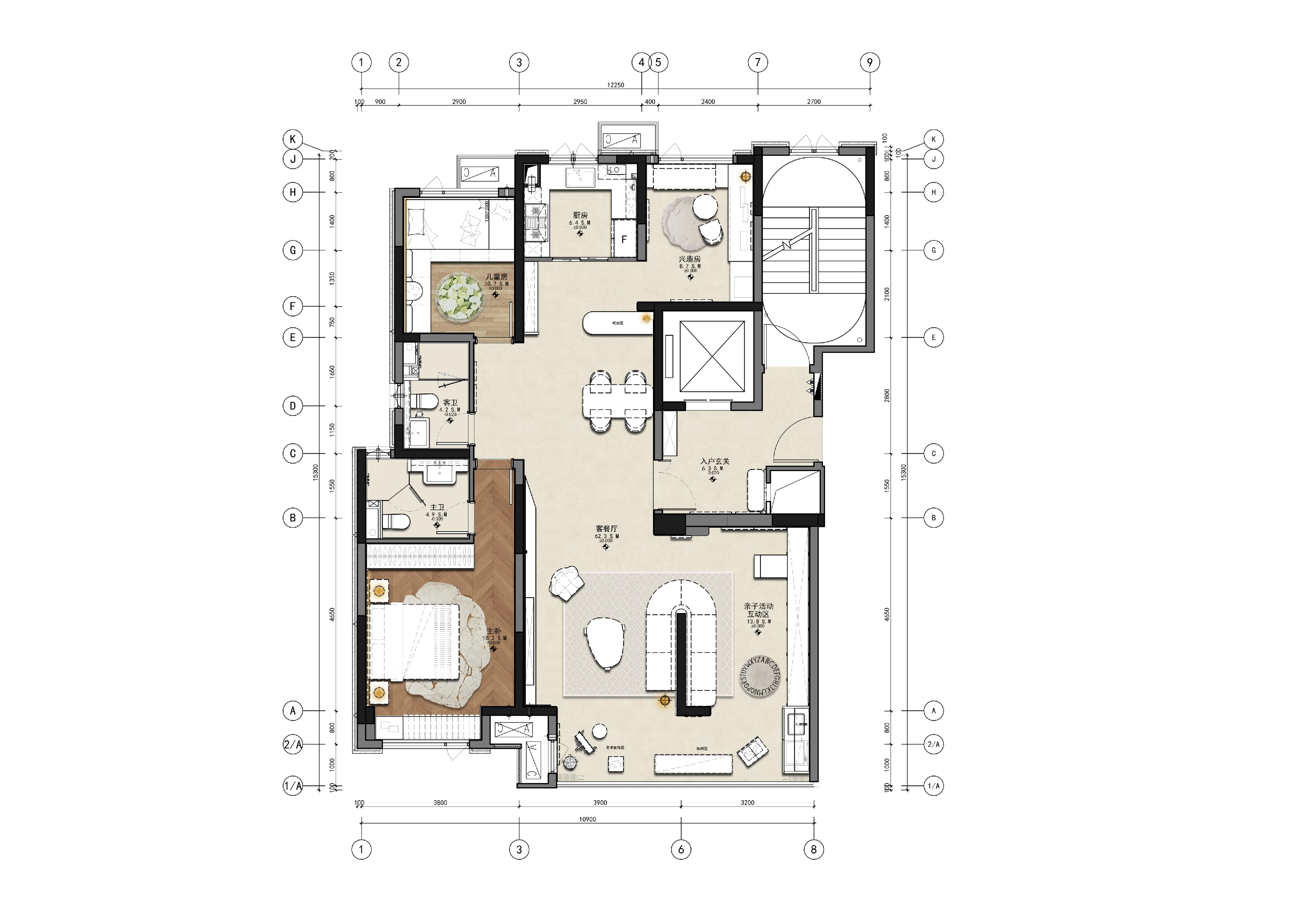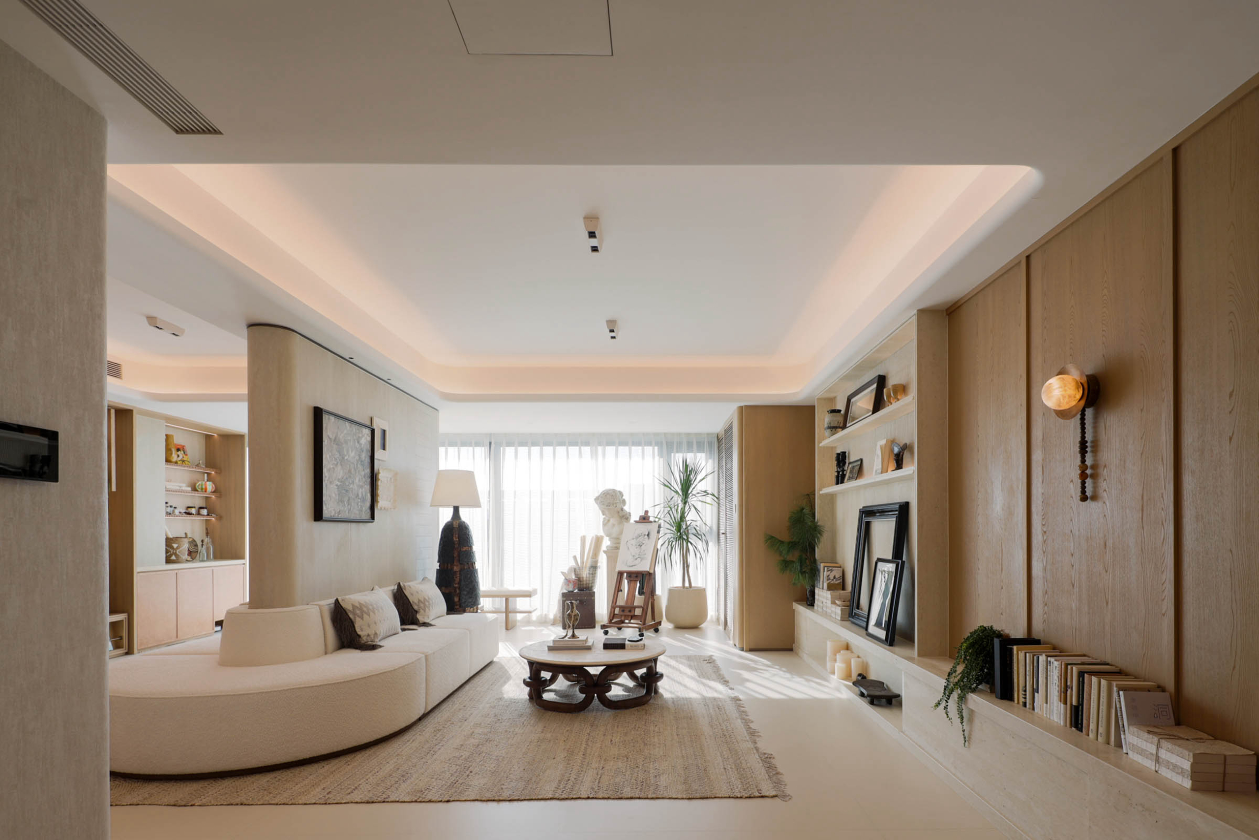 项目定位:本项目定位为“时光织境”,以木纹肌理为线索,打造兼具艺术美学与情感温度的全龄生活空间。设计从“岁月浅斟”概念出发,融合和暖、艺术、浪漫三大关键词,通过开放式布局与复合功能场景,满足当代家庭社交、亲子互动及个性兴趣的多元需求,将居住空间升华为记录生活、滋养情感的容器。