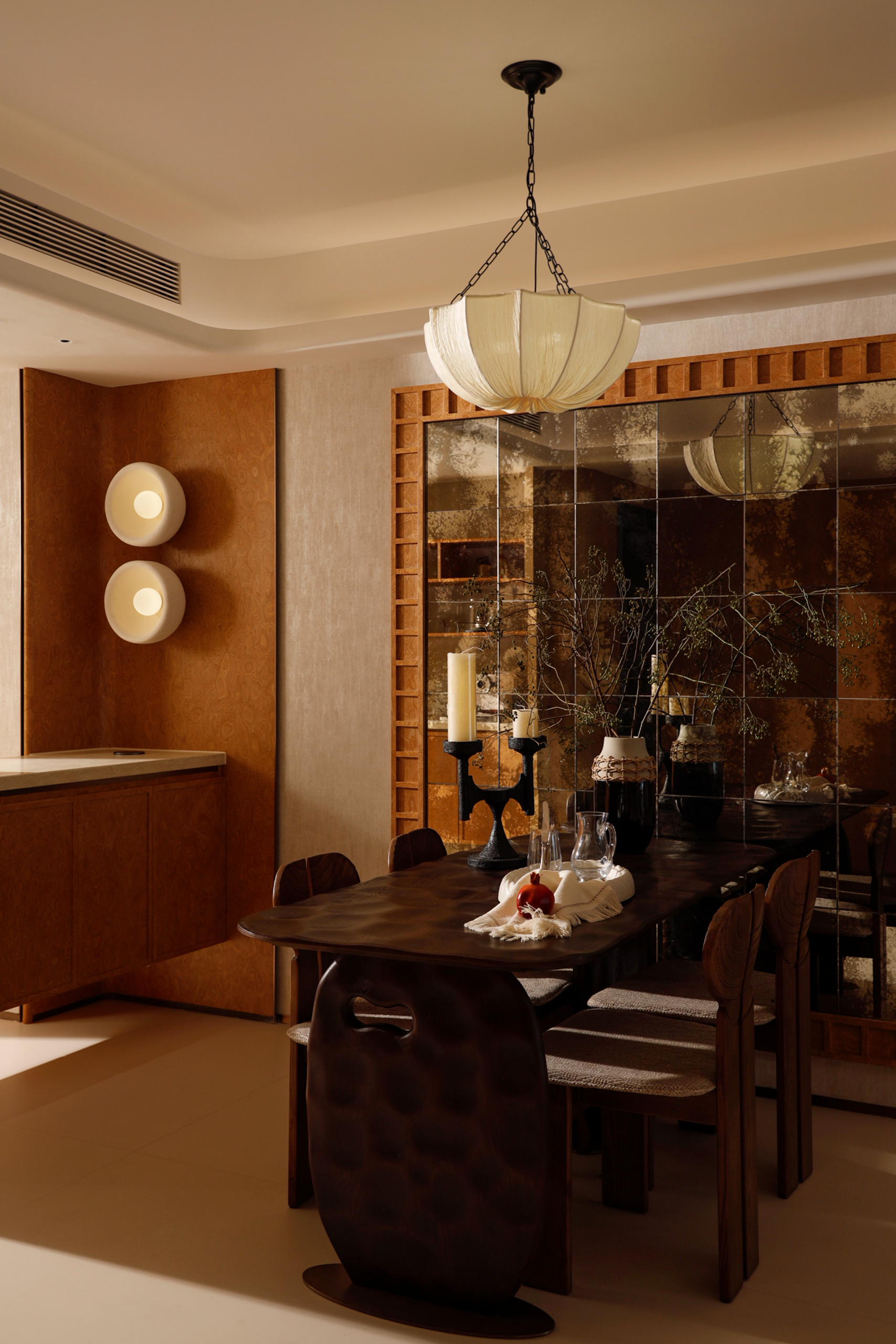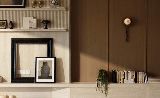 设计选材:选用木饰面、洞石岩板、白色乳胶漆等自然材质,以温润肌理呼应“时光”主题。创新点在于通过材质延续与简化种类,提升空间整体感;岩板与实木的搭配兼顾耐久与环保,局部镜面运用扩增视觉层次。选材注重本地供应与长效使用,减少资源消耗,体现低碳经济理念。