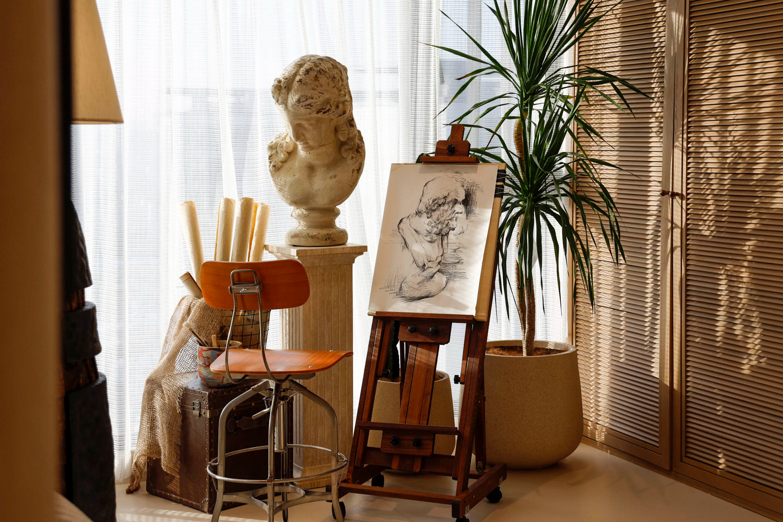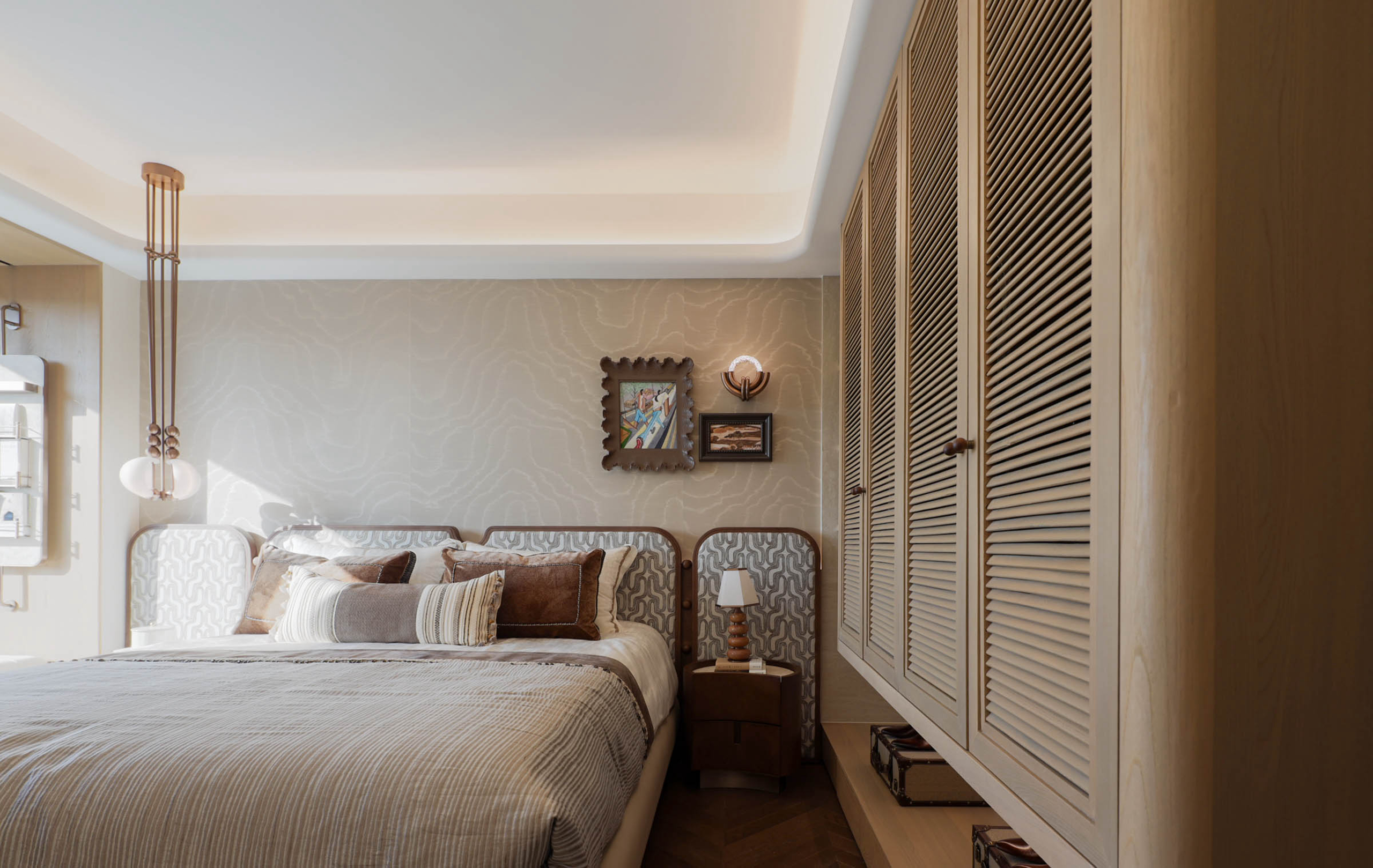 空间意境:环境风格上打破传统居家刻板印象,以实木、暖调为基底,通过光影层次与材质肌理营造诗意氛围。创新点在于将艺术创作区、兴趣房、镜面挂画等元素融入日常生活场景,使空间不仅满足功能,更成为承载休闲、创作与社交的浪漫艺术场域,实现“生活即艺术”的沉浸体验。