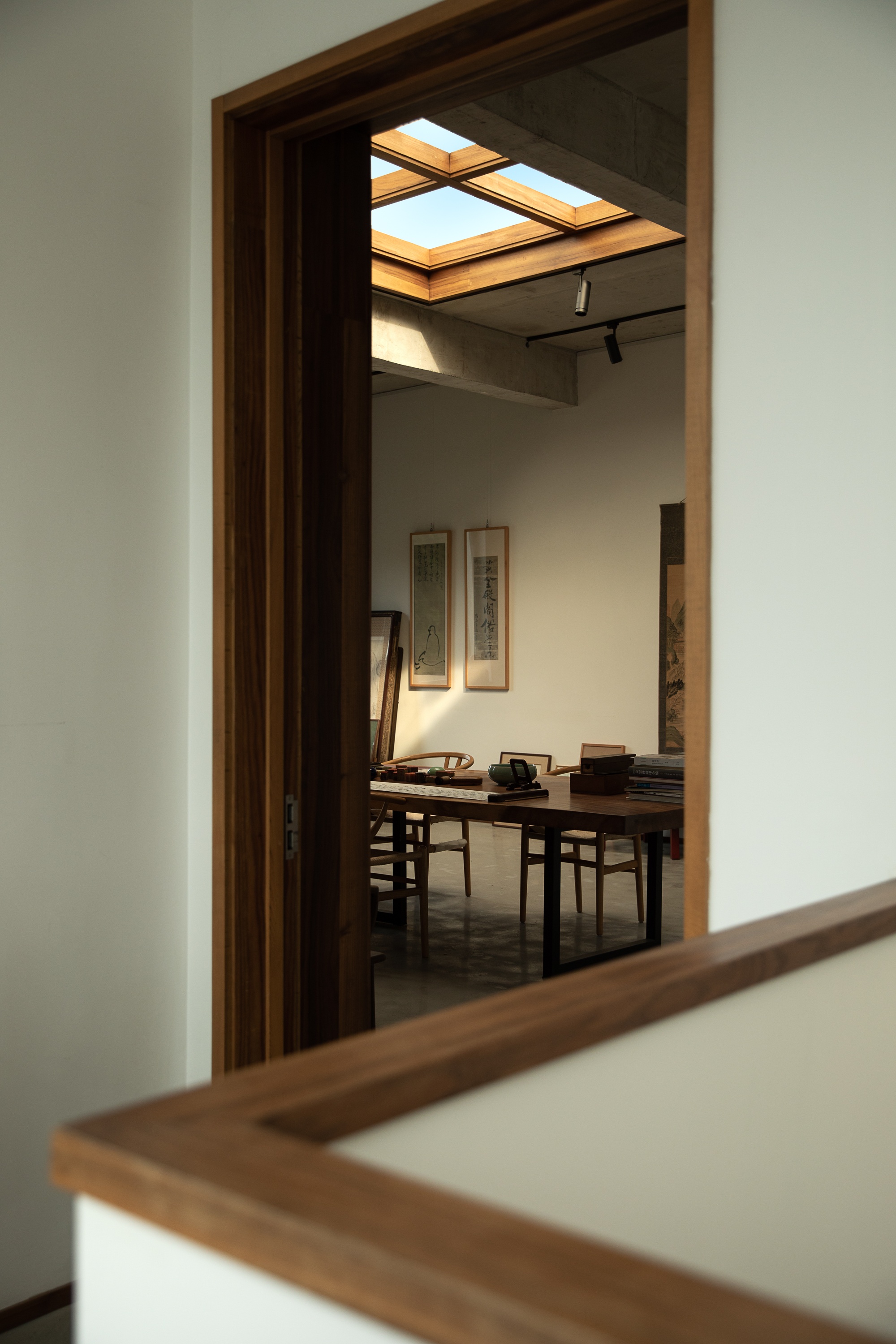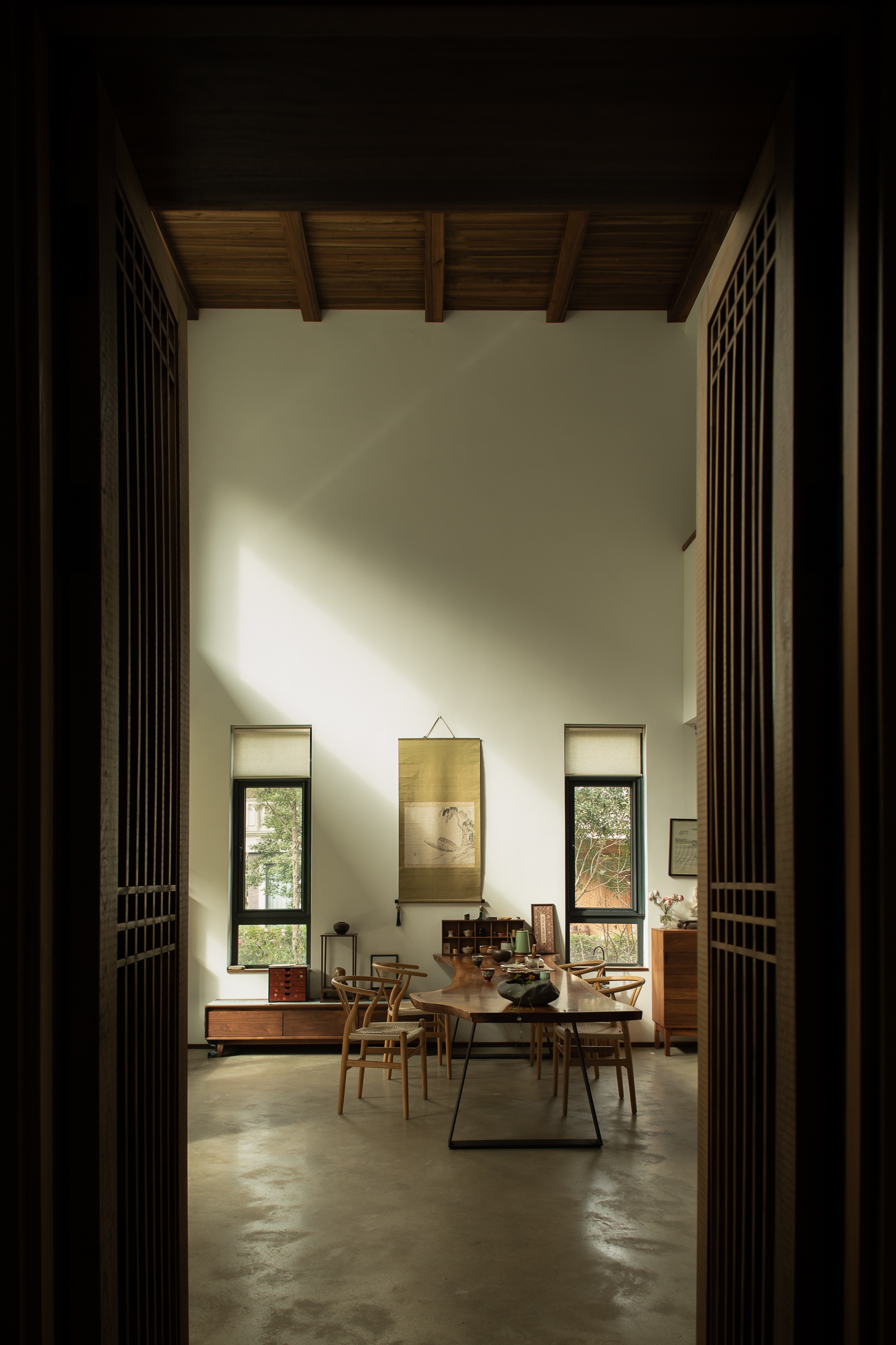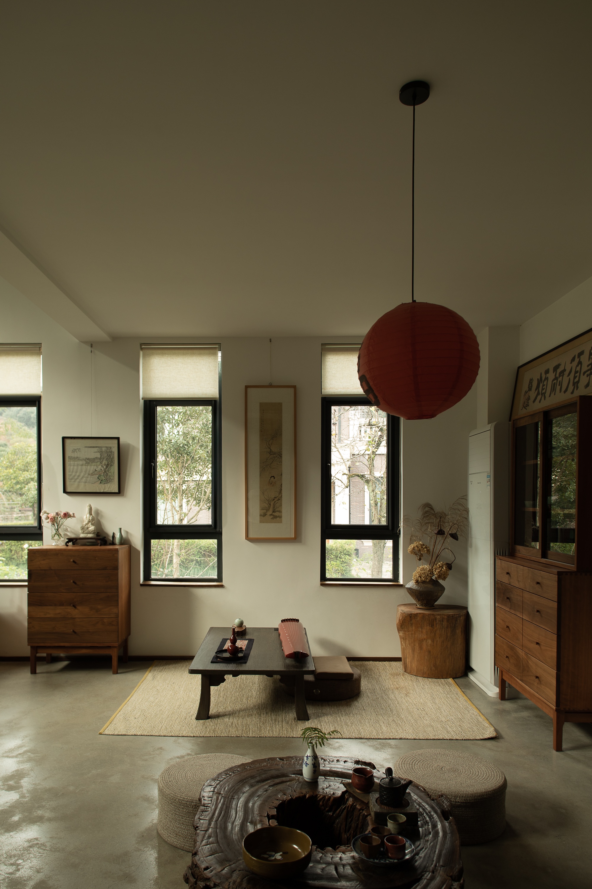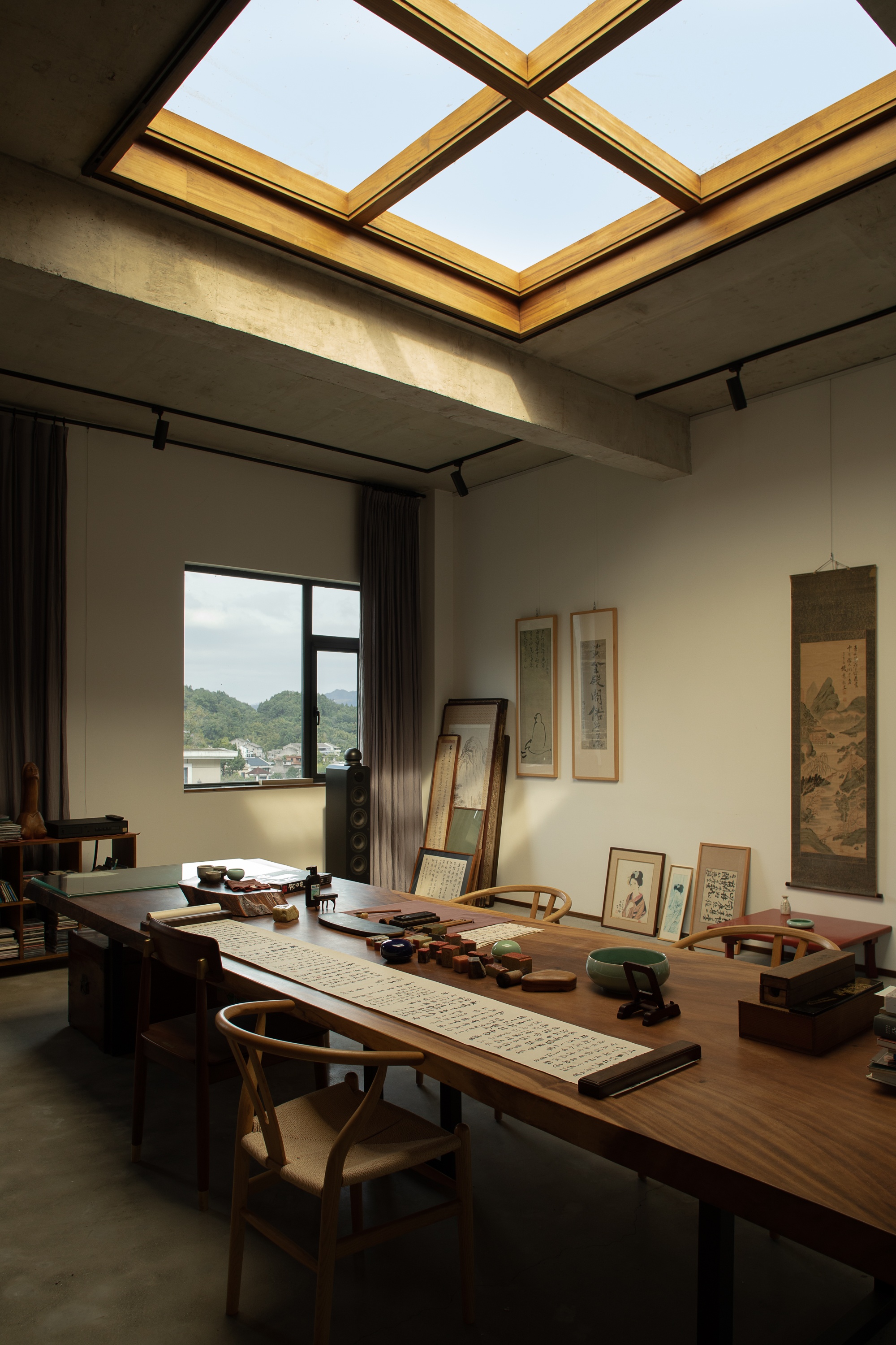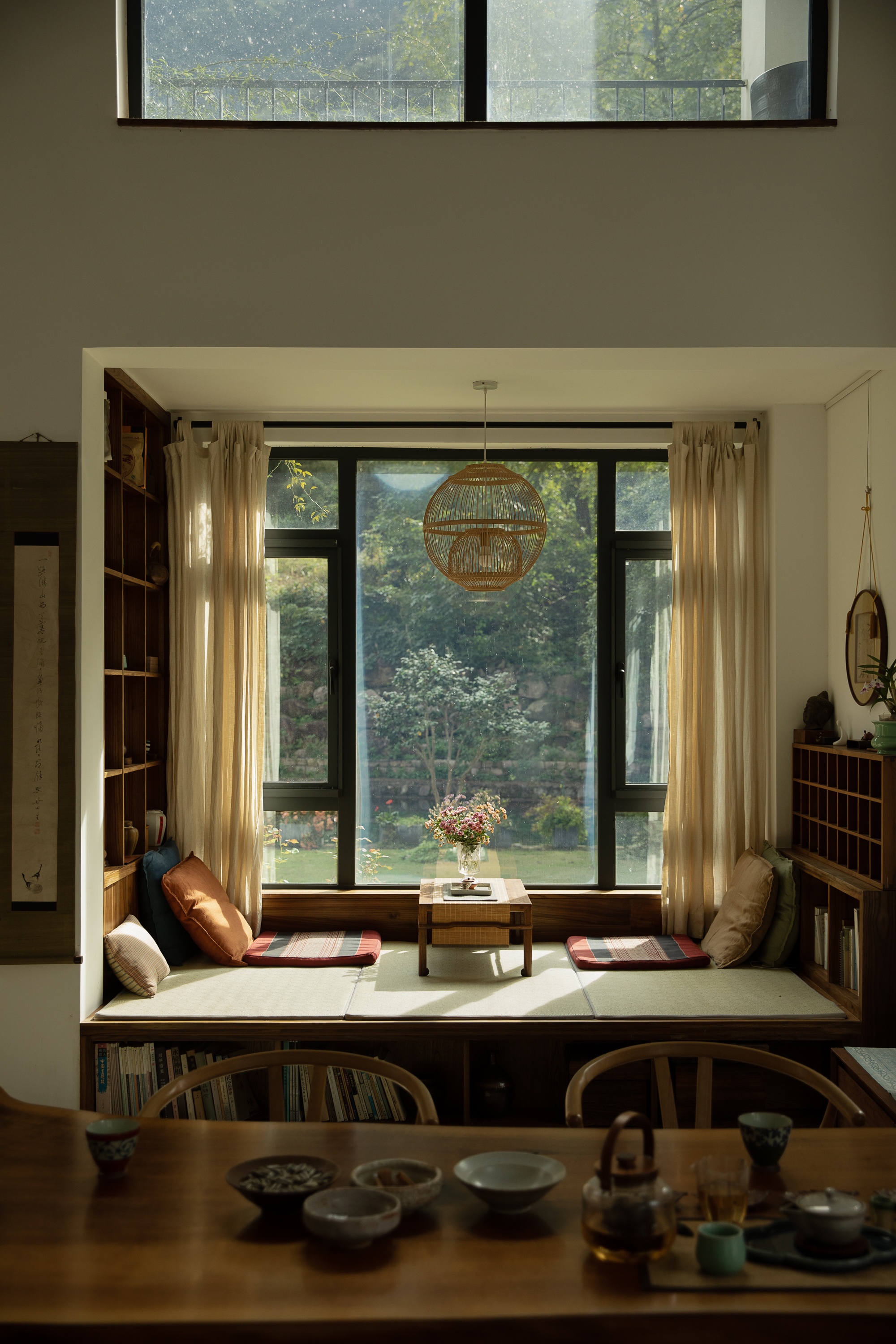 空间意境:设计通过框景手法消解室内外界限,借景入室,阳光透过窗外摇曳的树影,被切割成零散的斑驳投入室内,随着时间的流逝变幻着阴影的姿势,空间也因此而变得灵动而富有生命力。在这里,生活、工作、创作与休闲的界限被温柔消解——每个空间都承载着多重可能。全景式观景窗将山水引入室内,流动的空气与自然光影在空间中自由穿梭。这些未被预设的功能容器,随着使用者的需求自由生长,成为风与光栖居的透明载体。不同场景中悬挂的作品与看似随意摆设的装饰物件,皆来自居者日常的收藏,这些藏品随着心境变化调整位置,让家成为持续生长的生活美术馆,在真实的使用痕迹中展现艺术与生活的自然交融。原先位于三层的尖角阁楼结构被推翻,平面化顶部设计后,空间高度的提升带来使用感受的升级,在顶部开设天窗,光线自然撒落于桌面,赋予场景向上的张力与生命感,带来开阔的视觉体验,而时间的痕迹也因此被丰盈地纳入空间,日升月落都在四面八方的窗景中,轻易地被视线捕捉。