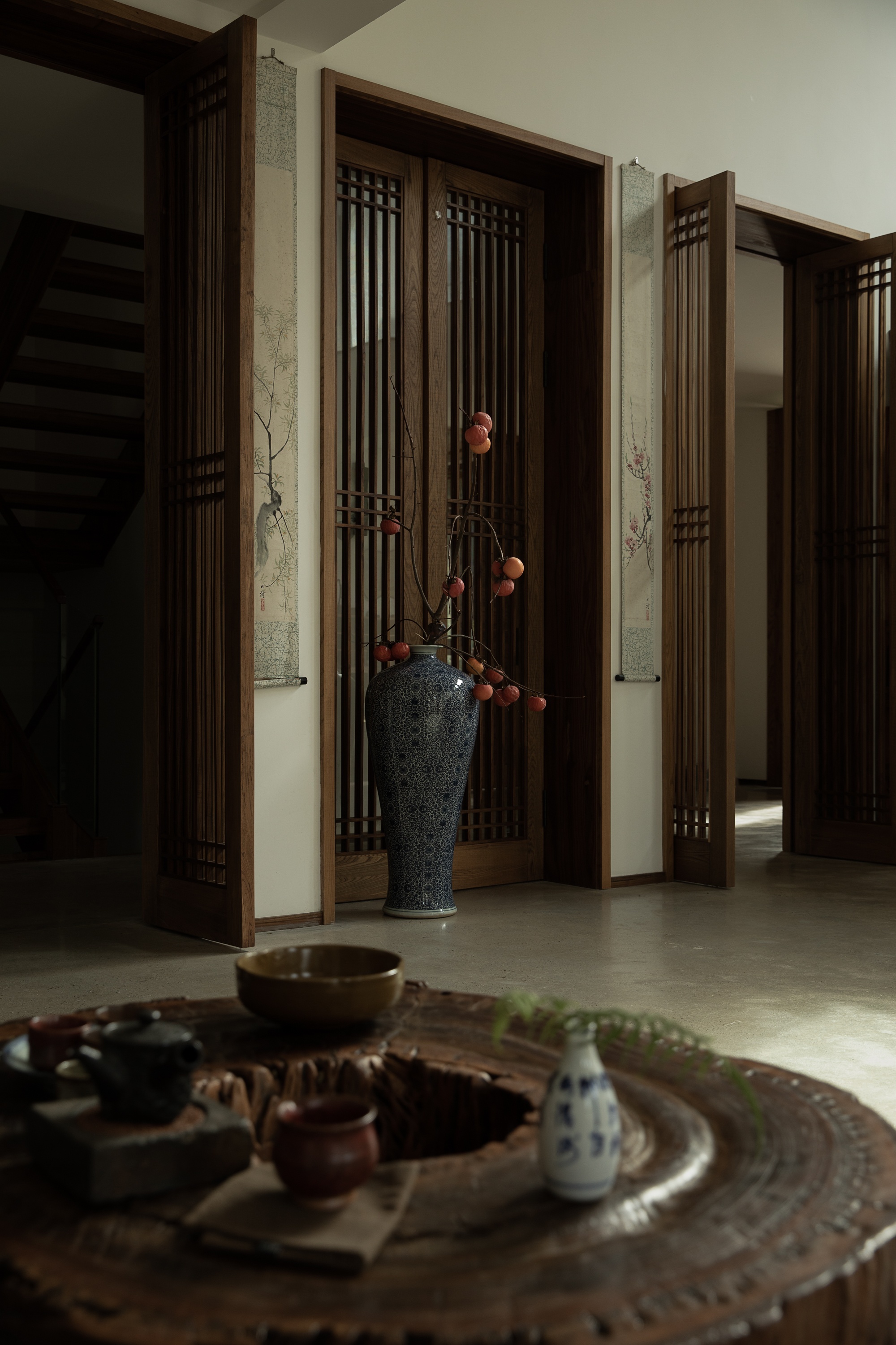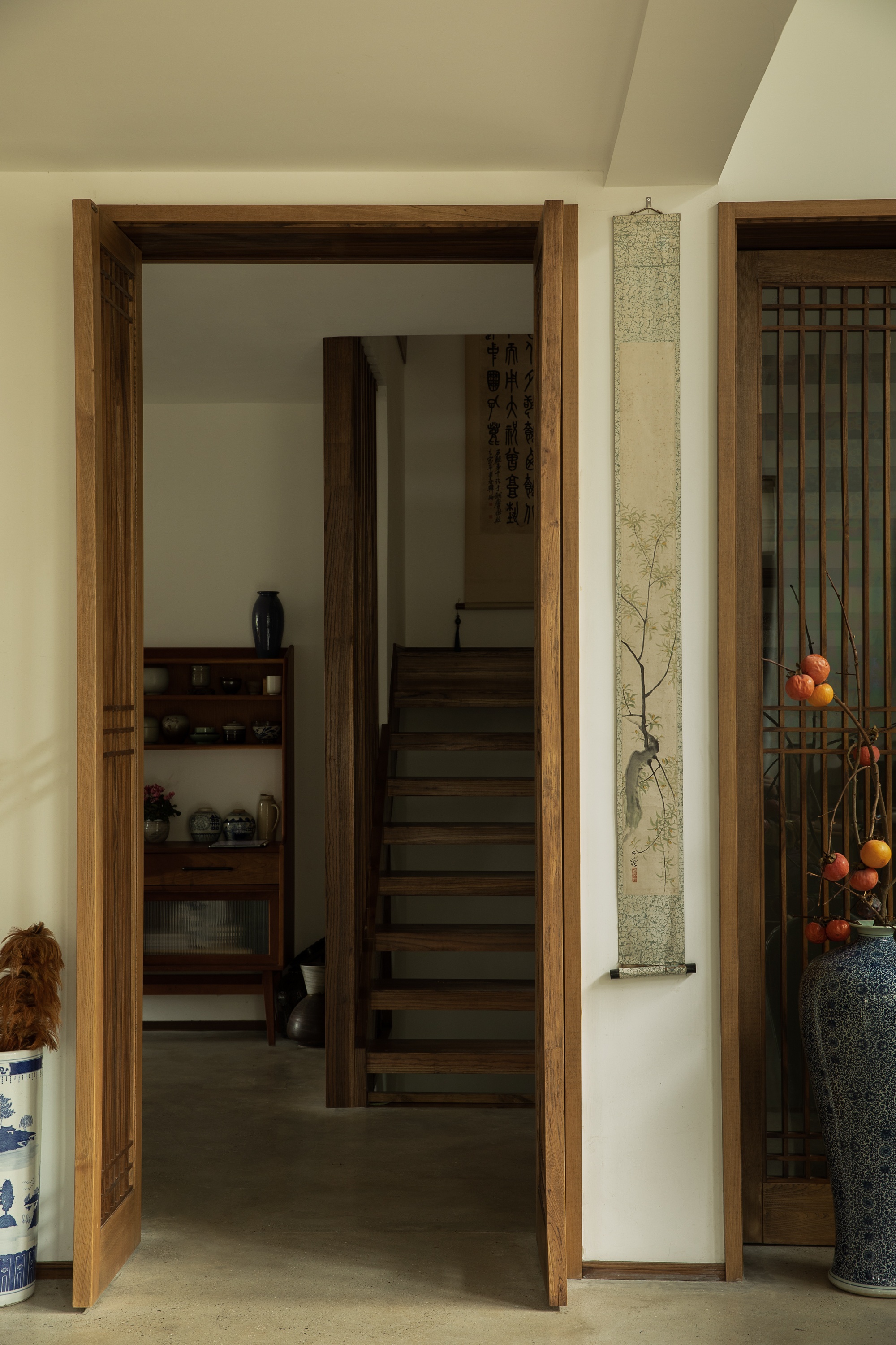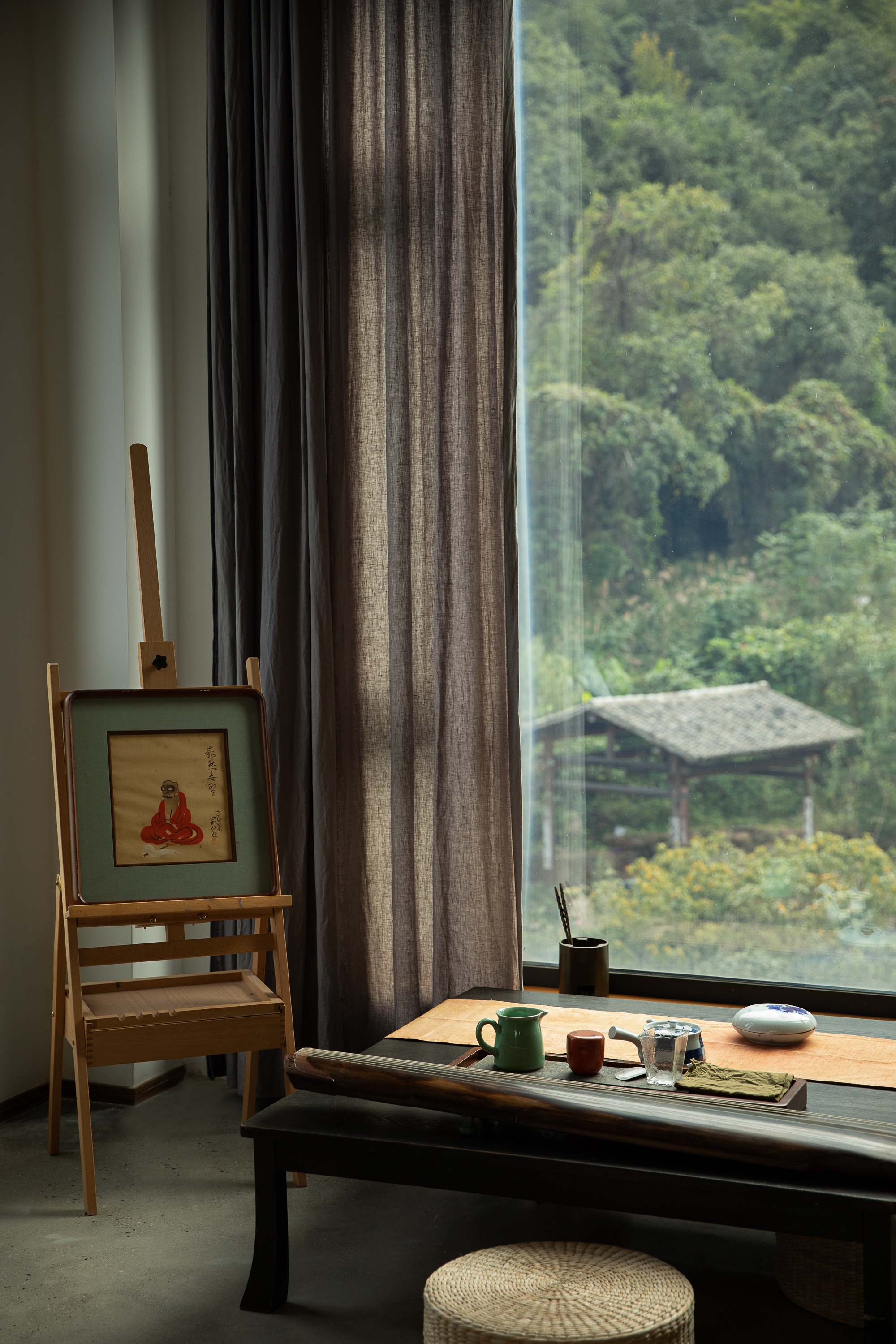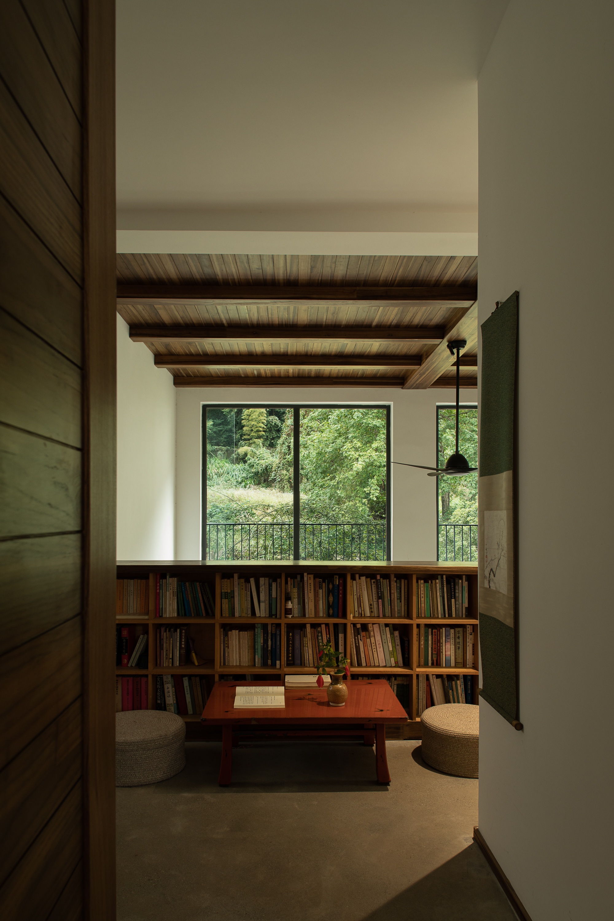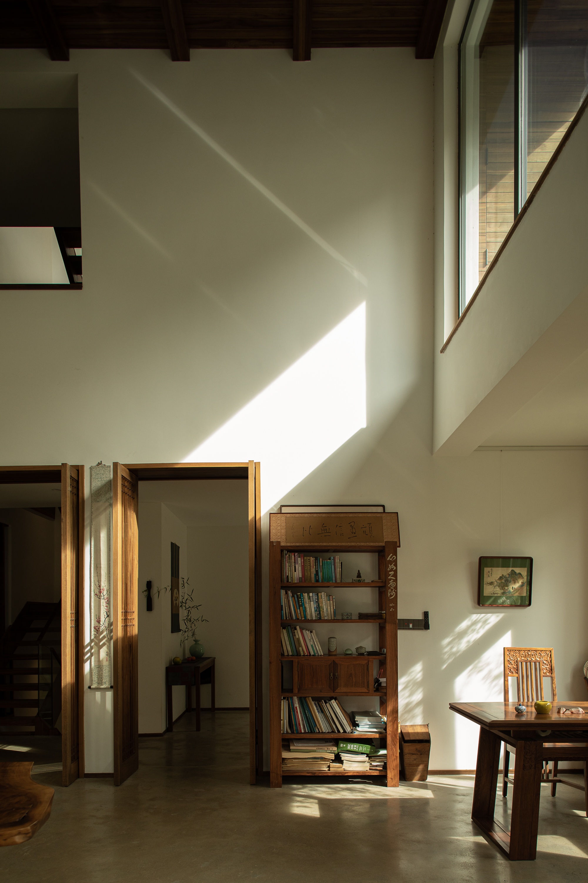 空间意境:设计通过框景手法消解室内外界限,借景入室,阳光透过窗外摇曳的树影,被切割成零散的斑驳投入室内,随着时间的流逝变幻着阴影的姿势,空间也因此而变得灵动而富有生命力。在这里,生活、工作、创作与休闲的界限被温柔消解——每个空间都承载着多重可能。全景式观景窗将山水引入室内,流动的空气与自然光影在空间中自由穿梭。这些未被预设的功能容器,随着使用者的需求自由生长,成为风与光栖居的透明载体。不同场景中悬挂的作品与看似随意摆设的装饰物件,皆来自居者日常的收藏,这些藏品随着心境变化调整位置,让家成为持续生长的生活美术馆,在真实的使用痕迹中展现艺术与生活的自然交融。原先位于三层的尖角阁楼结构被推翻,平面化顶部设计后,空间高度的提升带来使用感受的升级,在顶部开设天窗,光线自然撒落于桌面,赋予场景向上的张力与生命感,带来开阔的视觉体验,而时间的痕迹也因此被丰盈地纳入空间,日升月落都在四面八方的窗景中,轻易地被视线捕捉。