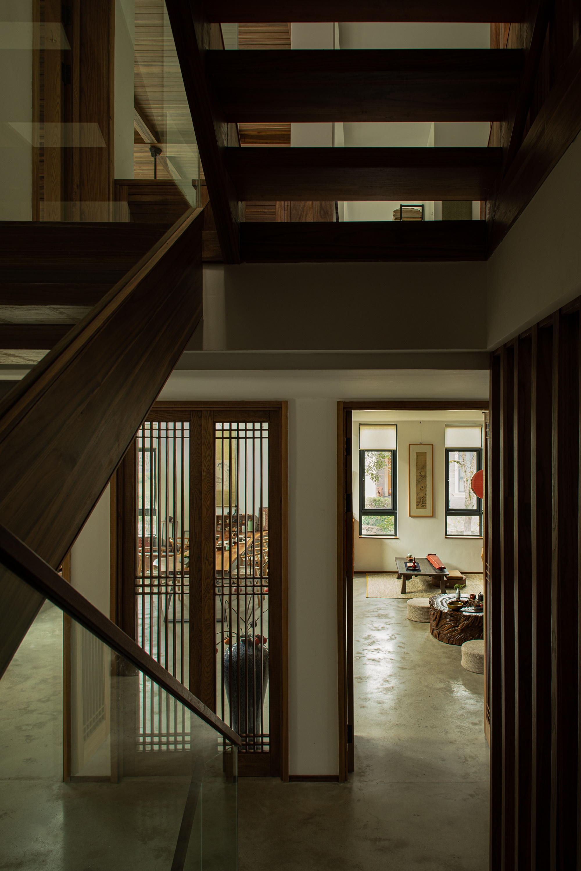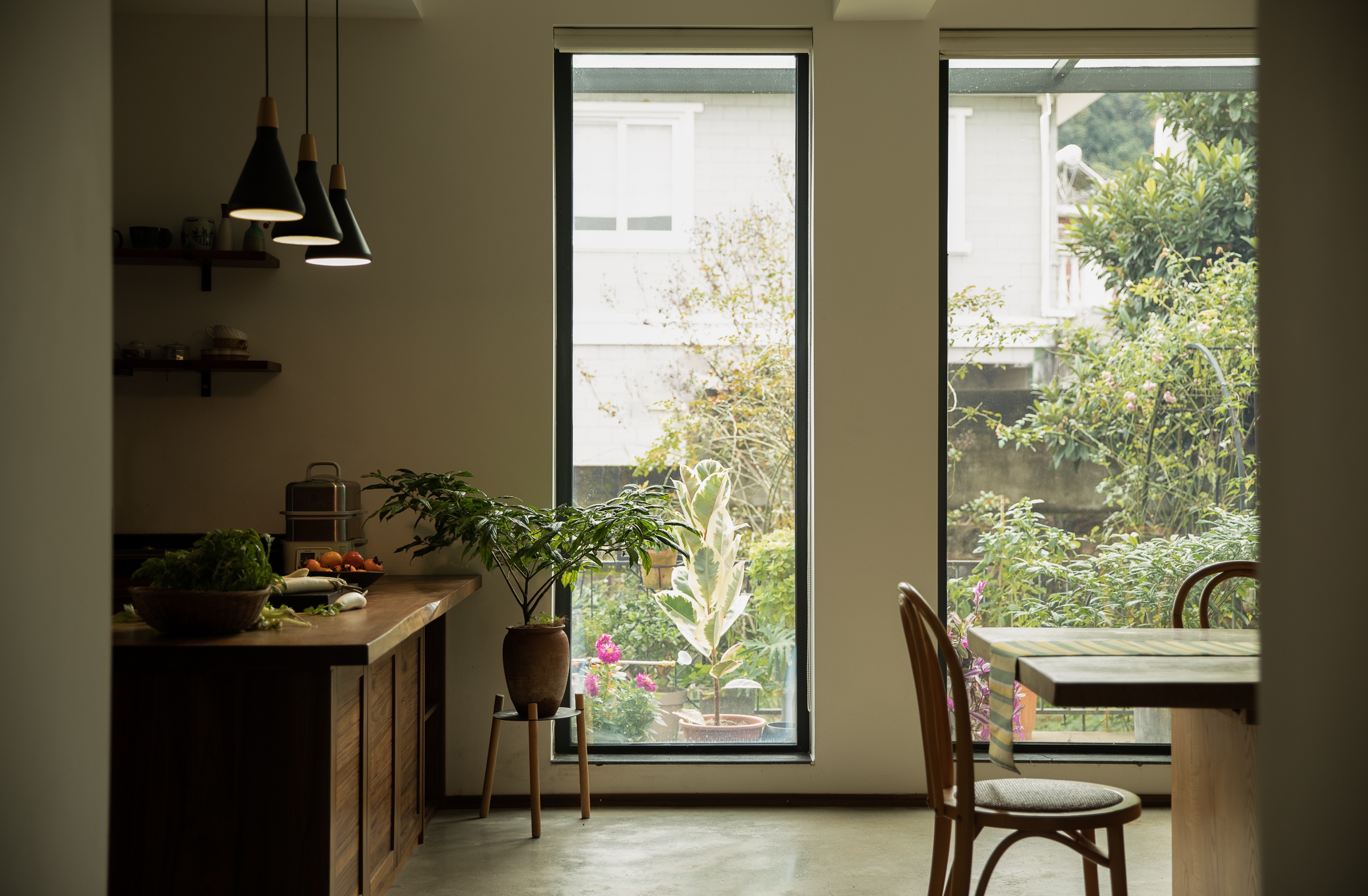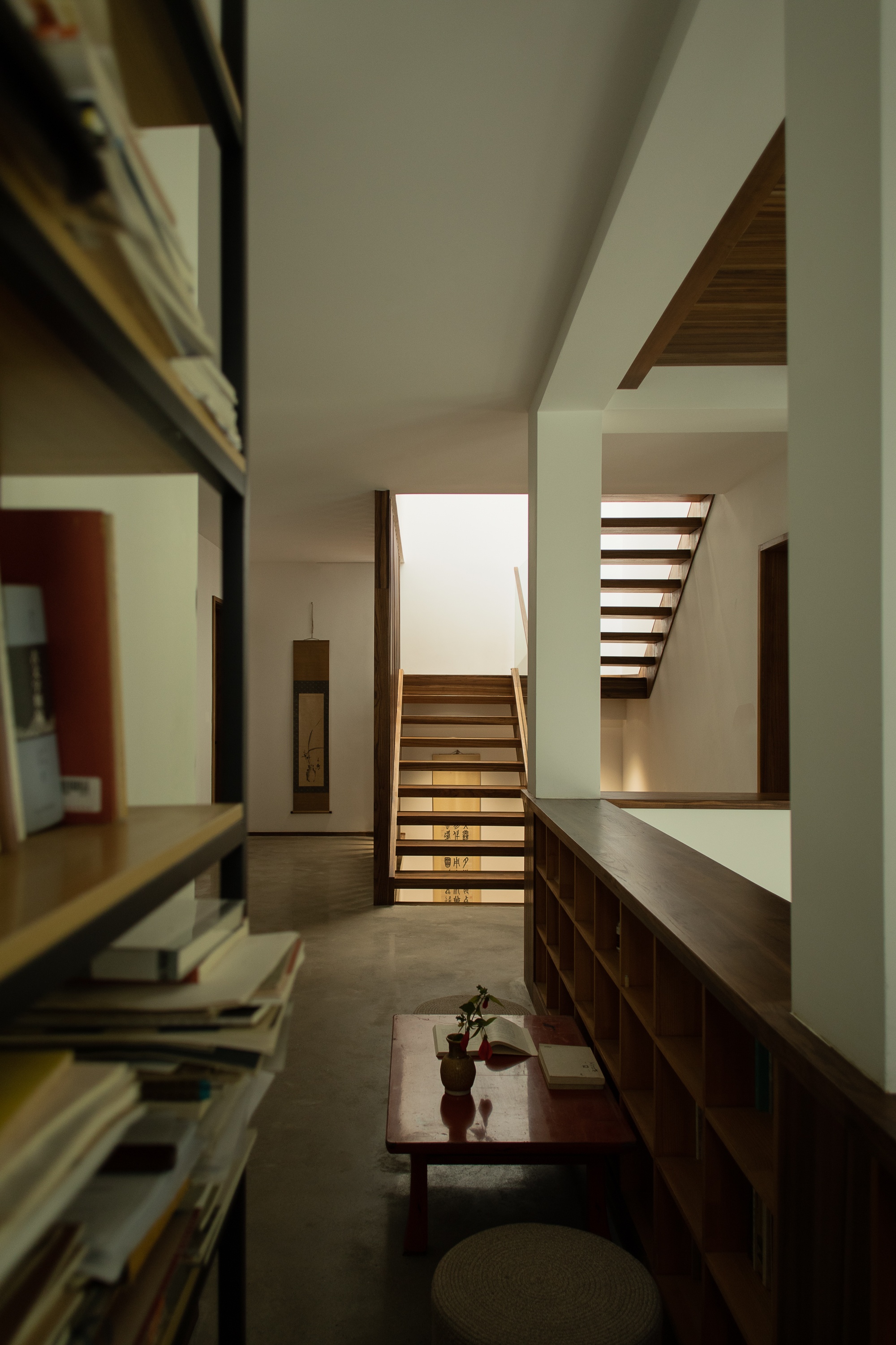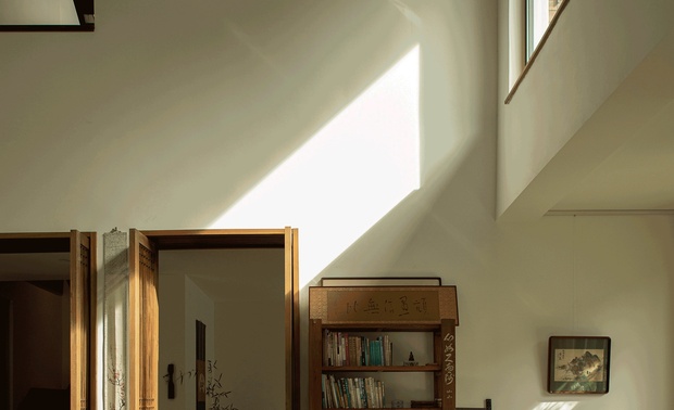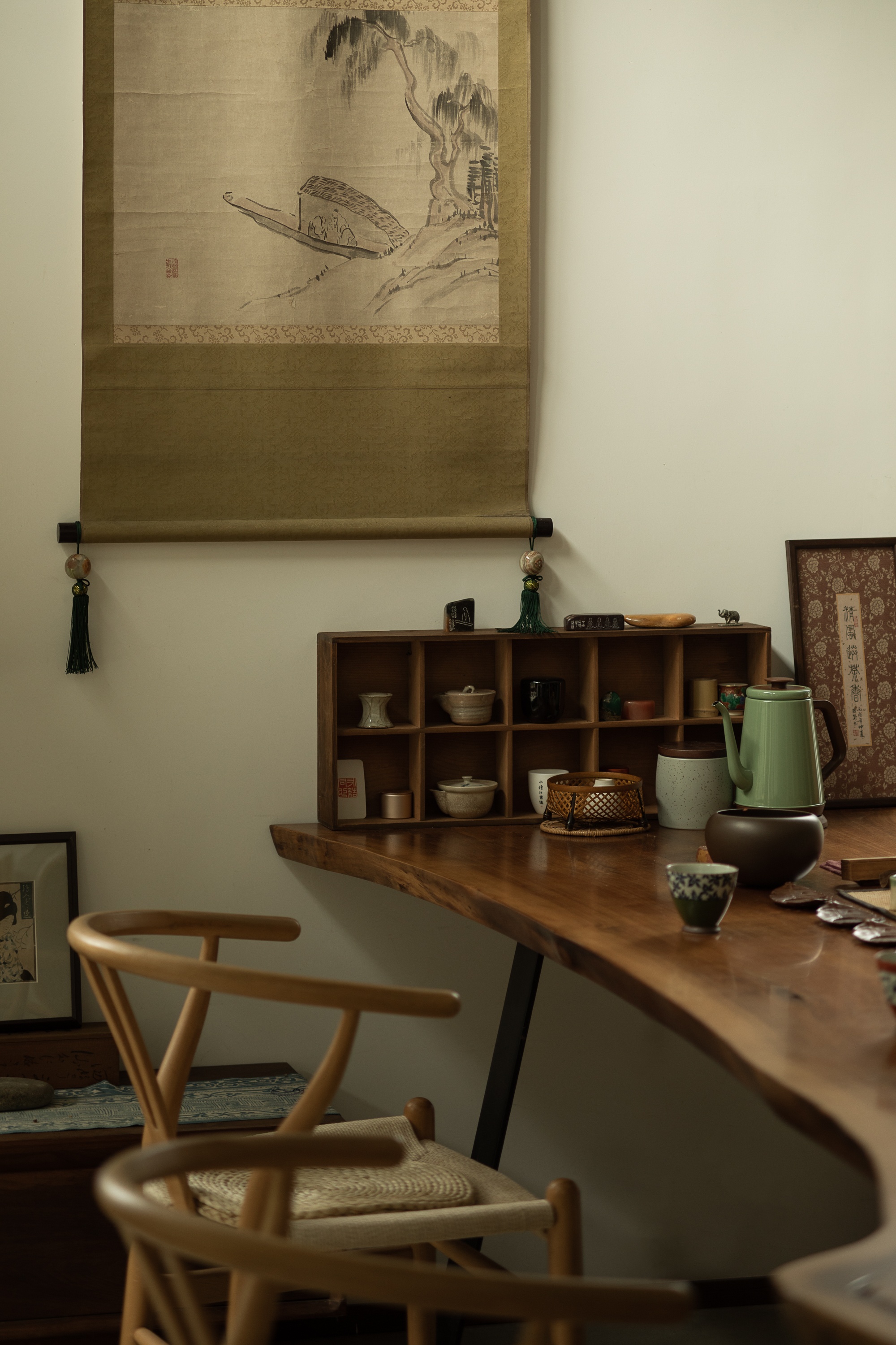 空间意境:设计通过框景手法消解室内外界限,借景入室,阳光透过窗外摇曳的树影,被切割成零散的斑驳投入室内,随着时间的流逝变幻着阴影的姿势,空间也因此而变得灵动而富有生命力。在这里,生活、工作、创作与休闲的界限被温柔消解——每个空间都承载着多重可能。全景式观景窗将山水引入室内,流动的空气与自然光影在空间中自由穿梭。这些未被预设的功能容器,随着使用者的需求自由生长,成为风与光栖居的透明载体。不同场景中悬挂的作品与看似随意摆设的装饰物件,皆来自居者日常的收藏,这些藏品随着心境变化调整位置,让家成为持续生长的生活美术馆,在真实的使用痕迹中展现艺术与生活的自然交融。原先位于三层的尖角阁楼结构被推翻,平面化顶部设计后,空间高度的提升带来使用感受的升级,在顶部开设天窗,光线自然撒落于桌面,赋予场景向上的张力与生命感,带来开阔的视觉体验,而时间的痕迹也因此被丰盈地纳入空间,日升月落都在四面八方的窗景中,轻易地被视线捕捉。