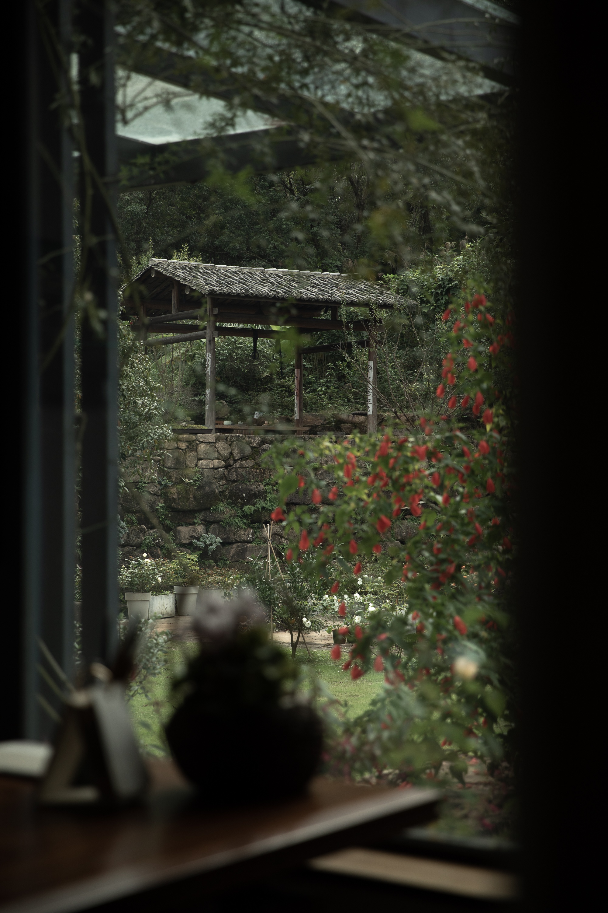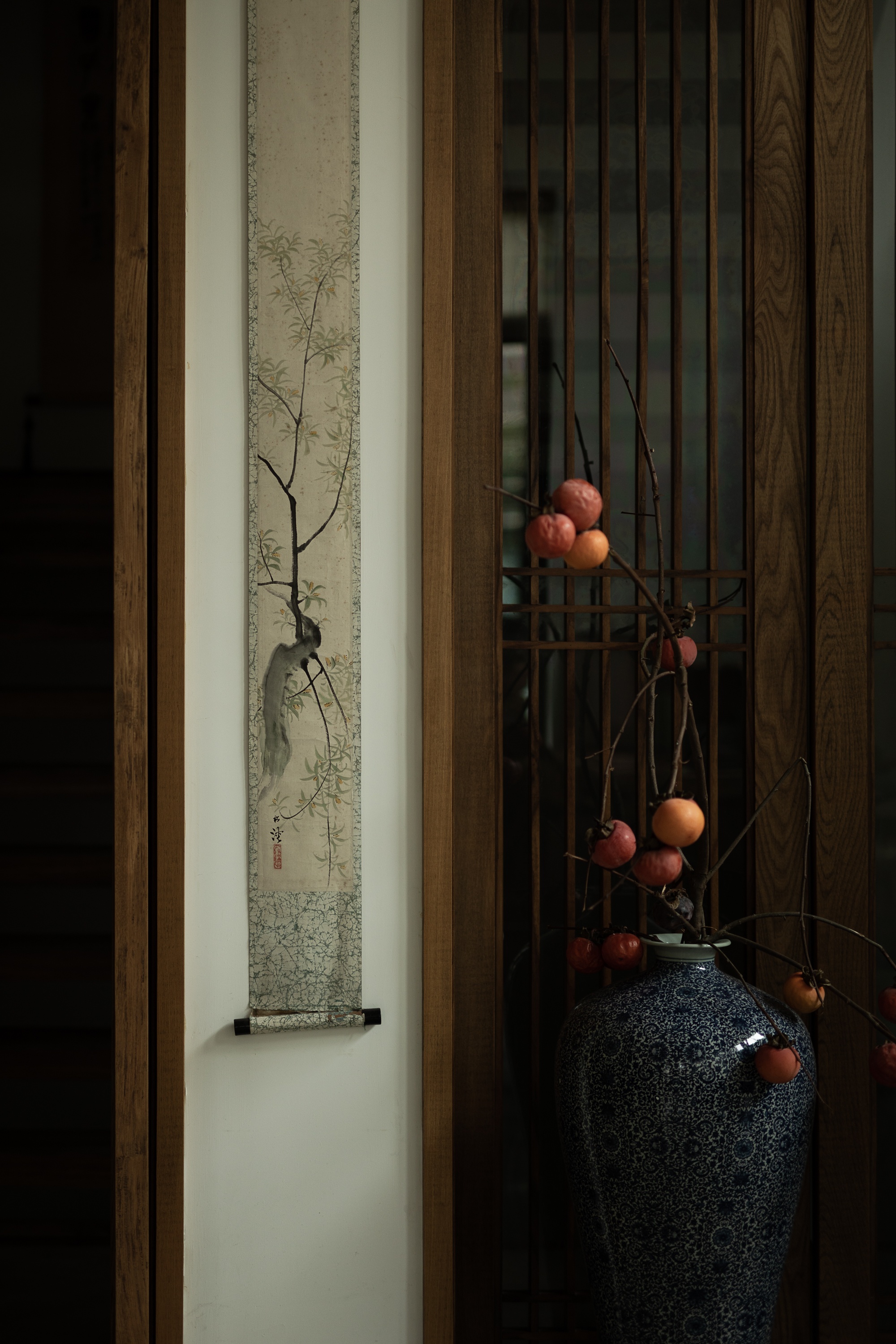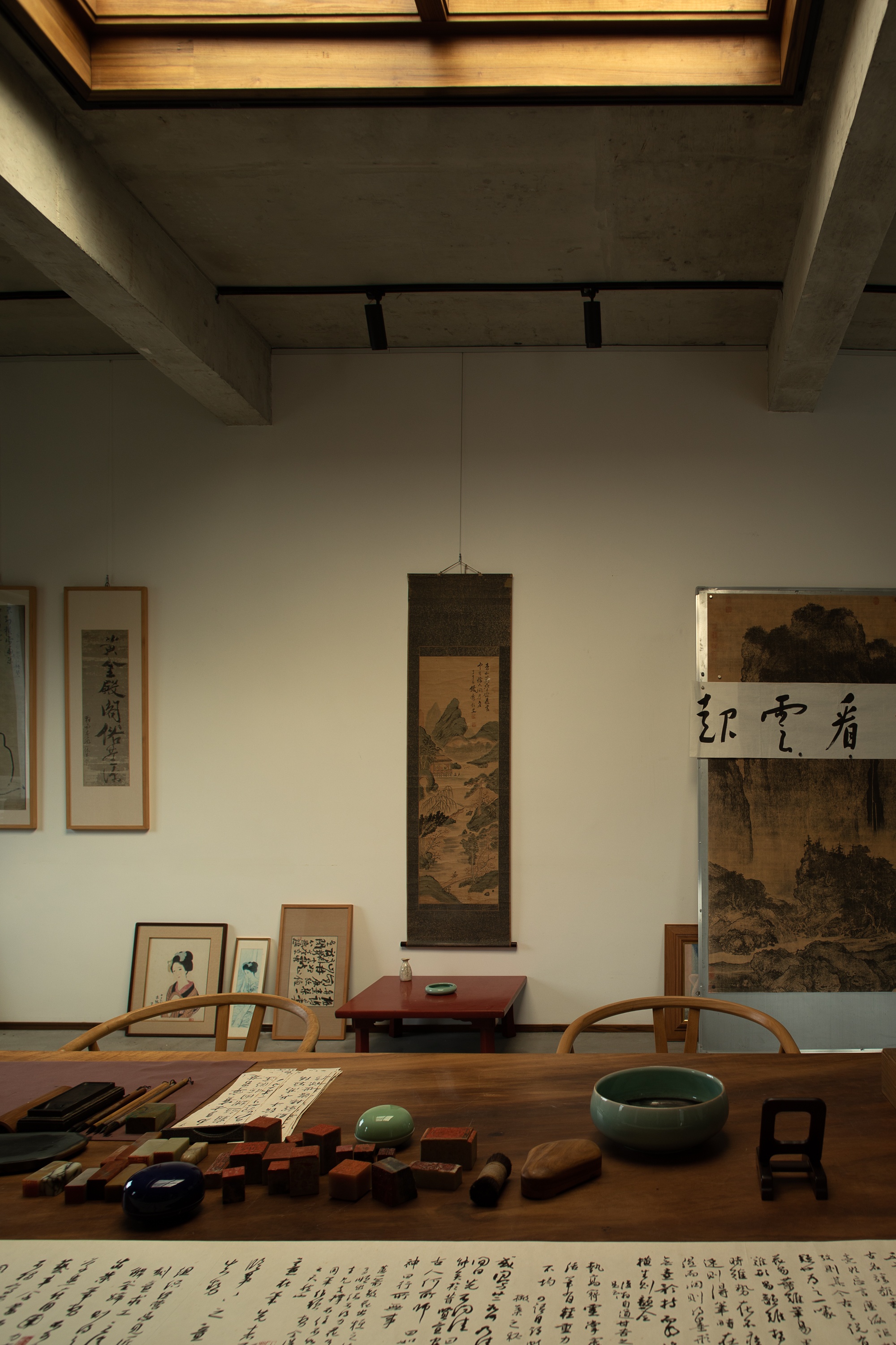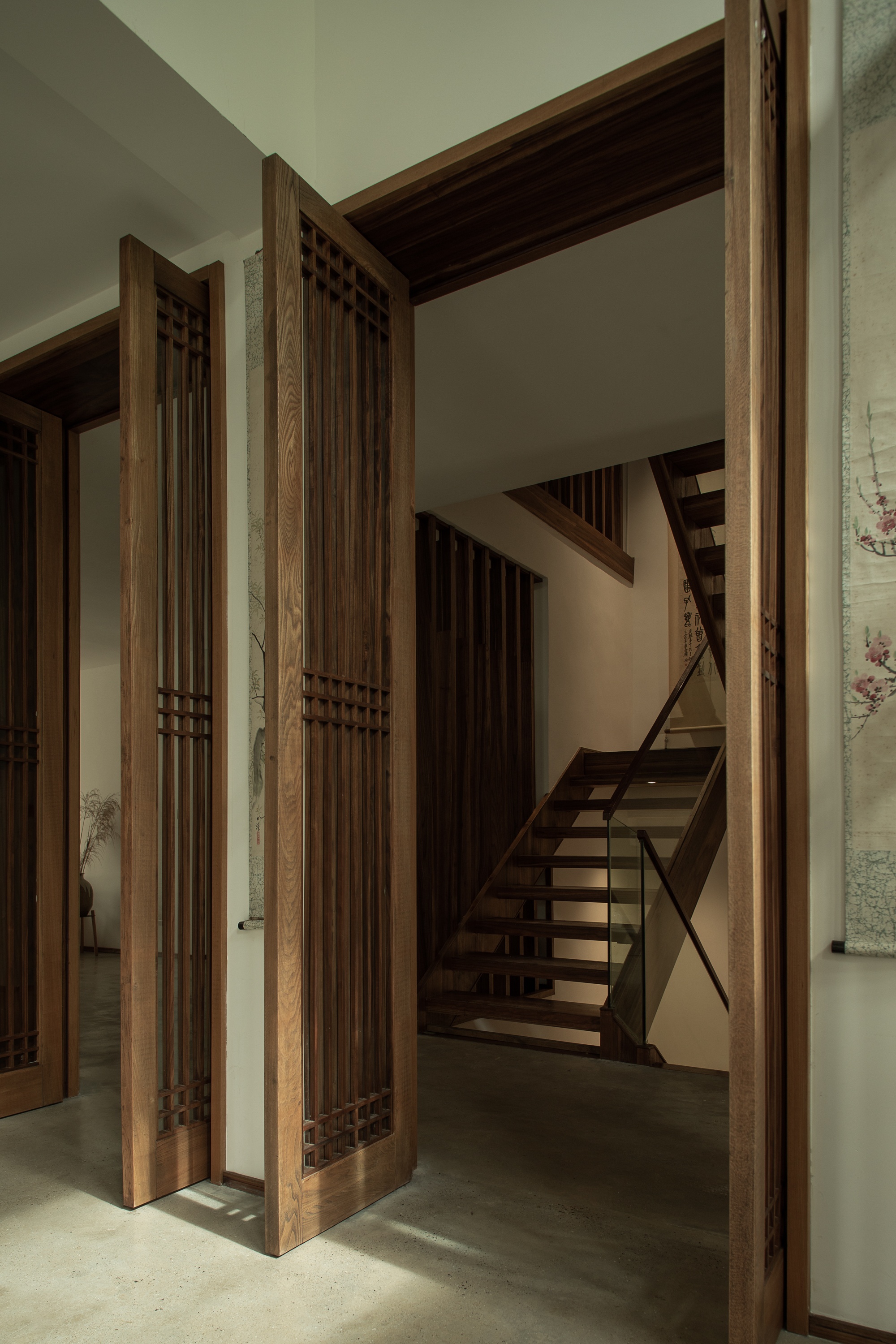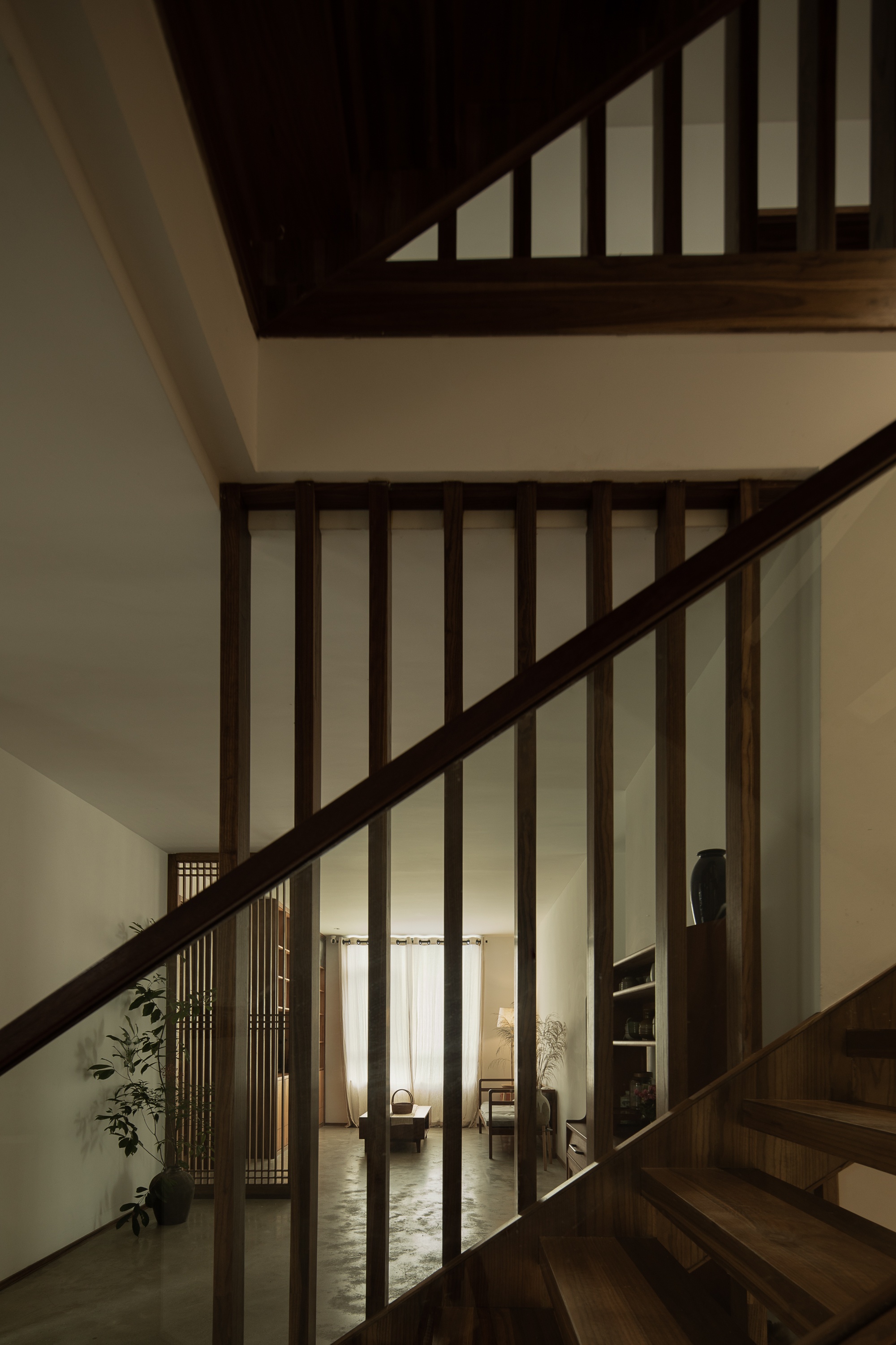 空间意境:设计通过框景手法消解室内外界限,借景入室,阳光透过窗外摇曳的树影,被切割成零散的斑驳投入室内,随着时间的流逝变幻着阴影的姿势,空间也因此而变得灵动而富有生命力。在这里,生活、工作、创作与休闲的界限被温柔消解——每个空间都承载着多重可能。全景式观景窗将山水引入室内,流动的空气与自然光影在空间中自由穿梭。这些未被预设的功能容器,随着使用者的需求自由生长,成为风与光栖居的透明载体。不同场景中悬挂的作品与看似随意摆设的装饰物件,皆来自居者日常的收藏,这些藏品随着心境变化调整位置,让家成为持续生长的生活美术馆,在真实的使用痕迹中展现艺术与生活的自然交融。原先位于三层的尖角阁楼结构被推翻,平面化顶部设计后,空间高度的提升带来使用感受的升级,在顶部开设天窗,光线自然撒落于桌面,赋予场景向上的张力与生命感,带来开阔的视觉体验,而时间的痕迹也因此被丰盈地纳入空间,日升月落都在四面八方的窗景中,轻易地被视线捕捉。