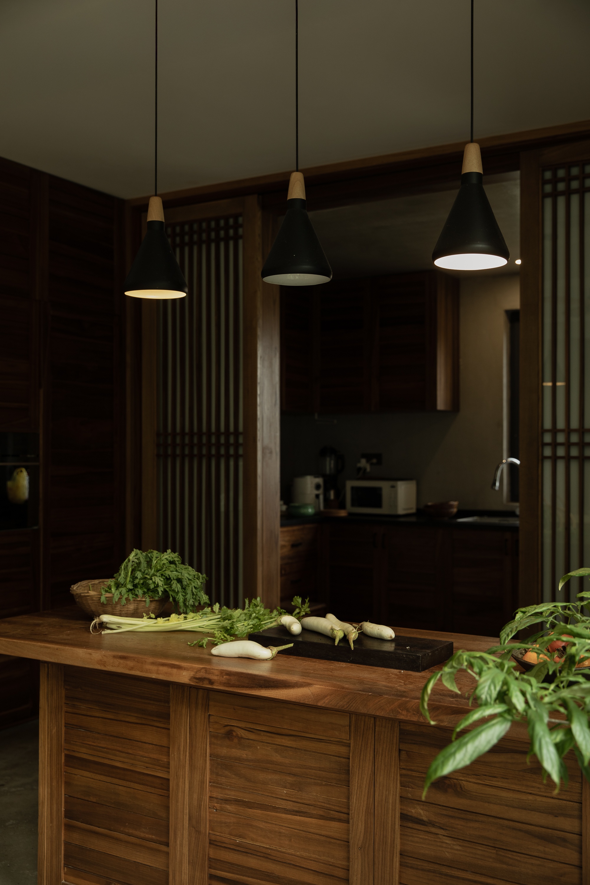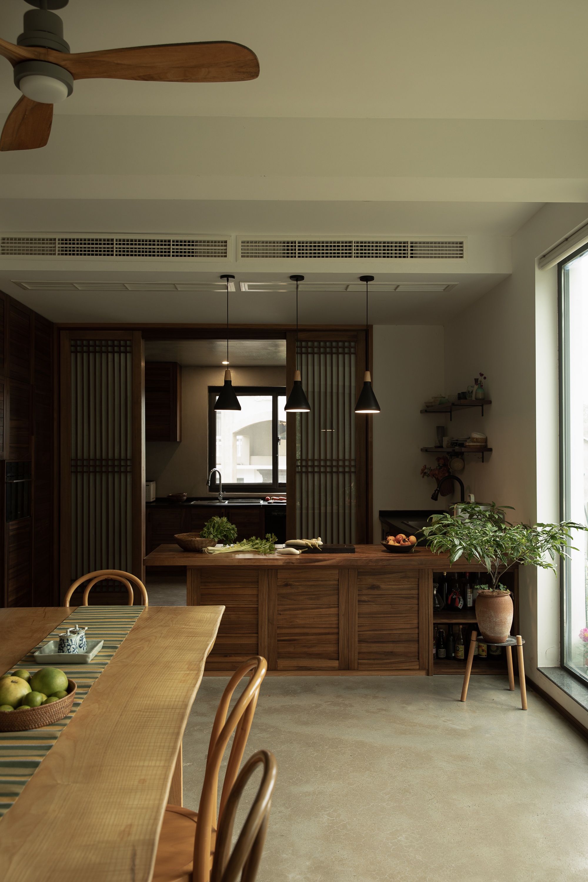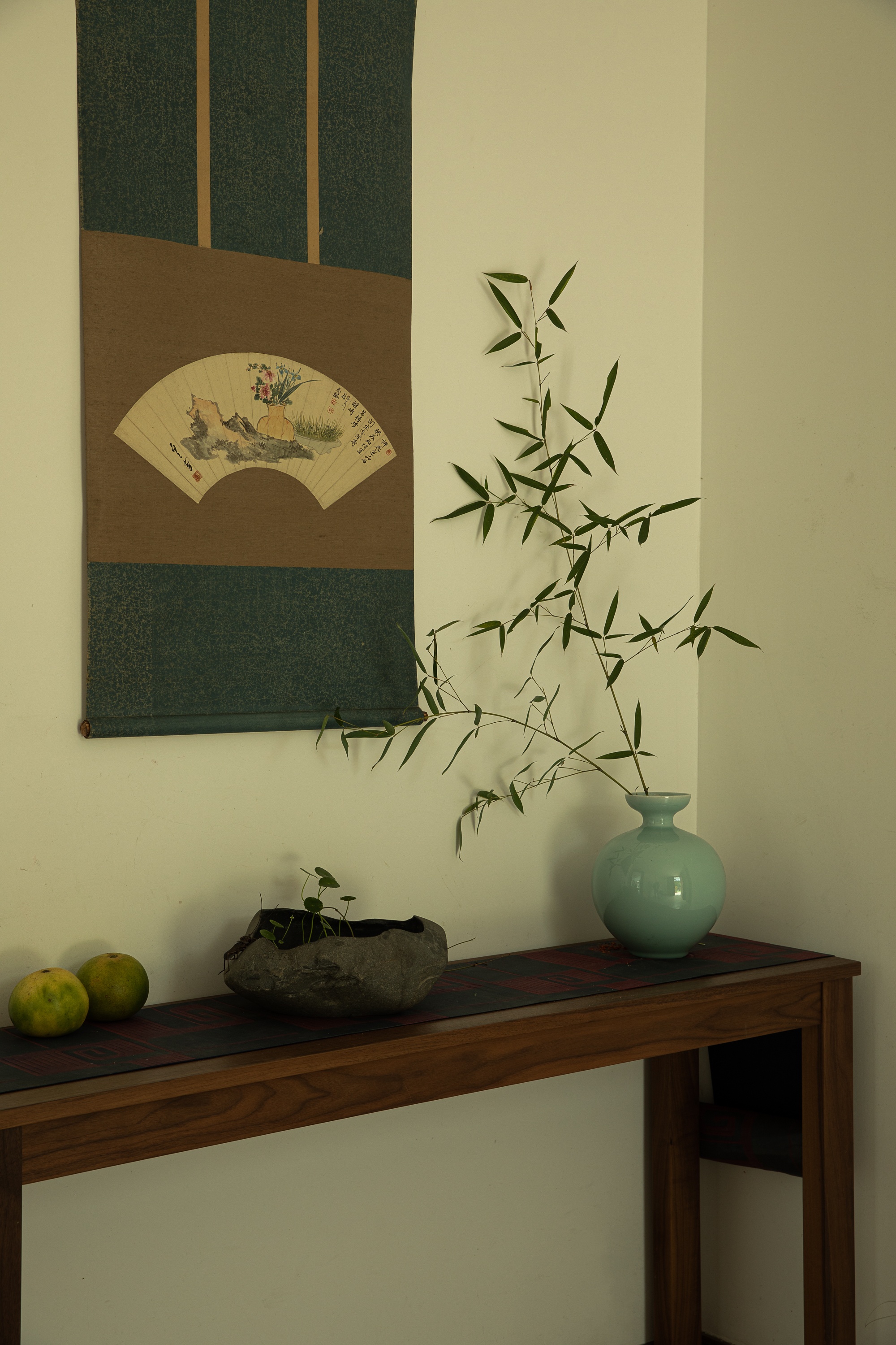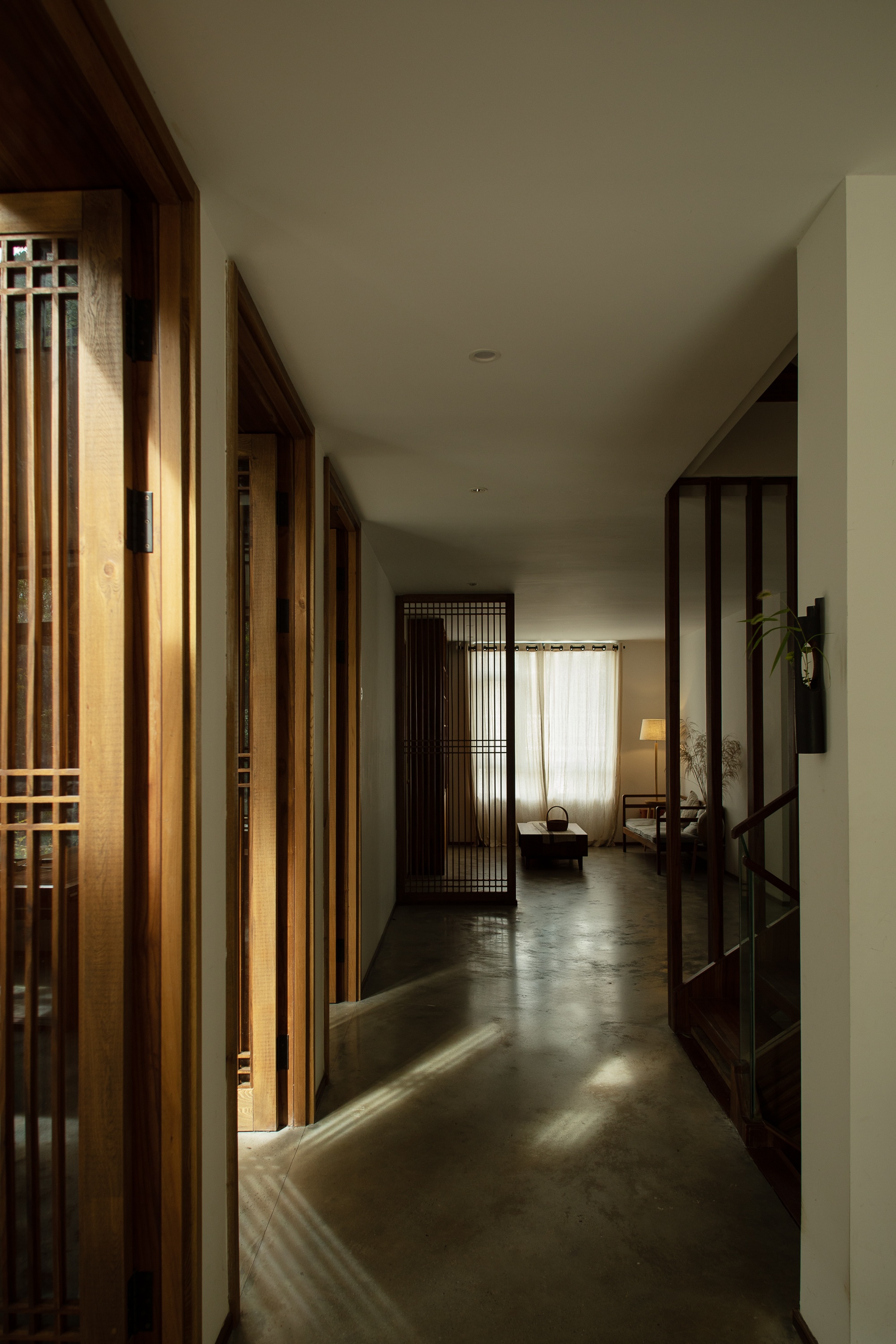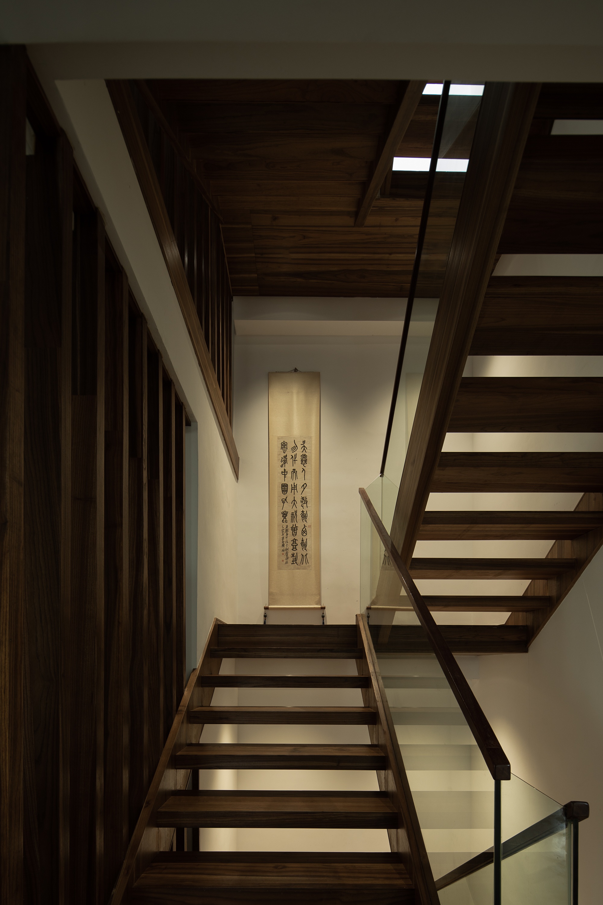 空间意境:设计通过框景手法消解室内外界限,借景入室,阳光透过窗外摇曳的树影,被切割成零散的斑驳投入室内,随着时间的流逝变幻着阴影的姿势,空间也因此而变得灵动而富有生命力。在这里,生活、工作、创作与休闲的界限被温柔消解——每个空间都承载着多重可能。全景式观景窗将山水引入室内,流动的空气与自然光影在空间中自由穿梭。这些未被预设的功能容器,随着使用者的需求自由生长,成为风与光栖居的透明载体。不同场景中悬挂的作品与看似随意摆设的装饰物件,皆来自居者日常的收藏,这些藏品随着心境变化调整位置,让家成为持续生长的生活美术馆,在真实的使用痕迹中展现艺术与生活的自然交融。原先位于三层的尖角阁楼结构被推翻,平面化顶部设计后,空间高度的提升带来使用感受的升级,在顶部开设天窗,光线自然撒落于桌面,赋予场景向上的张力与生命感,带来开阔的视觉体验,而时间的痕迹也因此被丰盈地纳入空间,日升月落都在四面八方的窗景中,轻易地被视线捕捉。