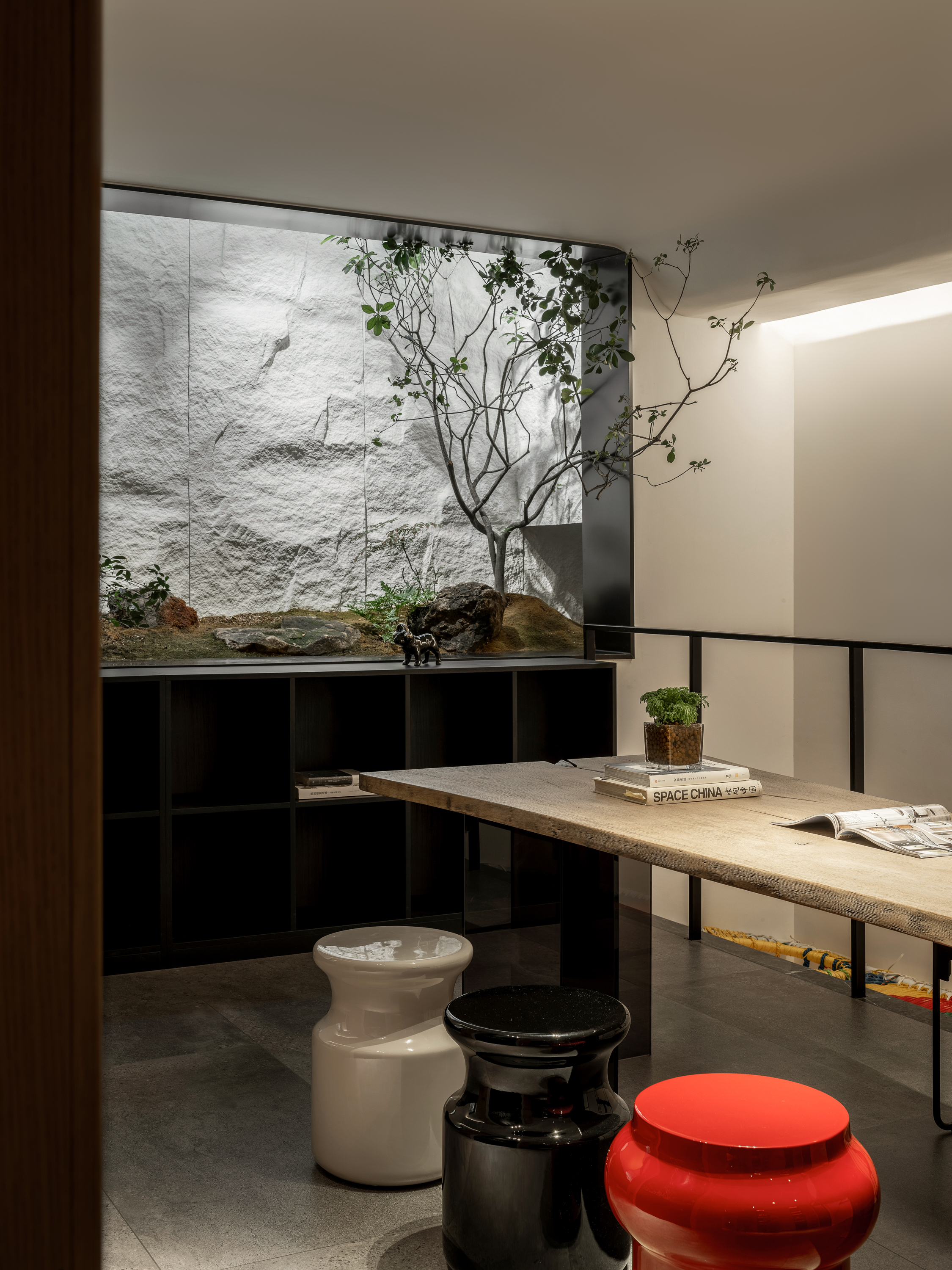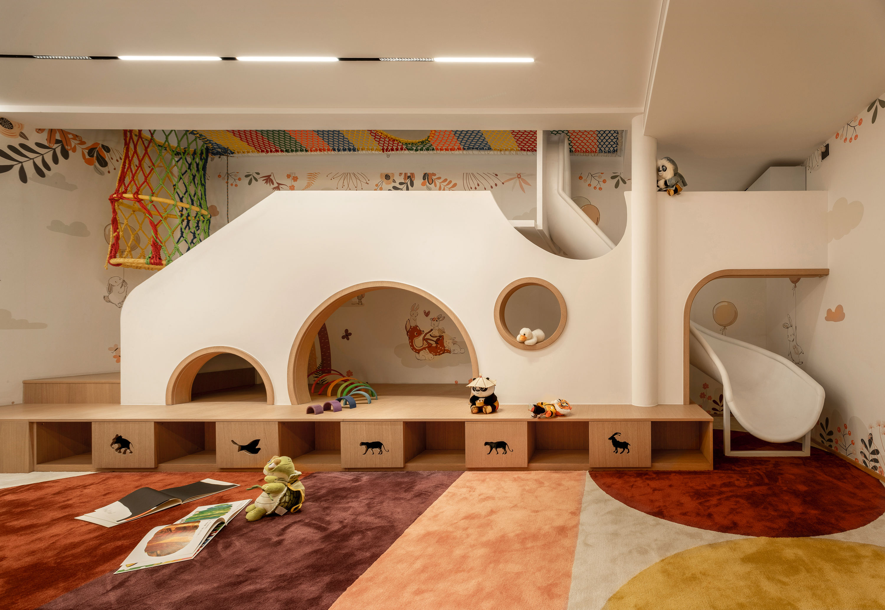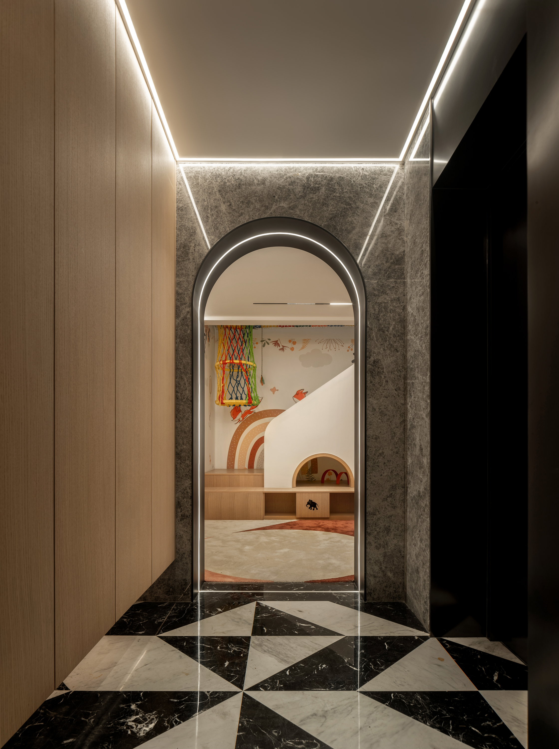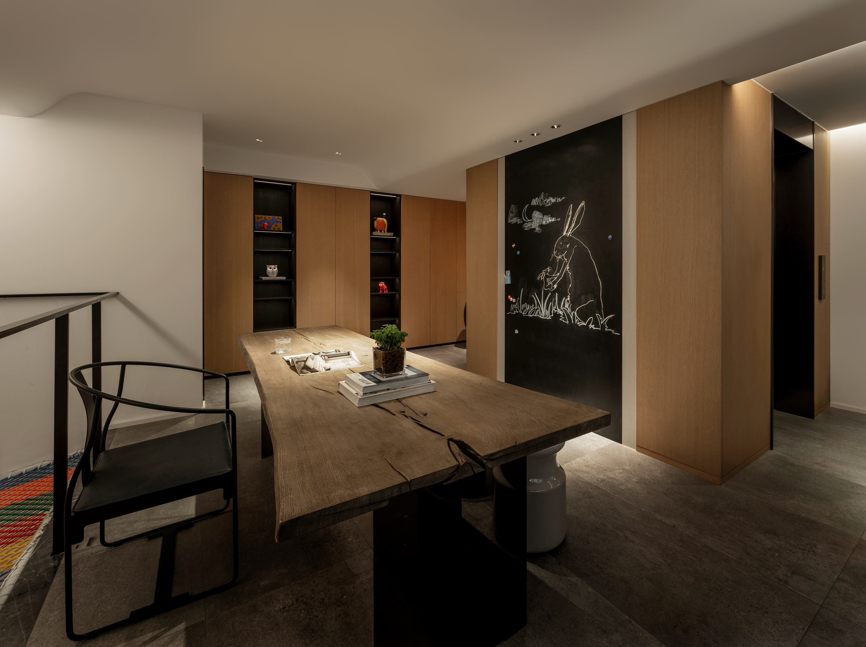 空间意境:原有负一、负二层单层面积仅40㎡,空间局促。设计通过打通两层楼板,形成上下联动的儿童成长区,负二层作为娱乐区,设置大象滑梯、攀爬网与躲猫猫角落,并结合入户衣帽间与储物功能,趣味与实用并存。负一层为绘本与学习空间,下沉天井被改造为小花园,自然光与绿意引入室内,缓解地下的压抑感。楼板开口不仅带来光线,更串联滑梯与攀爬设施,让孩子们在两层间自由穿梭。中间层作为家庭公共空间,容纳客厅与餐厅;上下层分别为长辈与主人居所,实现代际私密与动静分区。