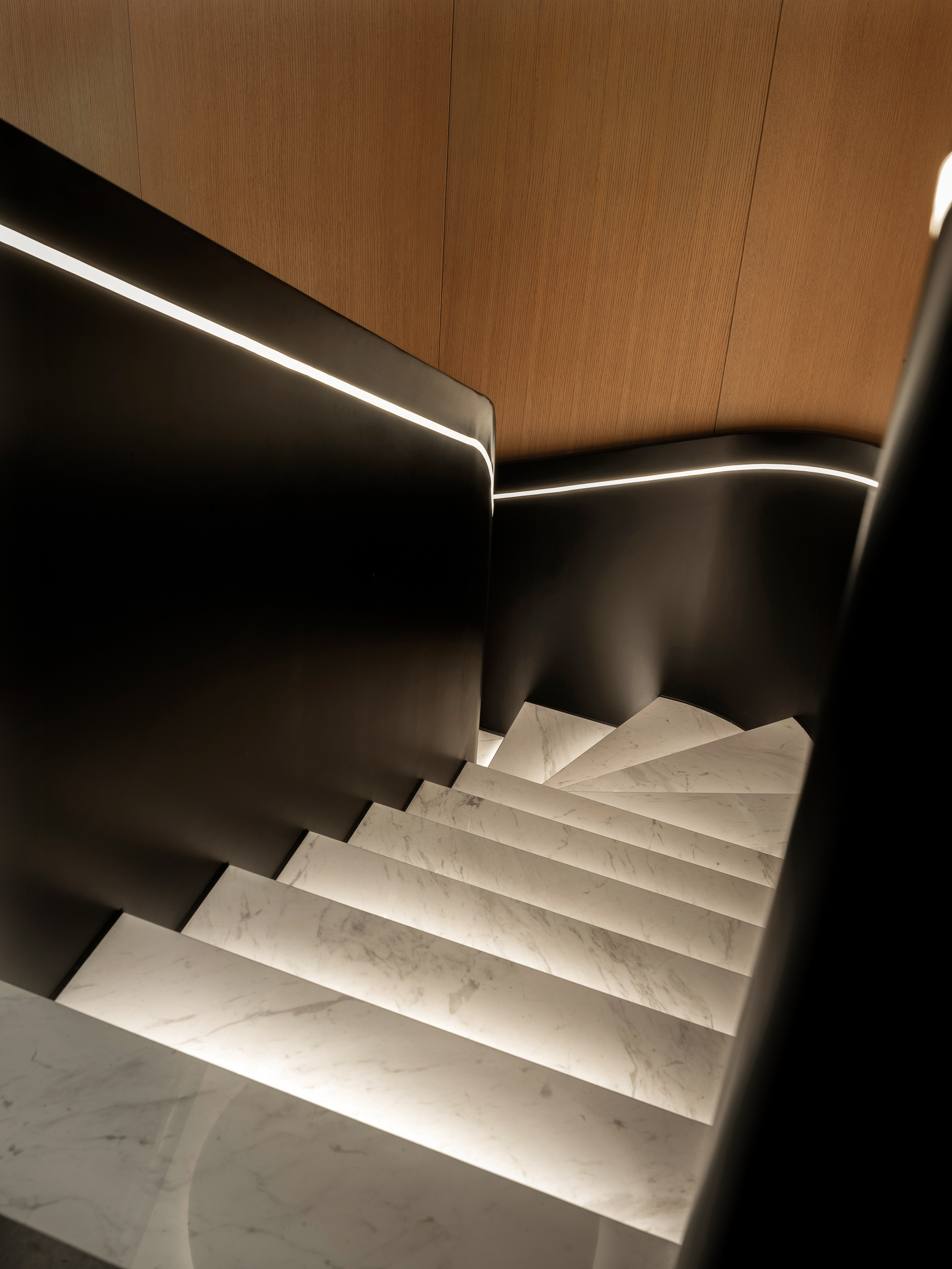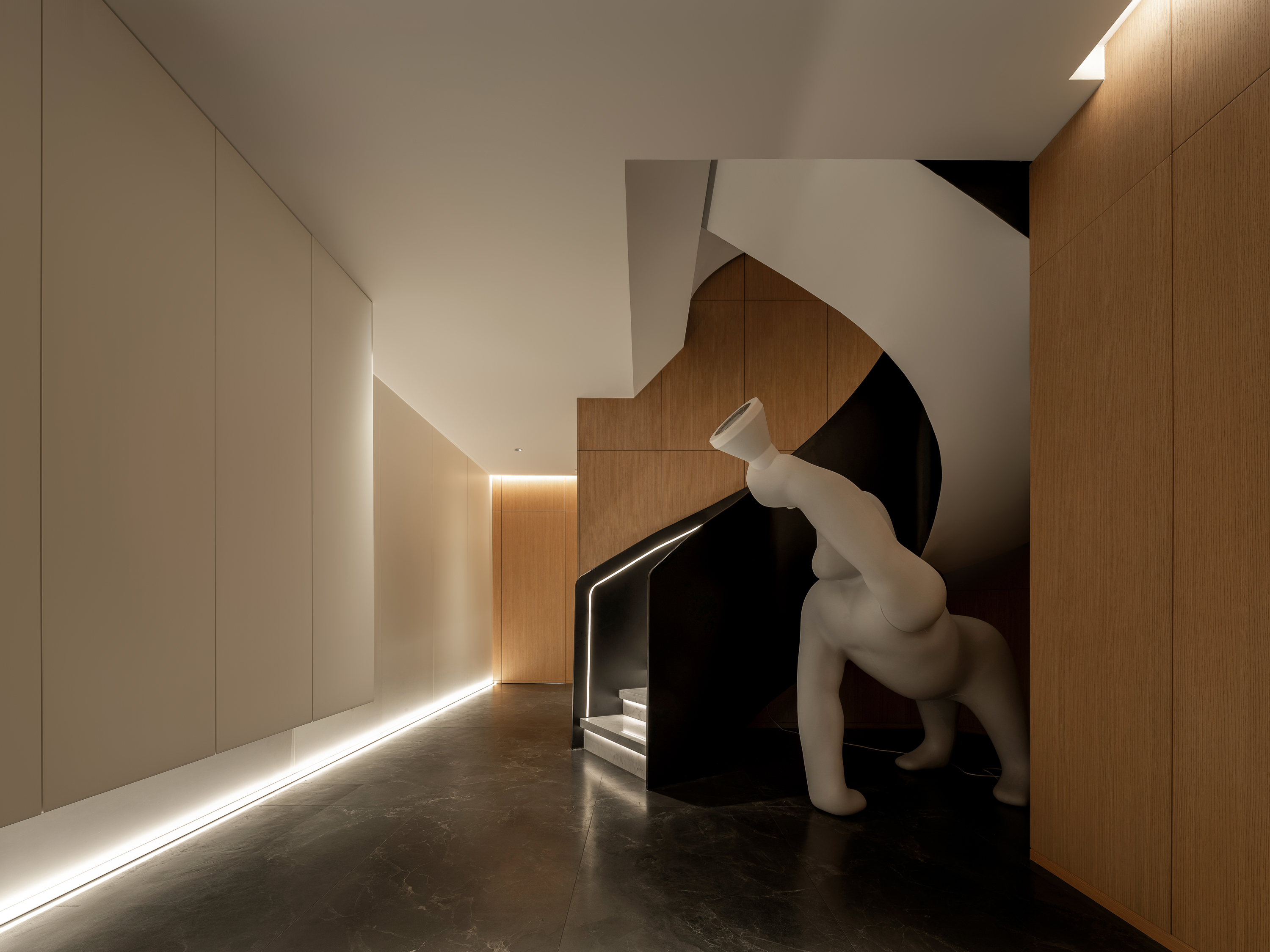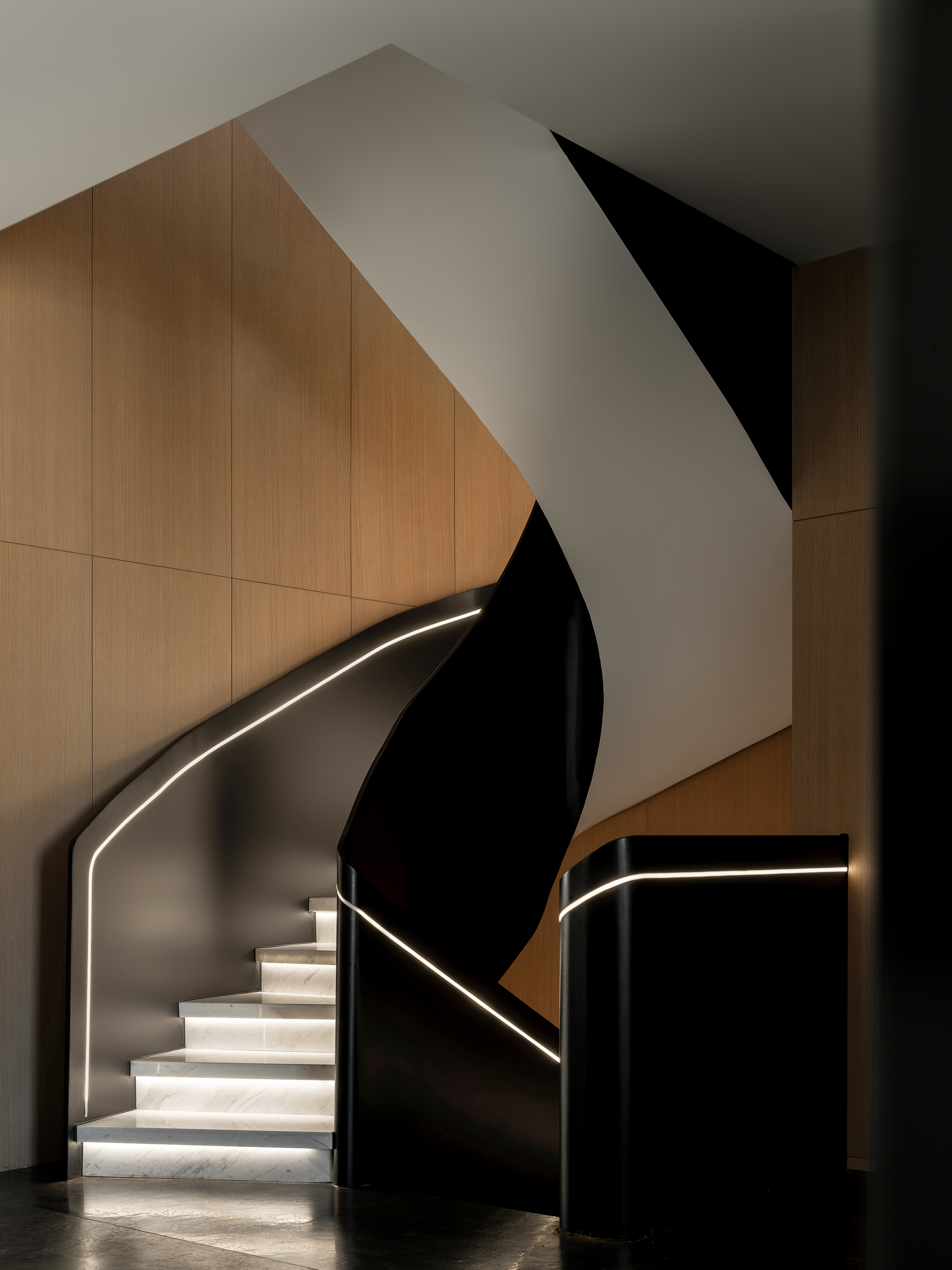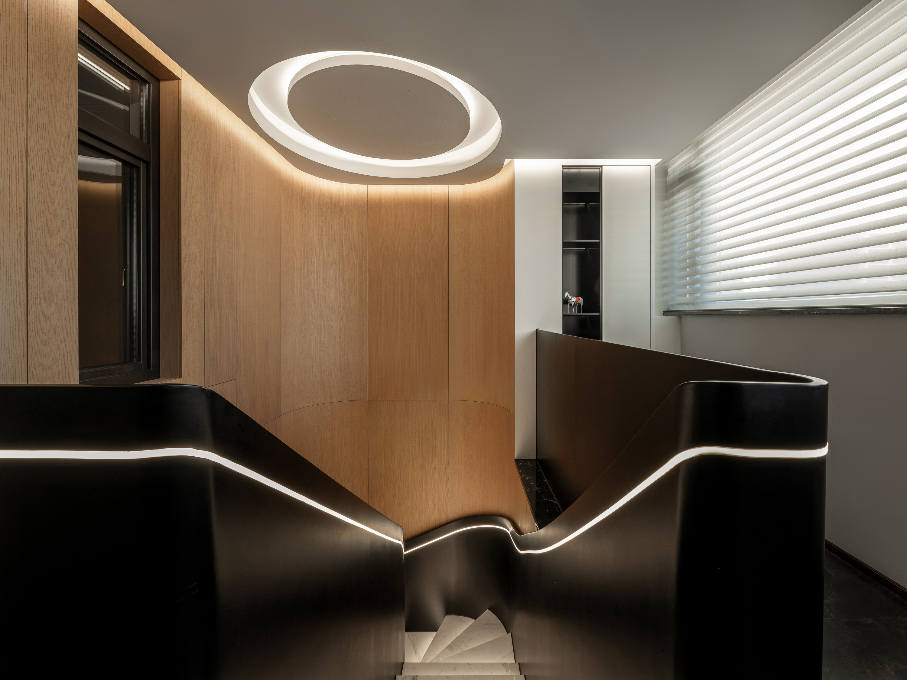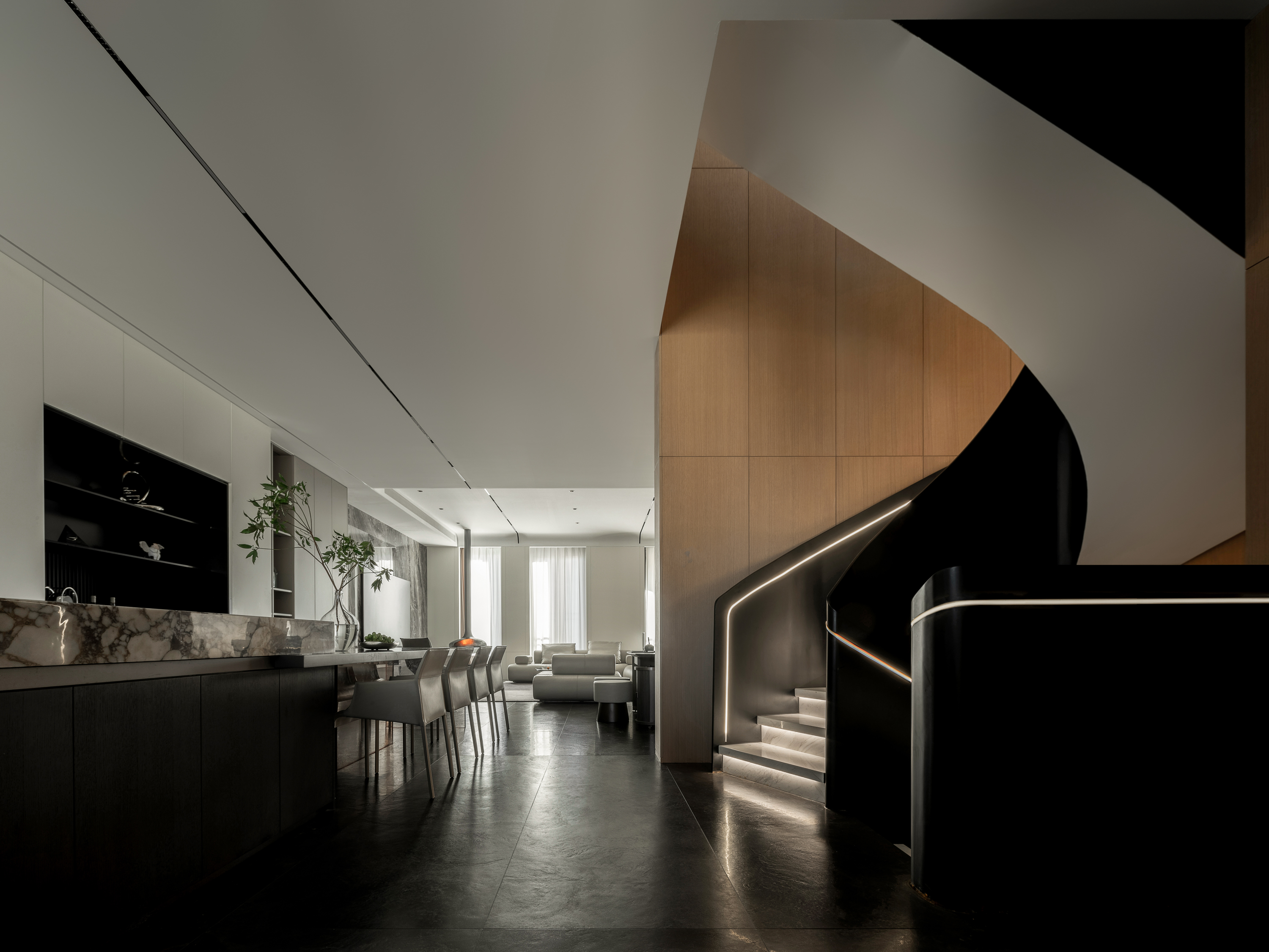 本案为一栋地上三层、地下两层的别墅。设计以现代为基调,在黑白木色的冷静框架中,融入石材与金属的细节点缀,营造温馨而雅致的氛围。空间逻辑上,我们着重解决家庭互动与私密分区的平衡,并通过结构优化与功能重组,为居住注入更多生活的叙事性。 -