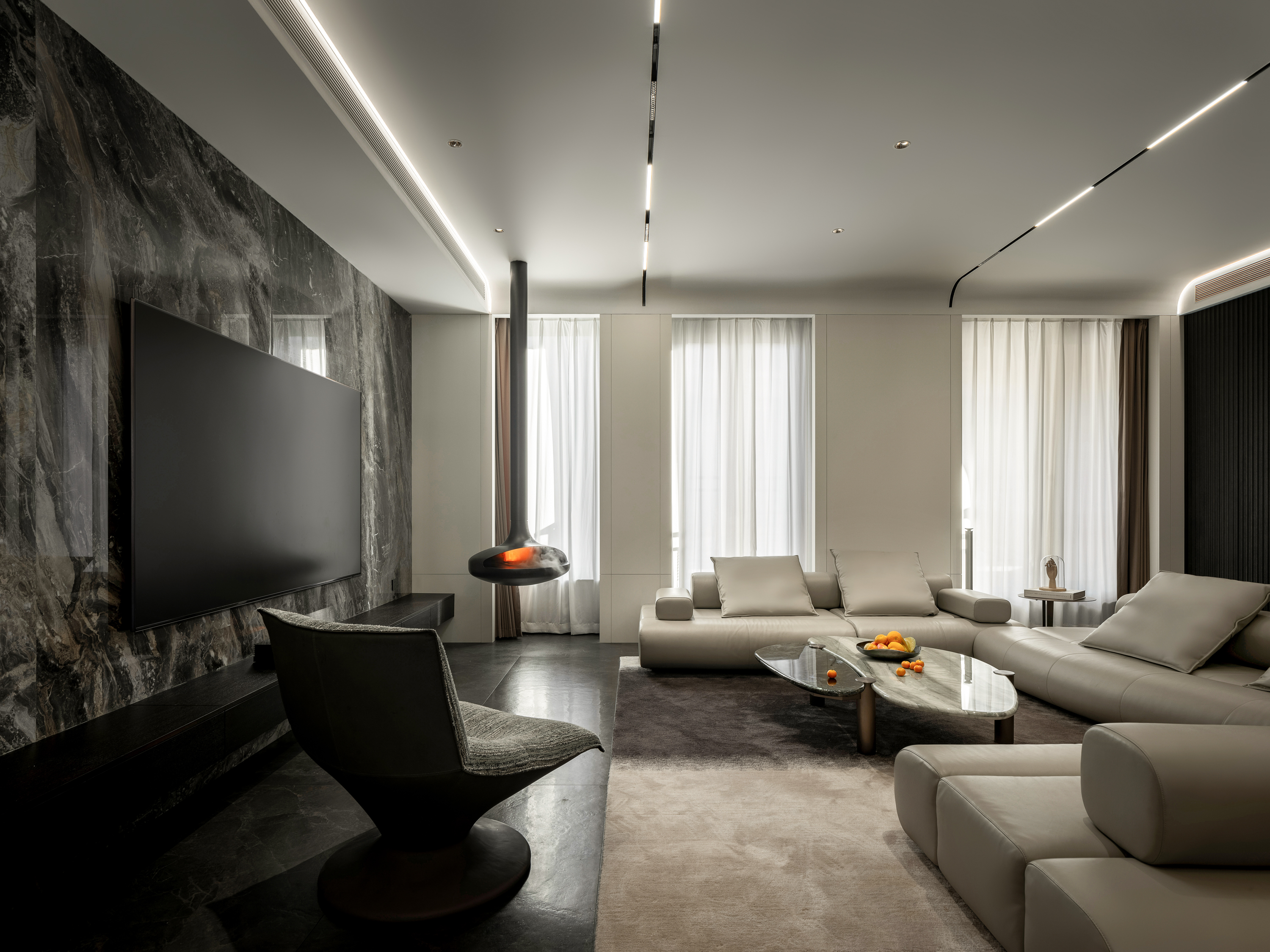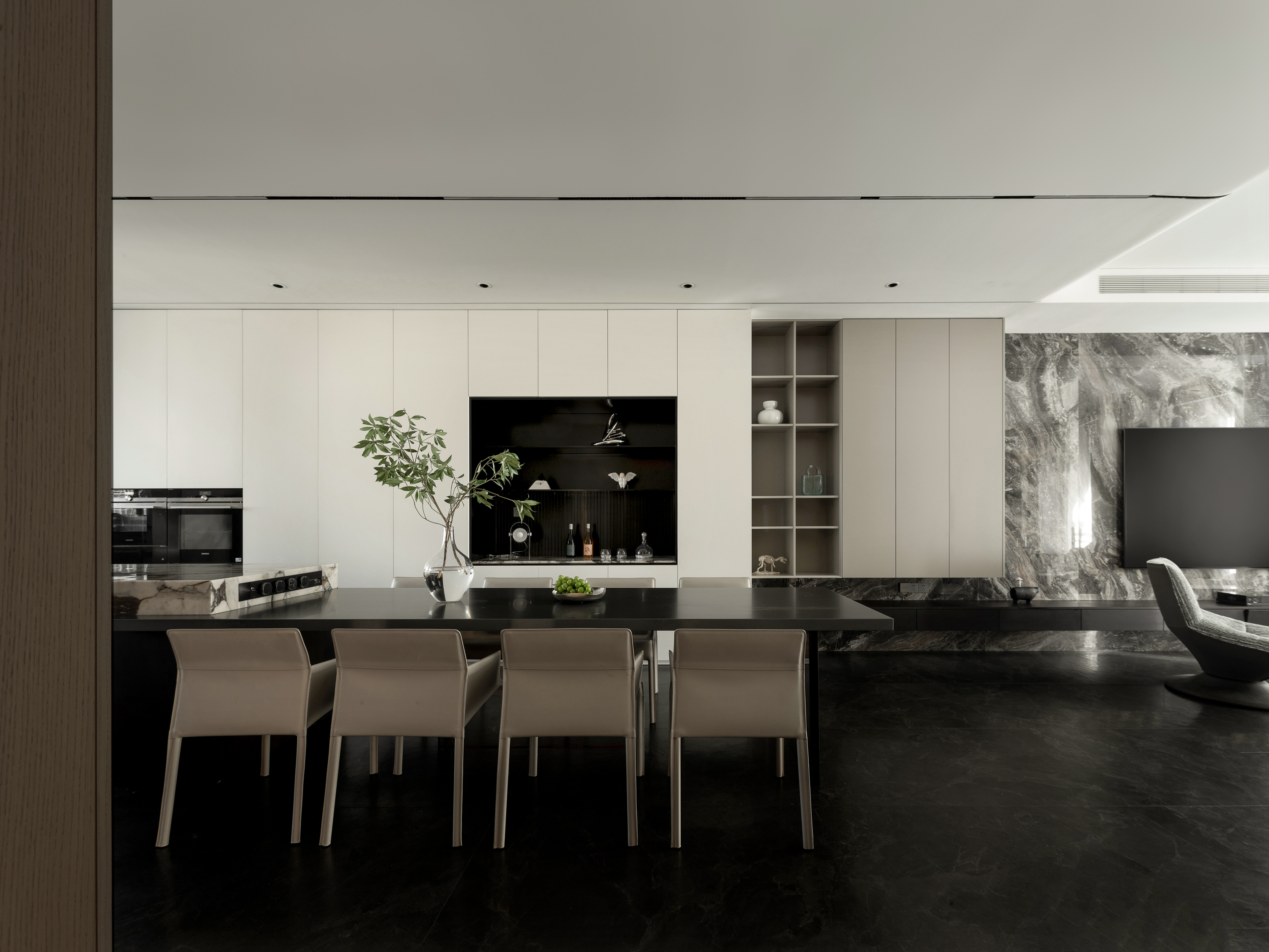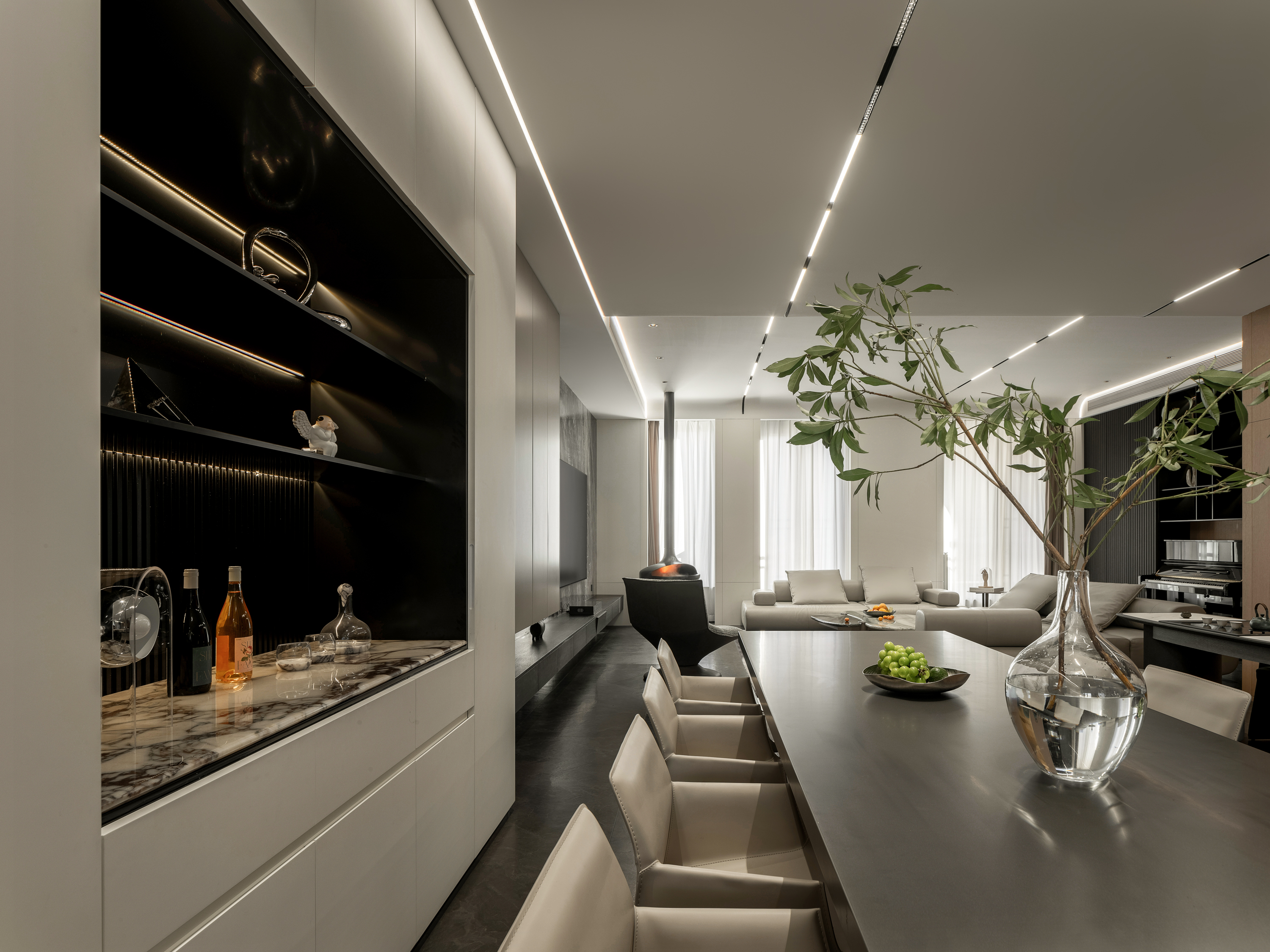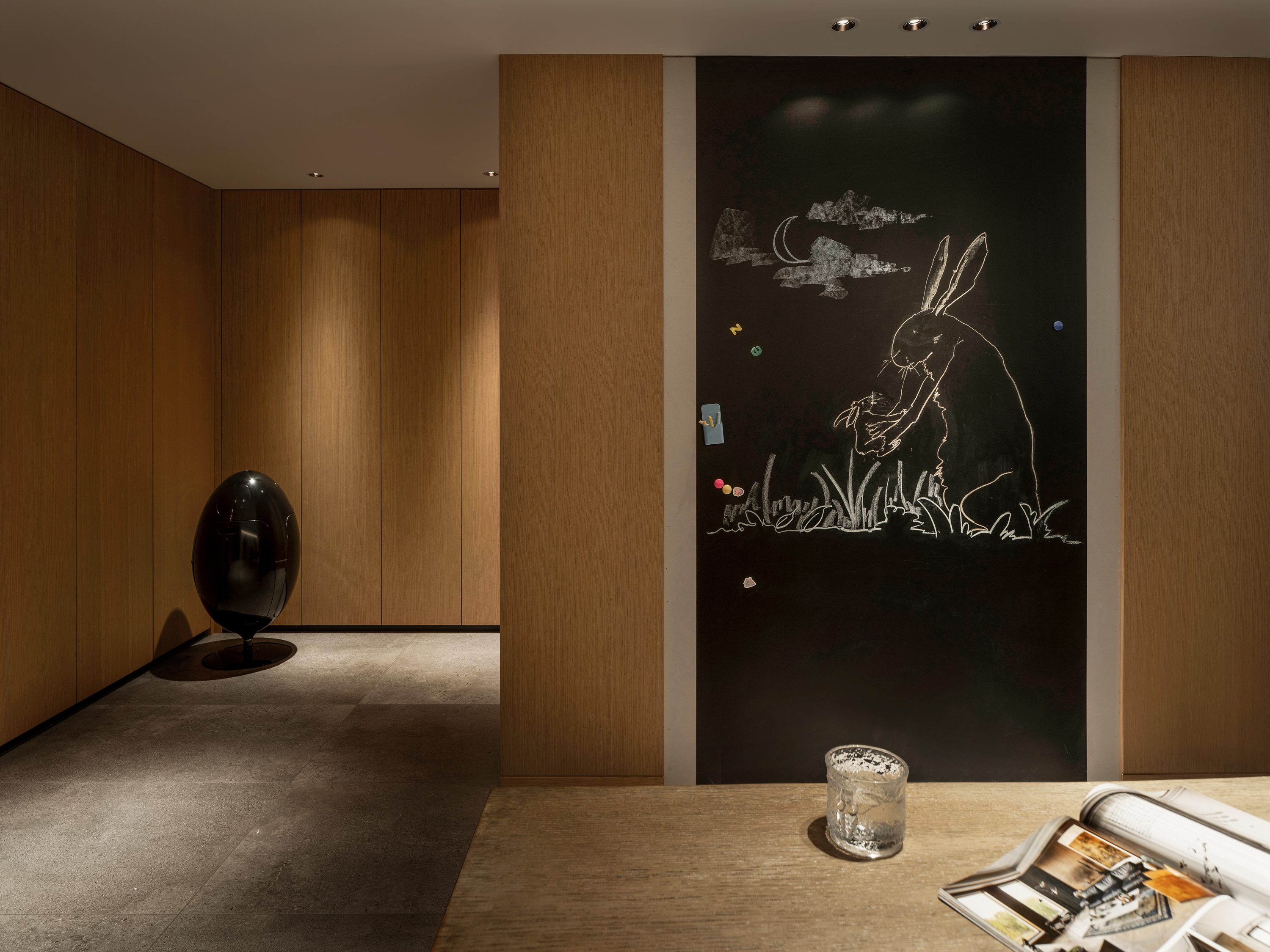 设计选材:整体空间延续“简洁、克制”的原则:黑白木色作为底色,粉色宝格丽石材与金属细节成为点晴;灯光设计则强化了楼梯、餐岛与下沉花园等关键节点,使空间在功能之外,具备更强的艺术性与叙事感。