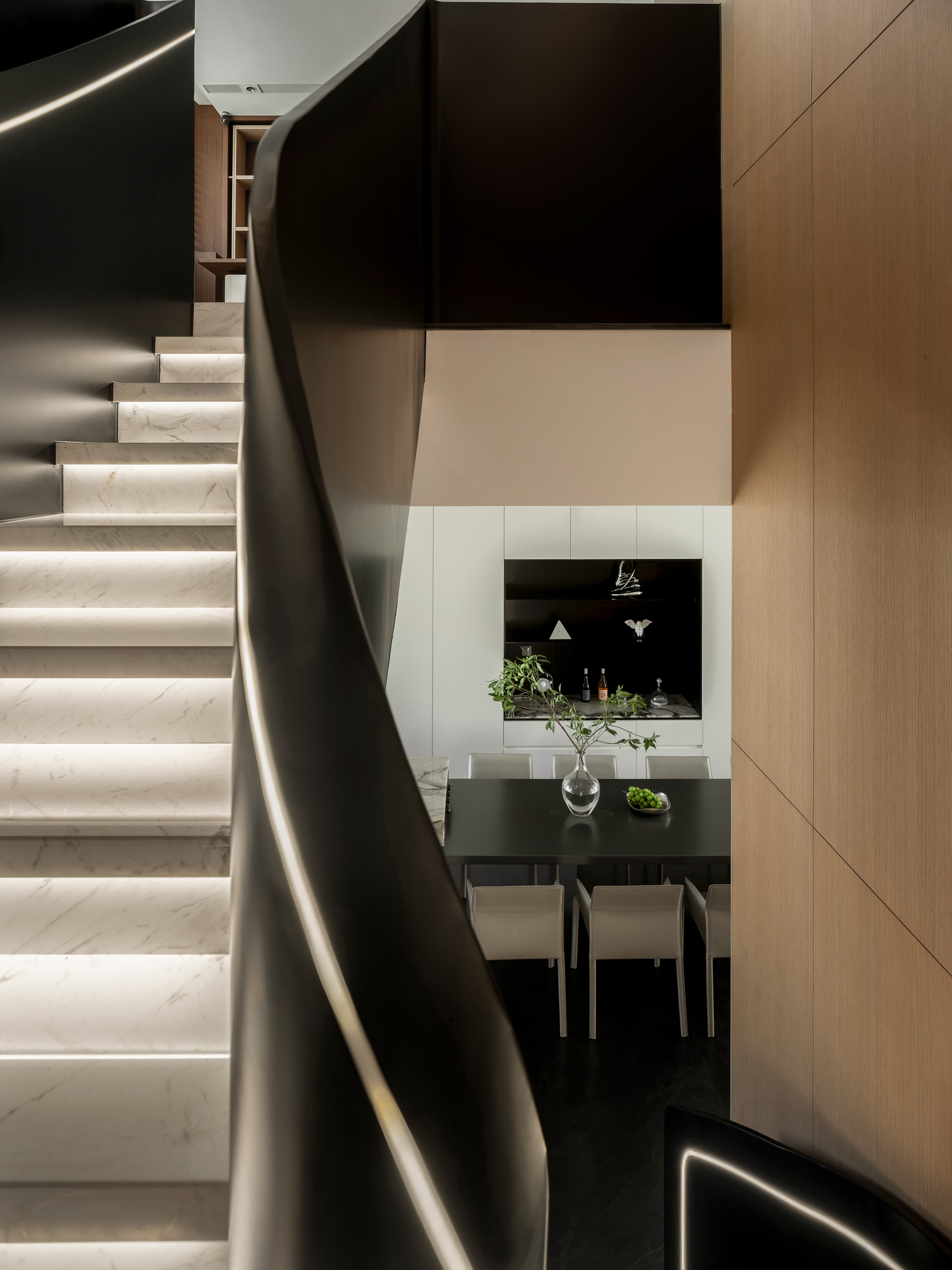 公共层以长达5米的餐岛一体桌与开放柜为核心,粉色宝格丽石材赋予空间精致质感。电梯与楼梯合并,化解了原有尴尬动线,并为每层释放约10㎡空间。钢板打造的梯在视觉上极具雕塑感,成为贯穿三层的空间焦点。长辈层强调温润与便利,主人层则更注重仪式感与私密性,卧室与衣帽间、卫浴的组合强化了生活的品质体验。 -