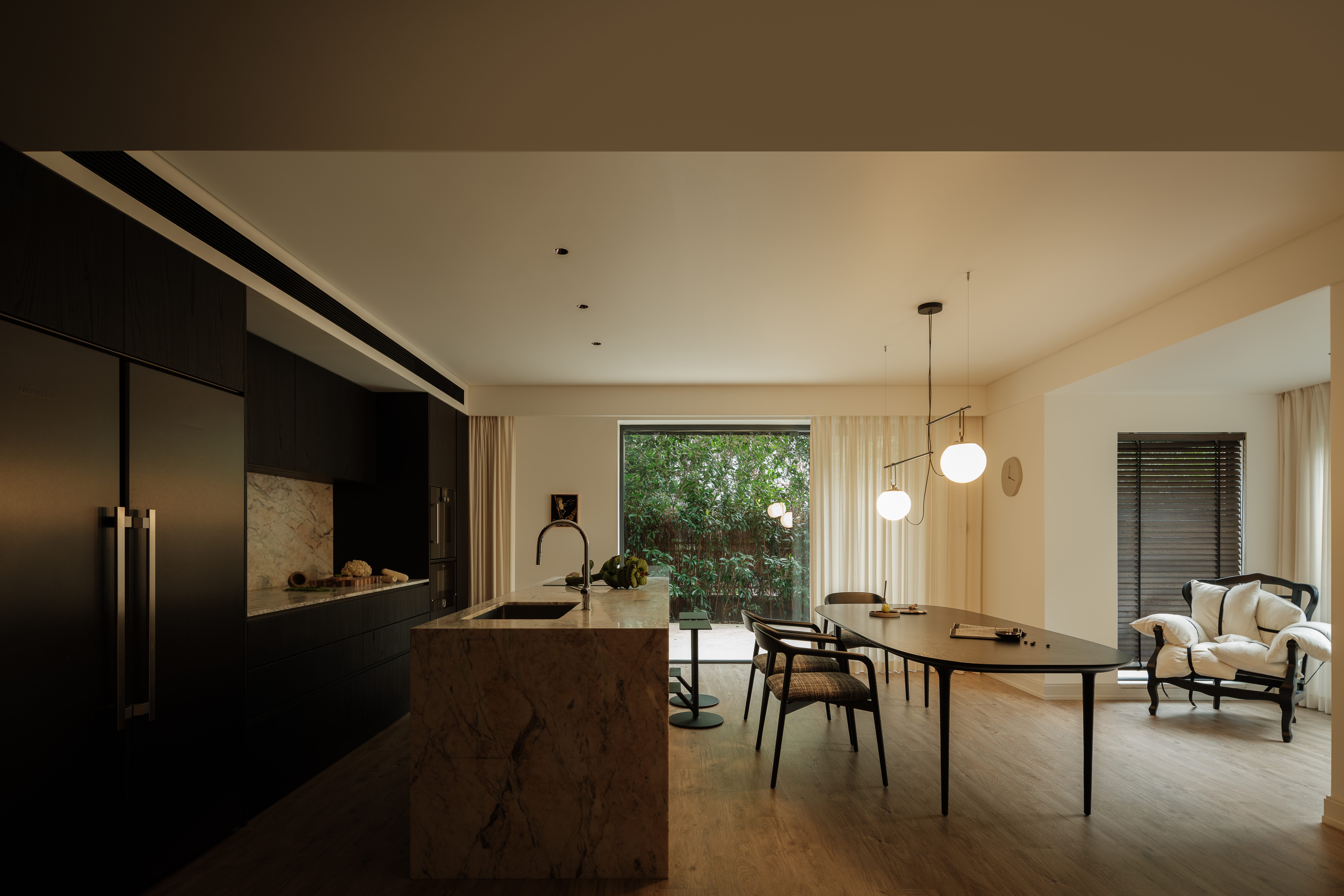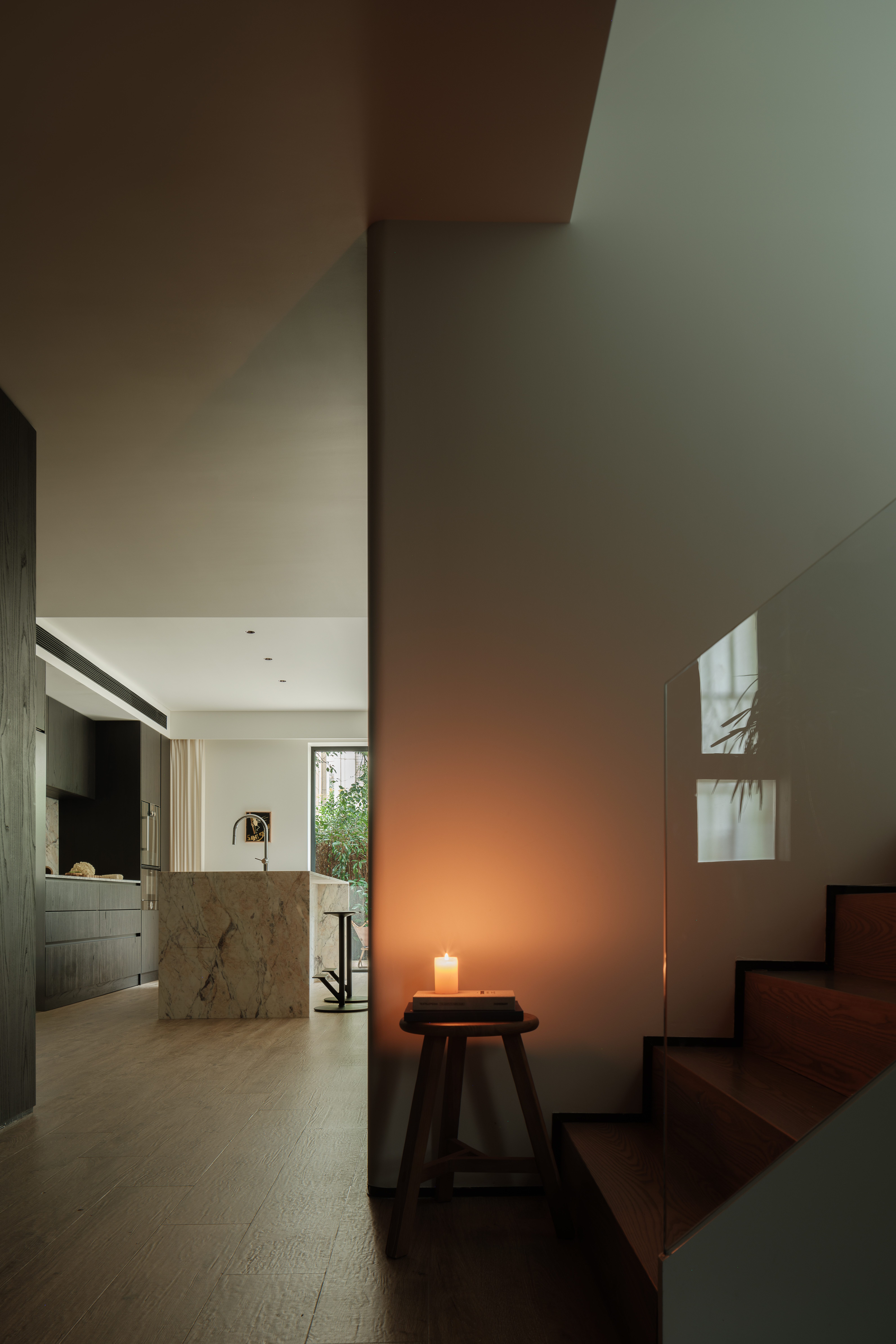 空间意境:无论是房屋状态还是业主的日常所需,一切客观现实都得以被看到并良好尊重,且理性高效地获得了解决方案或美好表达。实用主义和艺术精神在这个空间中达到了平衡,并让家成为了一个可以让人不断学习成长的良好容器.原始空间中结构并没有做大刀阔斧的改造,一楼空间是集合了中餐厨房、西餐厨房和餐厅的用餐区域,既符合家人们的使用习惯,也方便协助家务的阿姨进行日常工作。整个小区的茂密绿化是业主选择此处定居的一个重要原因,设计师将朝南的1至3层的玻璃窗都进行了改造,大开面的玻璃不仅让户外的植物风貌成为了空间内的景观,更解决了南北进深过大带来的采光不足问题。