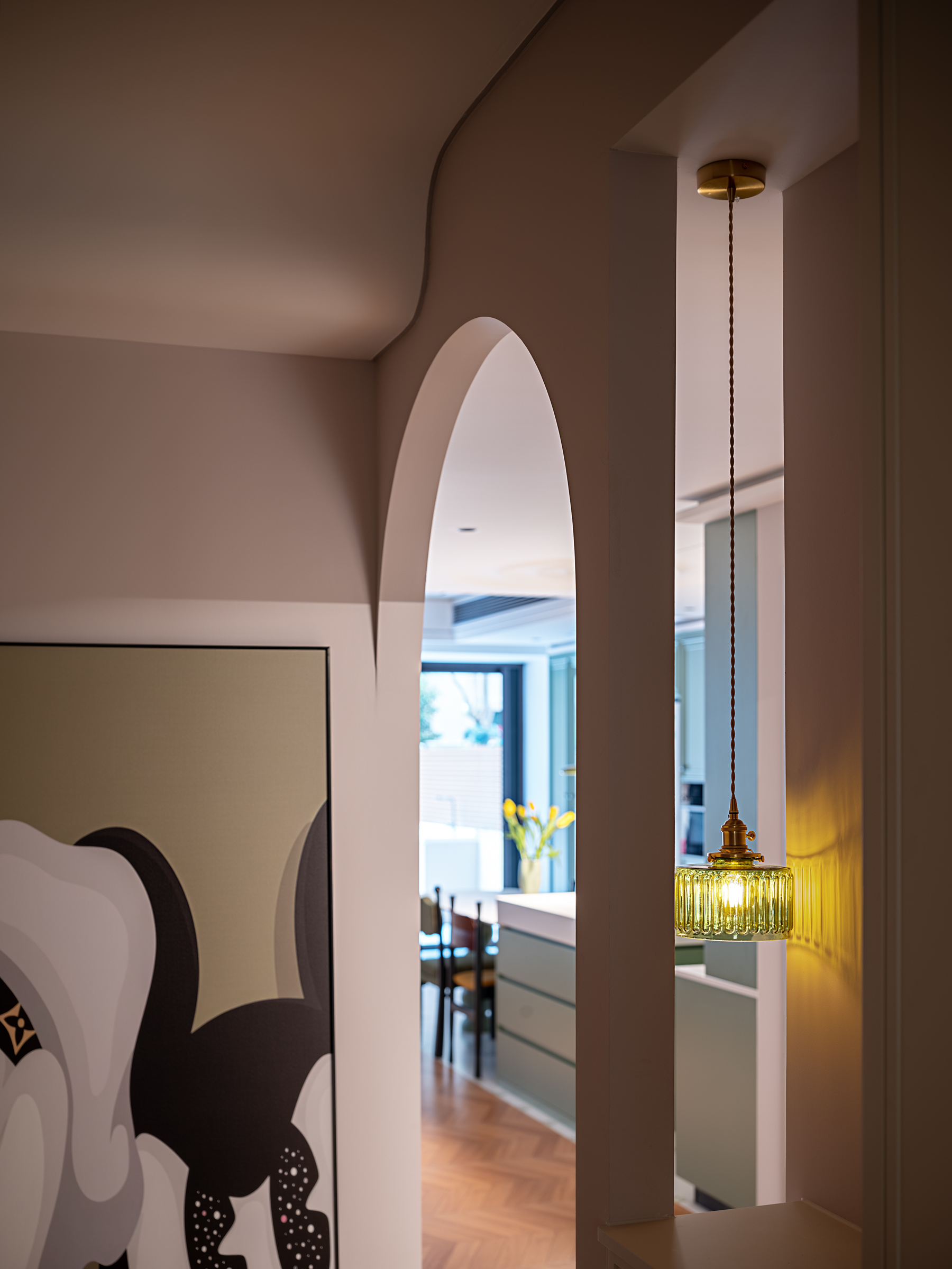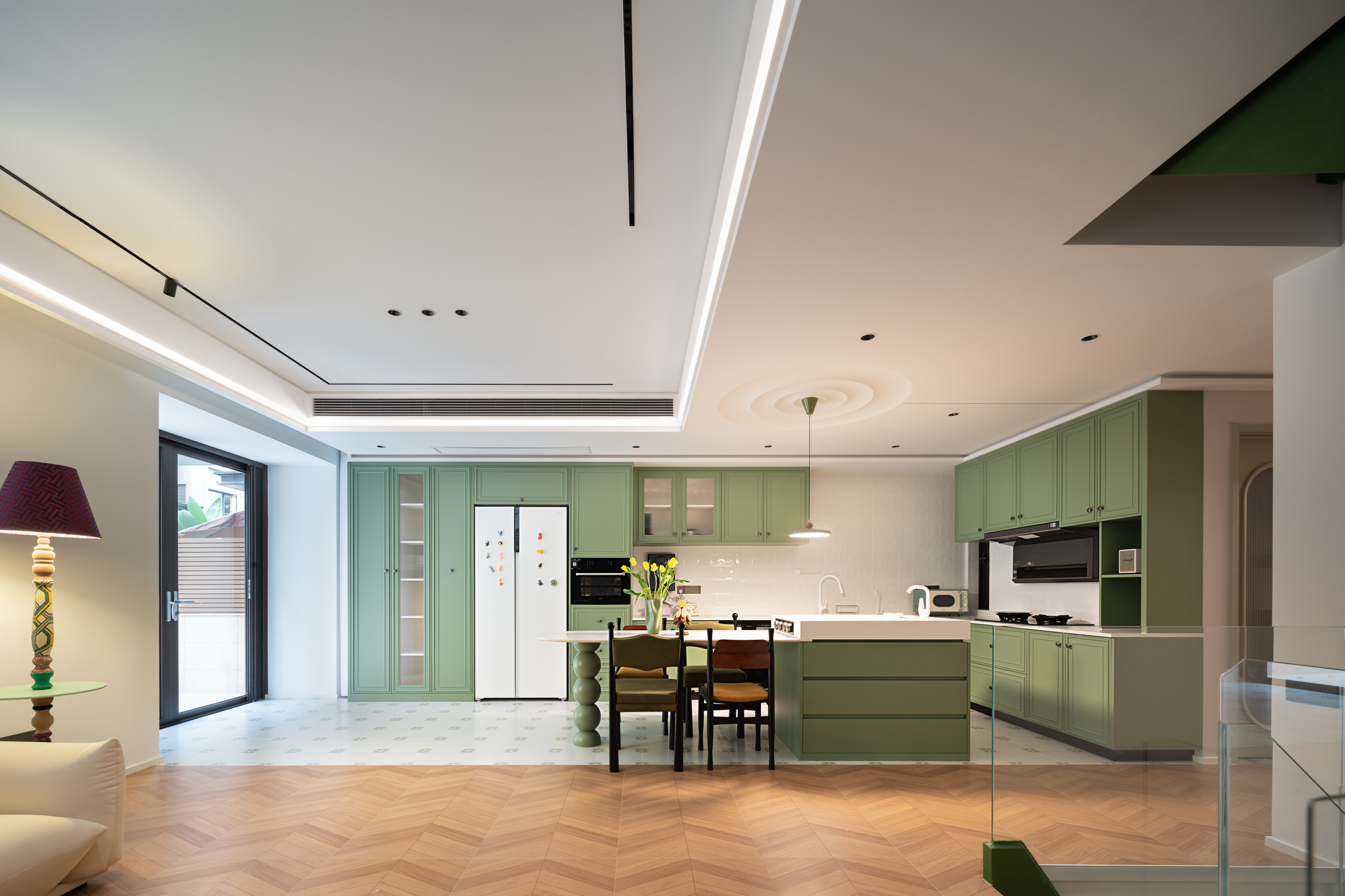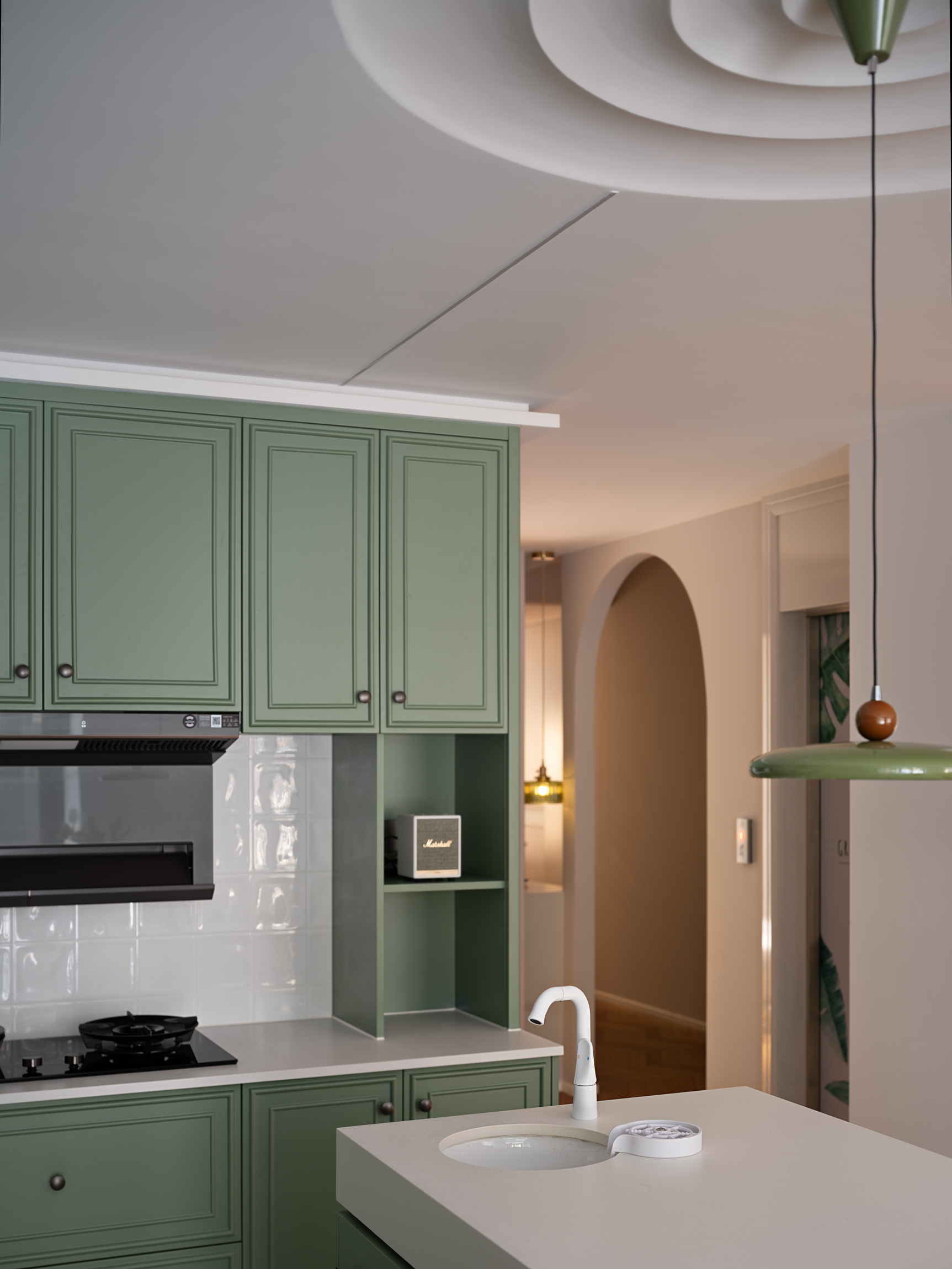 空间布局:本案厨房是开放式的布局,空间路线互相流通,从视觉上扩大了空间的延伸感。