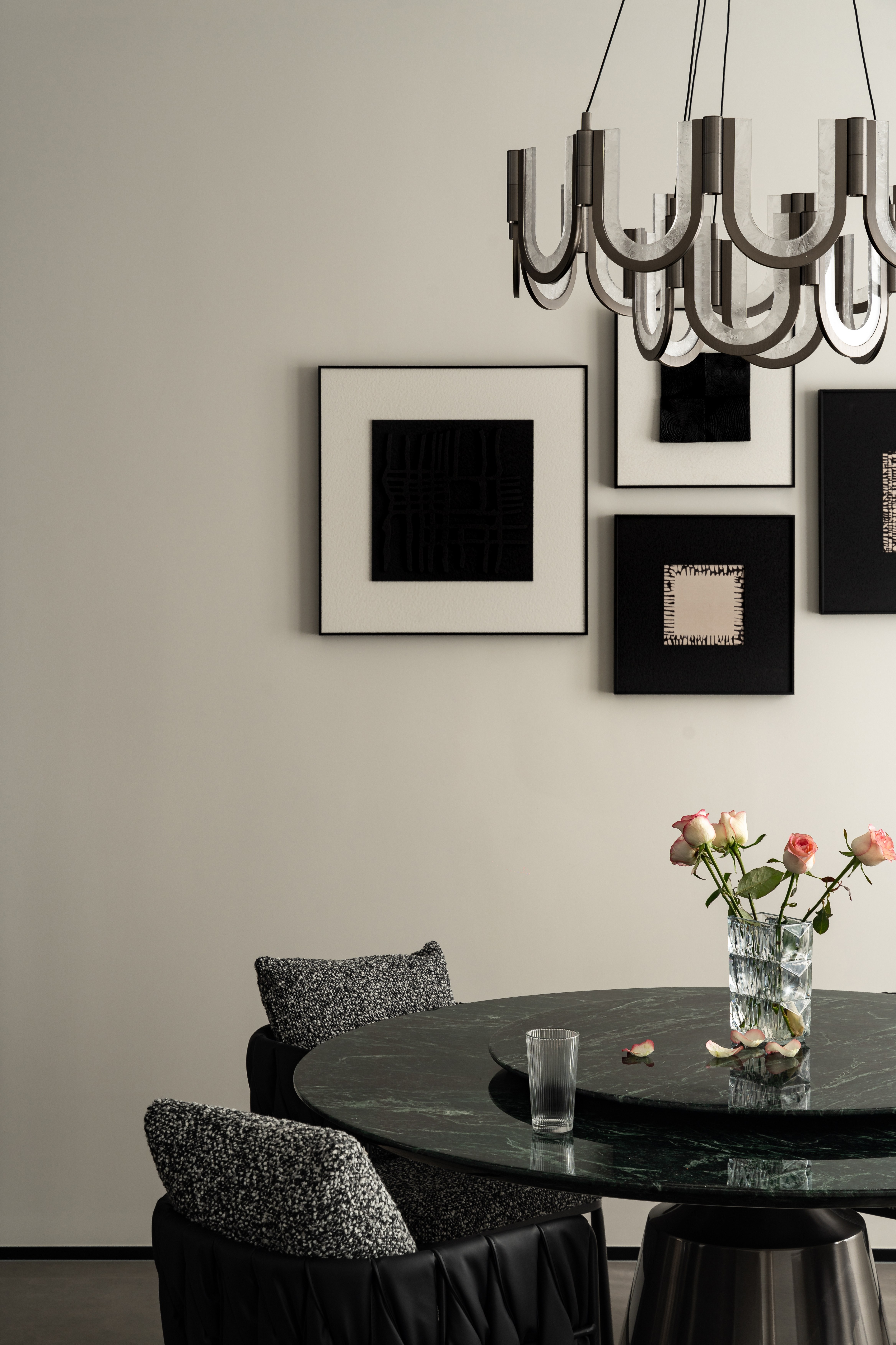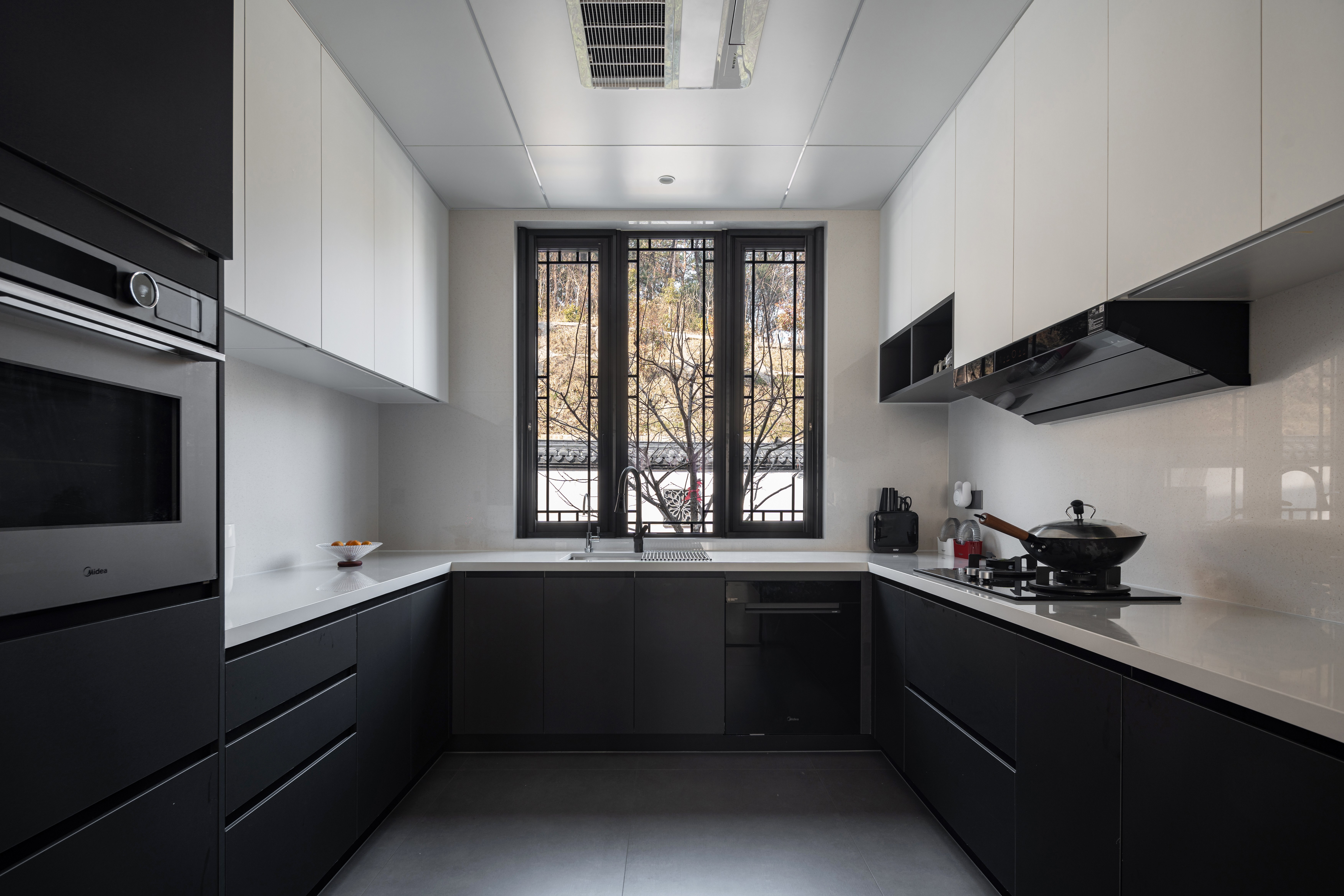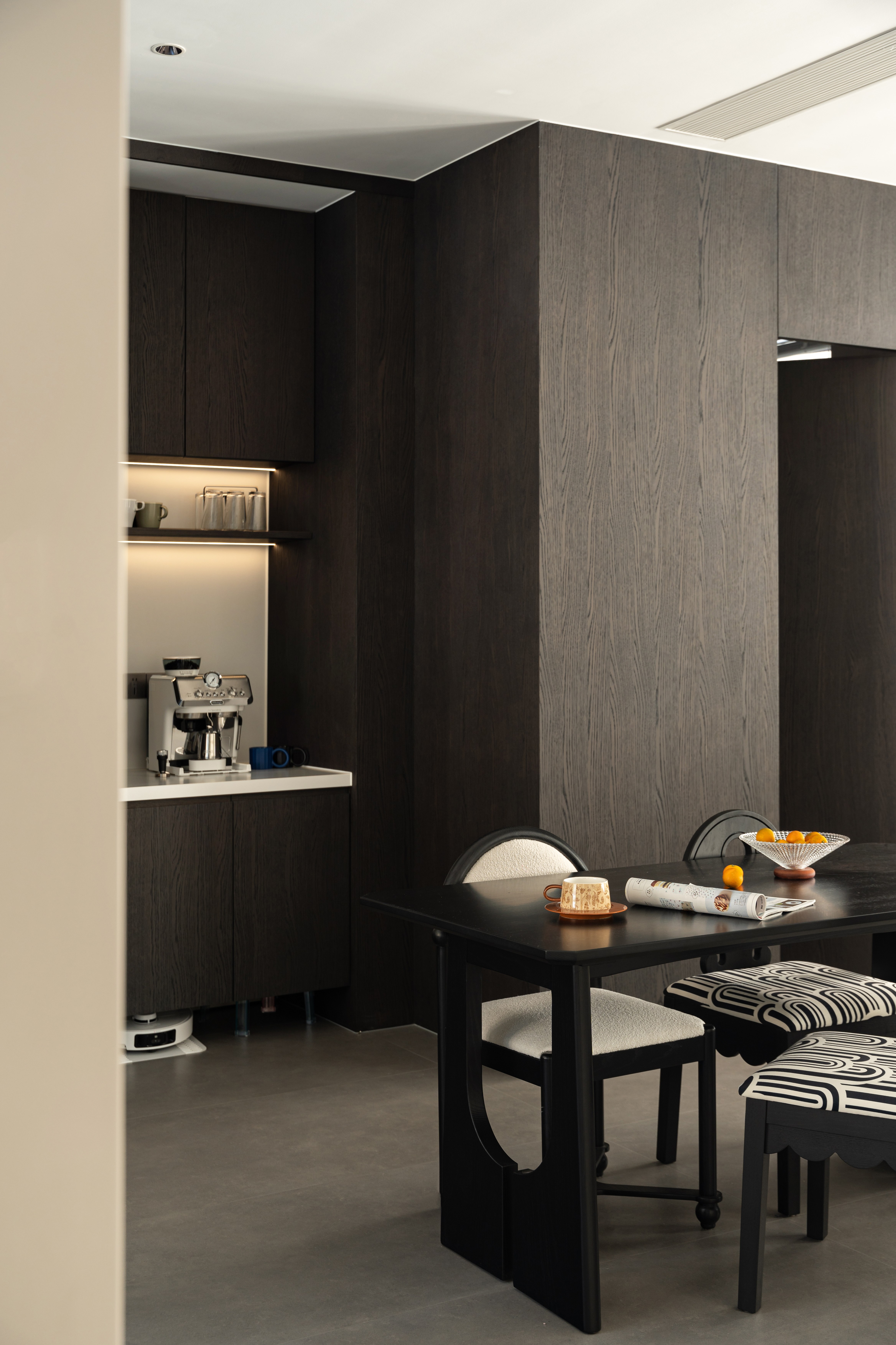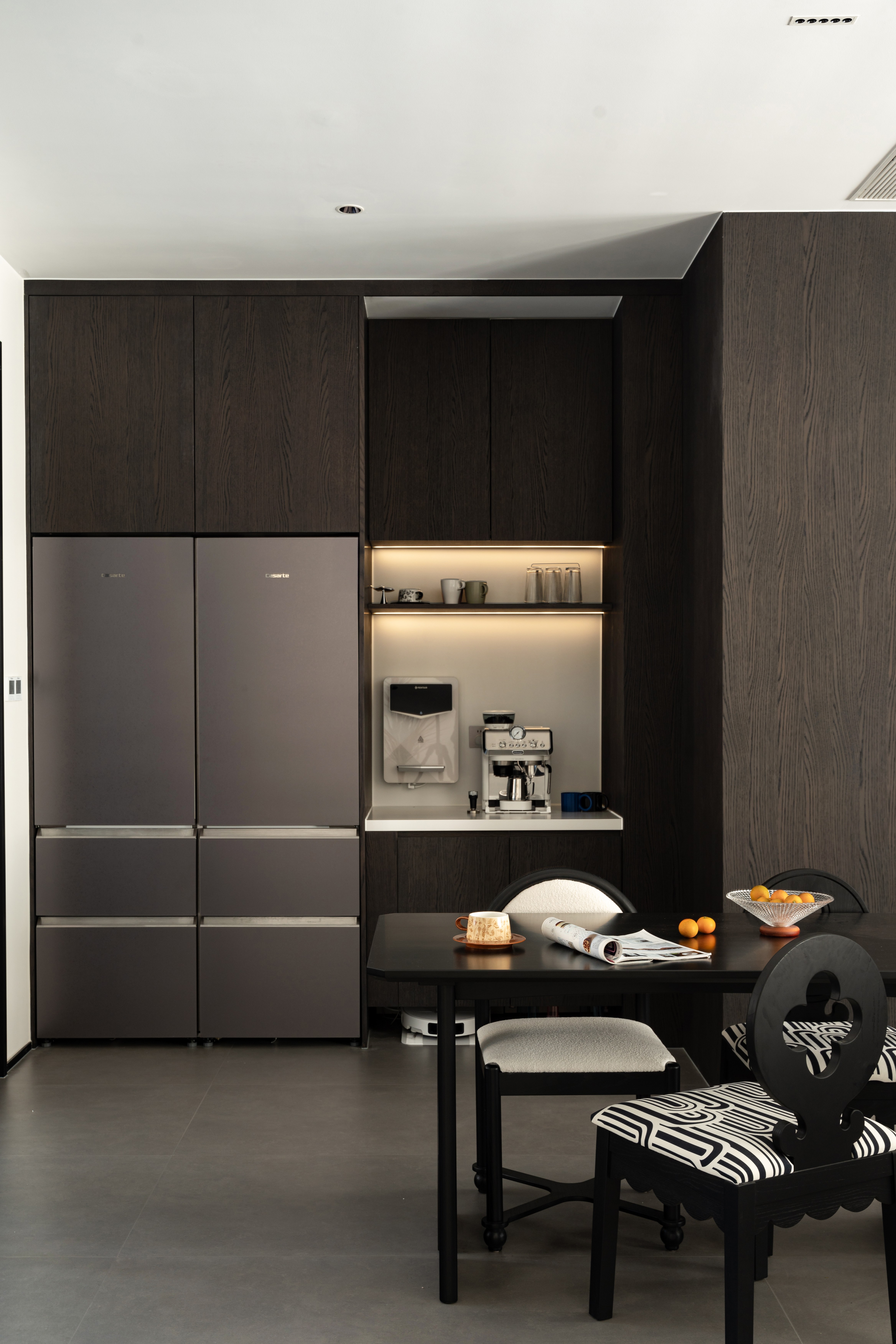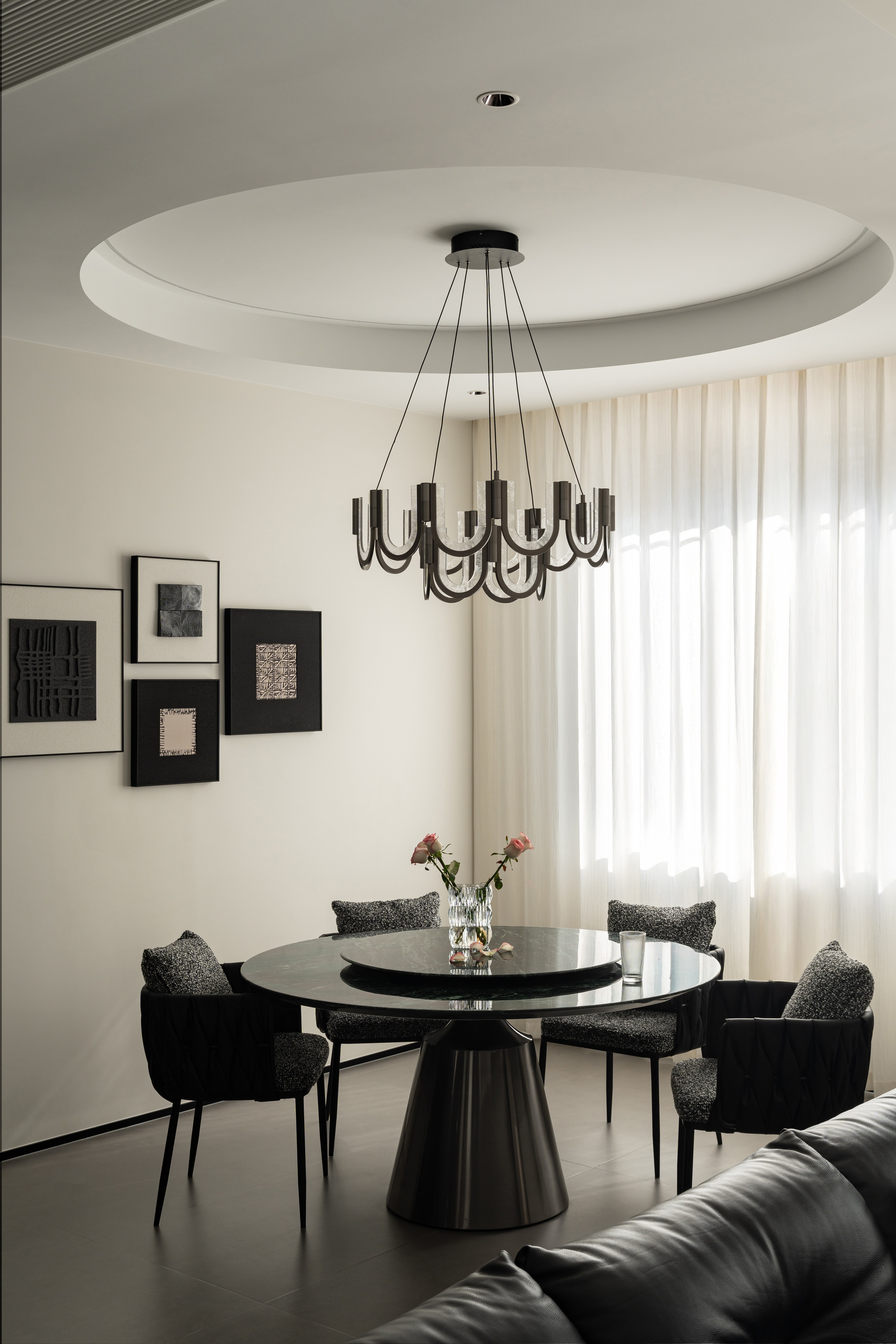 步入餐厅,吊灯似艺术的符码, 勾勒出空间里独特的风雅 。 玫瑰在桌面,诉说着温柔情话, 与简约格调,融合得无瑕 。 厨房中,黑白碰撞出秩序之画, 窗外的树影,摇曳着光影魔法 。 在这里,烟火与美学,一同升华。