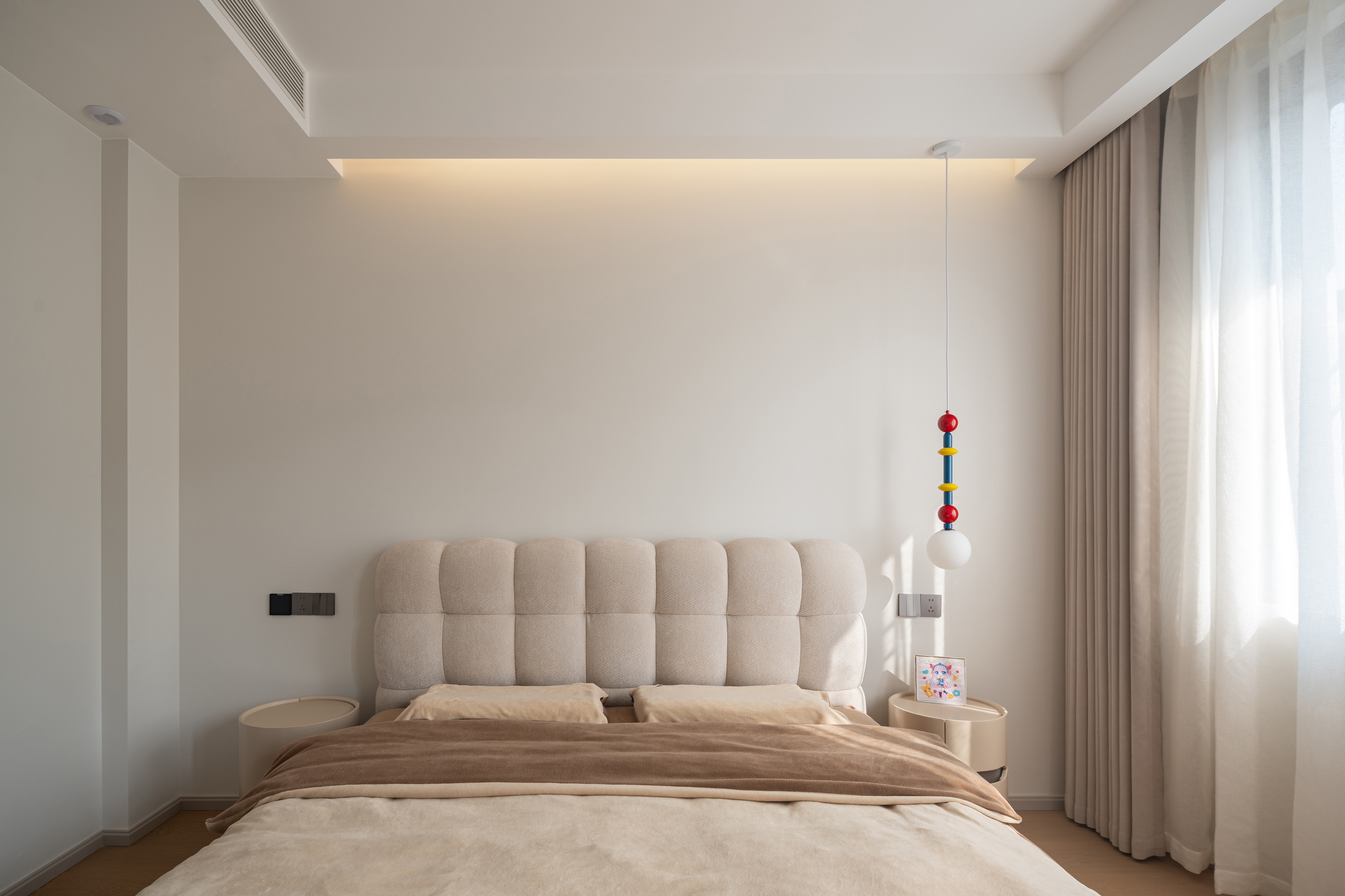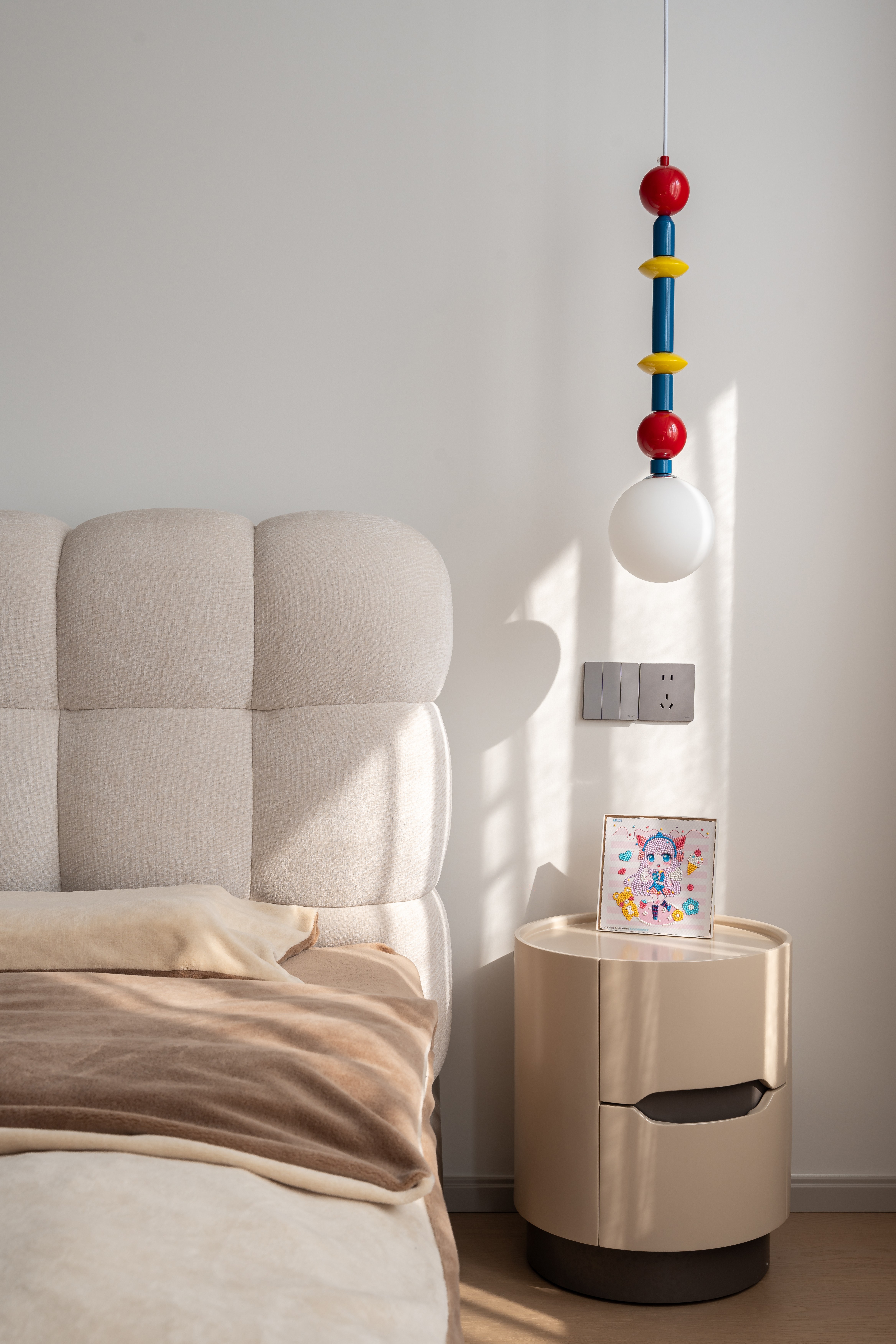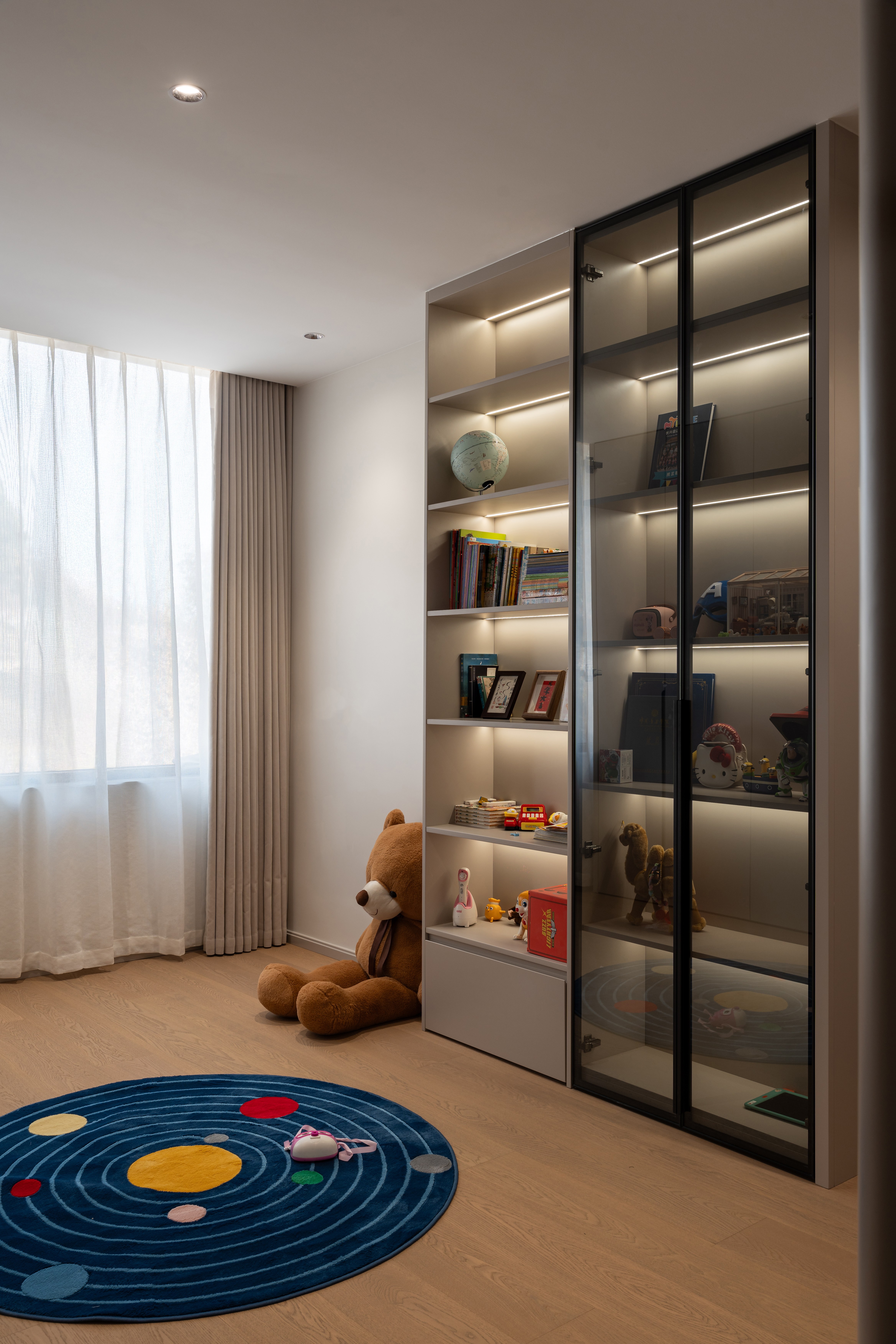 儿童房,玩具是梦幻的羽翼, 承载着那些纯真无邪的童趣。 彩色地毯上,想象肆意地飞驰, 和现实的束缚,快乐地分离 。 吊灯如彩色魔方,点亮梦幻天地。 在这里,童年绽放光彩,无虑嬉戏 。