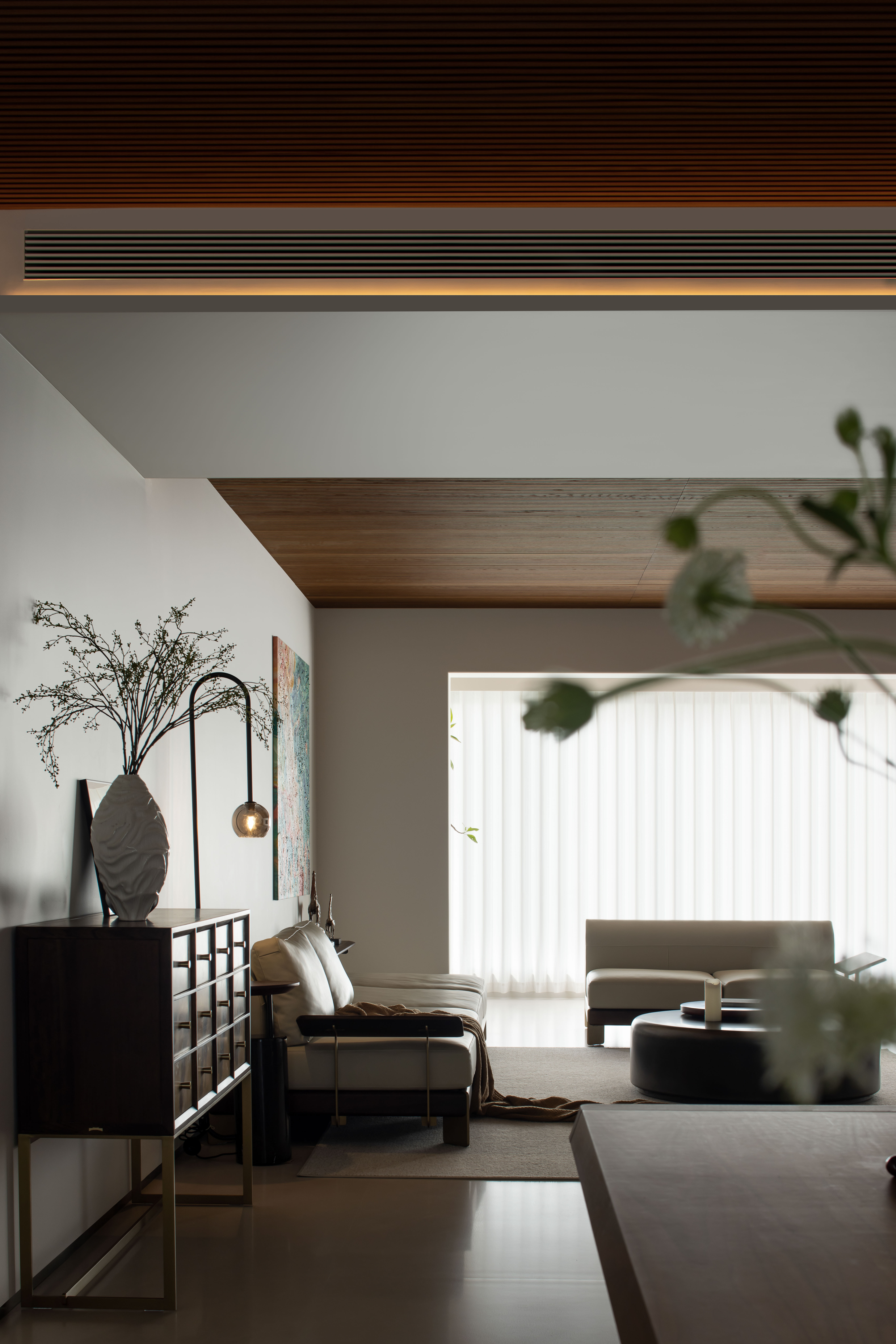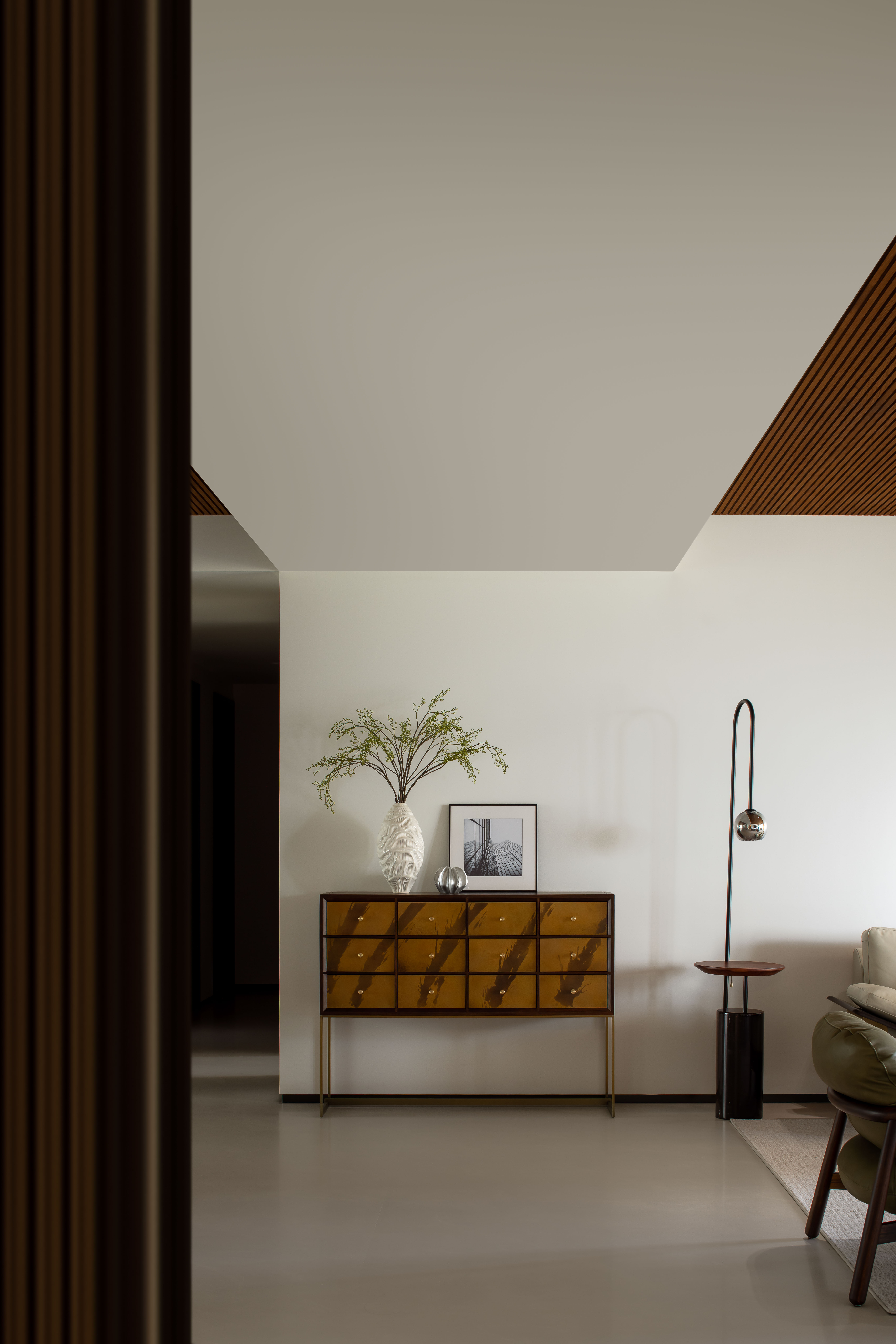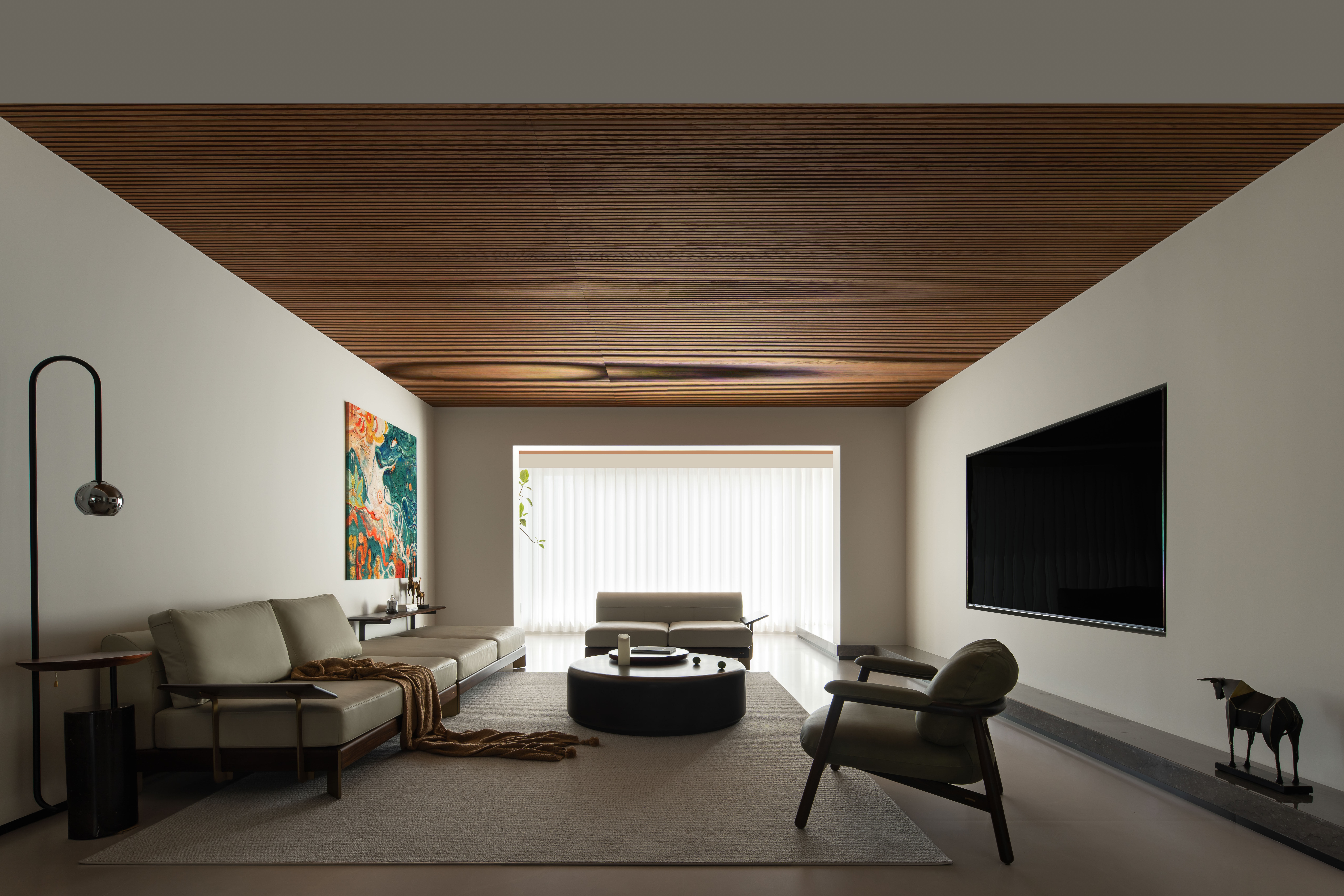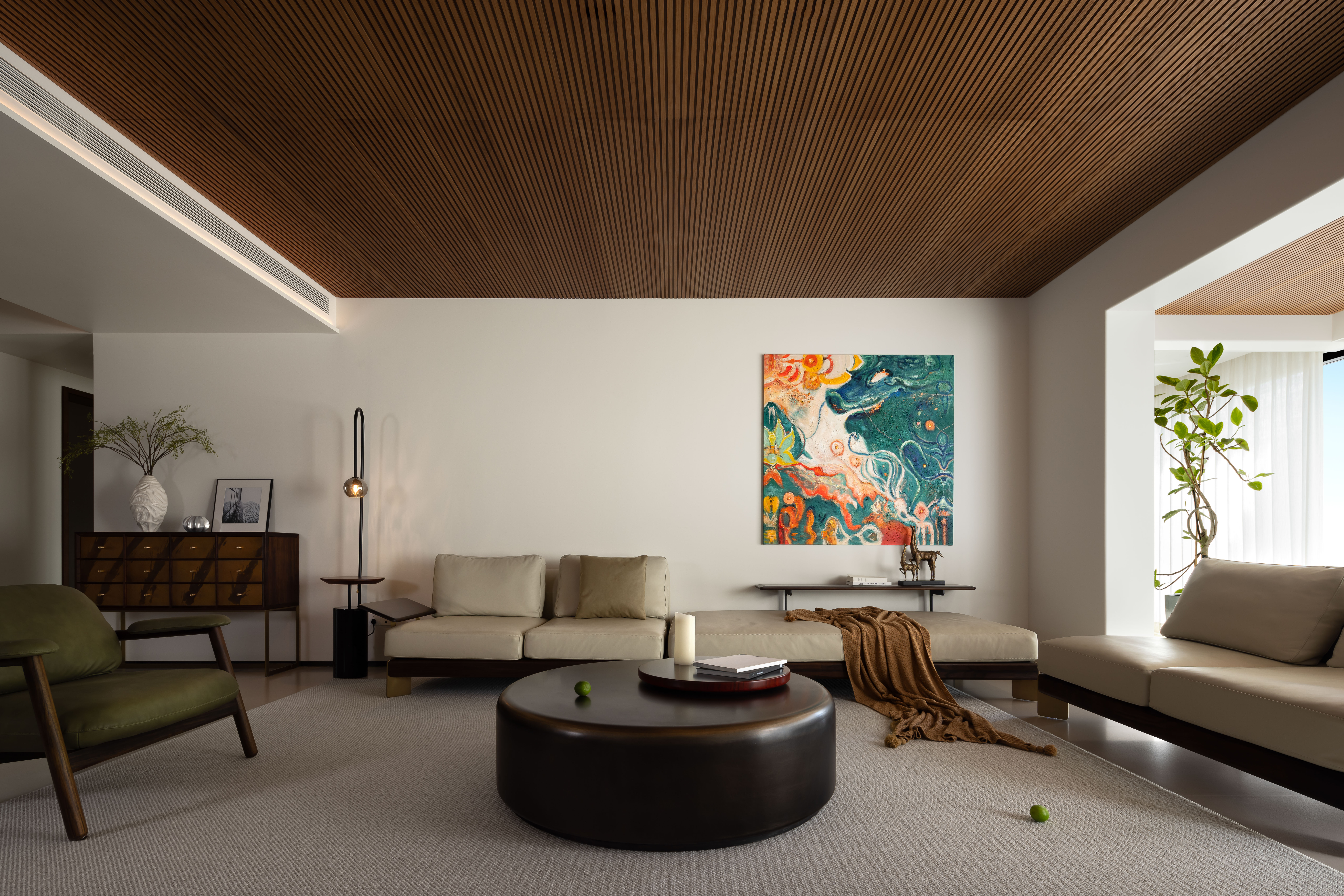 空间意境:灰调的宁静、苔绿的生机,与原木的暖意交织成和谐的视觉韵律。家具的线条,以柔和的弧度贴合人体,让功能与美学在无声中共生。