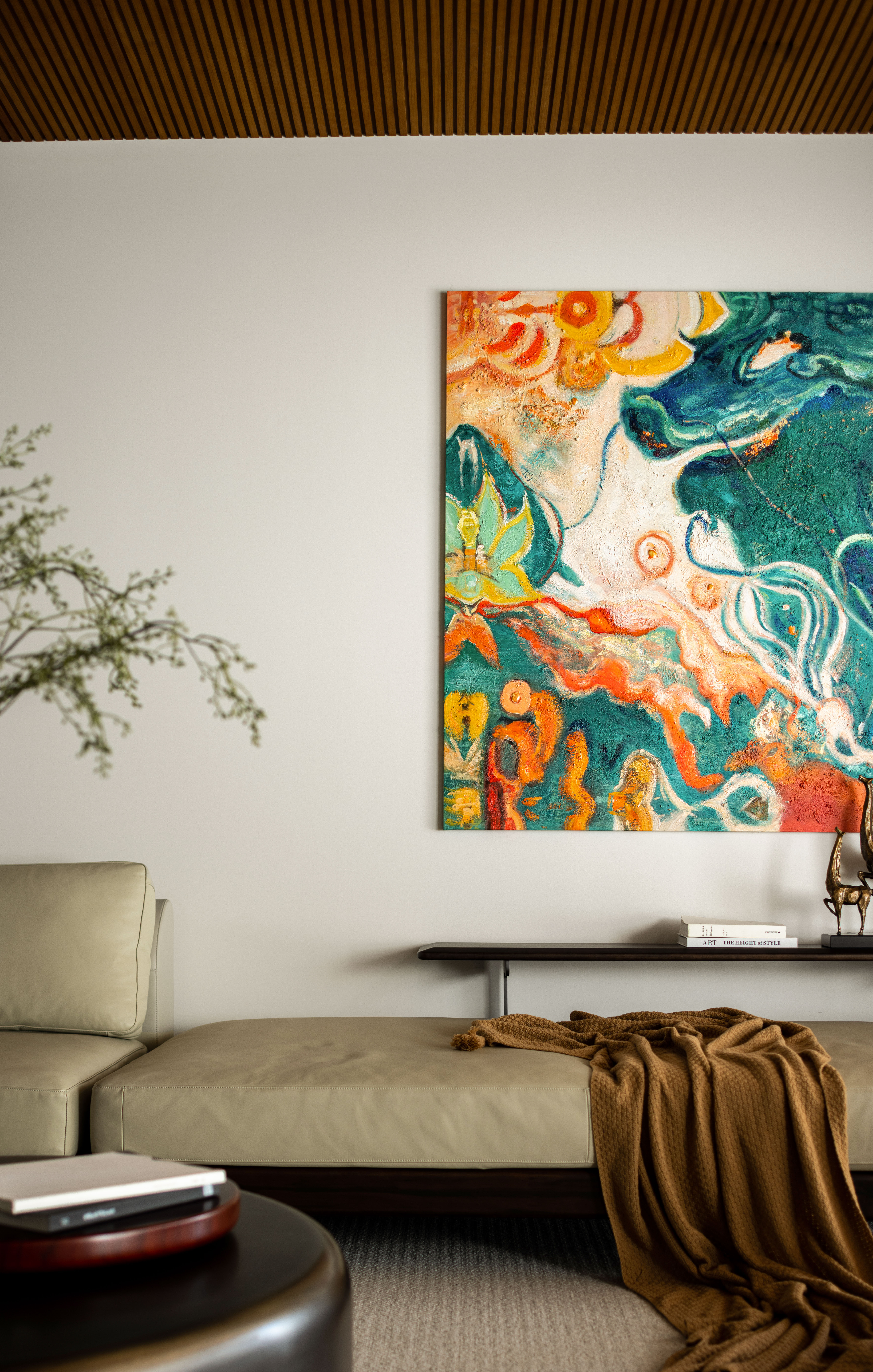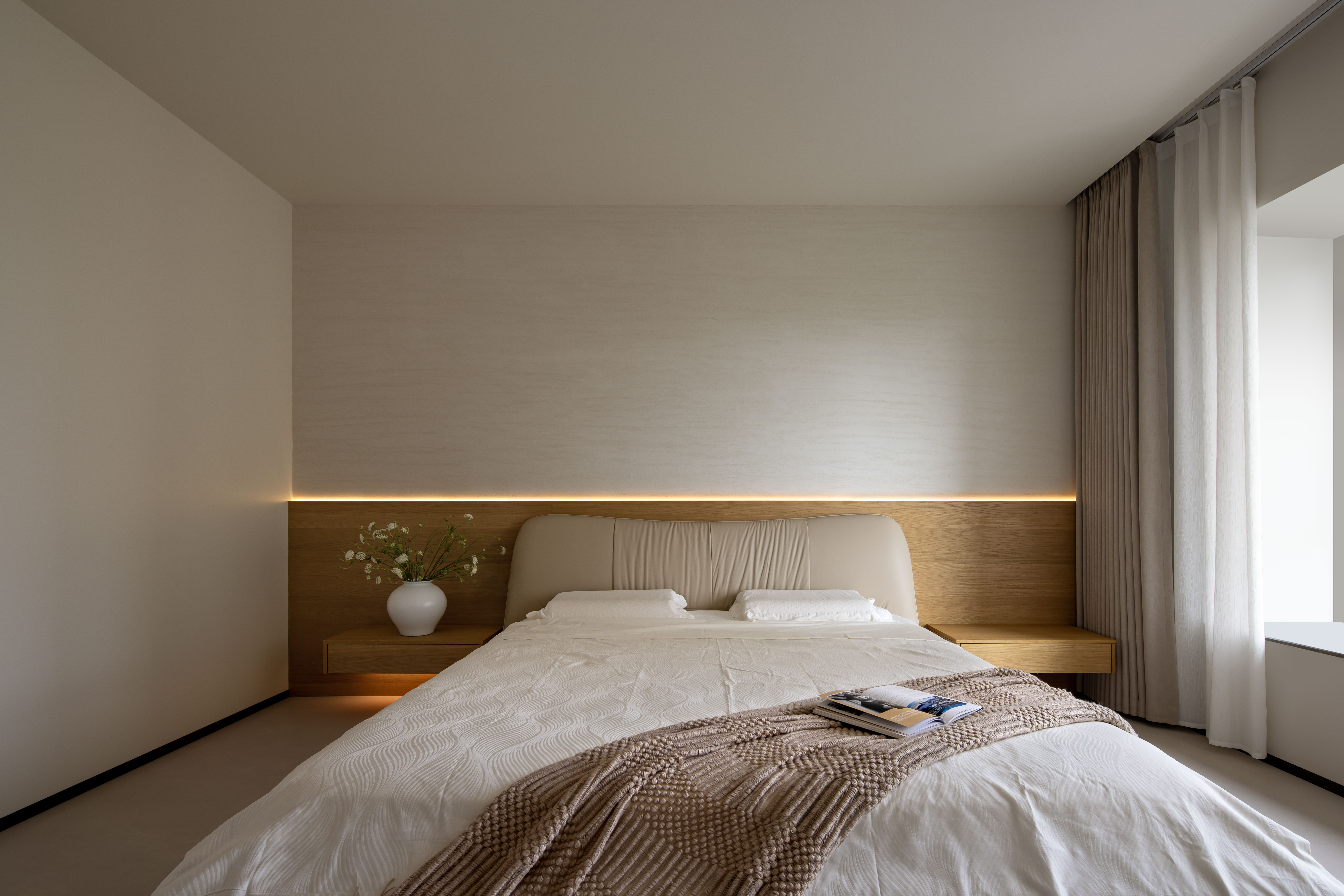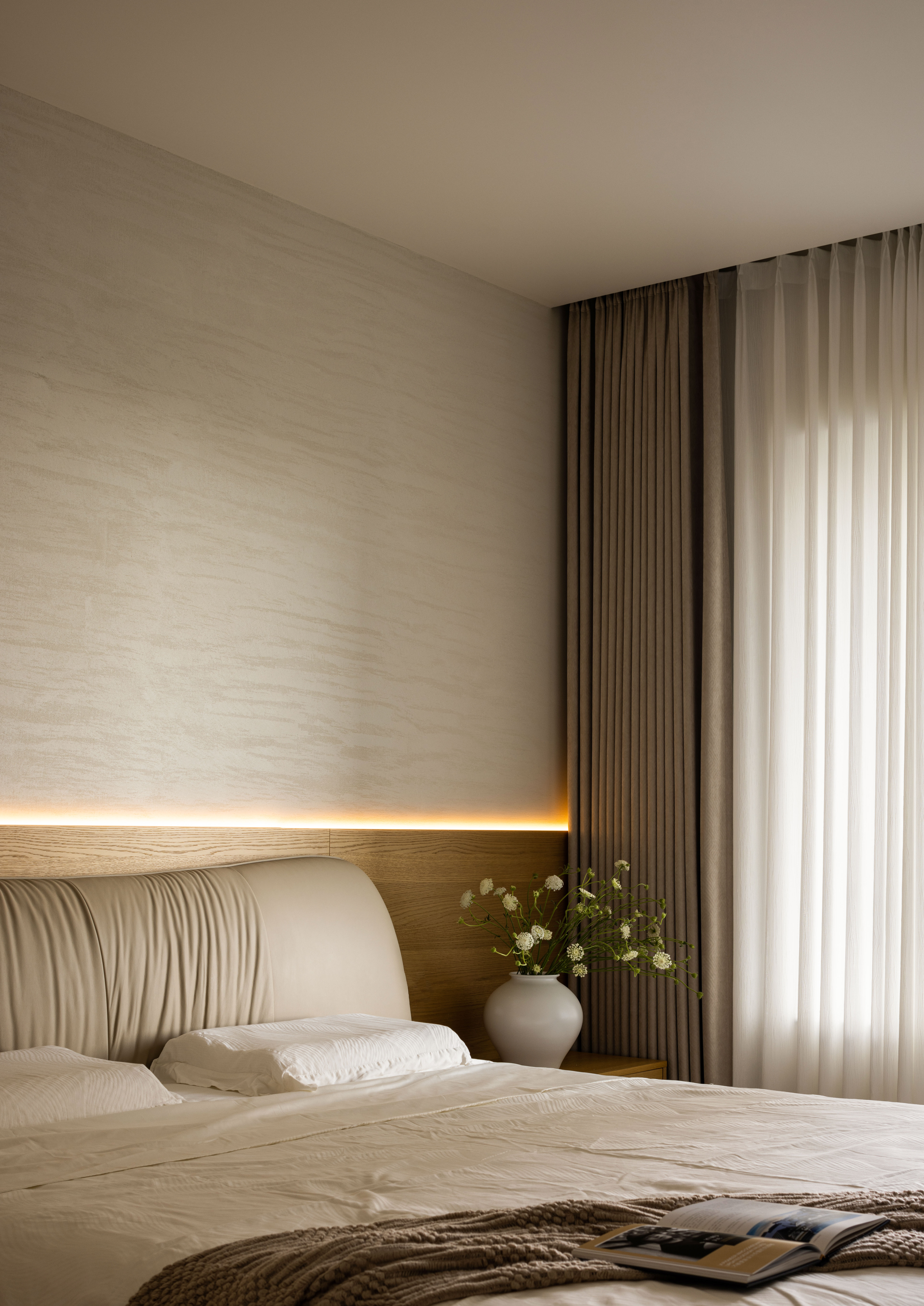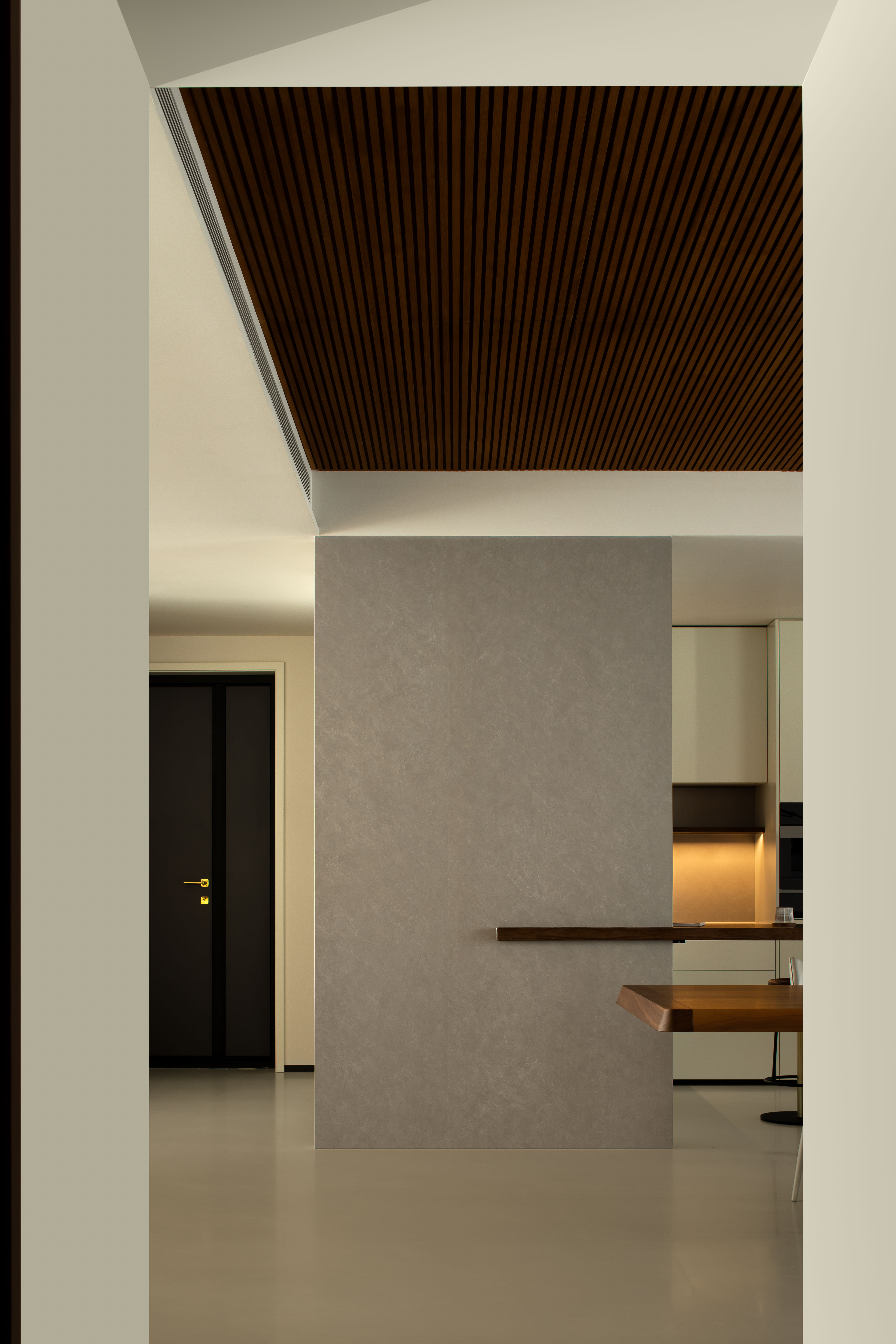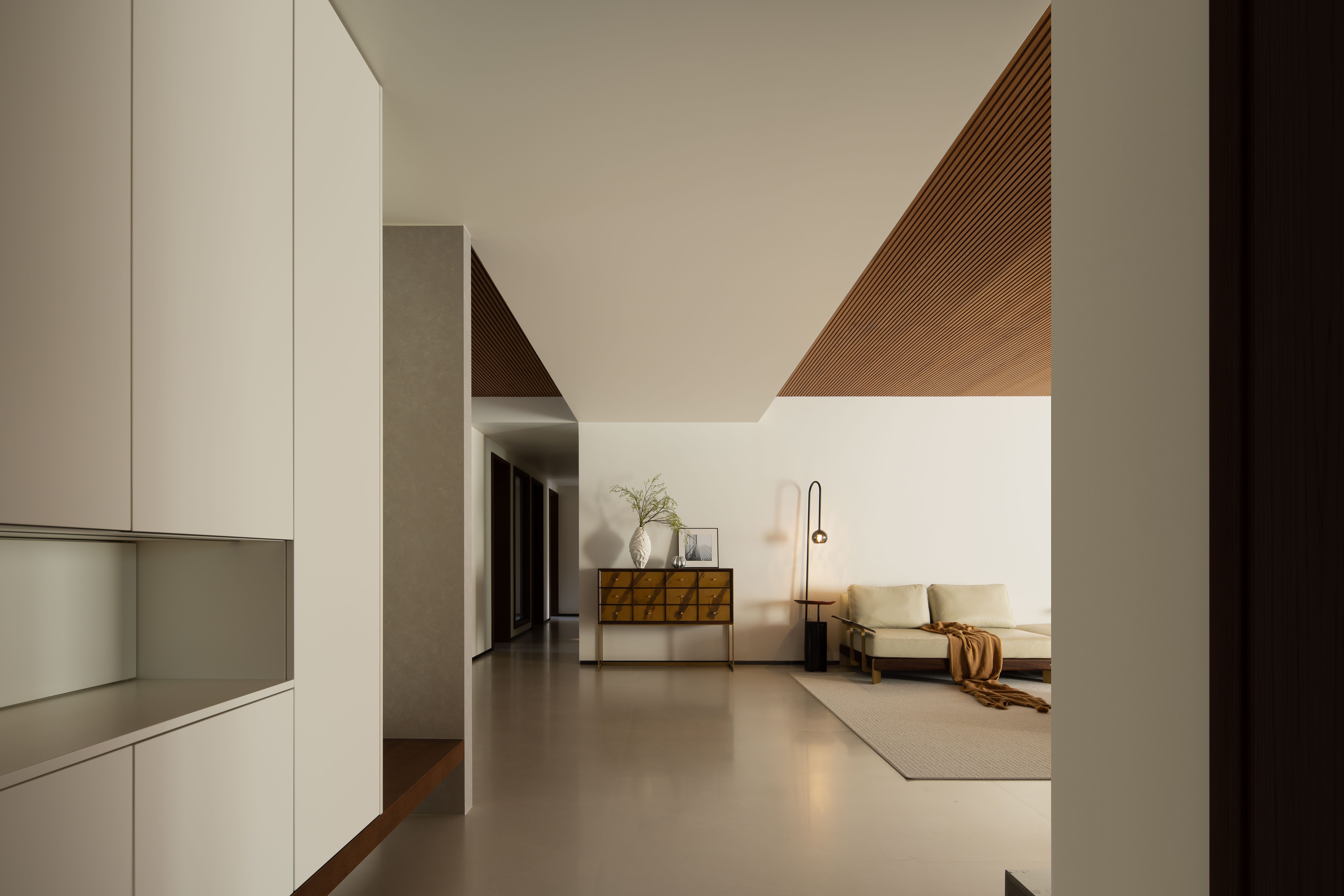 空间意境:灰调的宁静、苔绿的生机,与原木的暖意交织成和谐的视觉韵律。家具的线条,以柔和的弧度贴合人体,让功能与美学在无声中共生。