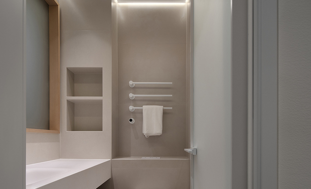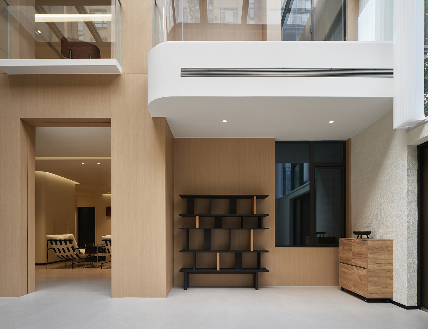 玄关收纳柜与墙板同材质形成玄关空间的围合感。