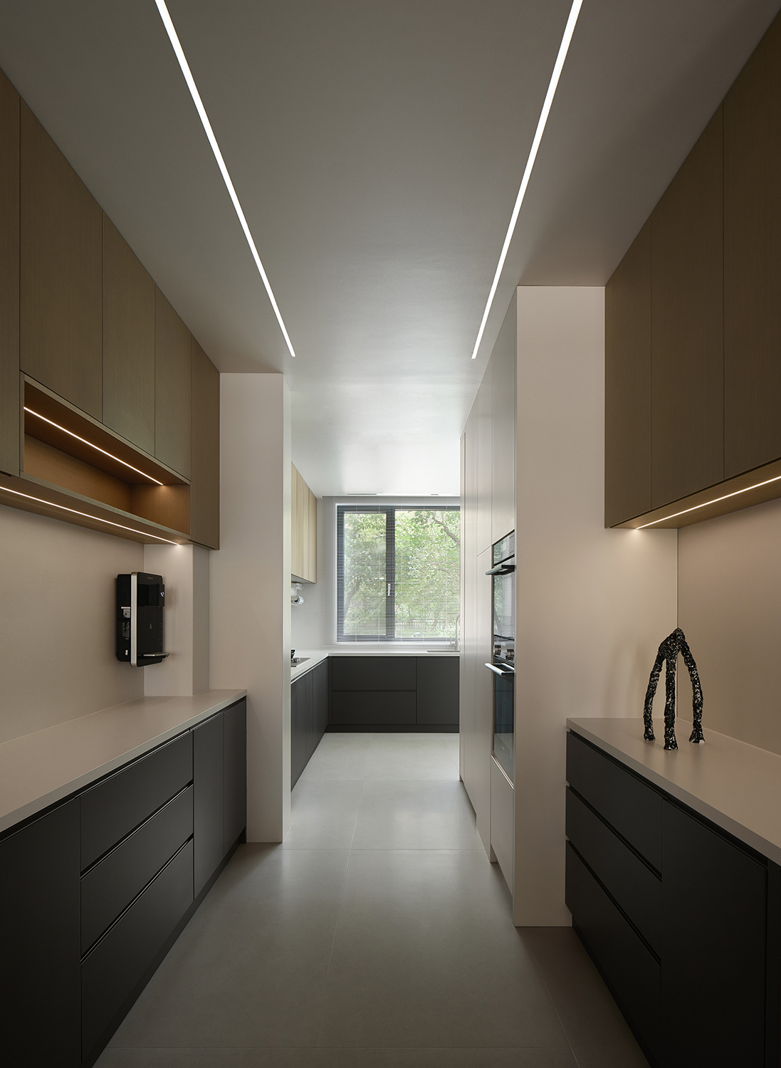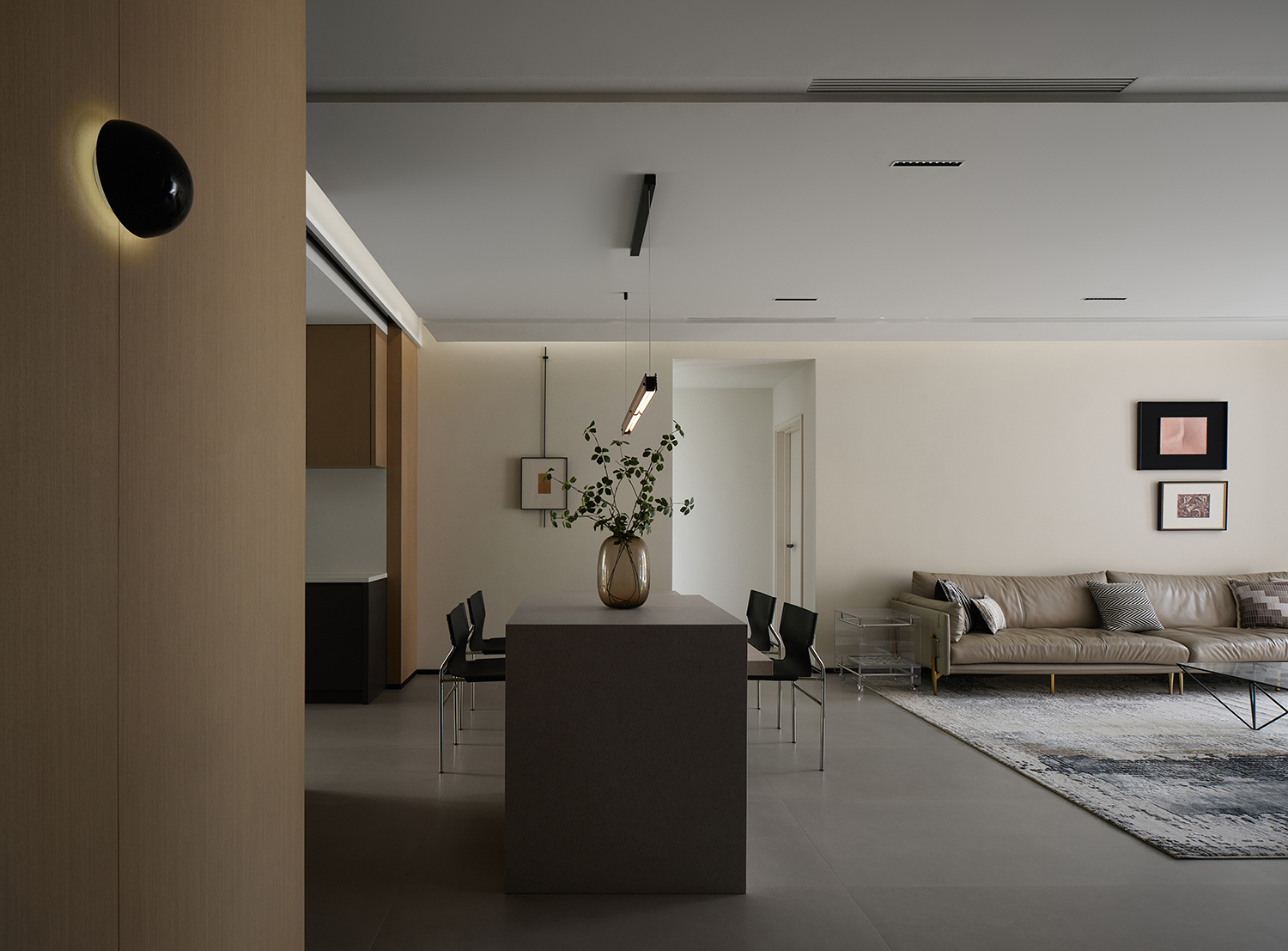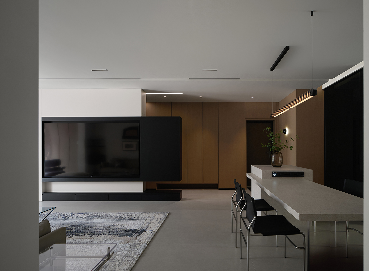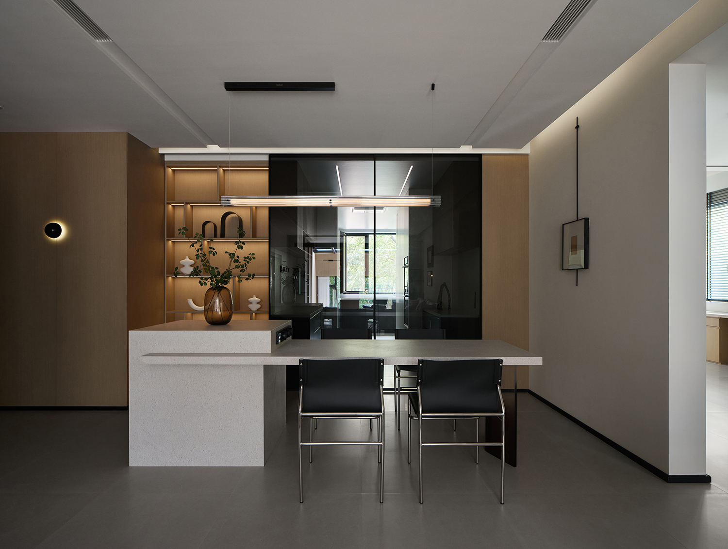 餐厅与厨房做开合式设计,通过玻璃移门变化空间尺度。关闭玻璃移门为餐厅背景,打开玻璃移门为开放式厨房的西厨空间,玻璃移门形成开放格的柜门部分。