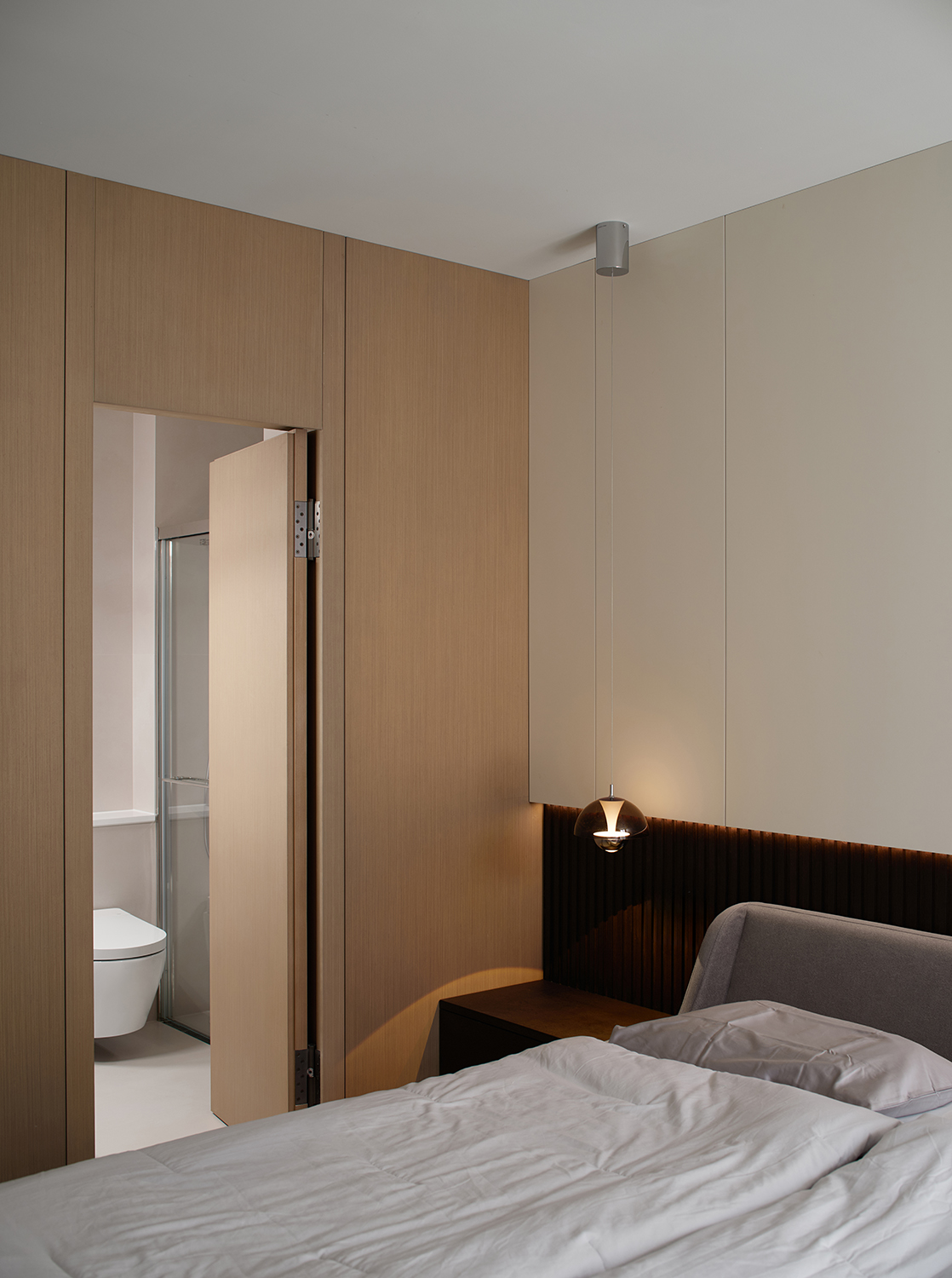 在私密空间的打造上,设计师更加注重生活仪式感的引入,以及营造舒适的居住体验。床头背景墙采用定制的硬包和木饰面,打造沉稳、质朴的格调。