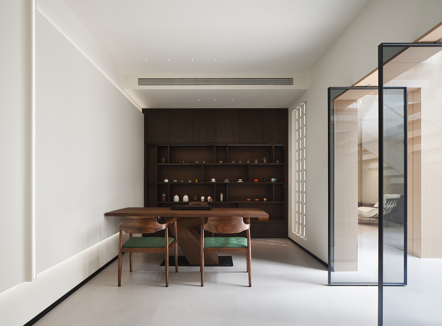 茶室娱乐空间,会客时转动中轴旋转门增加隐私性。在繁忙的生活中,沏一壶好茶,品味宁静与惬意。
