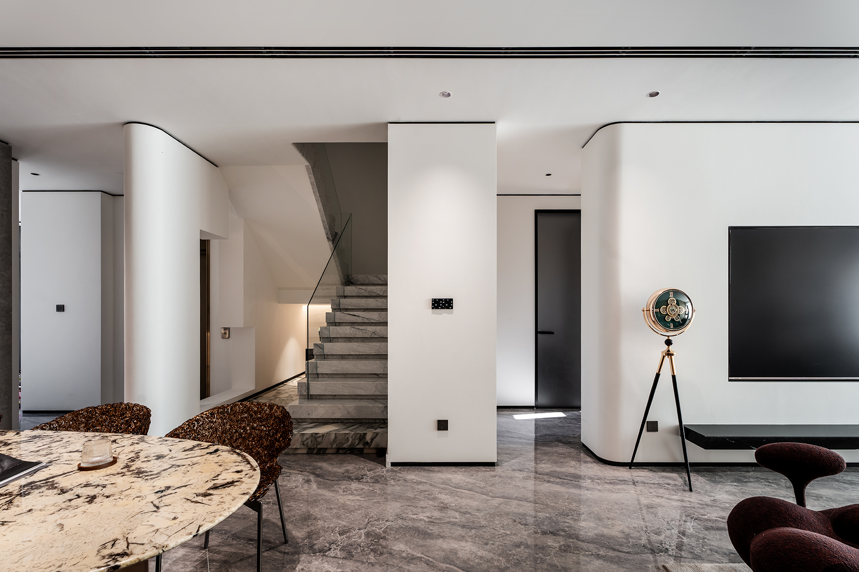 空间布局:“把结构、功能、动线融为一体”,既展现了大空间的通透感,又通过细节处理避免了全开放布局的 “功能混乱”,是 “形态柔化 + 功能实用” 的平衡设计。