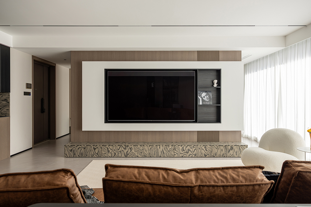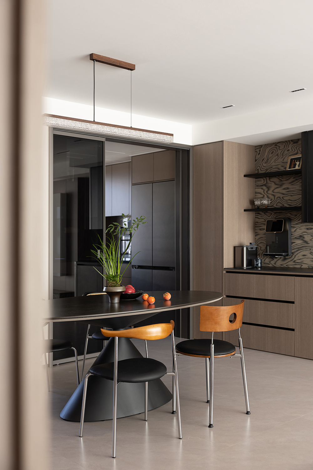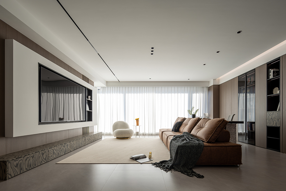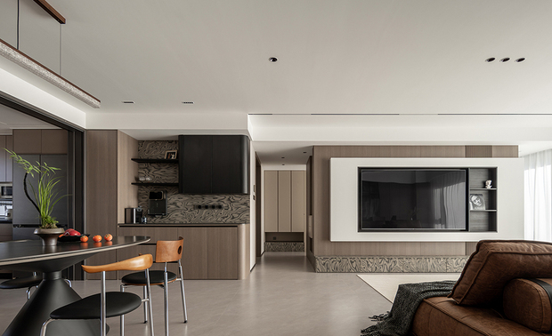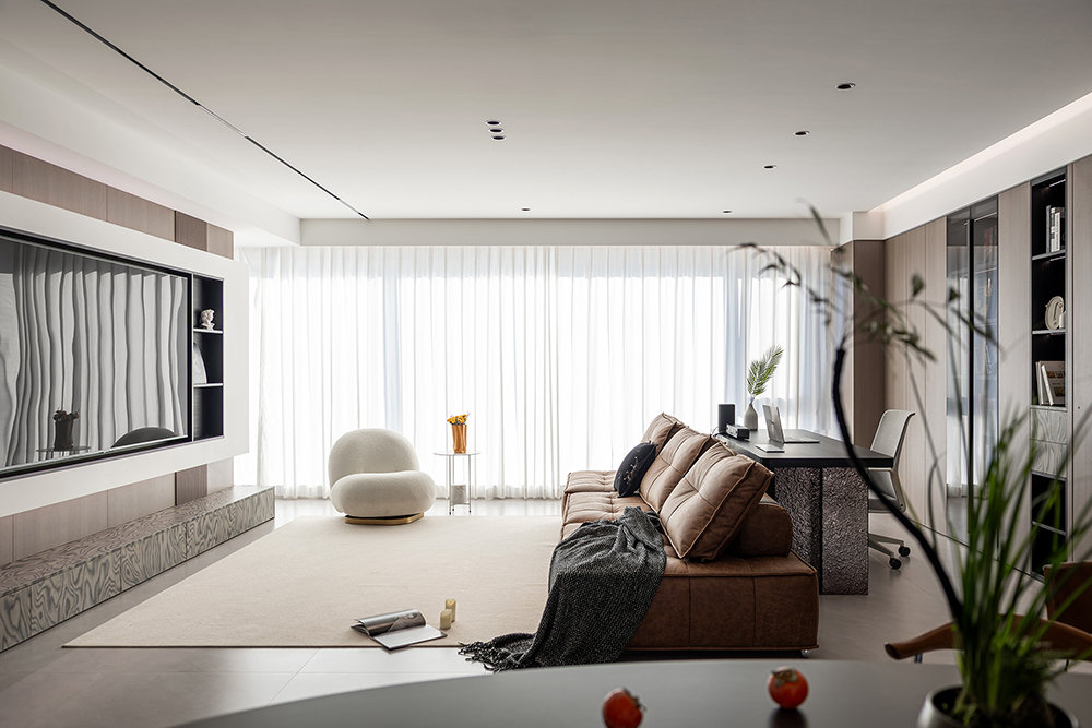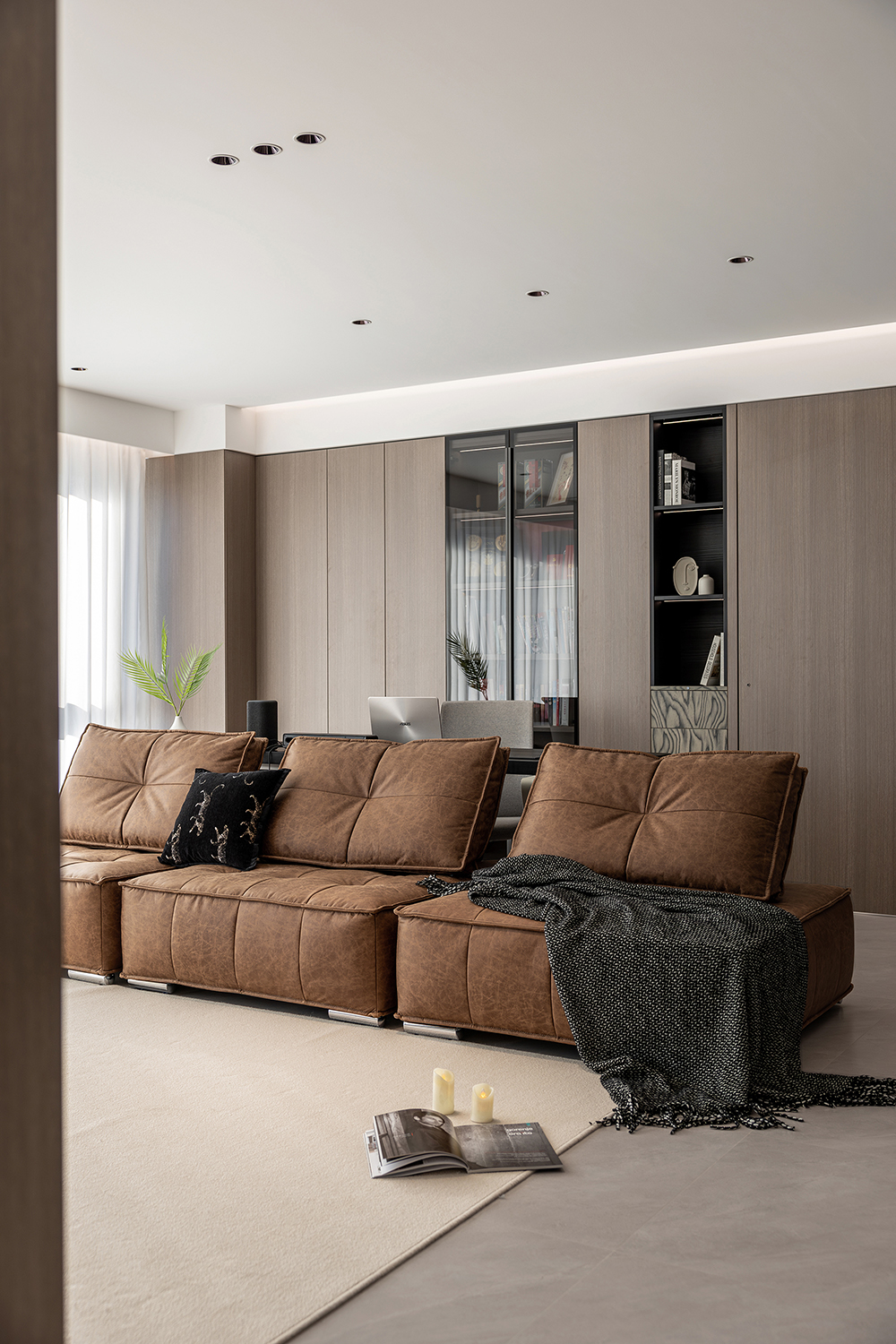 设计选材:整体空间相融是旋律的交织,木的温润、皮的醇厚、石的肌理是音色的层次,直线条的利落与弧形的柔婉是节奏的对仗。