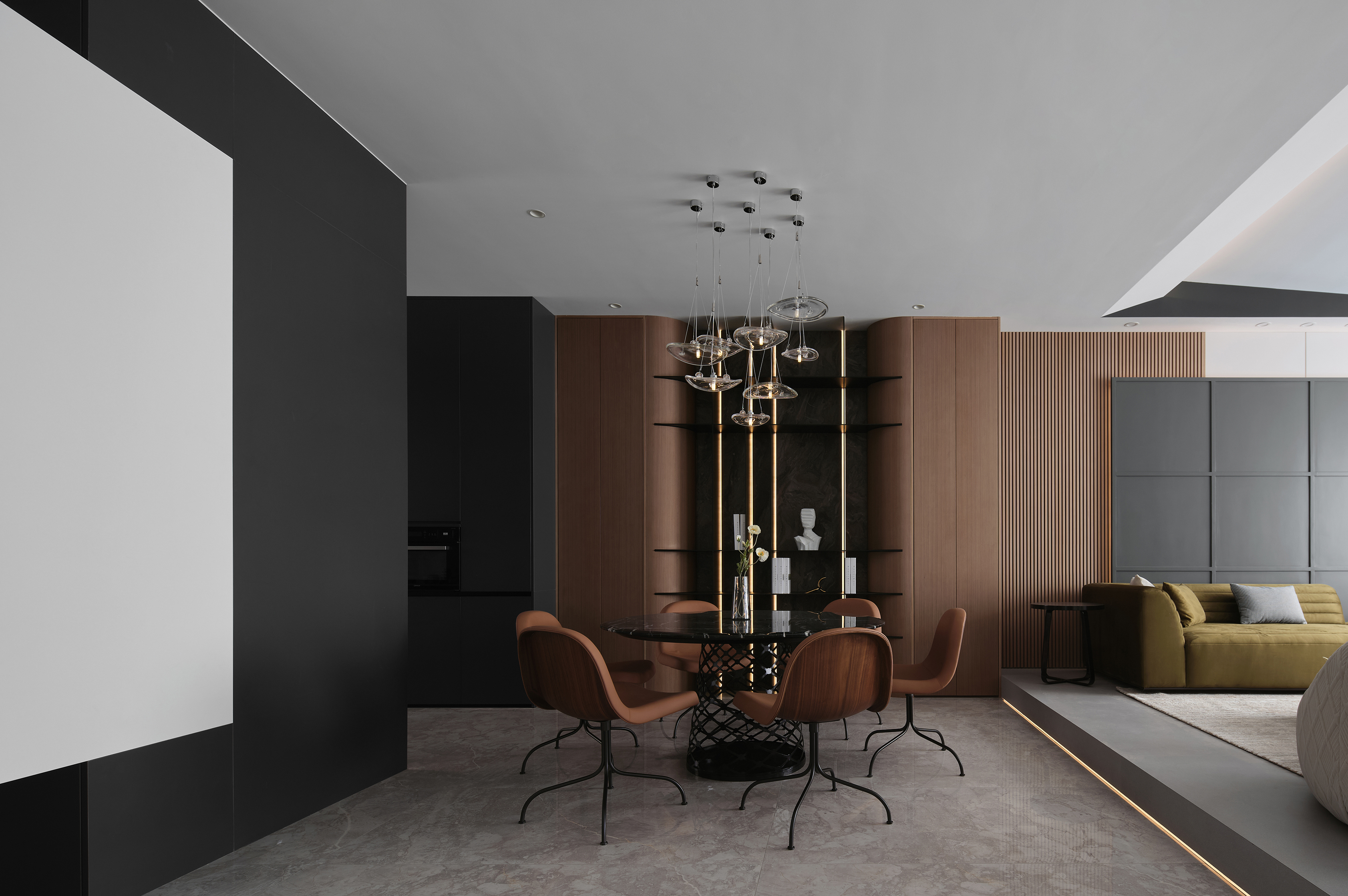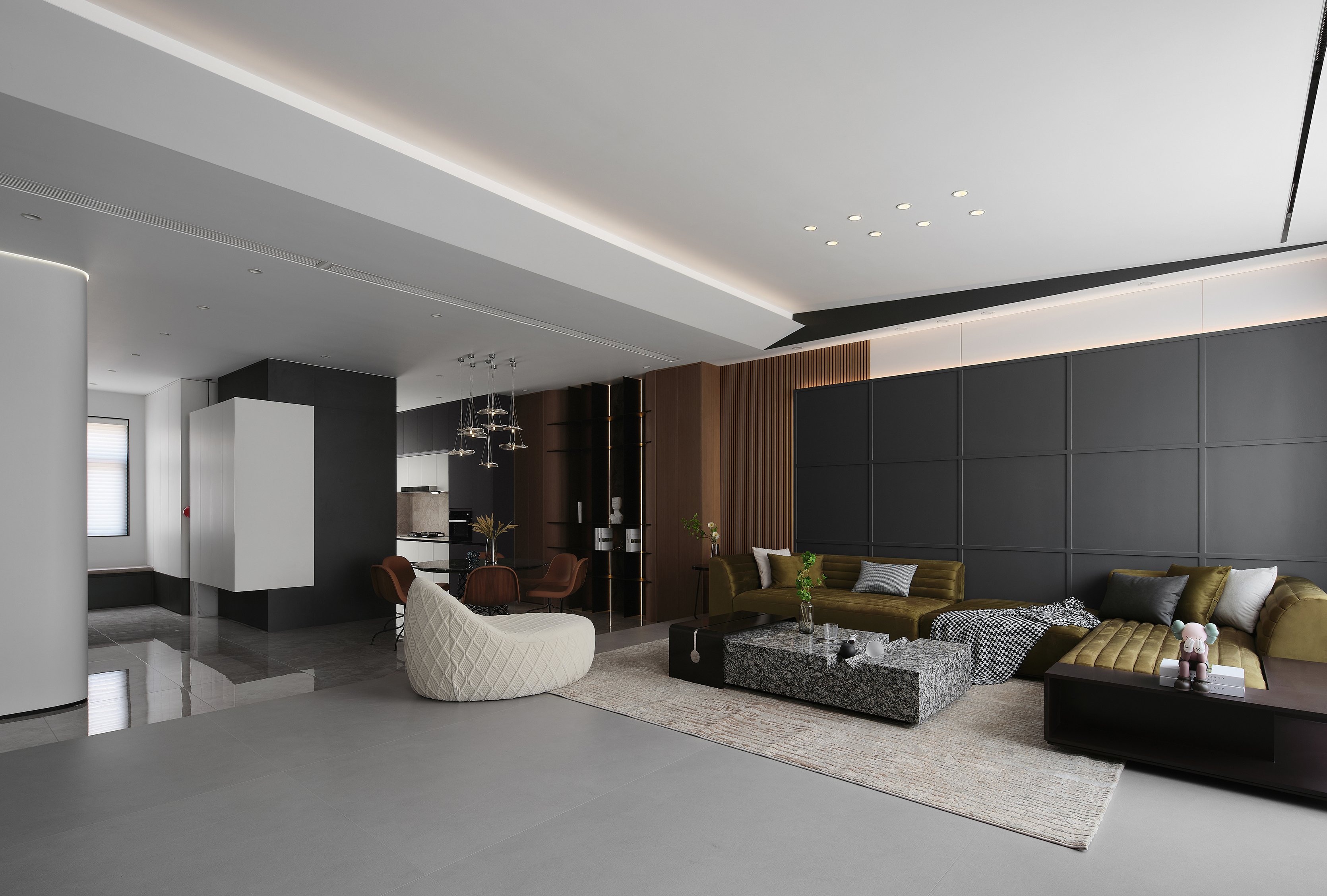 以 “无界洄游公区” 为核心,将玄关、厨房、餐厅、客厅拆解重组为 LDK-X 复合场域,消解传统户型的空间割裂感,构建 “入户 - 置物 - 备餐 - 社交 - 休闲” 的全场景洄游动线,让 “边备餐边社交、边休憩边照看” 的高互动居住场景成为日常 -