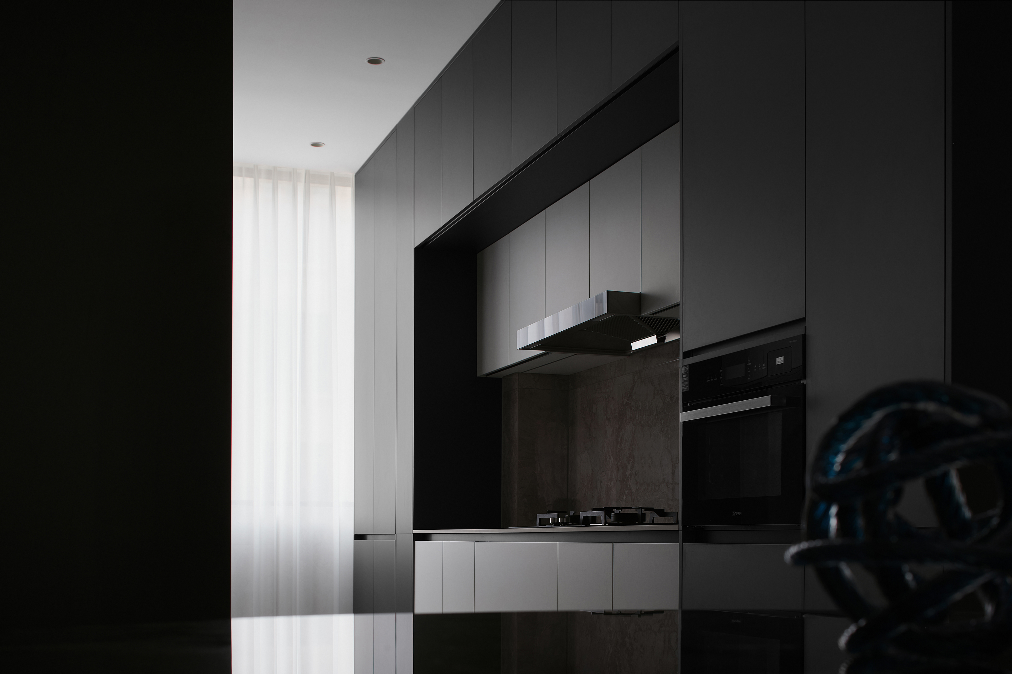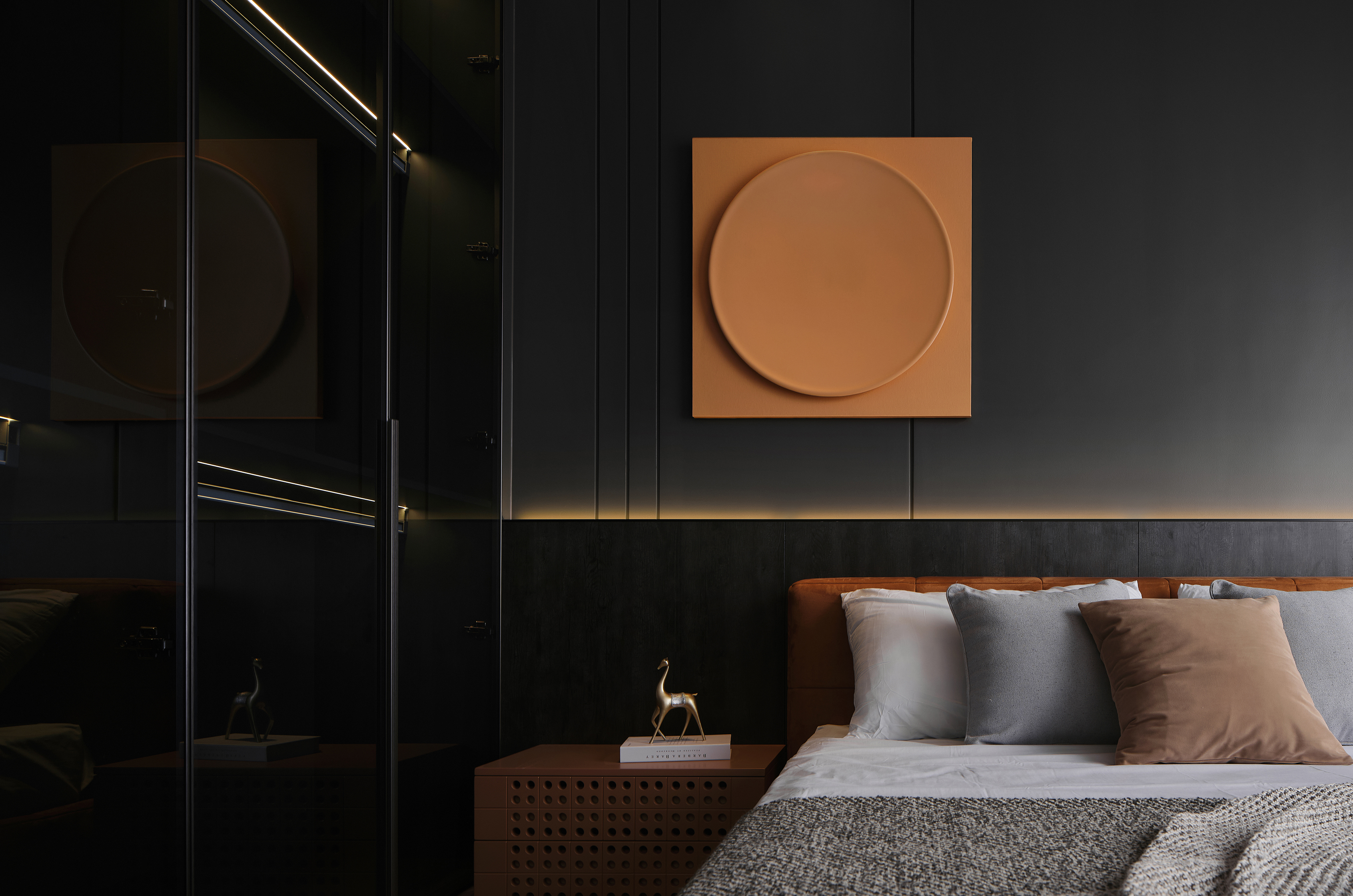 空间意境:整体空间上以灰.木.黑对比较为强烈的方式呈现现代简约的质感,以纯粹直接的设计手法希望表达出空间的大气与清爽的宜居感.