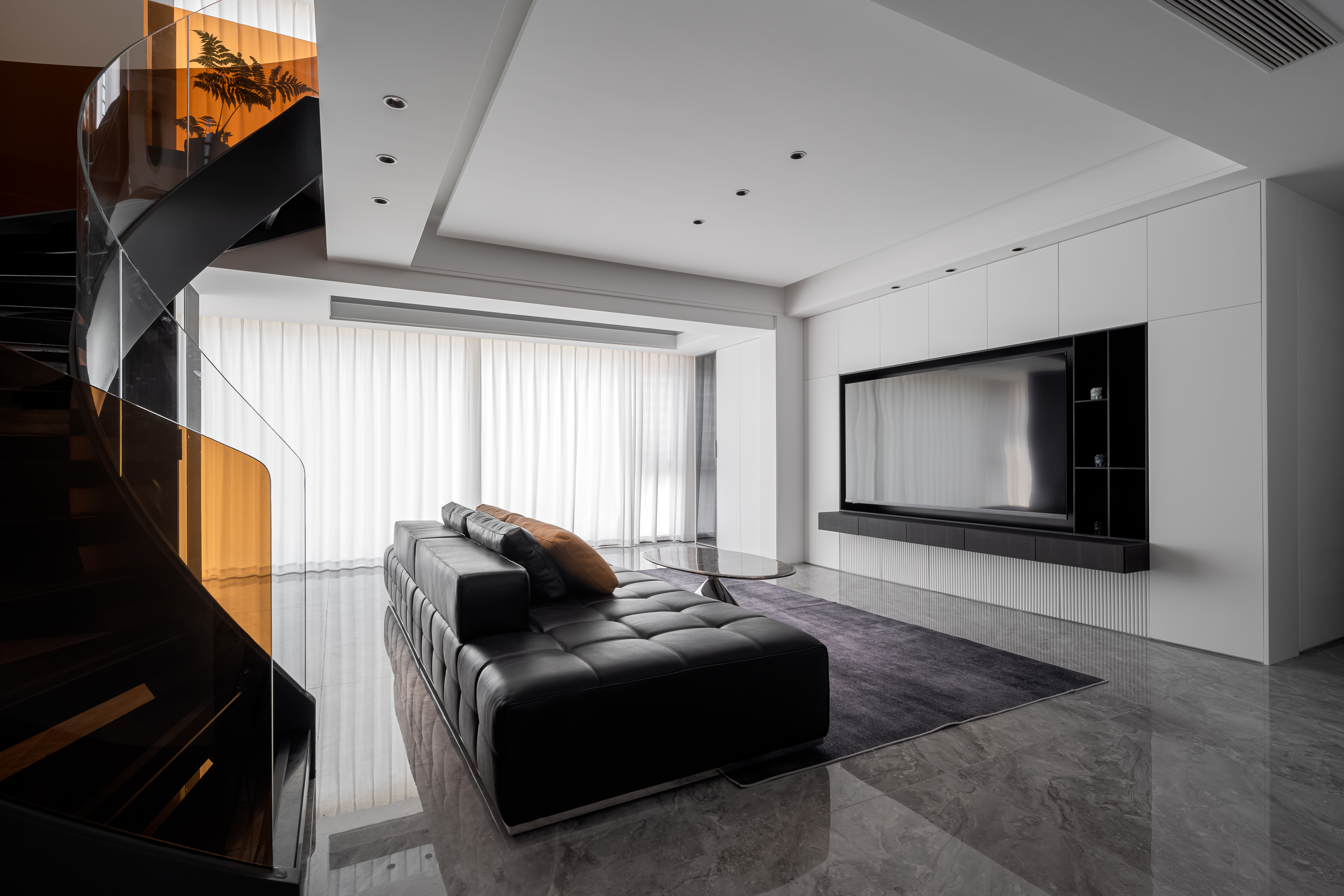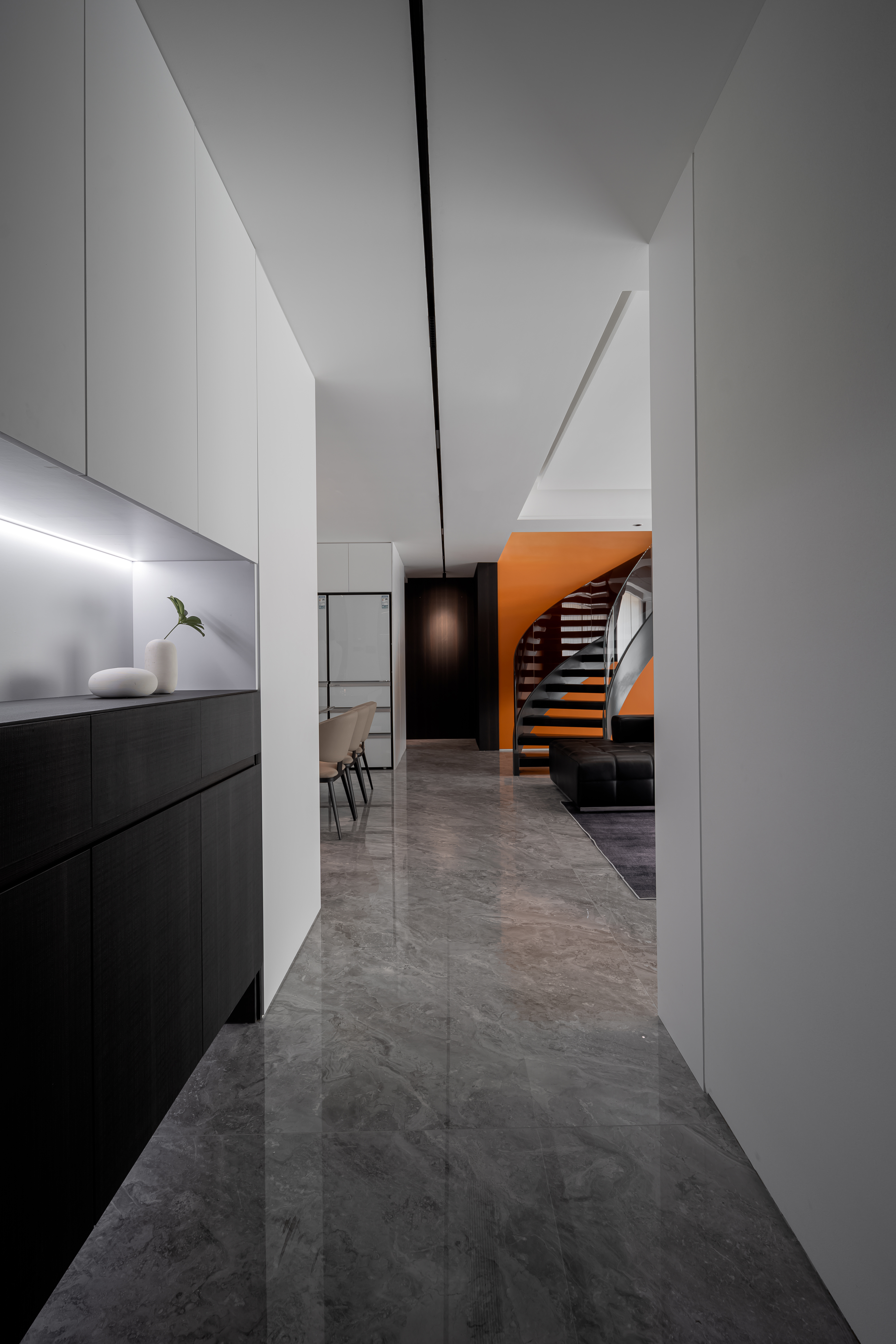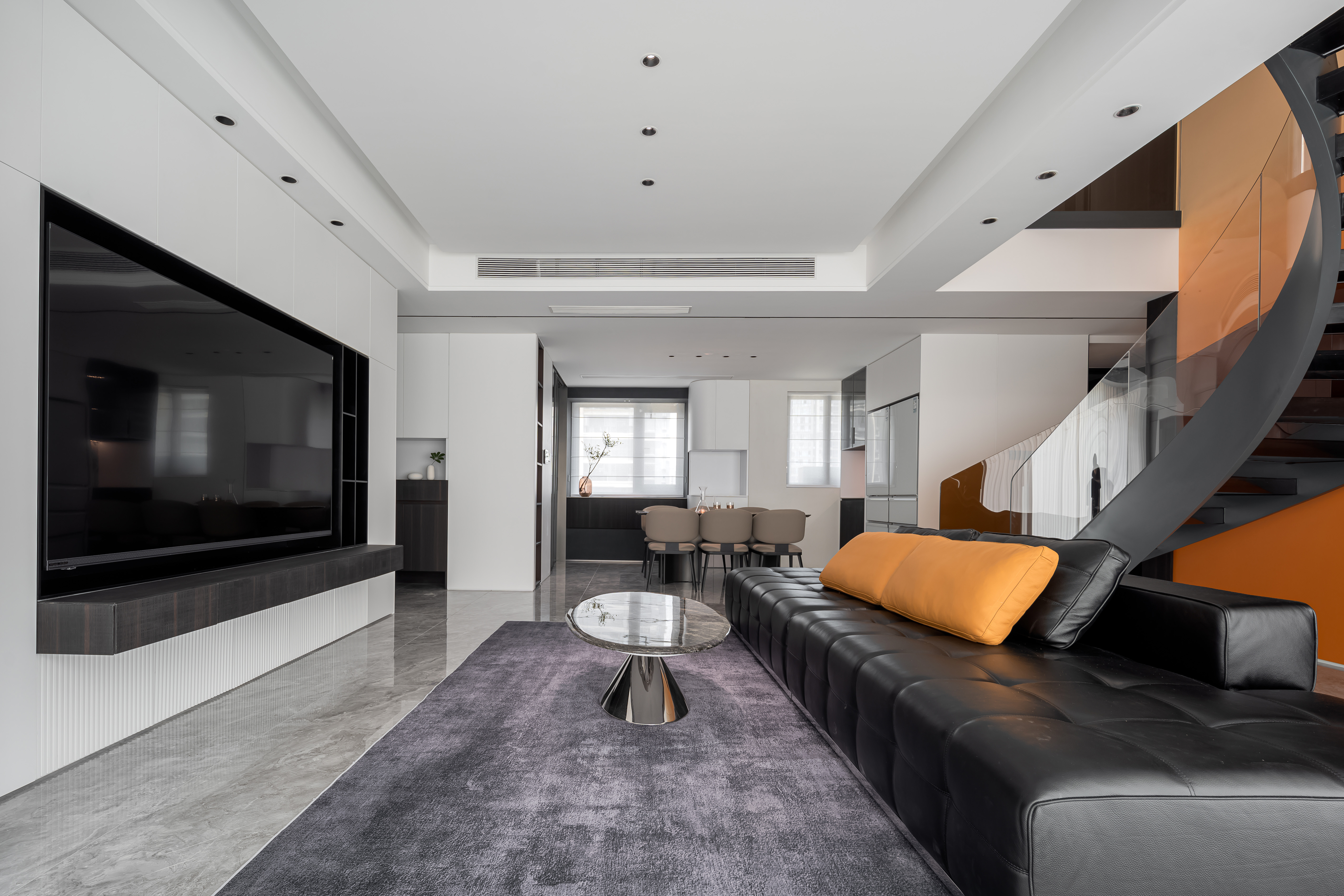 项目定位:这套现代轻奢风格的复式住宅室内设计,整体以黑白为主色调,搭配橙色、咖色等暖调点缀,兼具简约质感与高级氛围