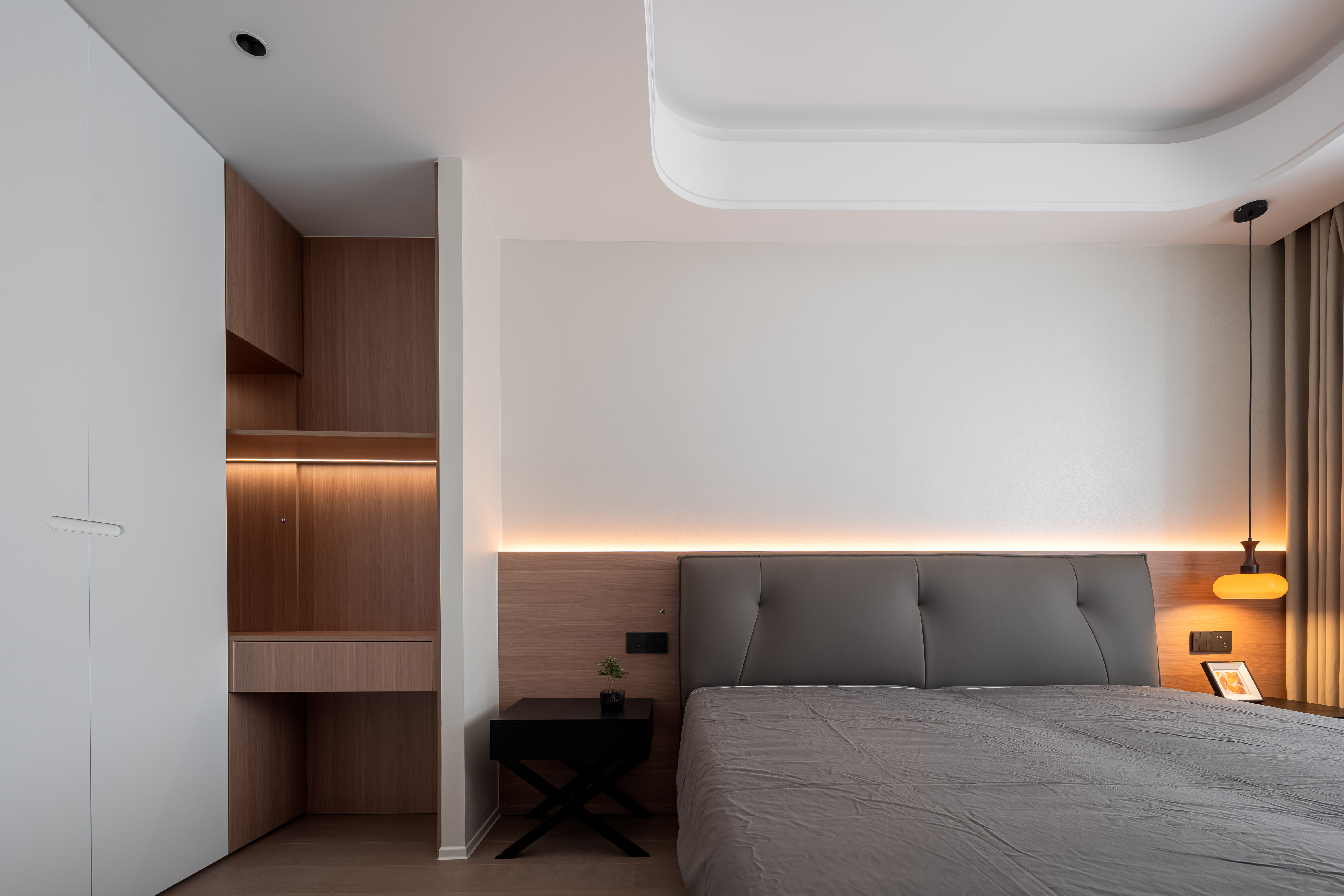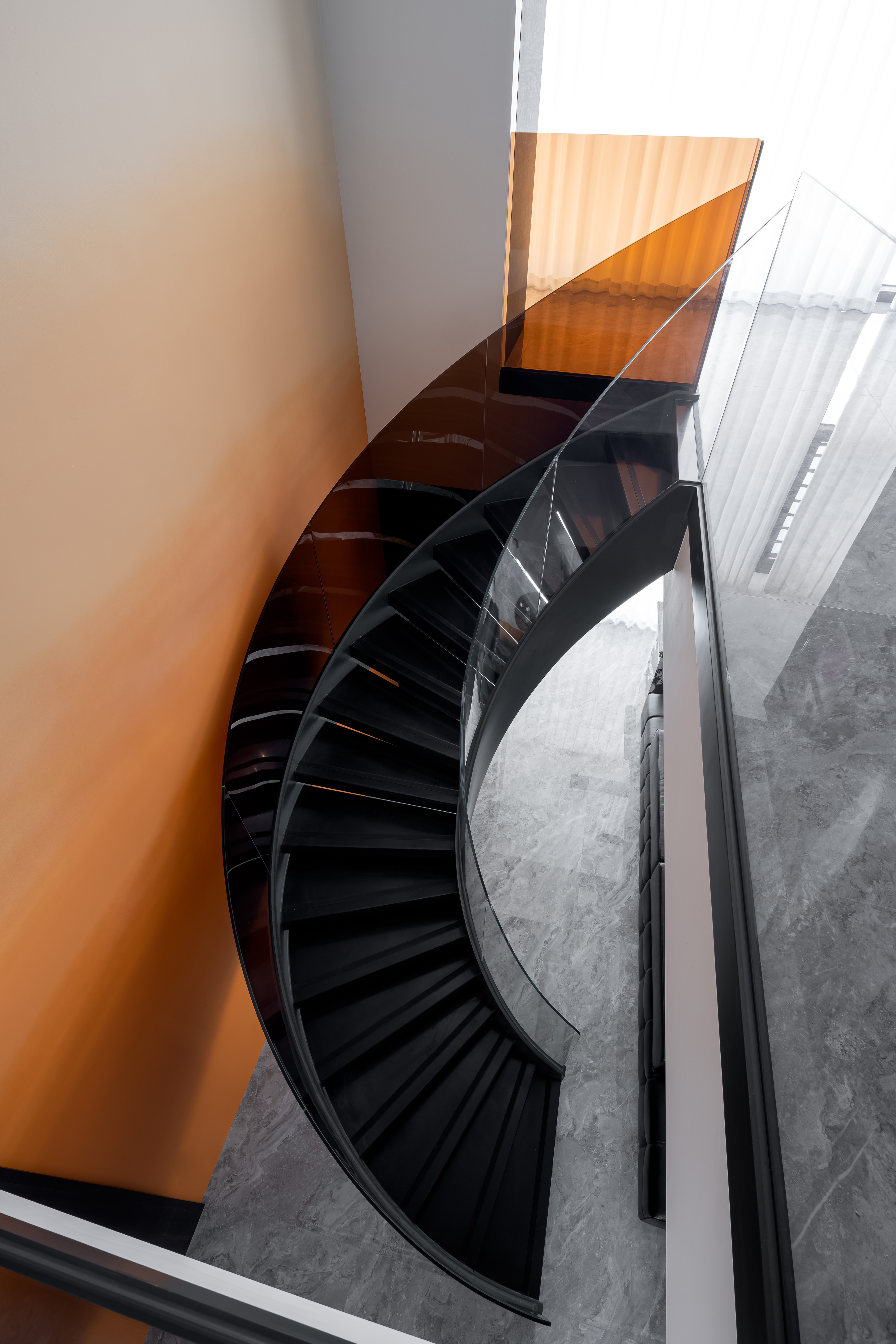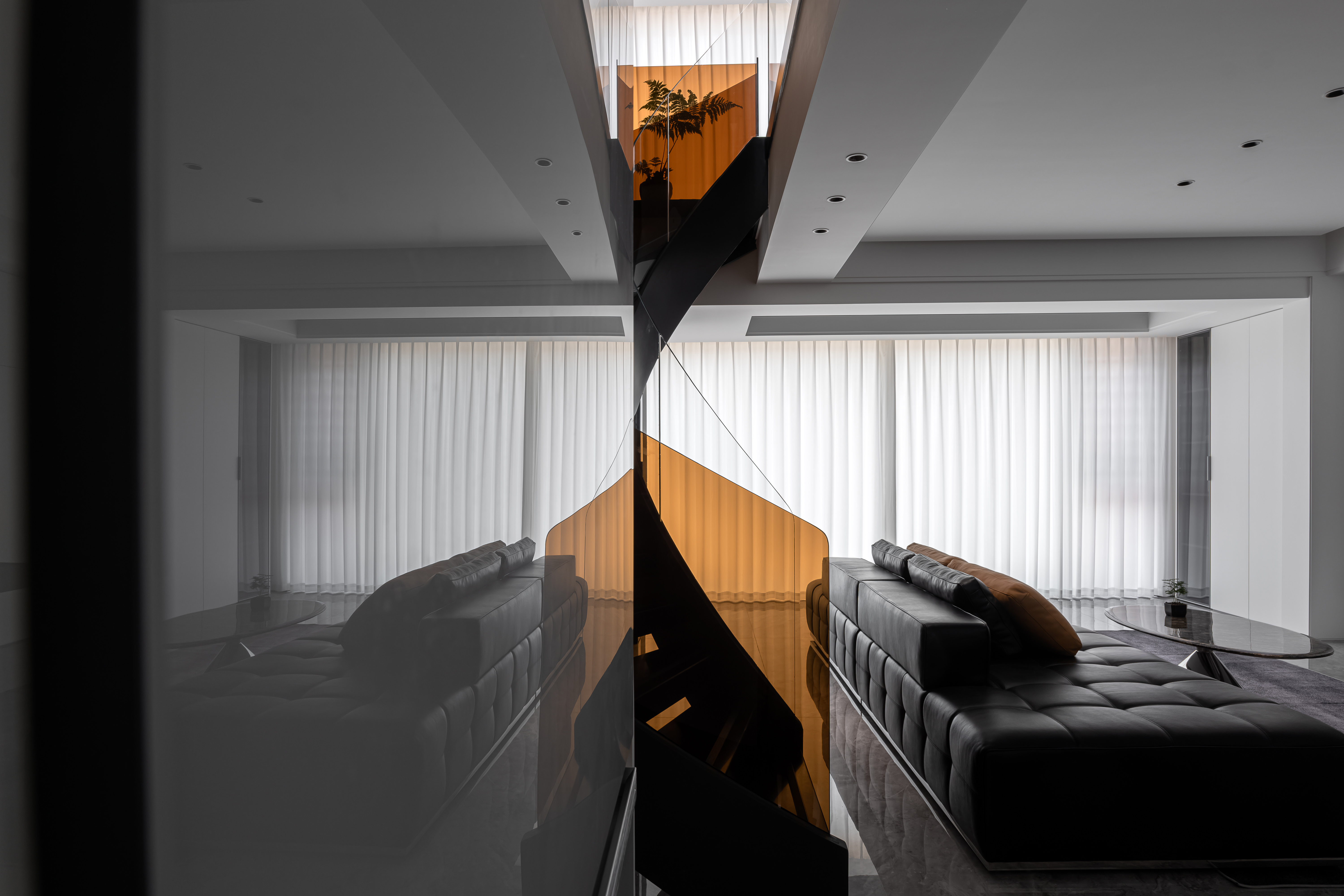 项目定位:这套现代轻奢风格的复式住宅室内设计,整体以黑白为主色调,搭配橙色、咖色等暖调点缀,兼具简约质感与高级氛围