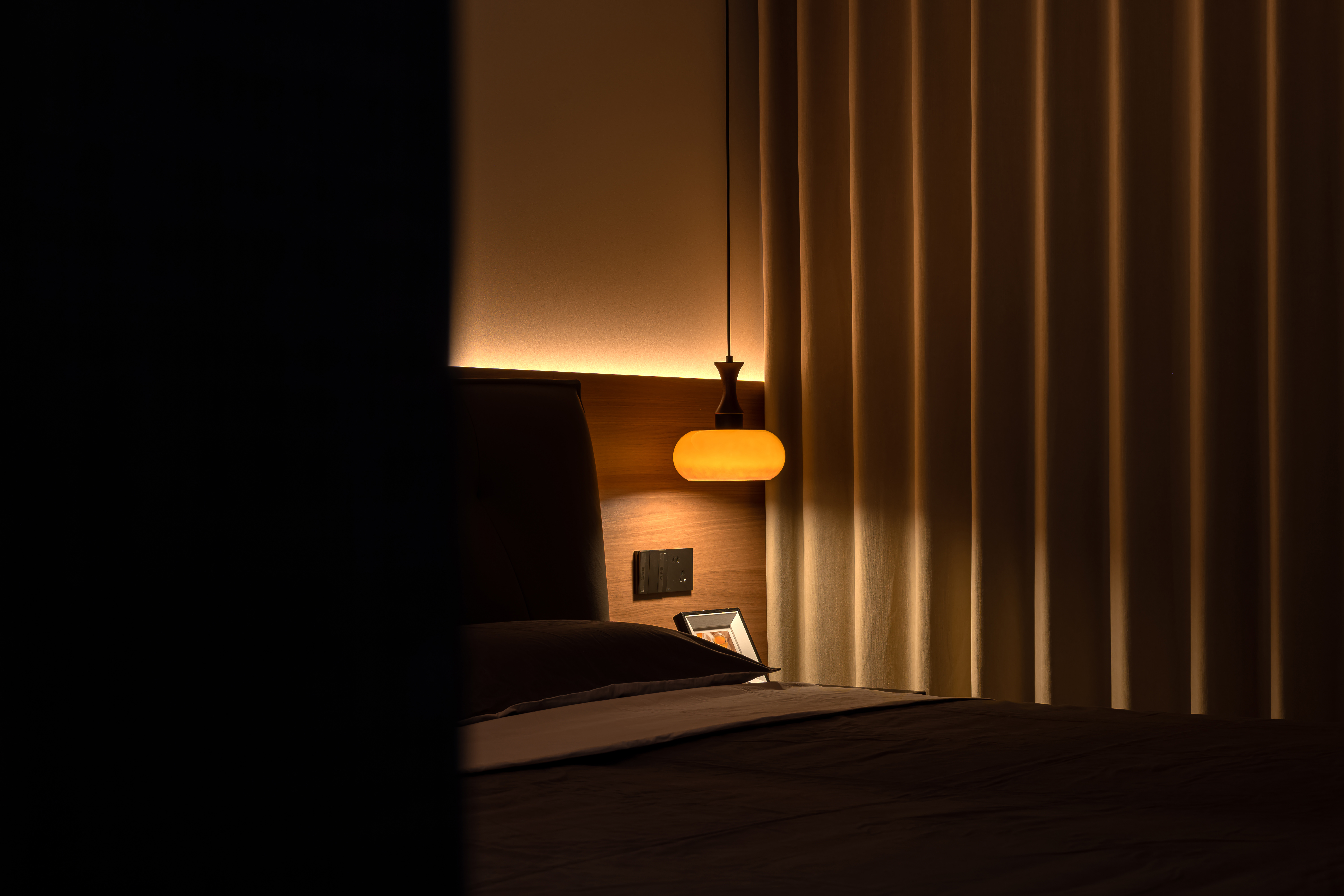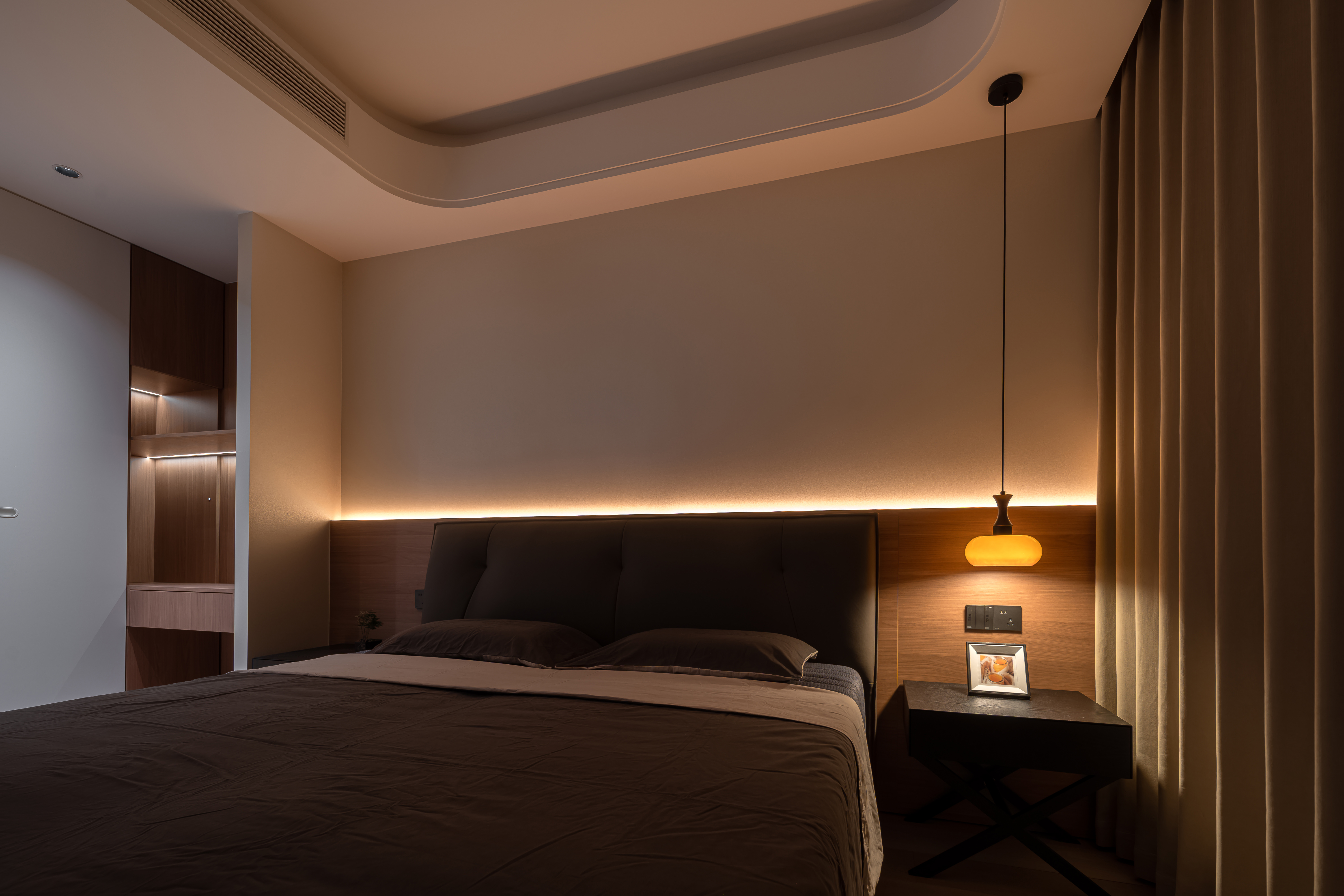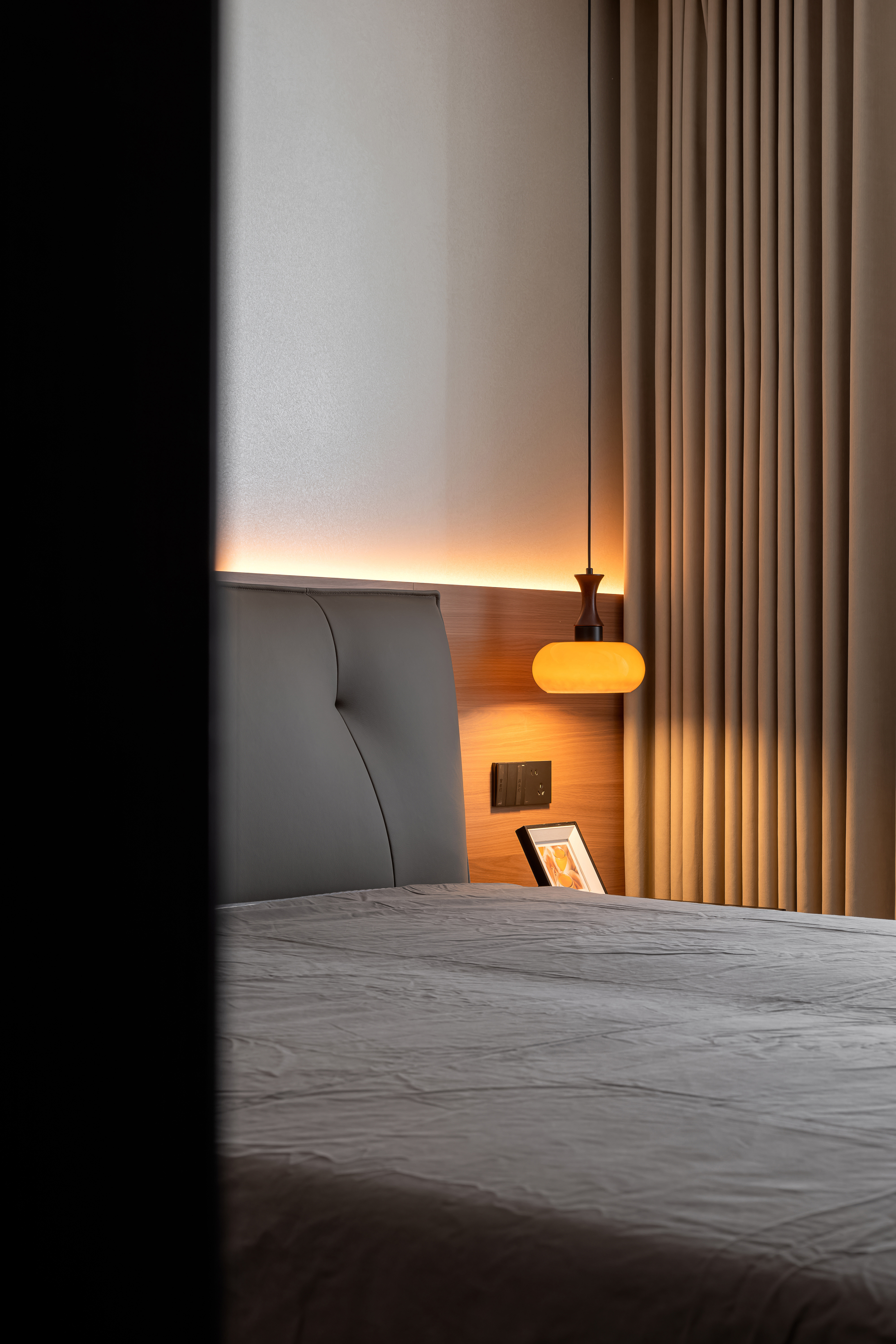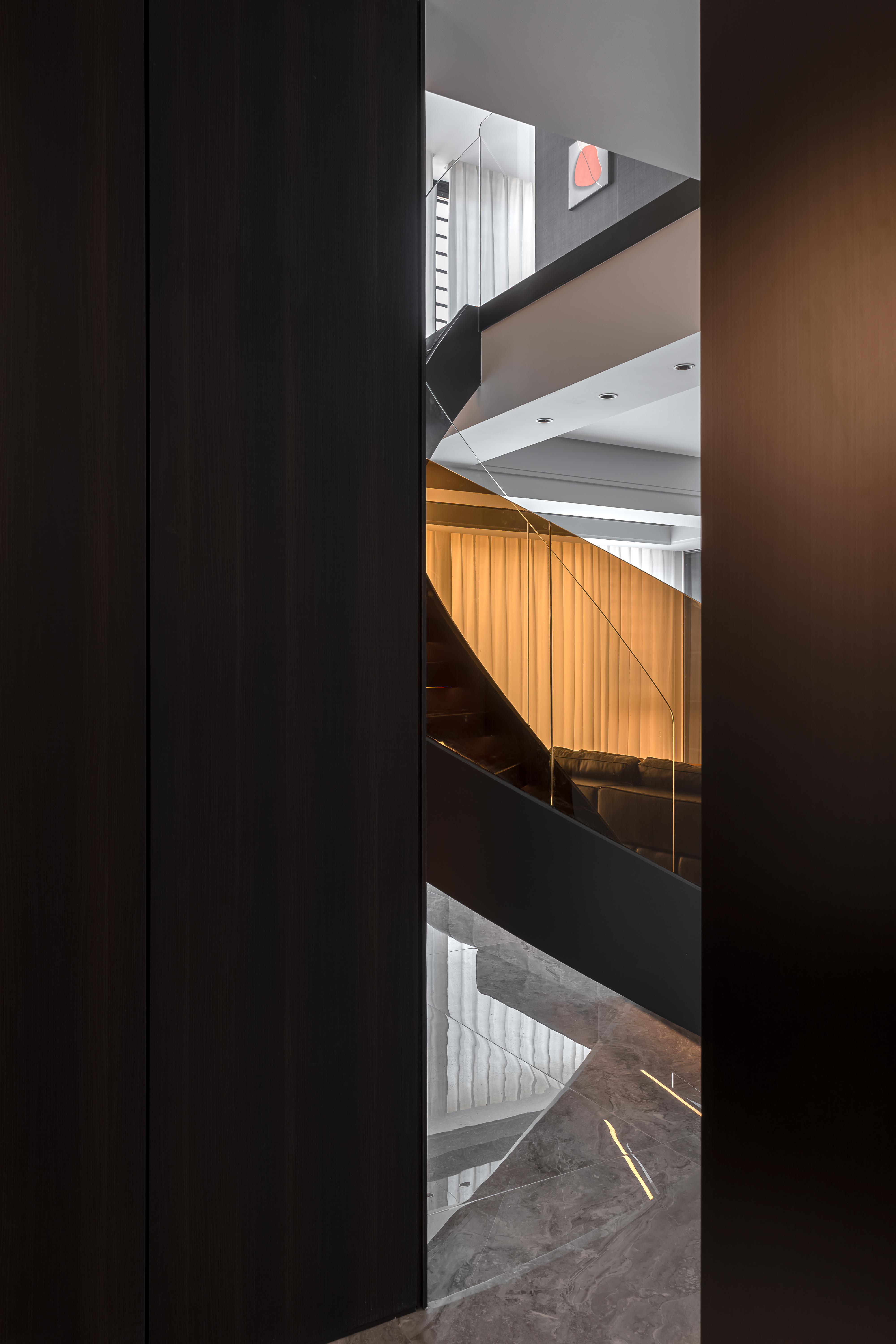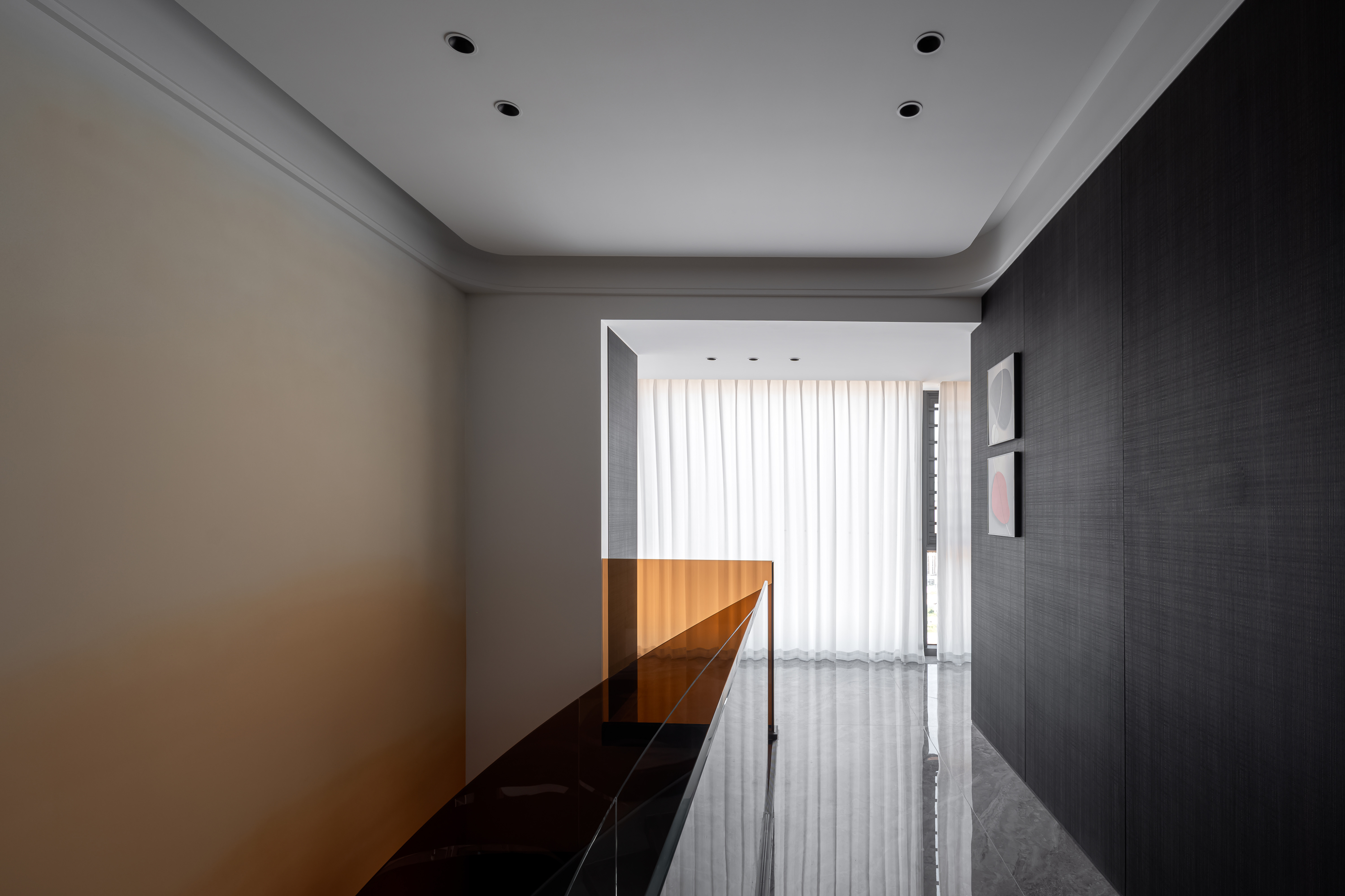用户体验:电视背景墙采用嵌入式柜体+线条造型,楼梯结合玻璃护栏与橙色亚克力板,走廊墙面的艺术挂画与灯光设计,给客户有艺术感的氛围。