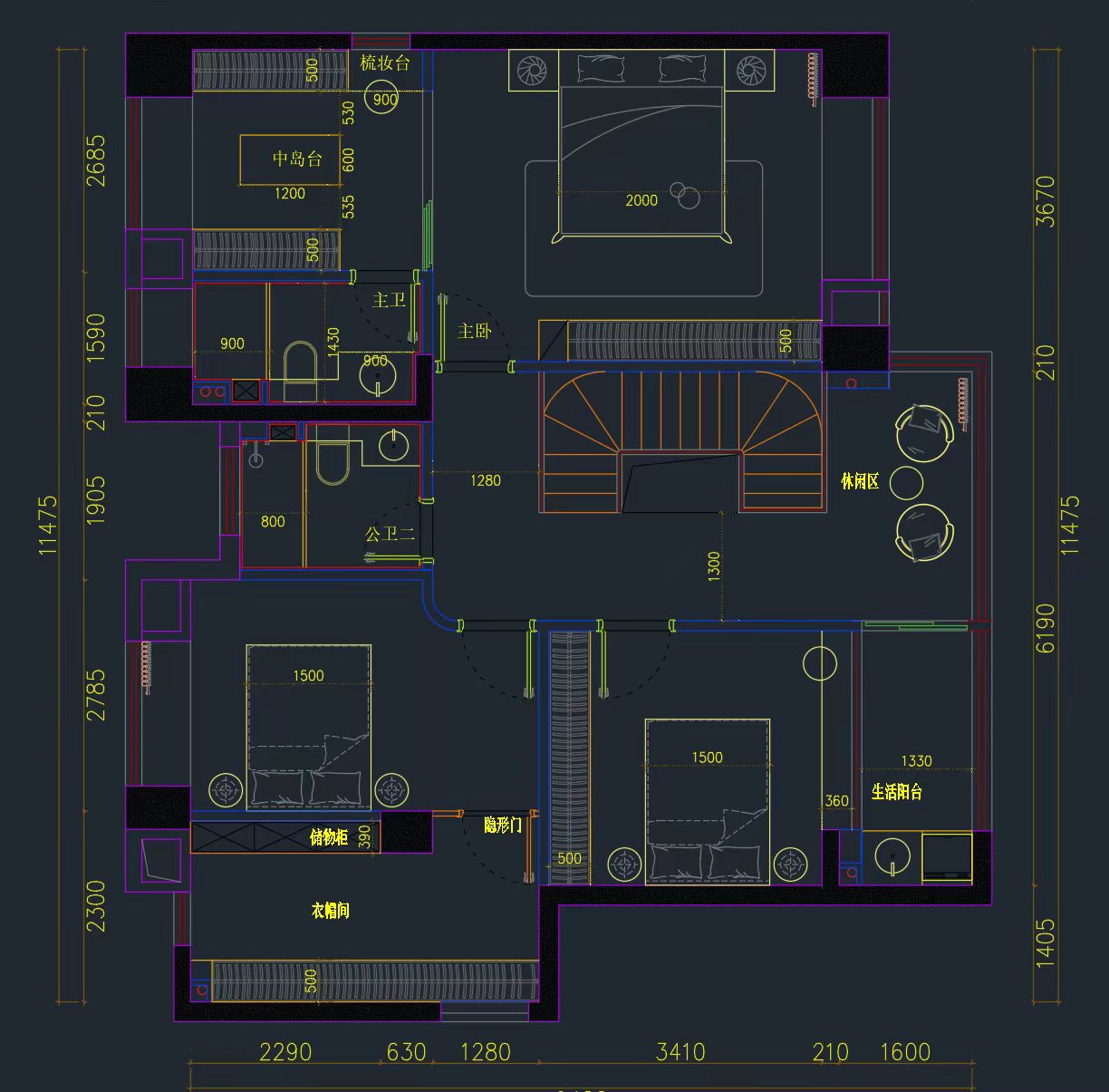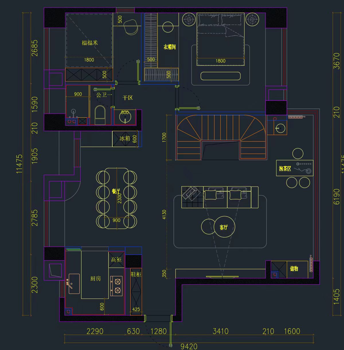 空间意境:采用客餐厨一体化的开放式设计,配合旋转楼梯打造复式空间的通透感,公共区域动线流畅且视觉上更显开阔