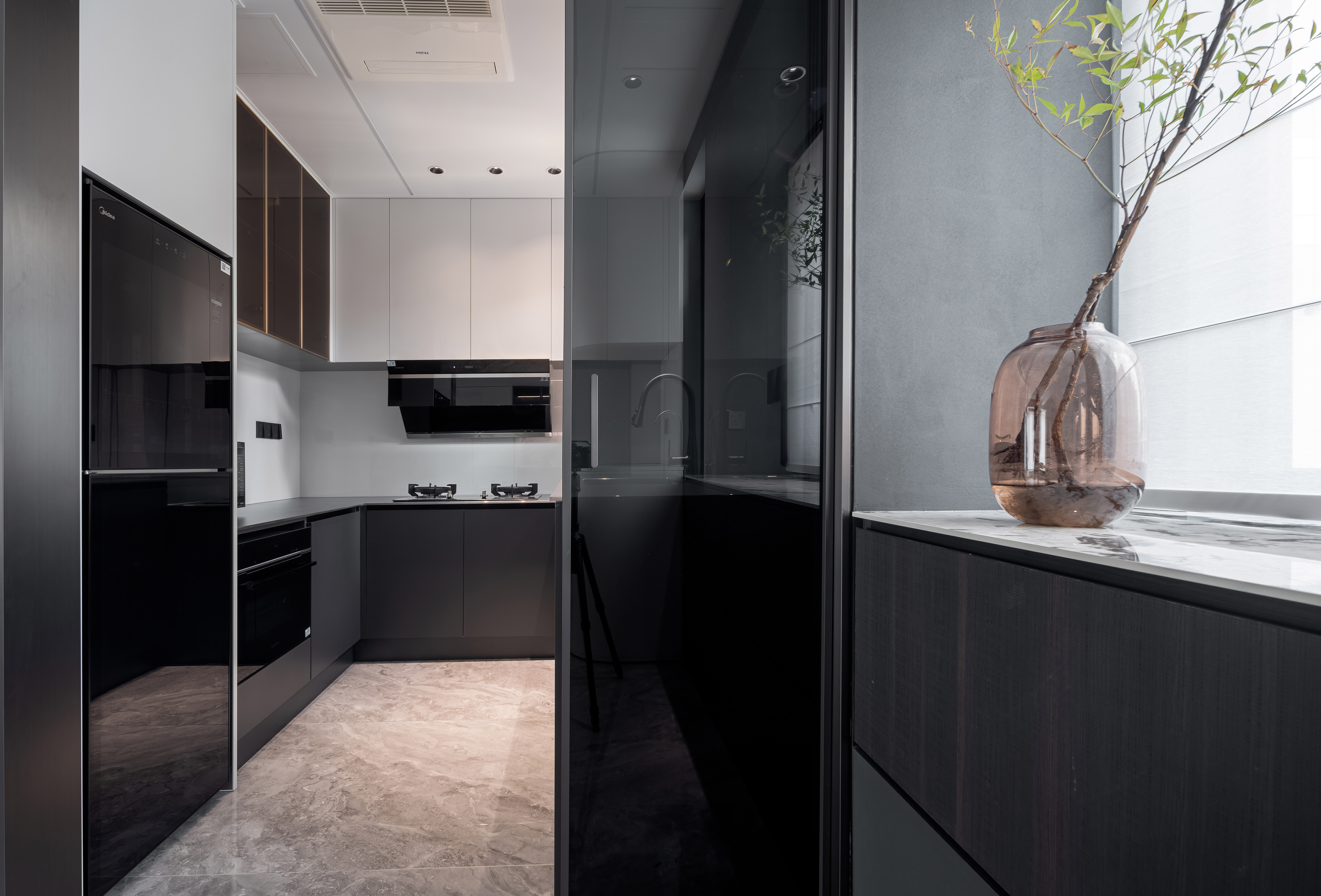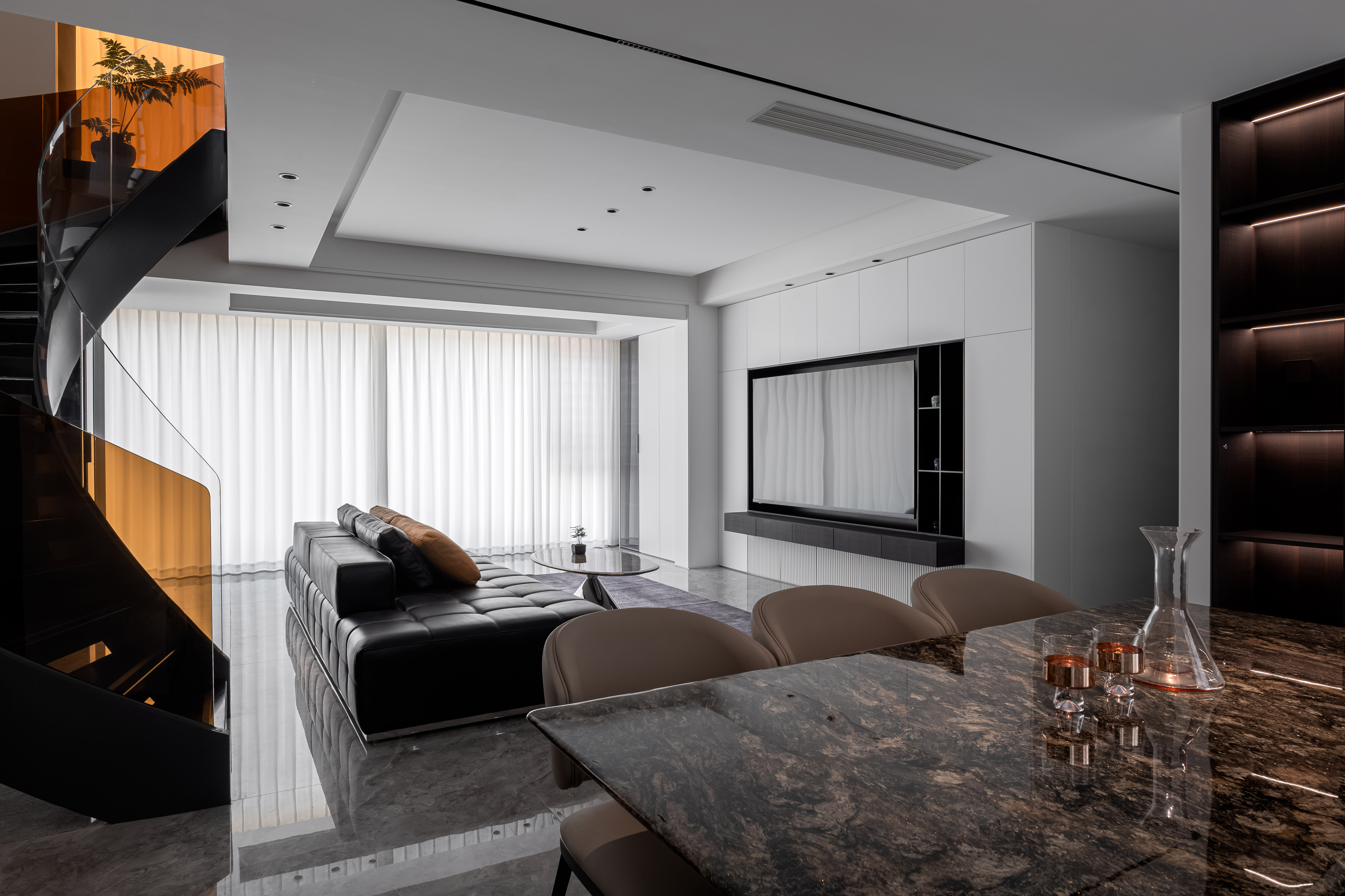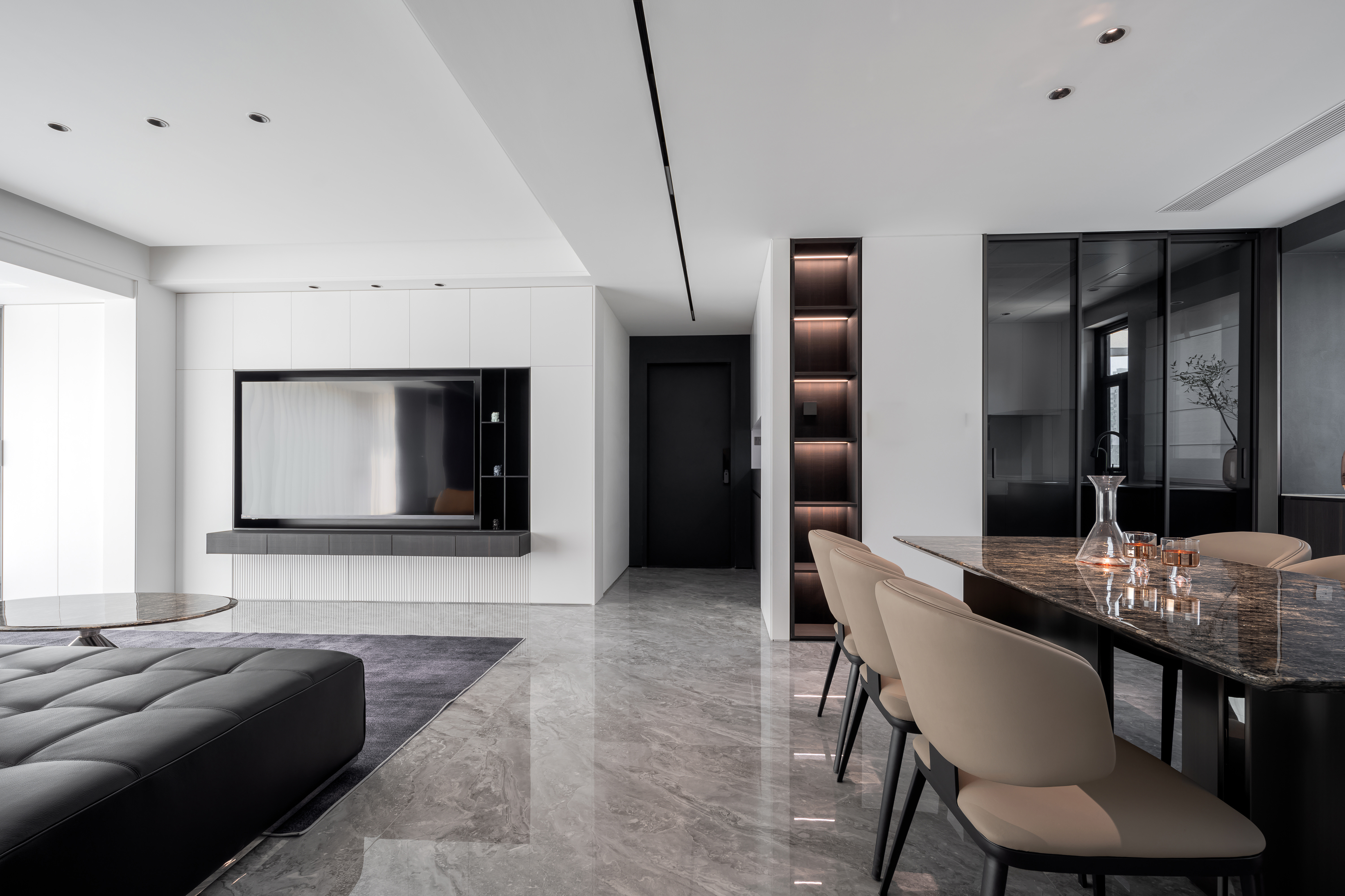 设计选材:地面选用高光灰色大理石,搭配黑色皮革沙发、玻璃/金属质感的家具,厨房与柜体则结合哑光烤漆、木饰面,材质对比凸显轻奢属性