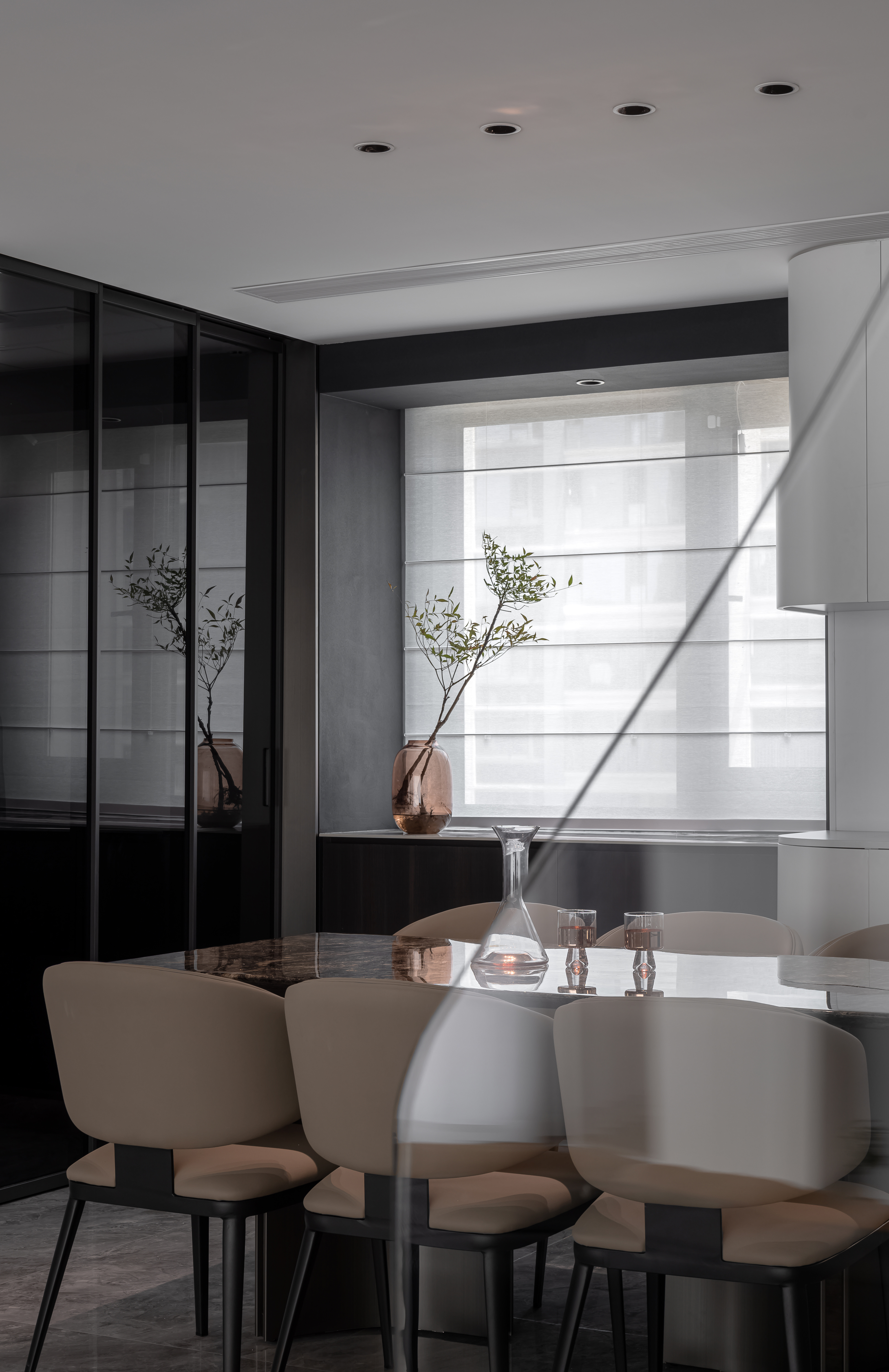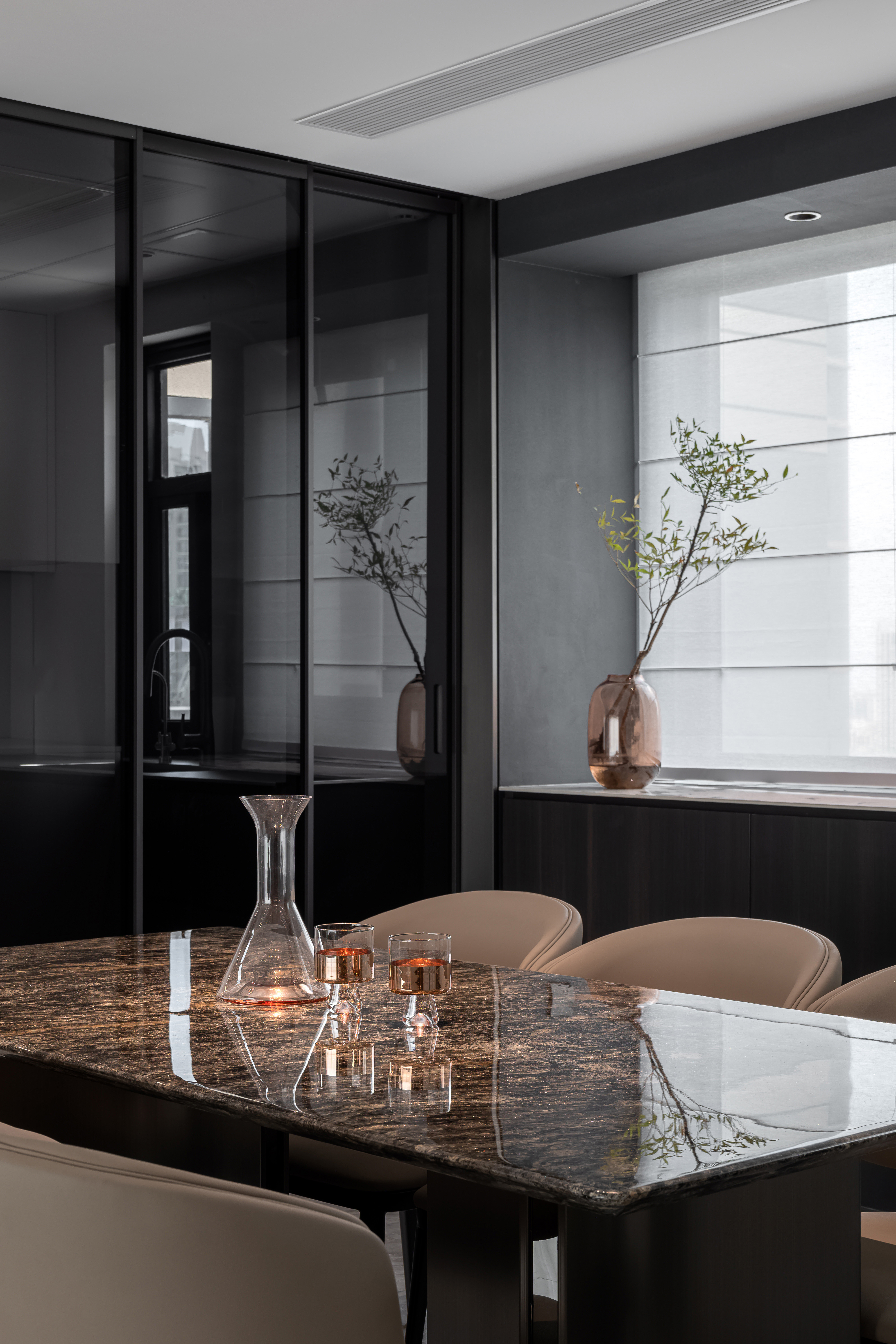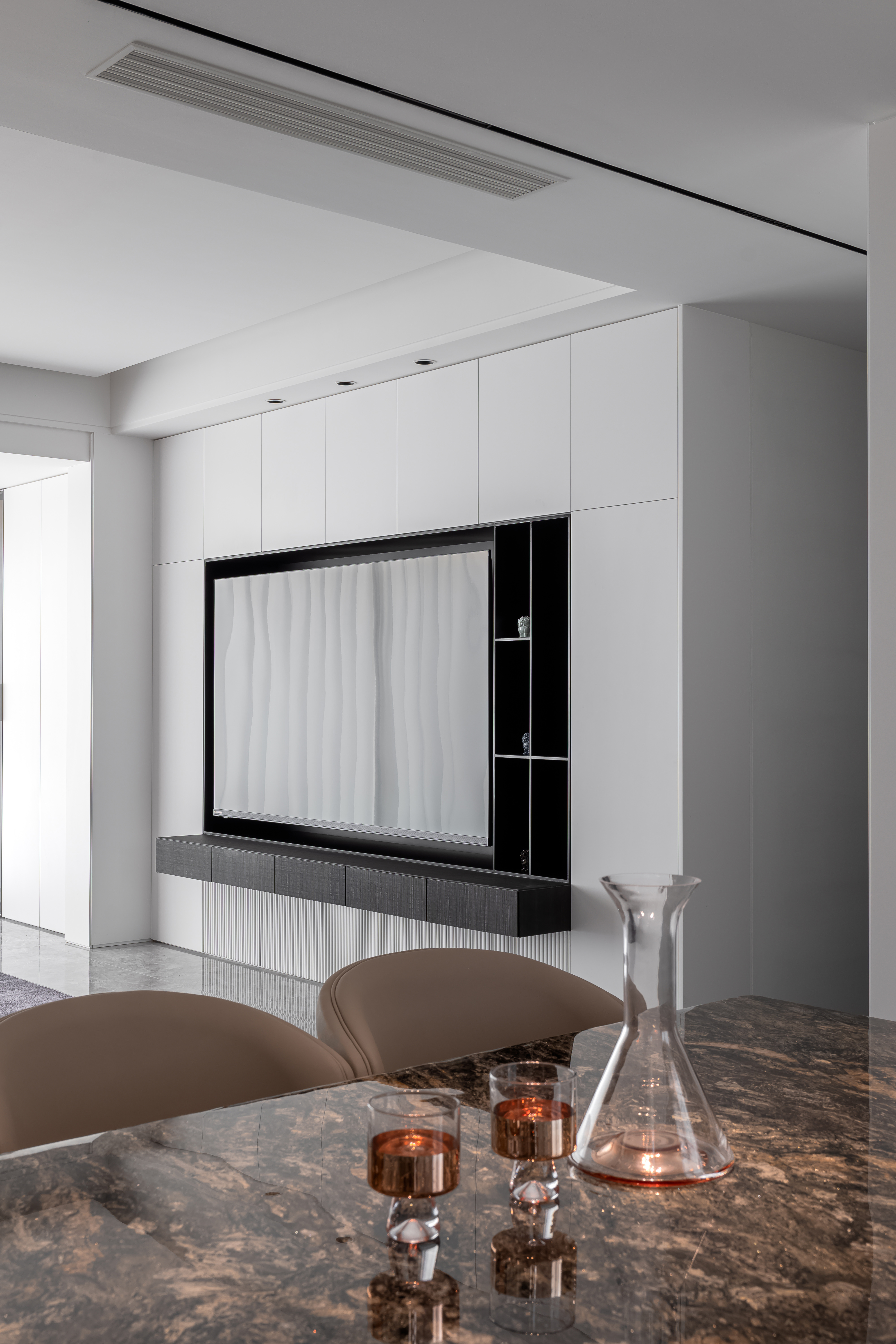 设计选材:地面选用高光灰色大理石,搭配黑色皮革沙发、玻璃/金属质感的家具,厨房与柜体则结合哑光烤漆、木饰面,材质对比凸显轻奢属性