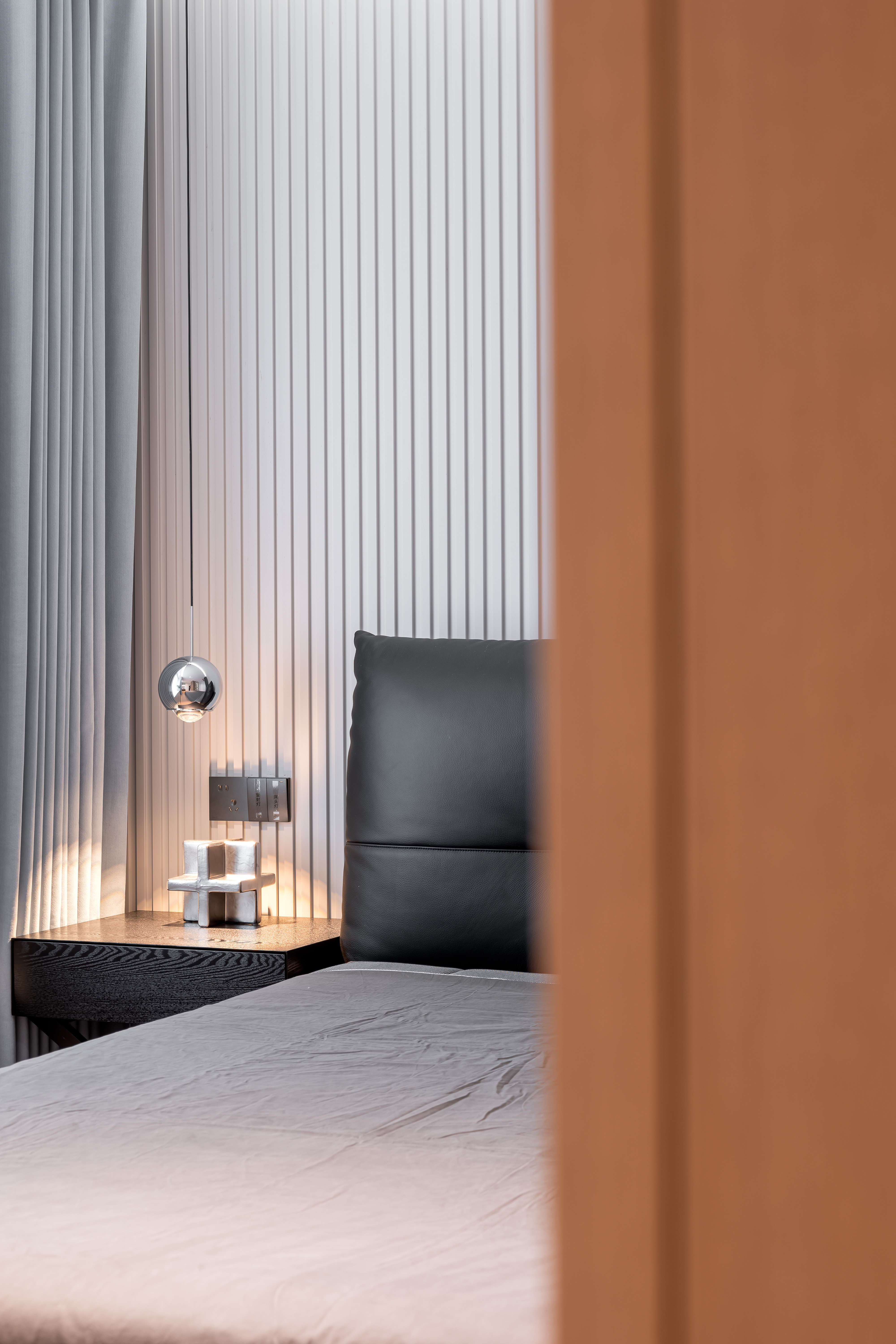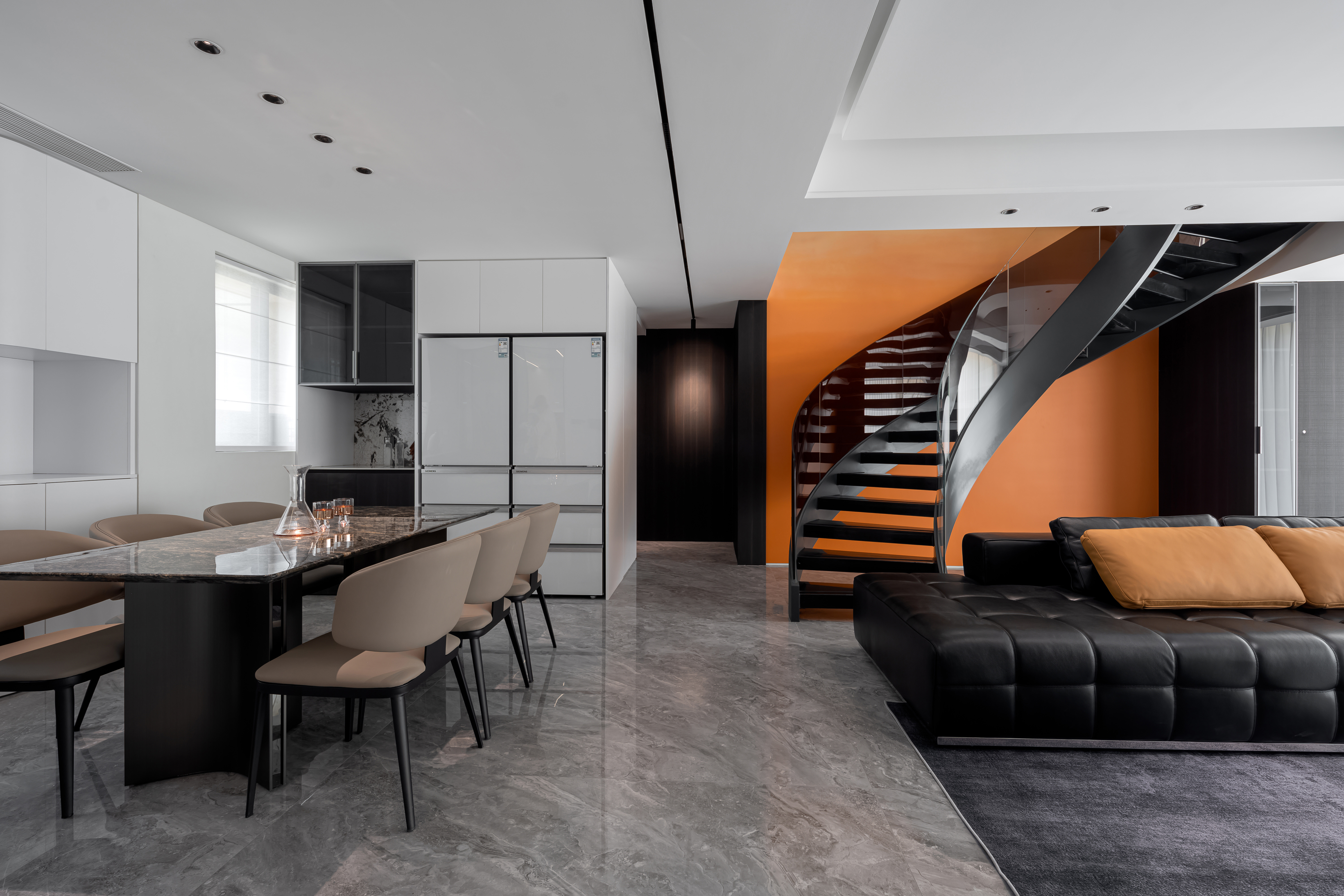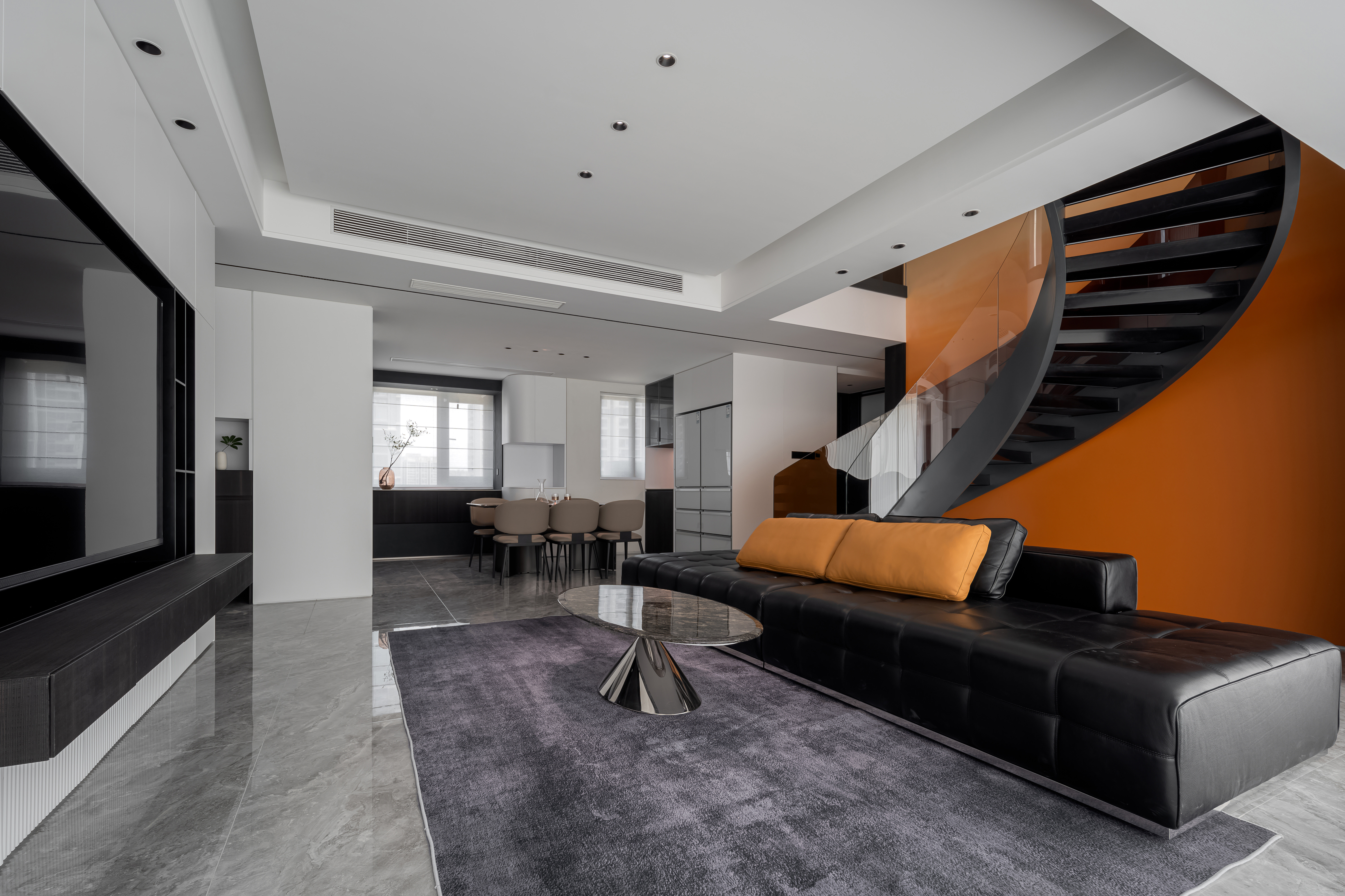 空间布局:以黑白灰为基底,用橙色墙面、焦糖色抱枕/餐椅做撞色点缀,深色木饰面与大理石材质提升空间的精致度与层次感