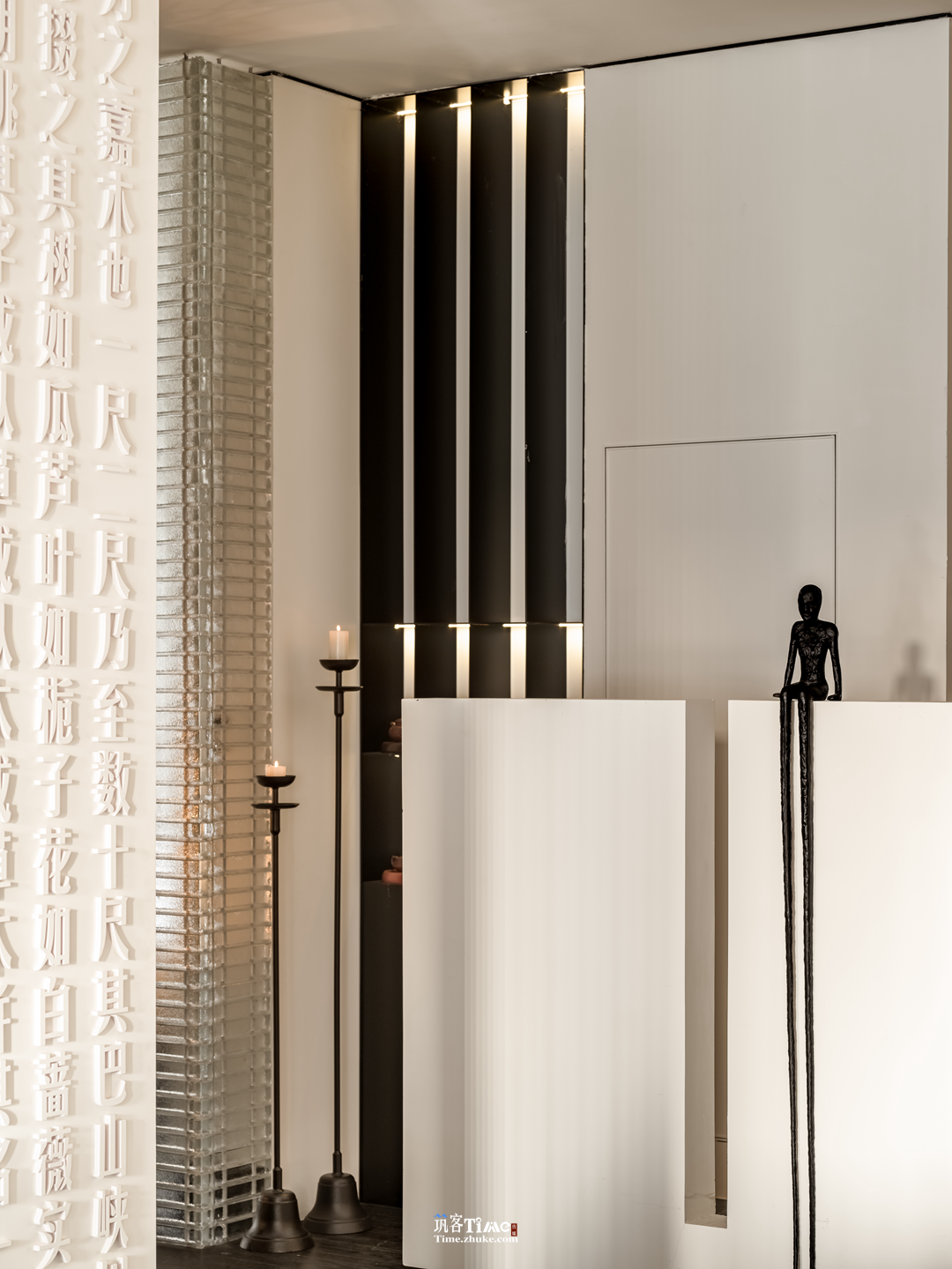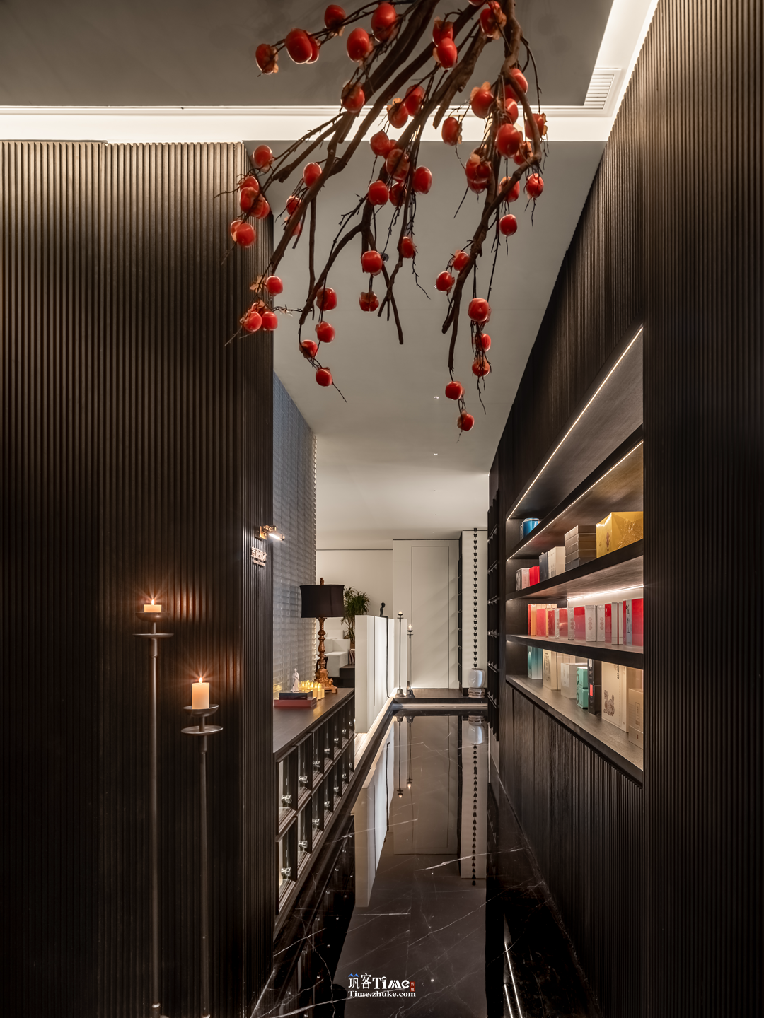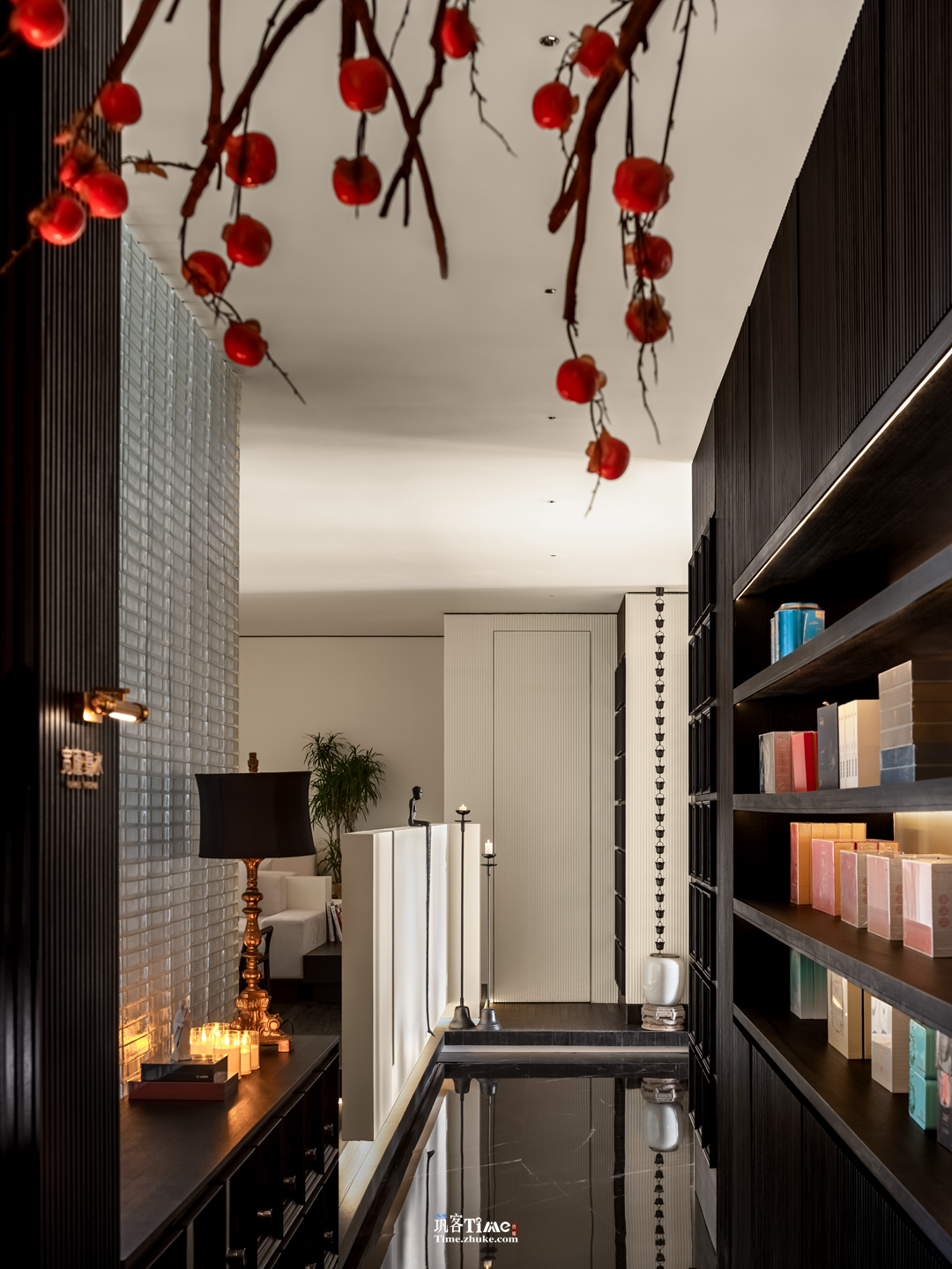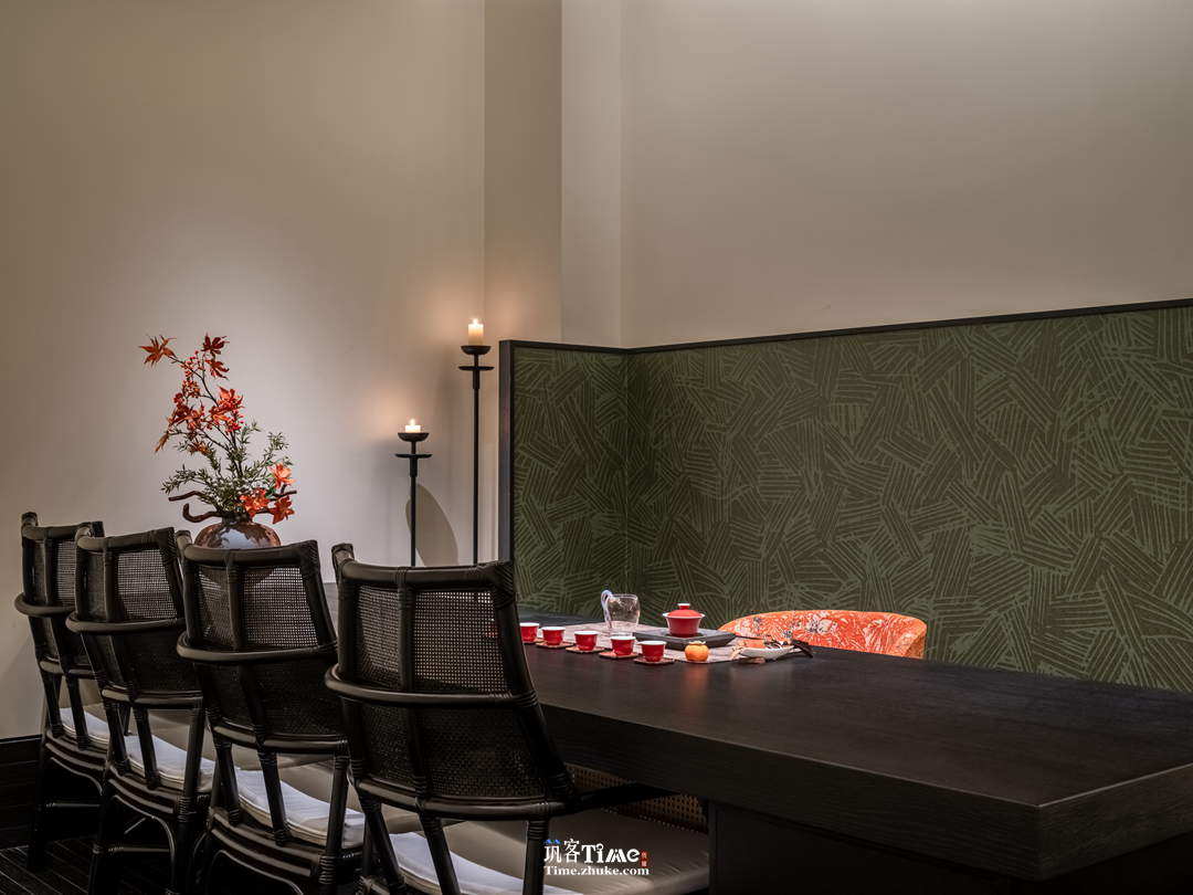 设计选材:以黑白灰为基底,搭配竖向条纹肌理黑调材质拉伸空间感;巧用玻璃砖作包间墙面与廊侧屏障,水晶砖替代部分实墙引入光线;融入在地风物,嫣红柿果点缀空间,品牌元素隐于墙面纹理或显于软装,平衡沉敛质感与鲜活气息。