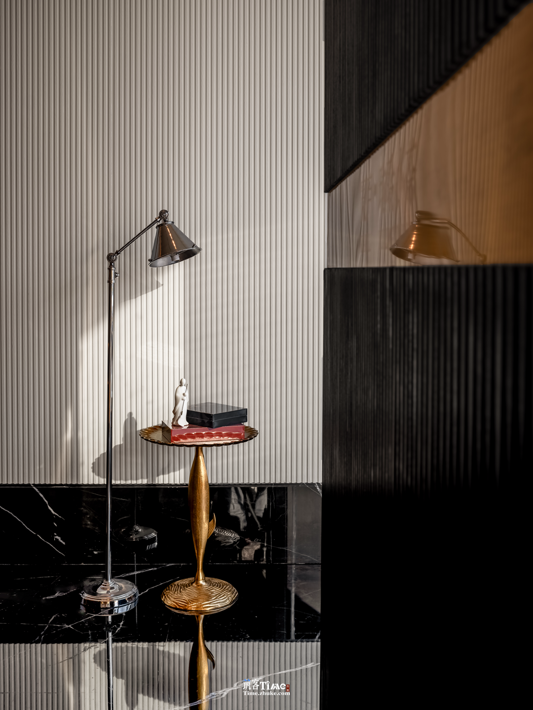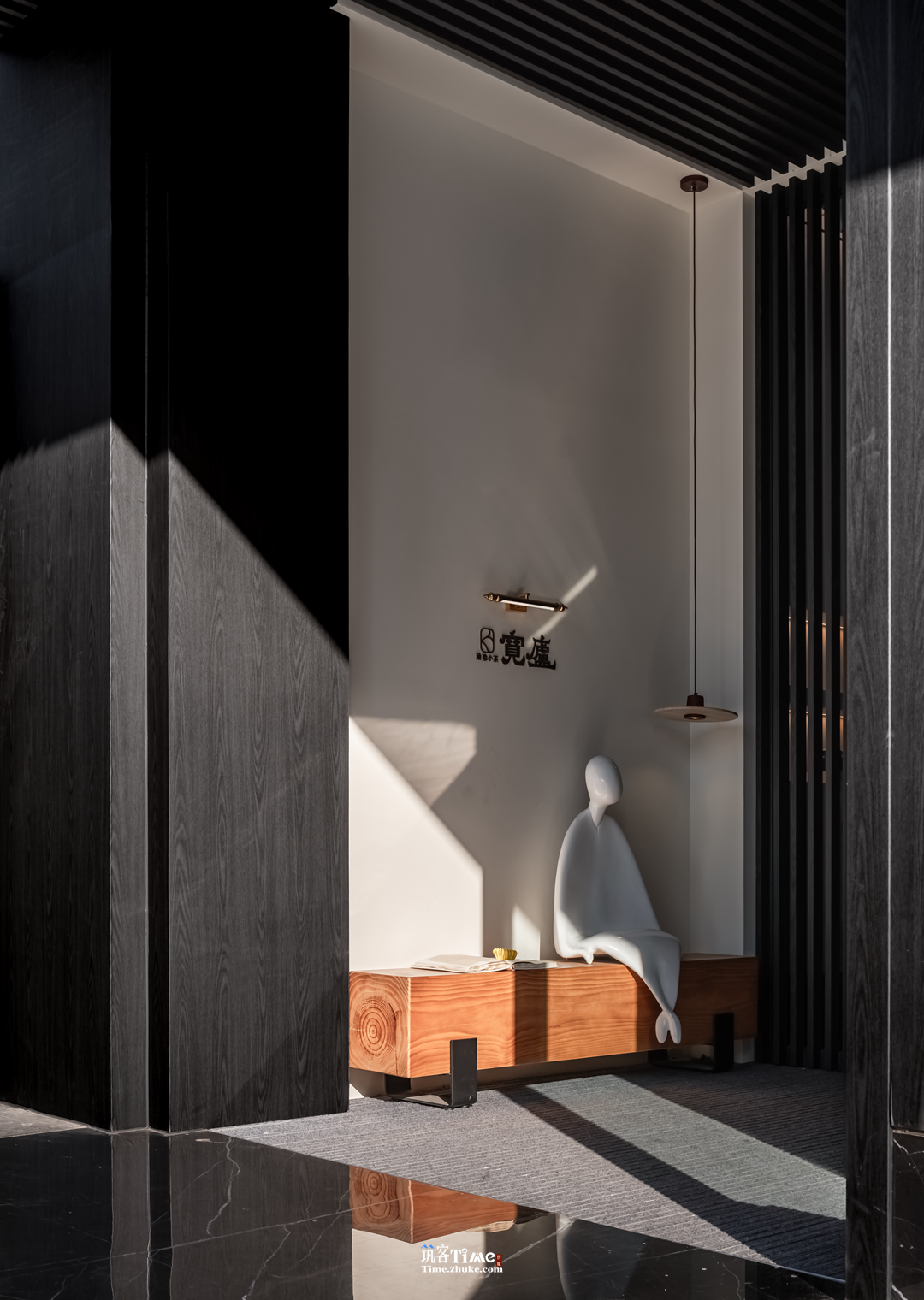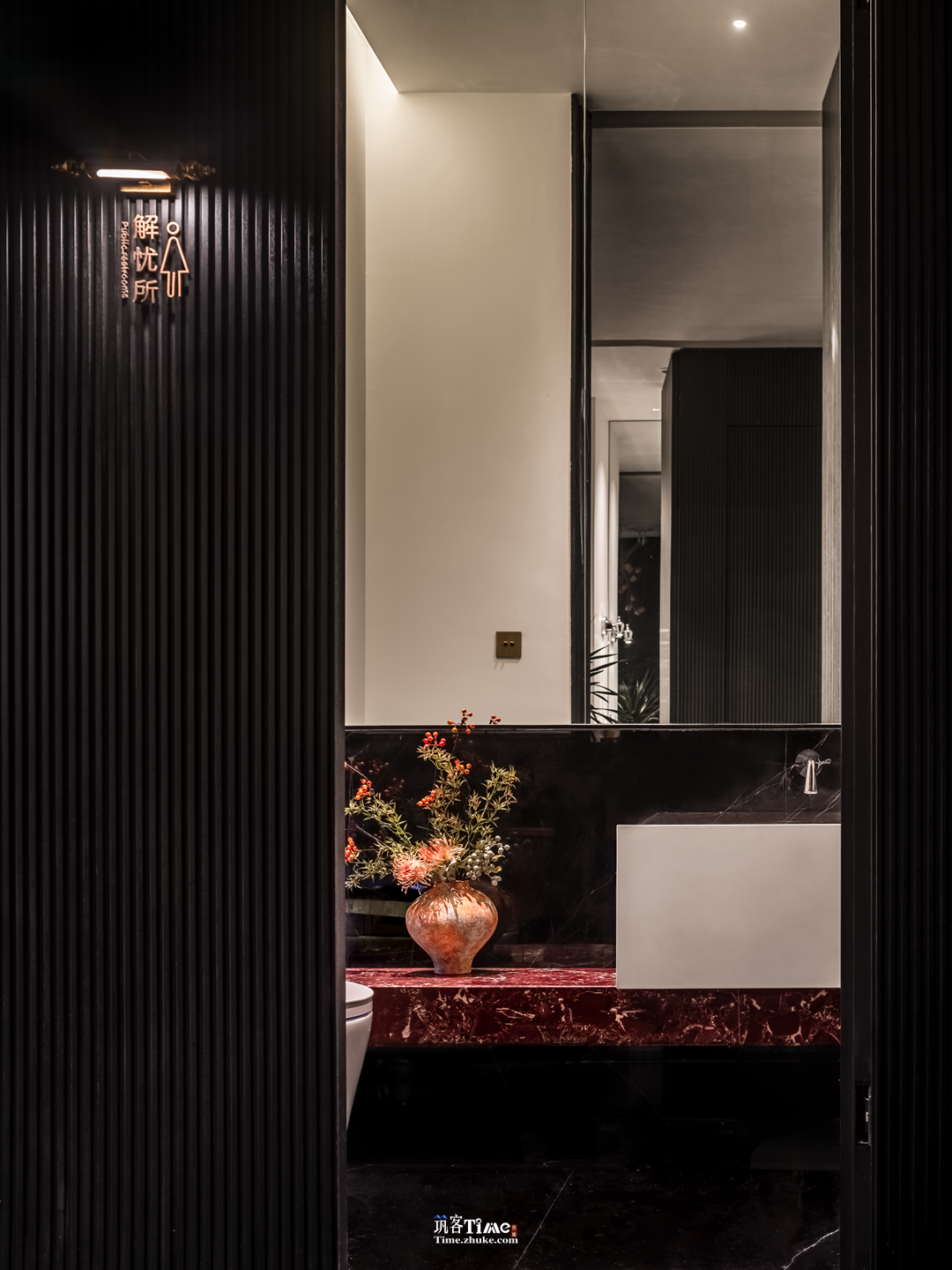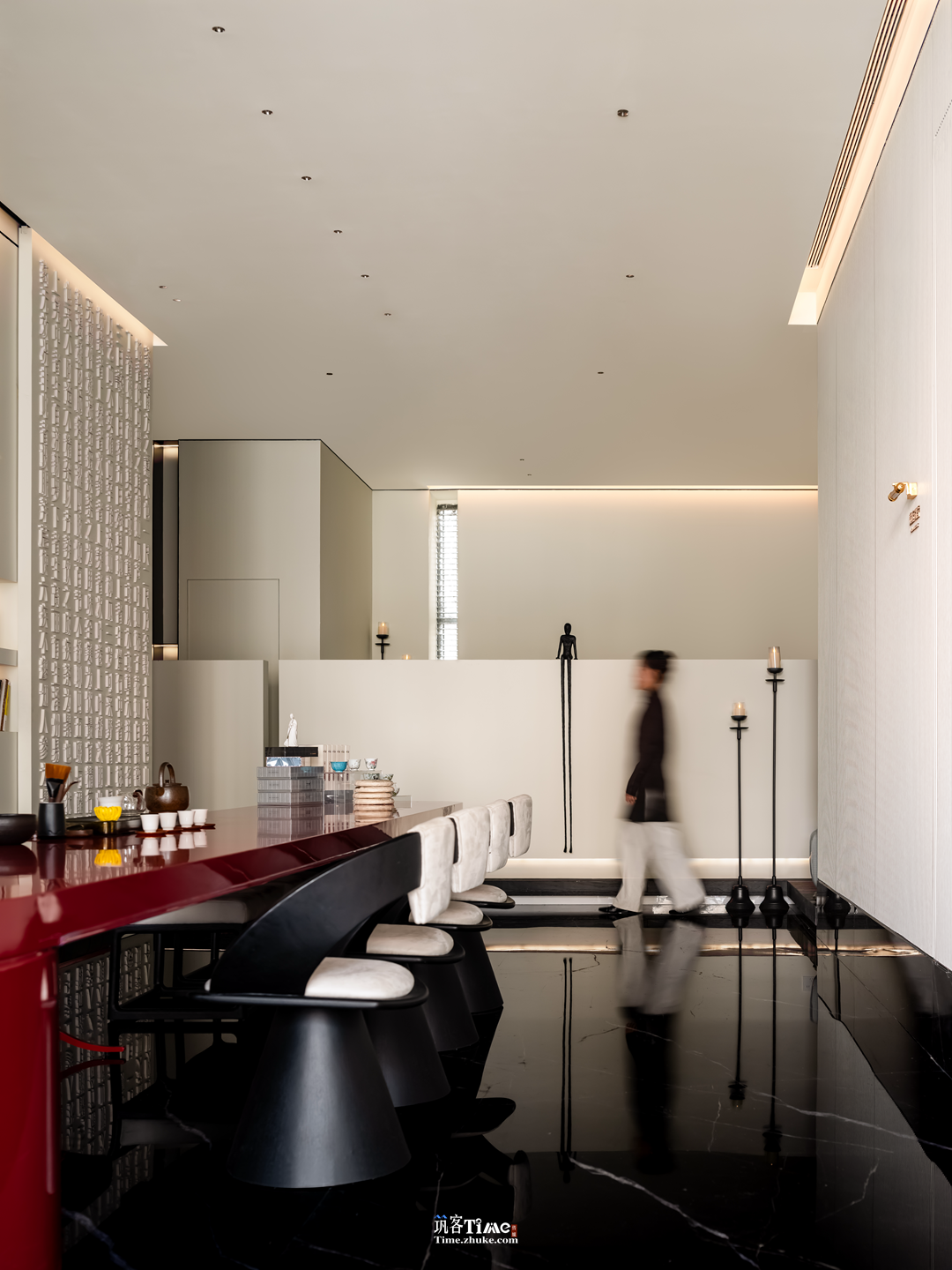 设计选材:以黑白灰为基底,搭配竖向条纹肌理黑调材质拉伸空间感;巧用玻璃砖作包间墙面与廊侧屏障,水晶砖替代部分实墙引入光线;融入在地风物,嫣红柿果点缀空间,品牌元素隐于墙面纹理或显于软装,平衡沉敛质感与鲜活气息。