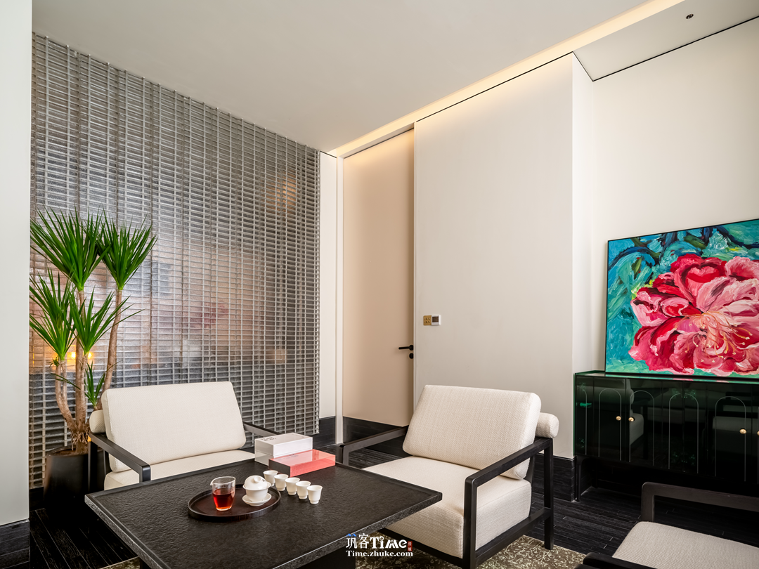 空间意境:构建“闹中取静”的沉浸式茶境,以门斗、门厅双重过渡空间铺垫仪式感,形成从市井到茶境的递进序列;涵盖品茗、洽谈、零售等多元场景,兼具开放展示区与私密包间区,打造可品、可聊、可购的社交茶空间。