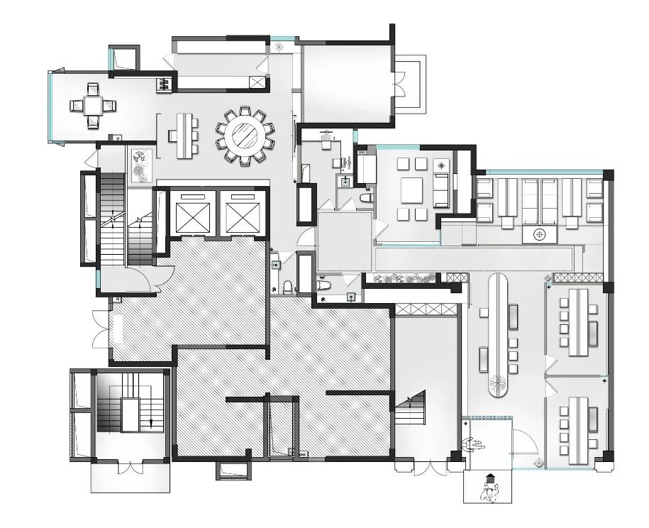 空间布局:打破传统直白动线,采用迂回式规划贴合客流走向;入口侧移增设过渡空间,门厅端景雕塑强化品牌视觉;功能分区清晰,收银台与茶台一体化设计成经营枢纽,走廊融入茶品展示,包间留设“视口”兼顾私密与互动,高台茶卡座增强空间层次。