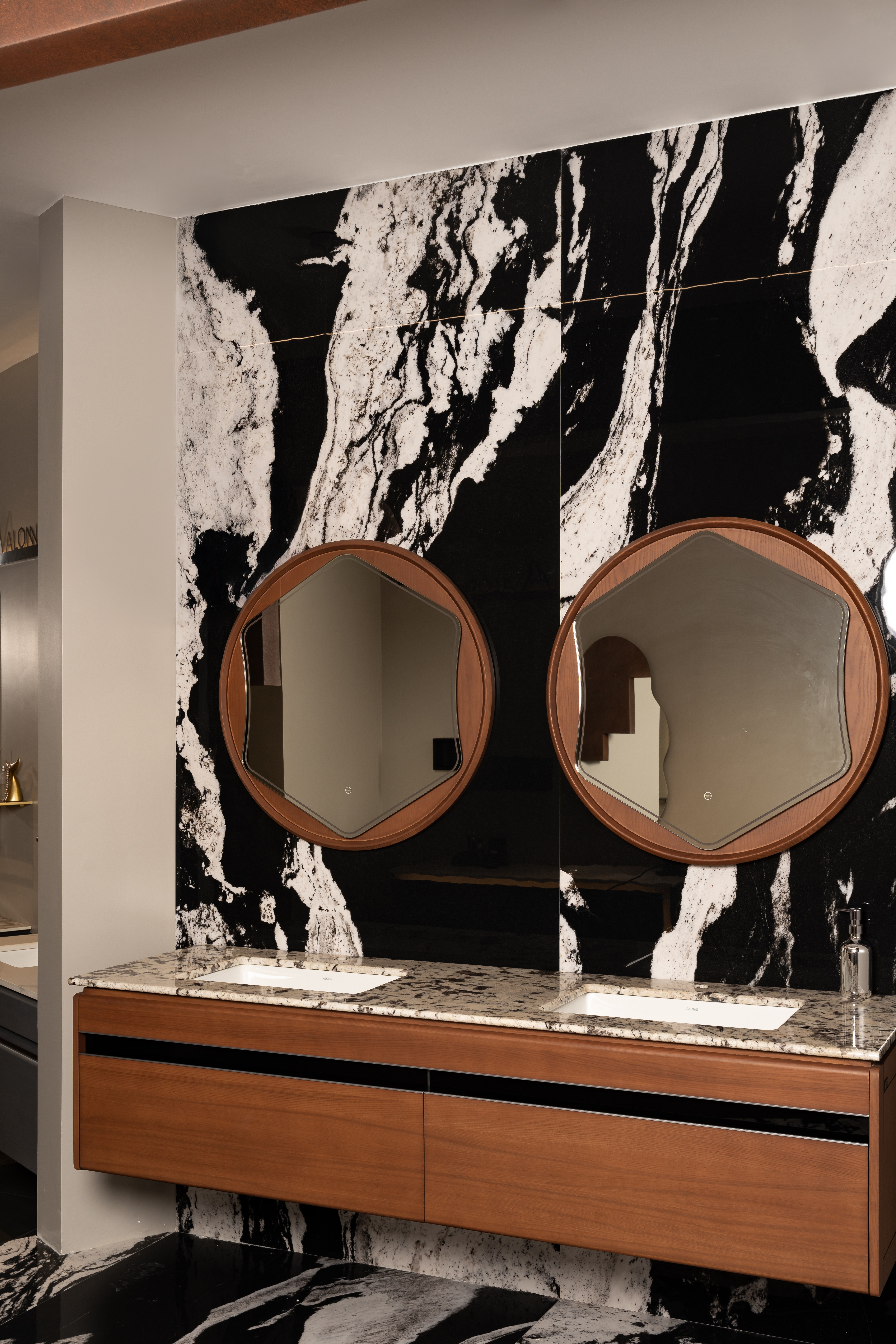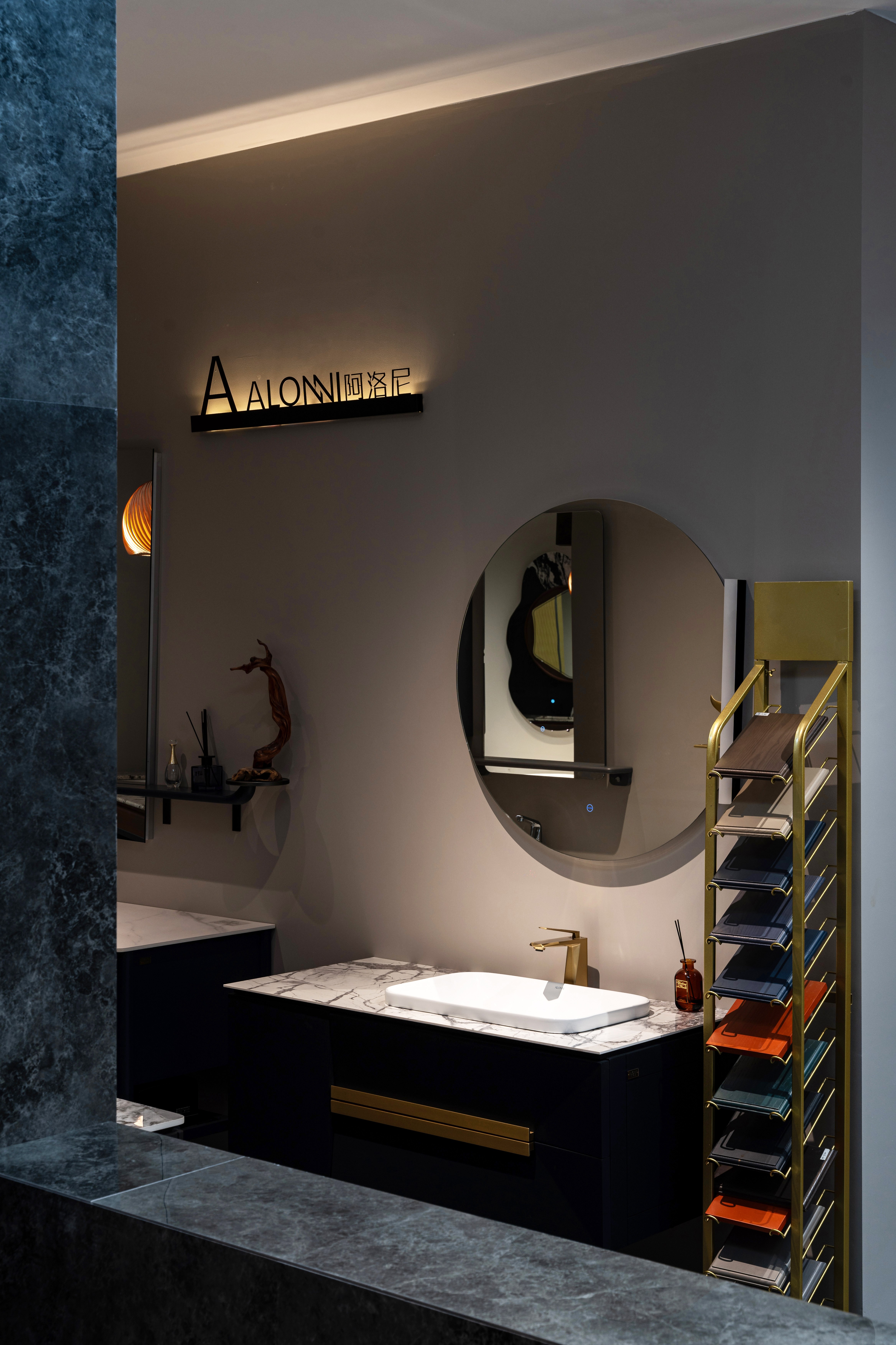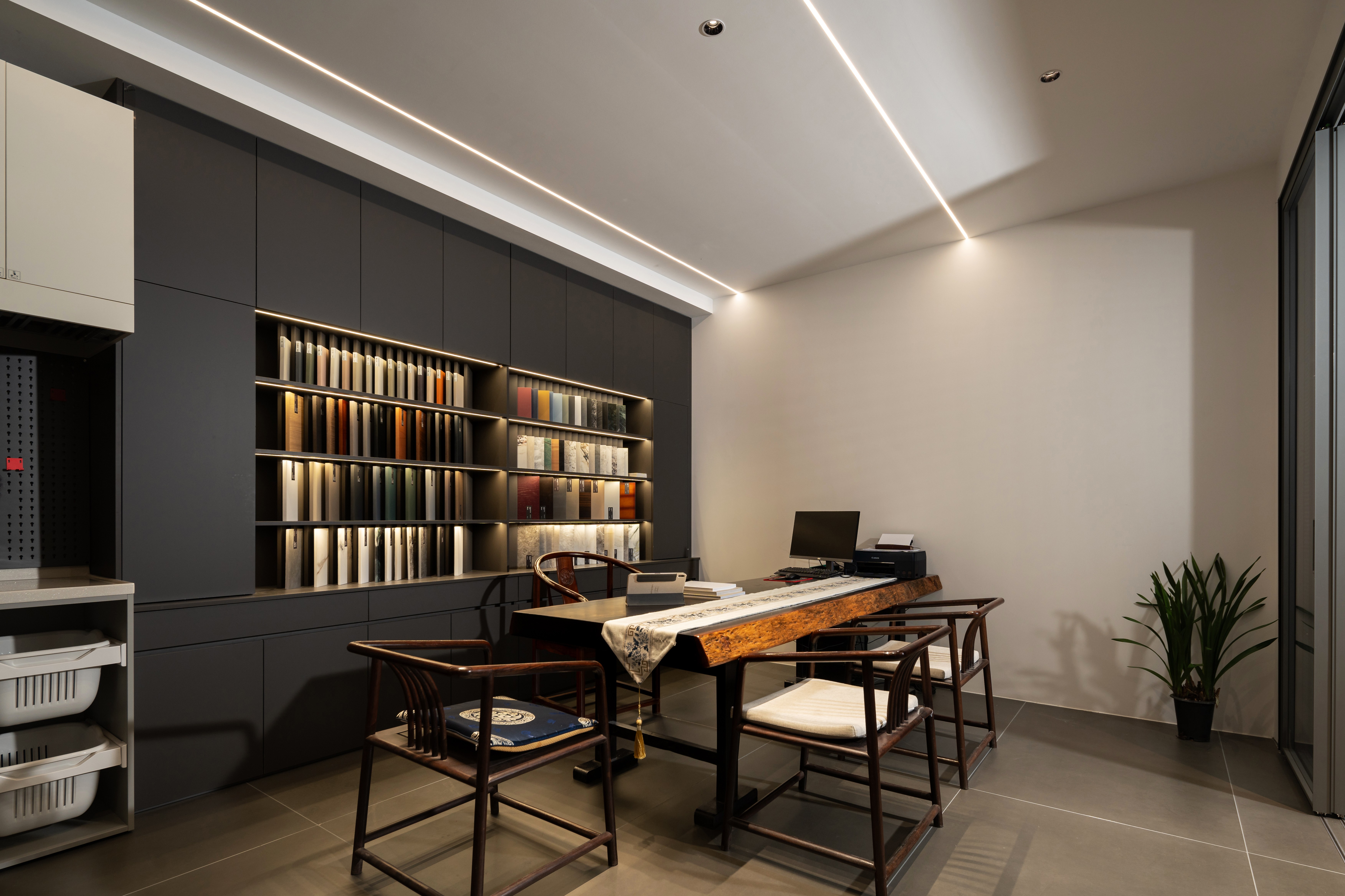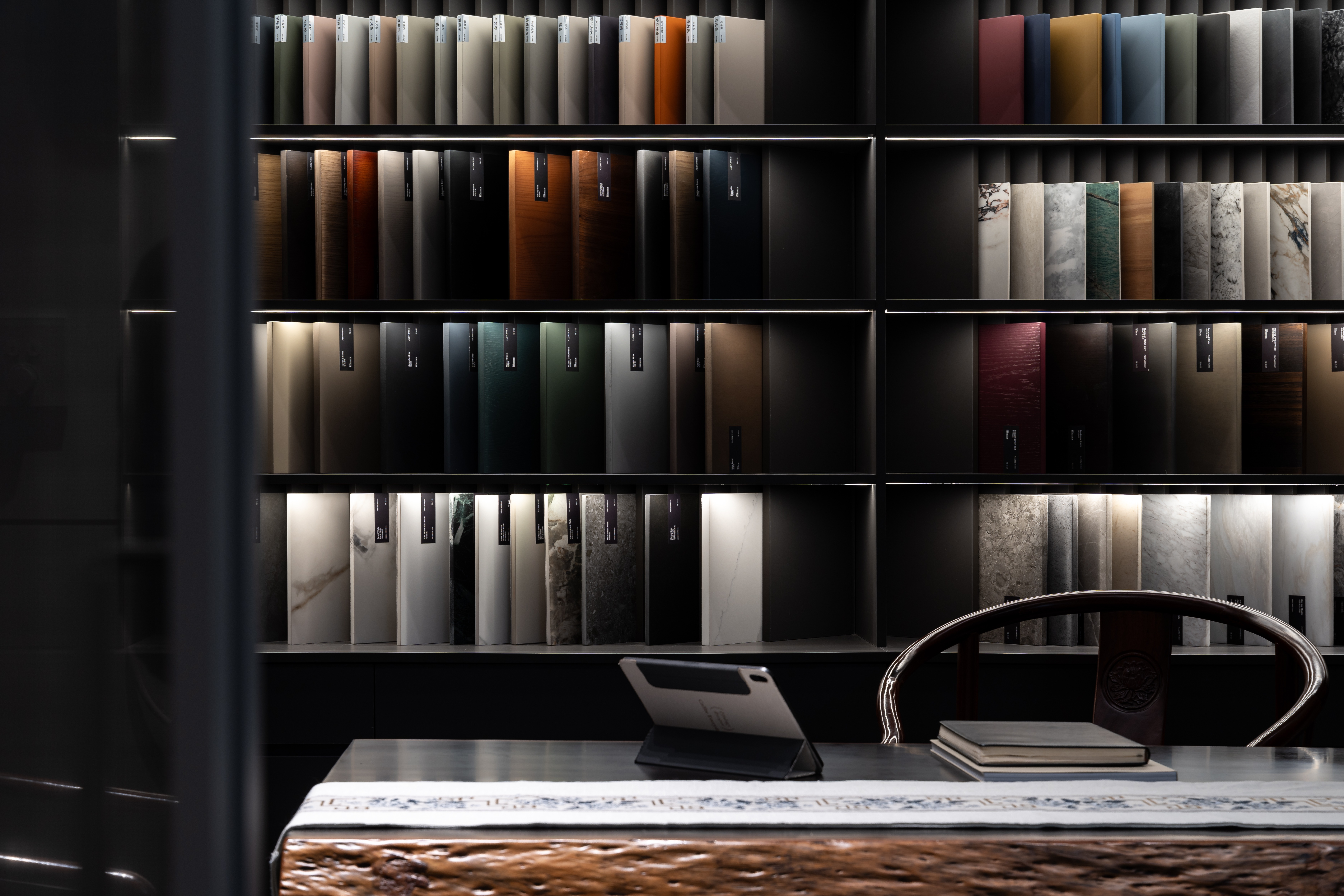 设计选材:选用洞石、岩板等低碳材质,借肌理对比营造温度,兼顾美学质感与经济性。