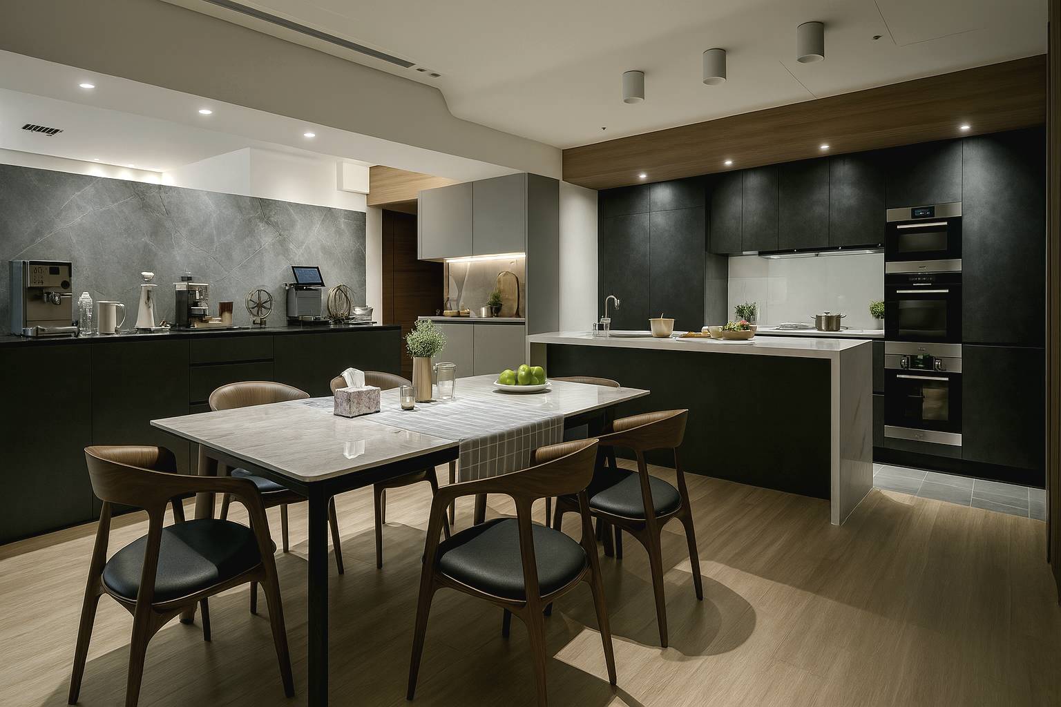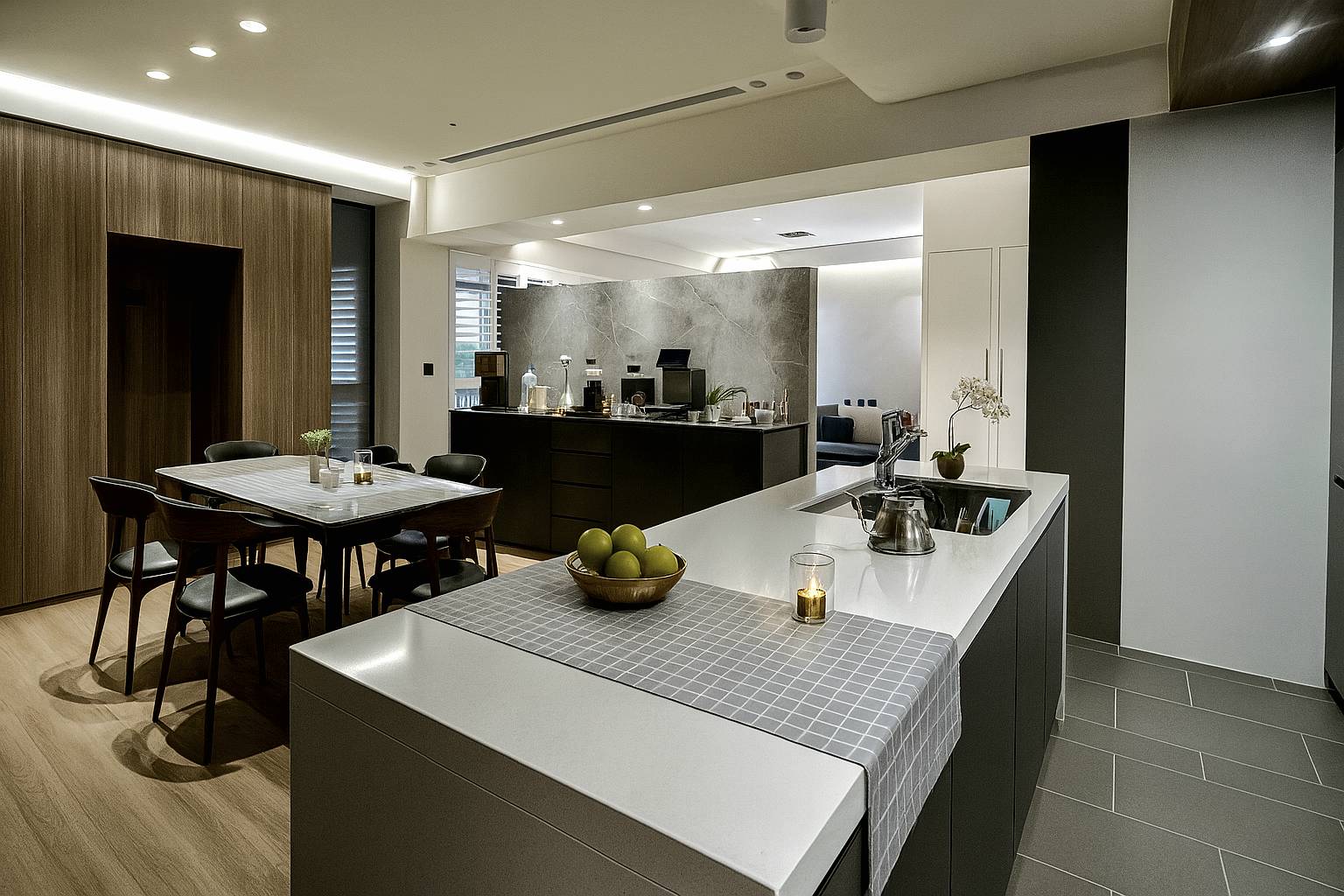 客廳、餐廳與廚房之間的動線清楚且流暢,島型廚房與餐桌距離適中,兼顧備餐、用餐與社交功能。這樣的配置非常適合日常家庭生活,也適合接待親友。