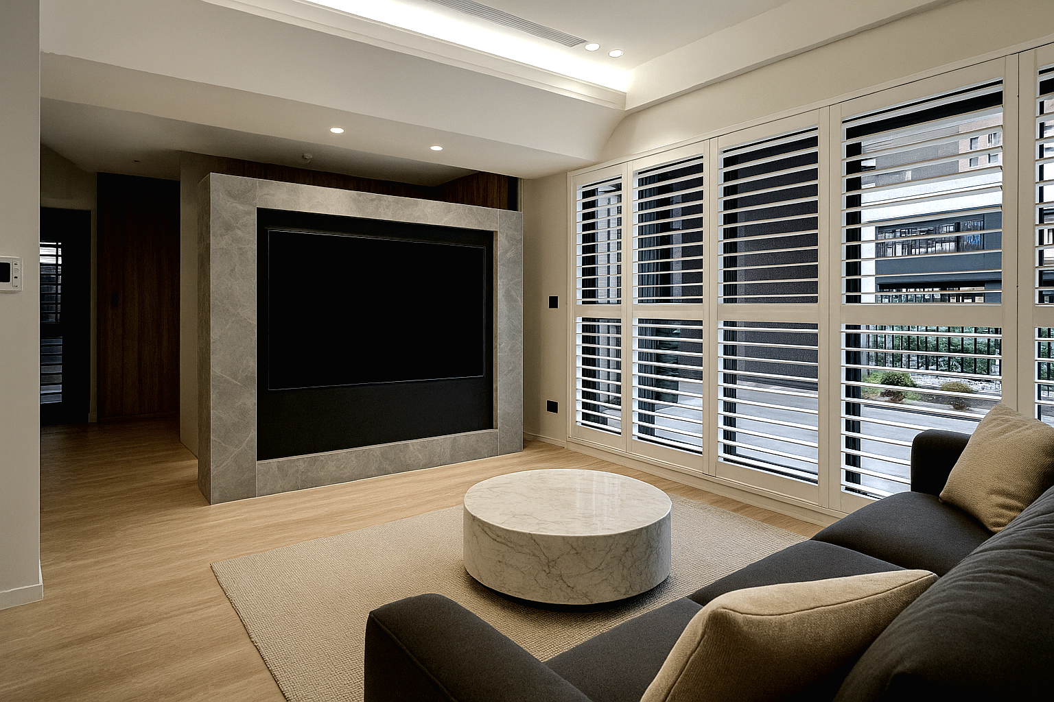 用户体验:大面積窗戶搭配百葉設計,引入自然光的同時兼顧隱私與遮陽,使室內明亮但不刺眼。客廳、餐廚區採開放式布局,視覺延伸感強,實際使用上也能降低壓迫感,對長時間居家或在家工作的居住者特別友善。