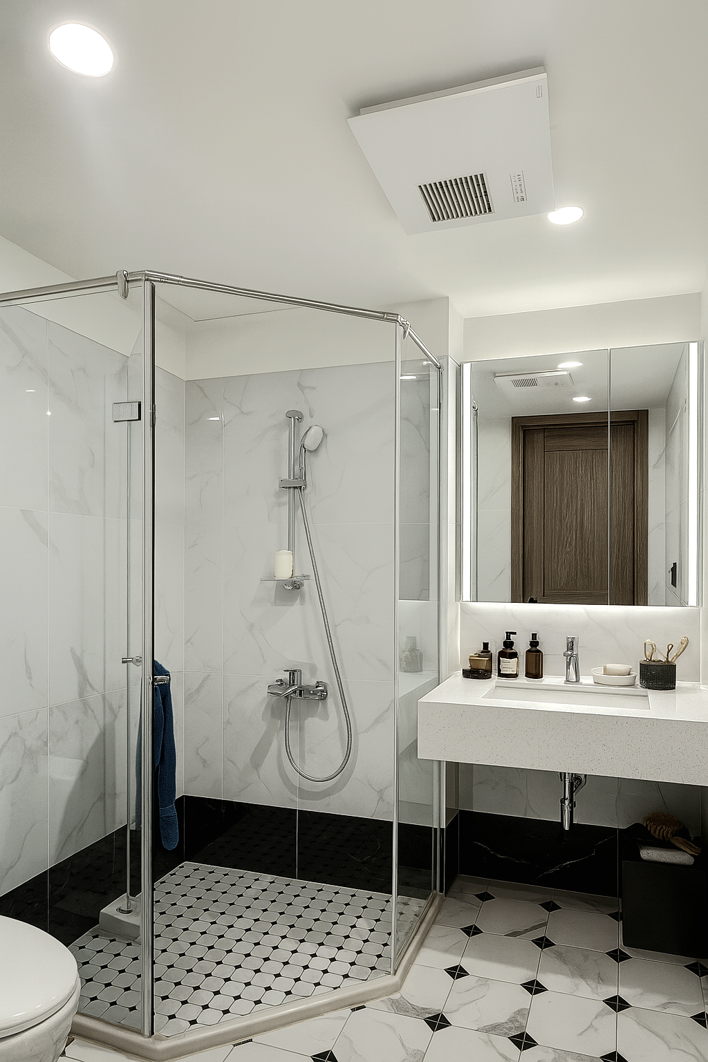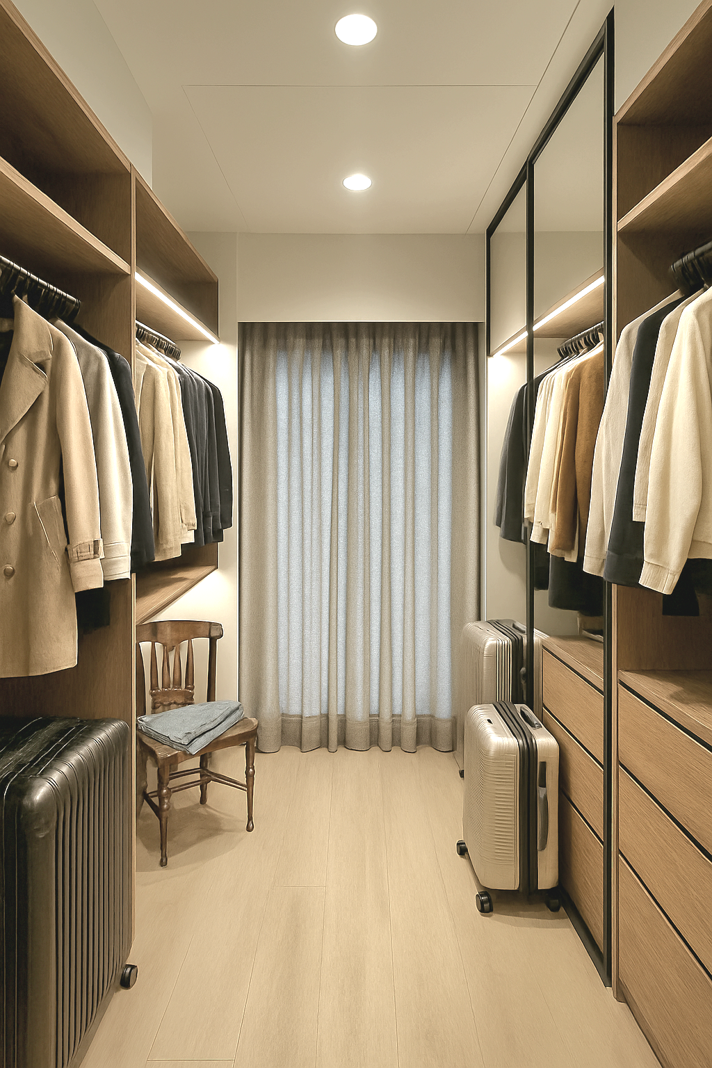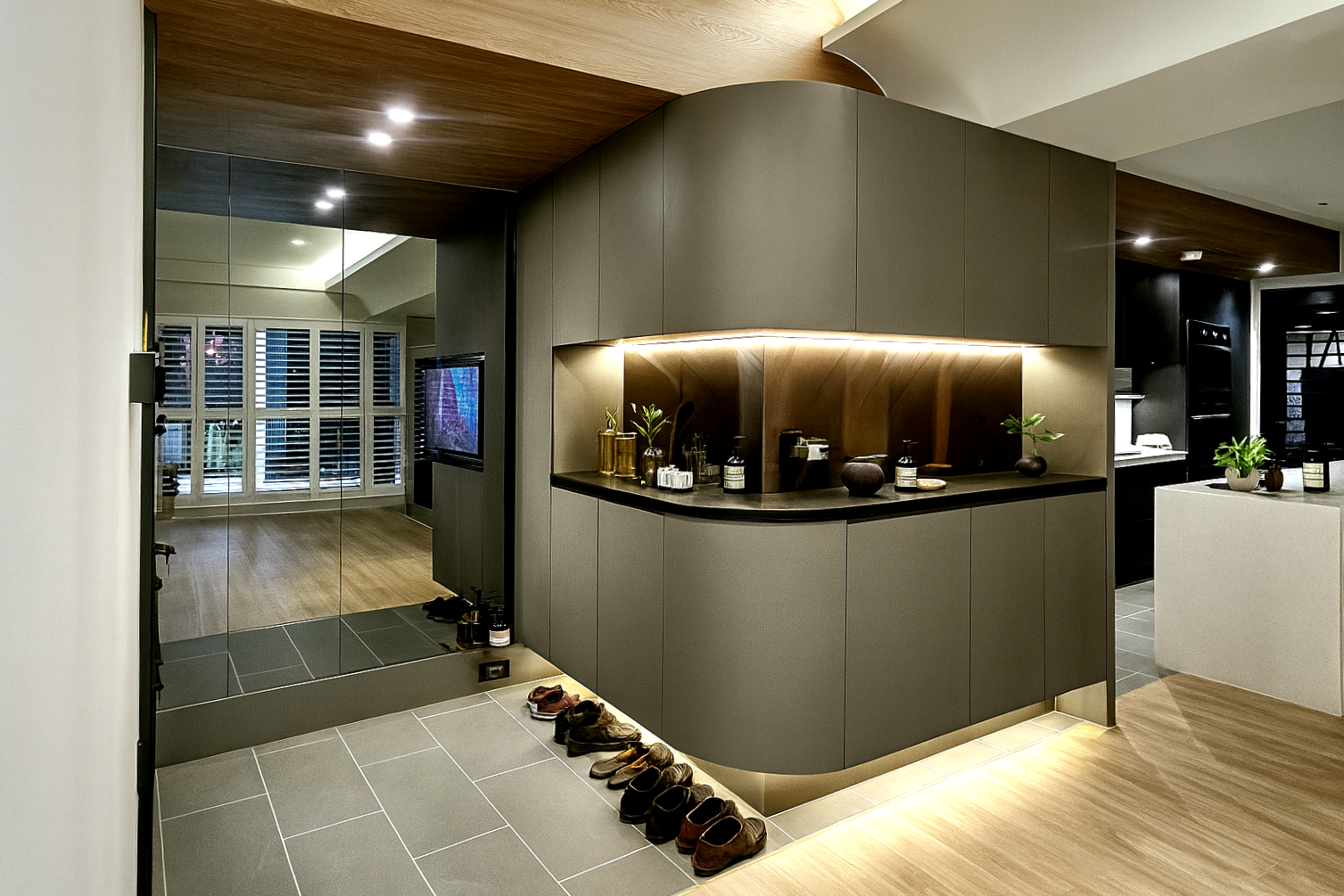 計與下方隱隱透出的光源,為門廳帶出一抹輕盈,另一側的鏡面牆反射出客廳一隅,既滿足出入時整裝儀容的功能,亦