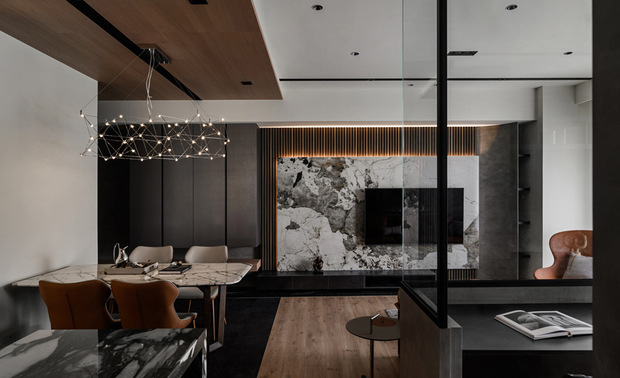 ▲餐厅选用石纹圆角餐桌搭配橘白双色皮椅,与灰色板岩地坪、实木皮天花板相映成趣,洗鍊优美的几何造型吊灯悬挂其上,增添艺术感,营造温馨时尚的用餐氛围。