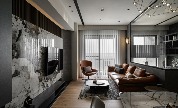 ▲公领域以白灰大板砖和灰泥涂料打造简洁时髦基调,搭配深木色格栅、地坪及橘褐软装,营造温润放鬆感,佐以间接照明平衡现代与自然的氛围,精美吊灯与壁灯增添视觉层次,塑造独特混搭风格。