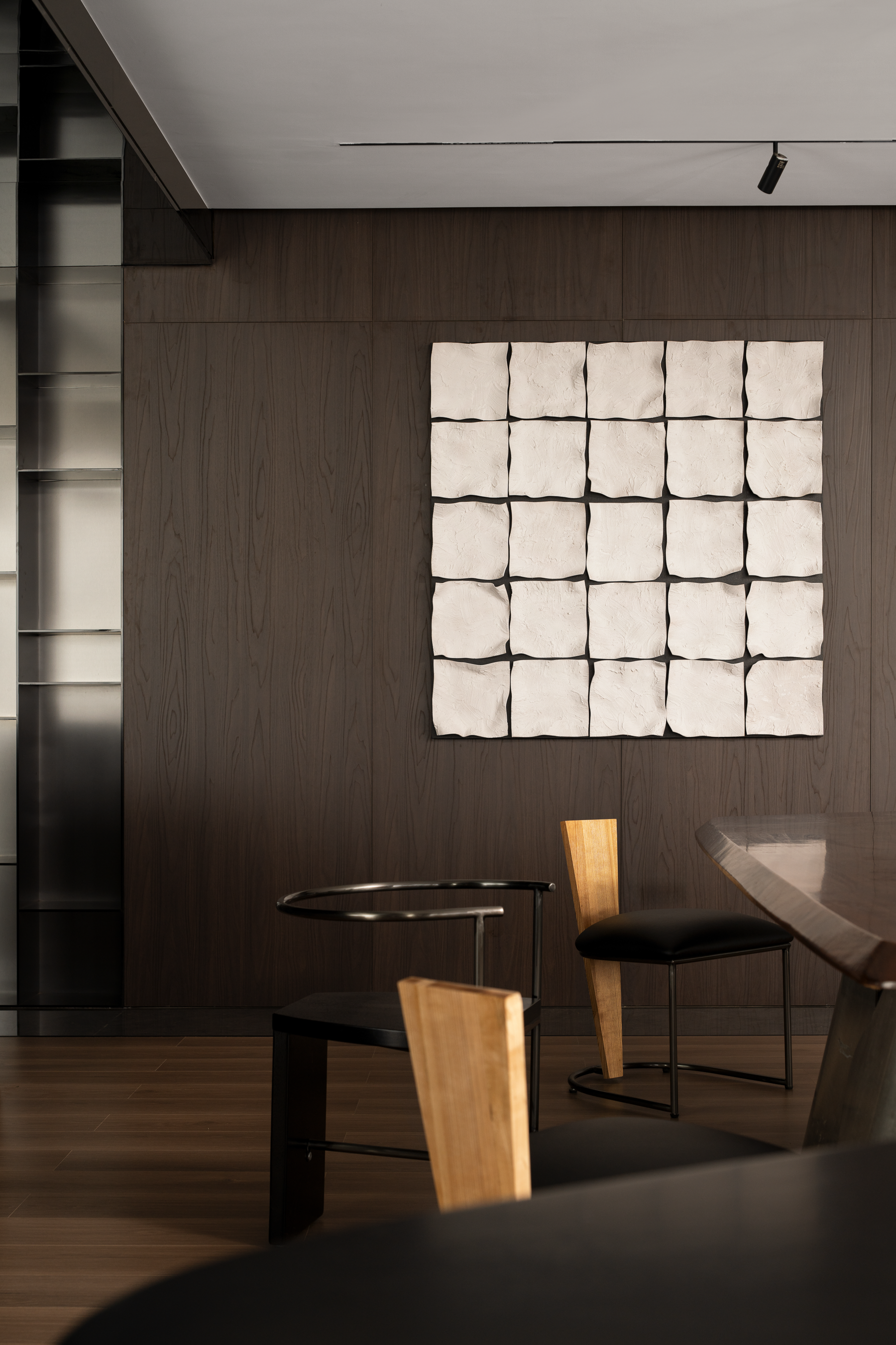 2.工业风金属、自然木纹、手工肌理墙的碰撞,消解自建房的 “土气”,让其能够拥有当代艺术场域的质感。 -