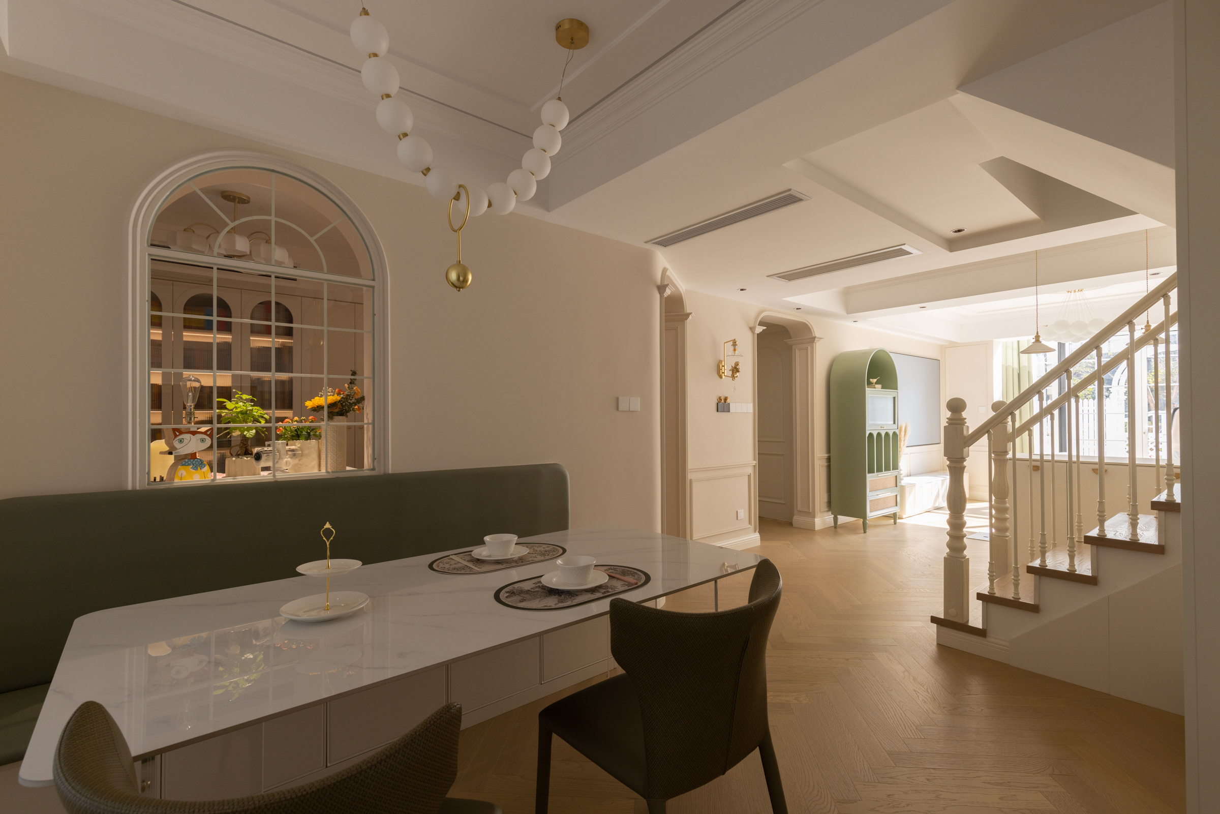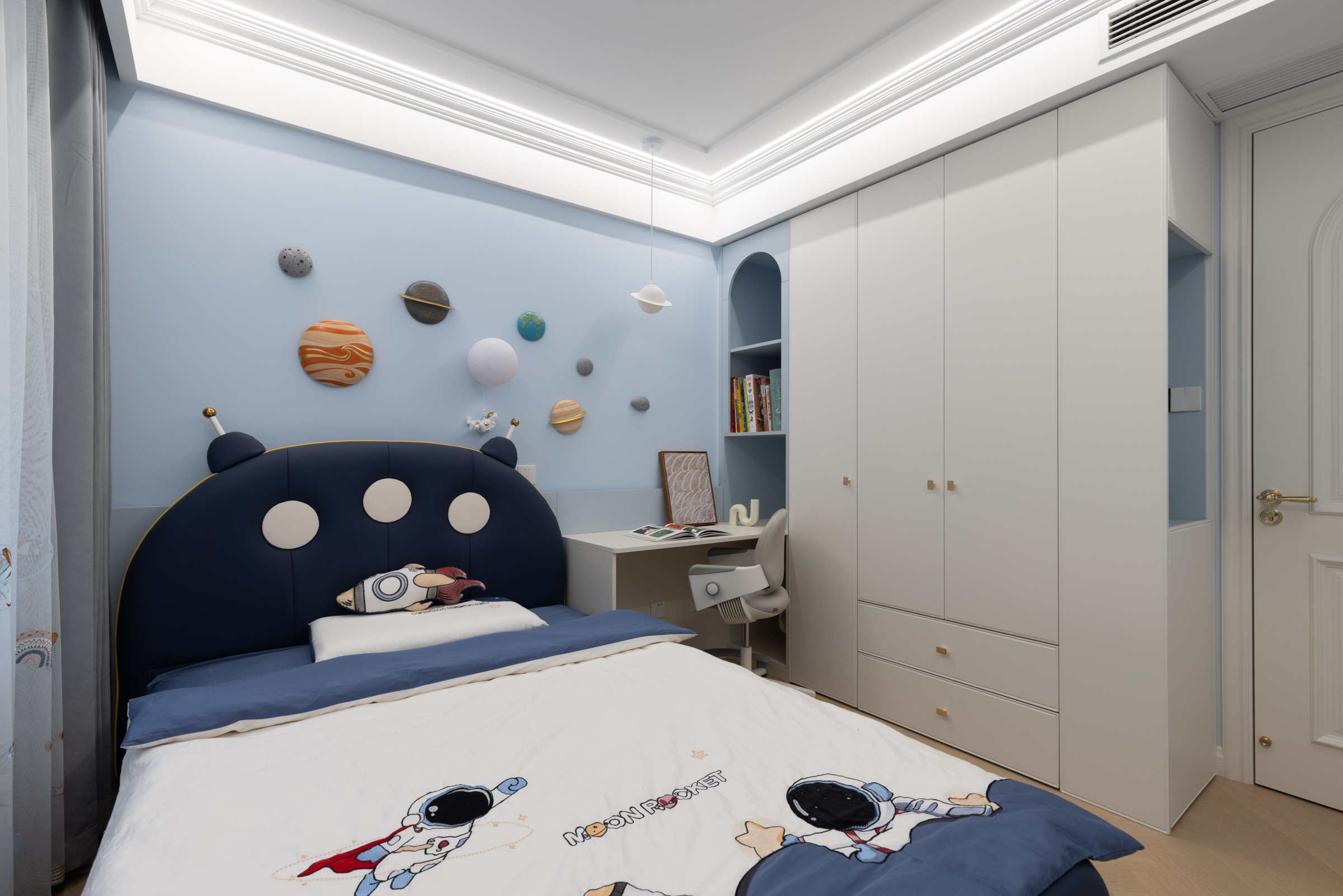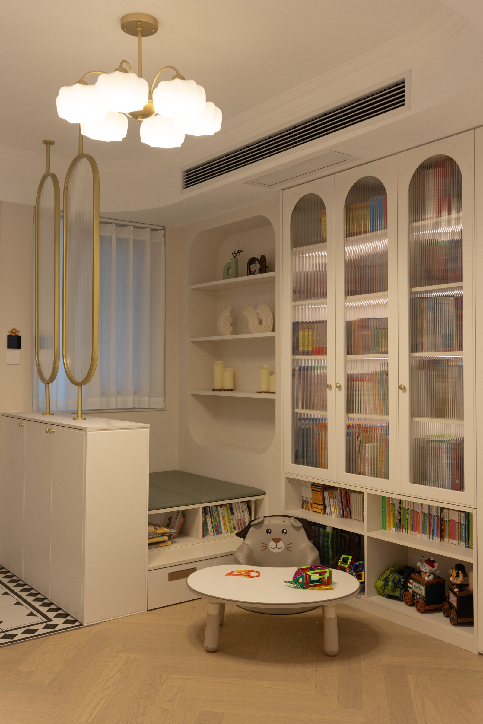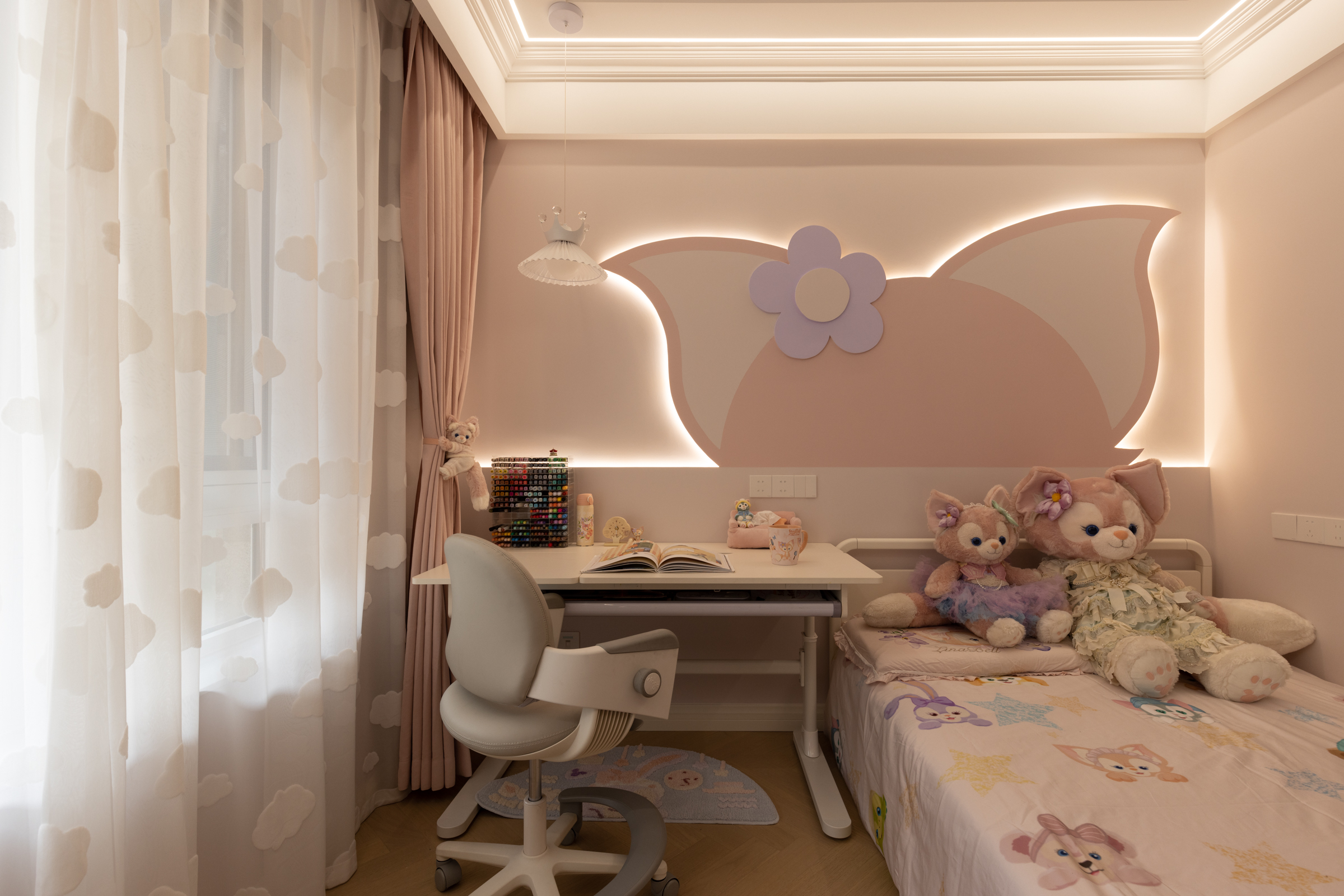 空间意境:首创“法式+童话”双轴配色系统:奶油立面嵌入低饱和莫兰迪童话色,石膏线脚藏入隐藏式变色灯带,日落后自动切换柔雾粉/星雾蓝,让法式线条与童话幻彩同频呼吸,浪漫随光成长。