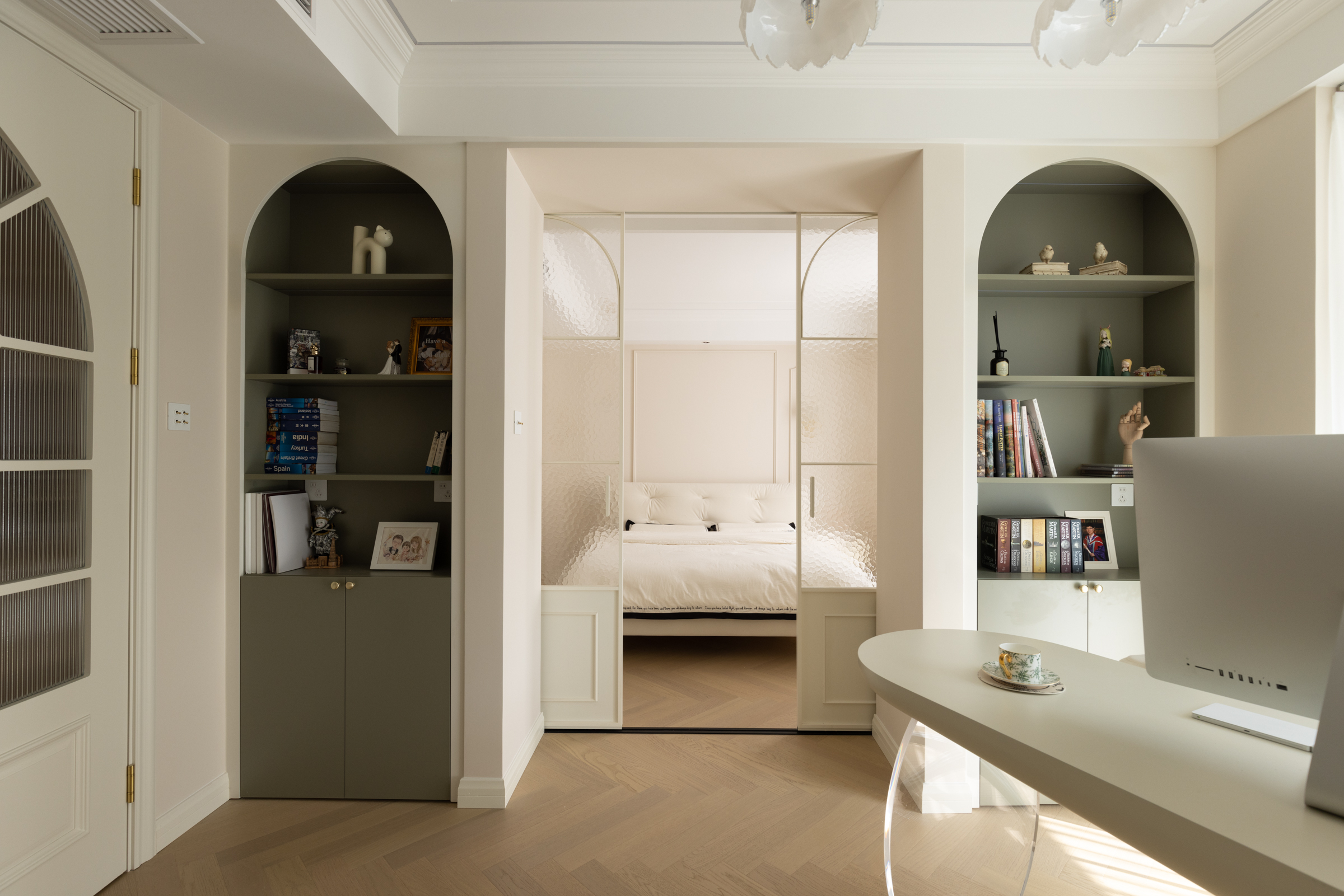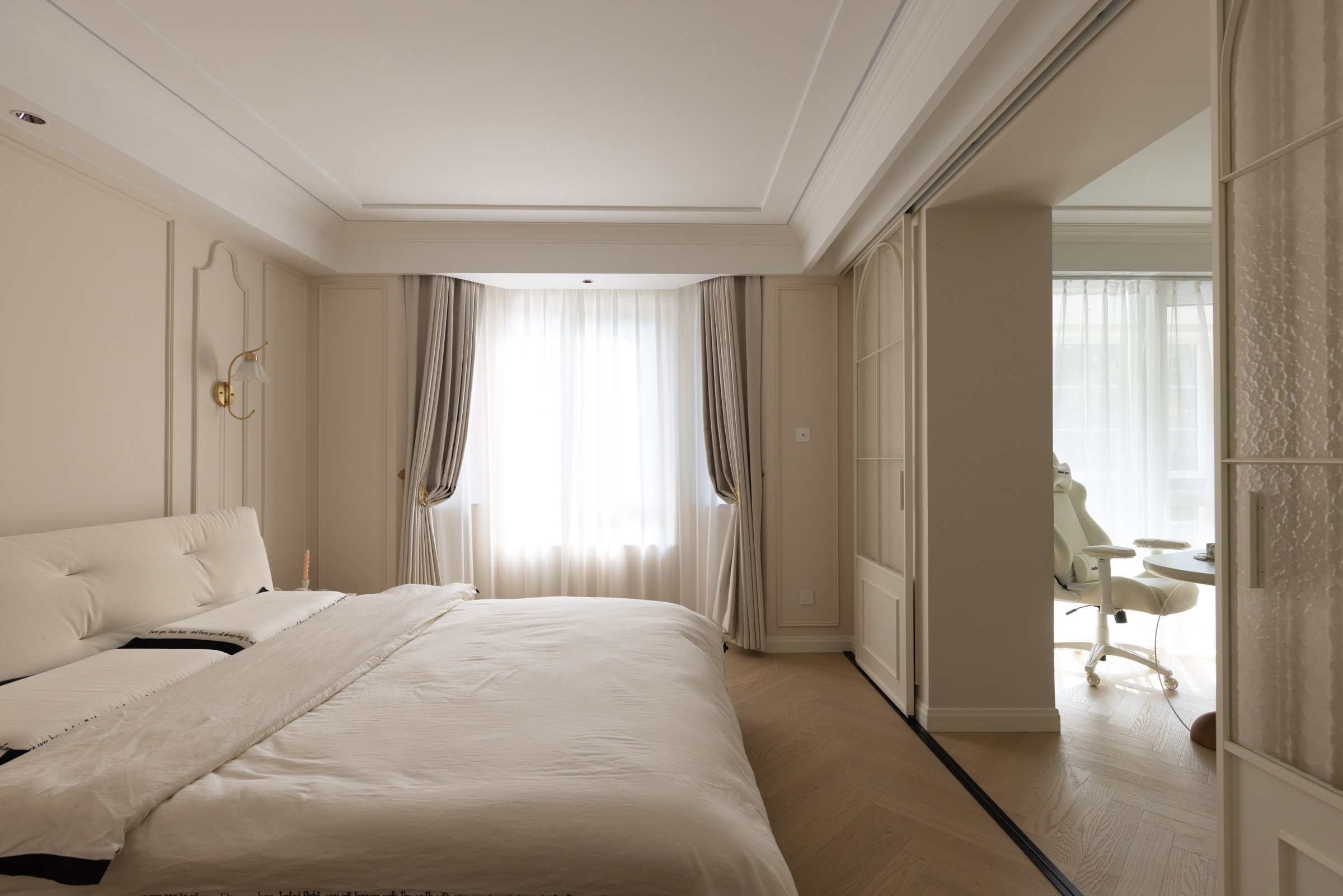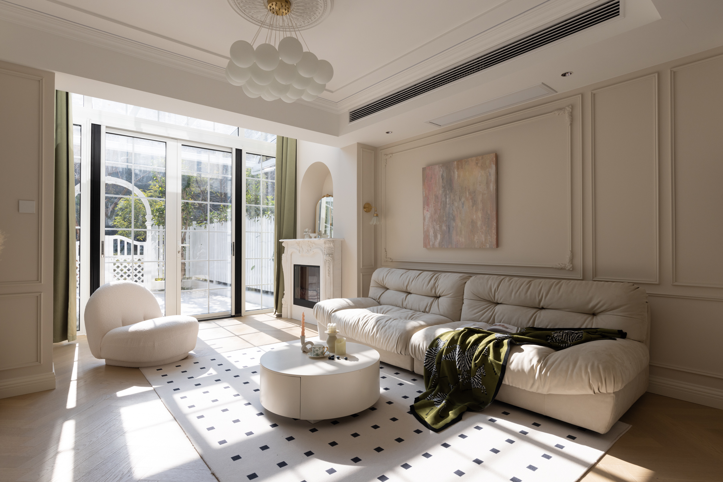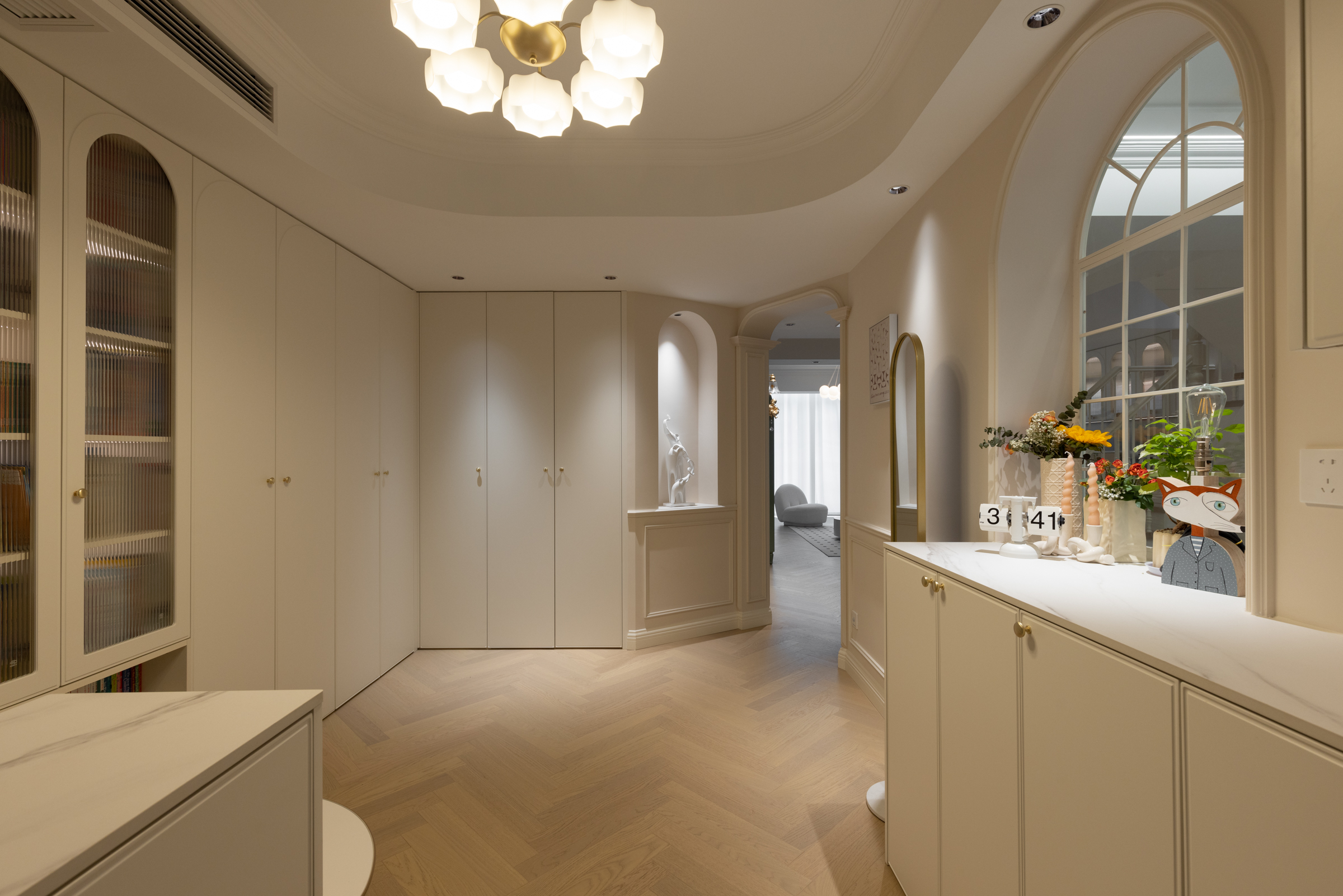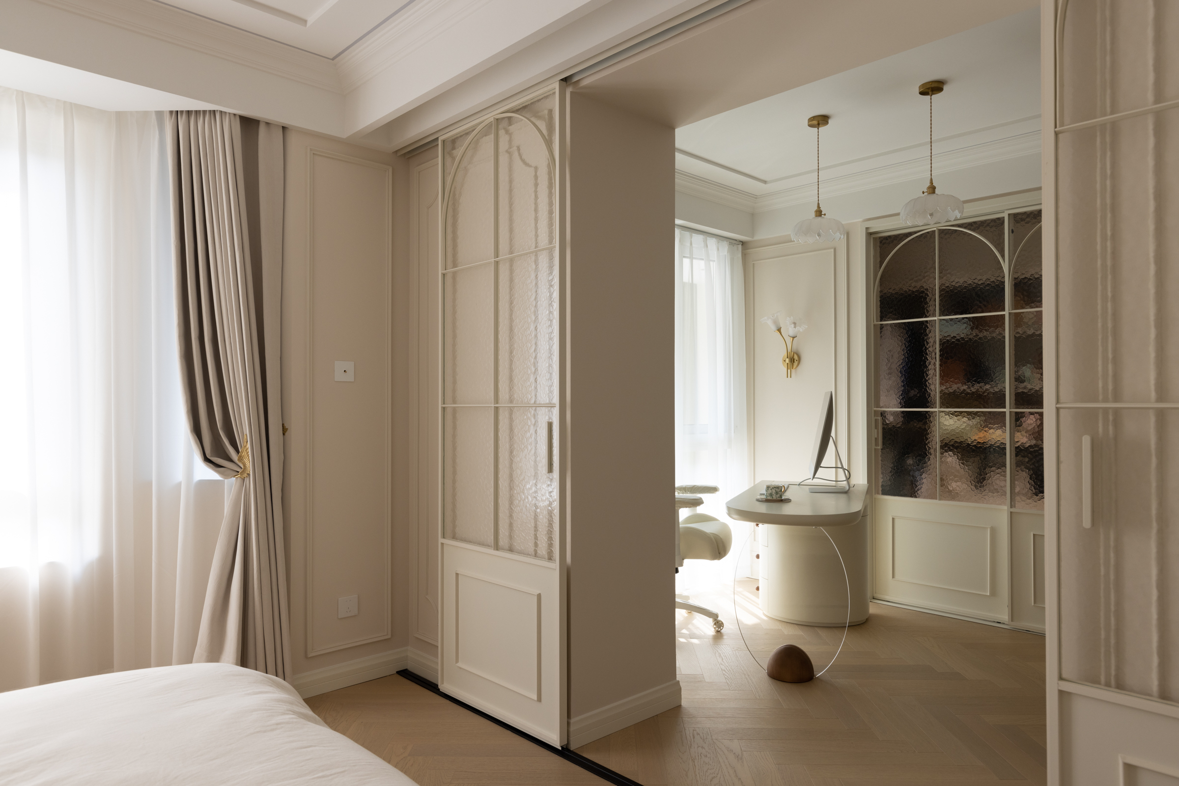 空间意境:首创“法式+童话”双轴配色系统:奶油立面嵌入低饱和莫兰迪童话色,石膏线脚藏入隐藏式变色灯带,日落后自动切换柔雾粉/星雾蓝,让法式线条与童话幻彩同频呼吸,浪漫随光成长。